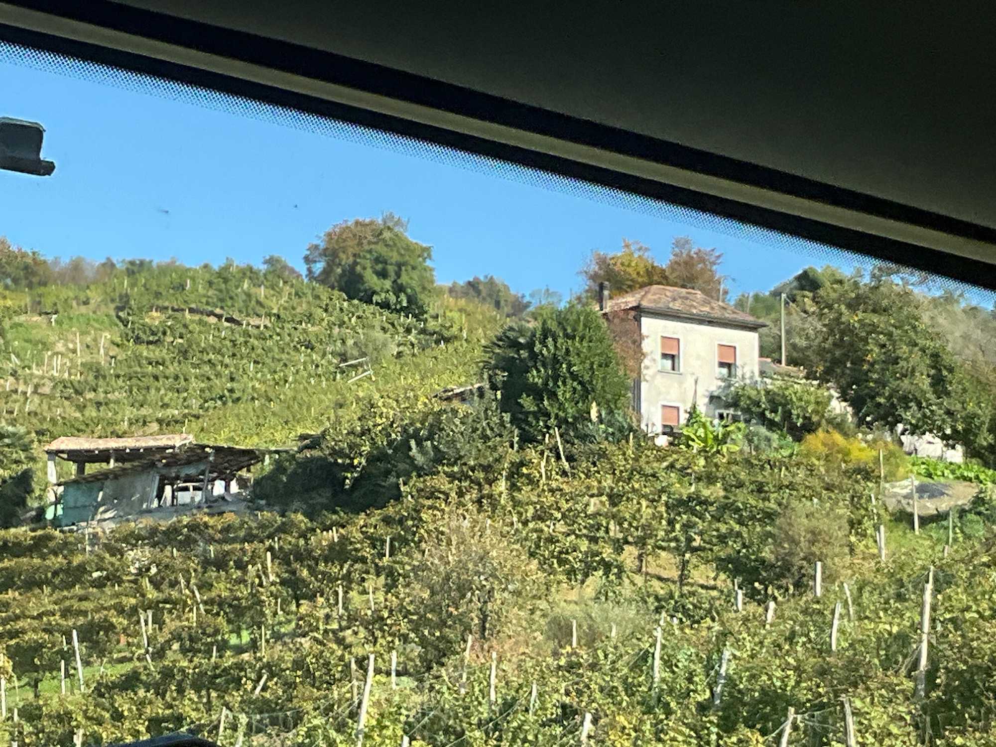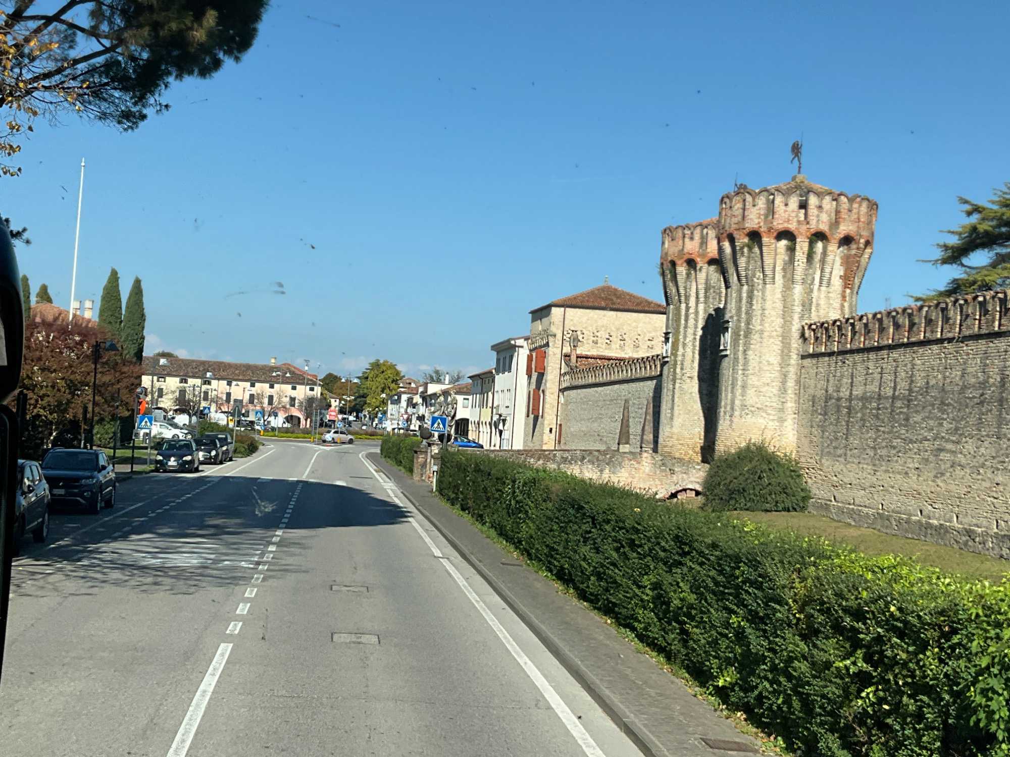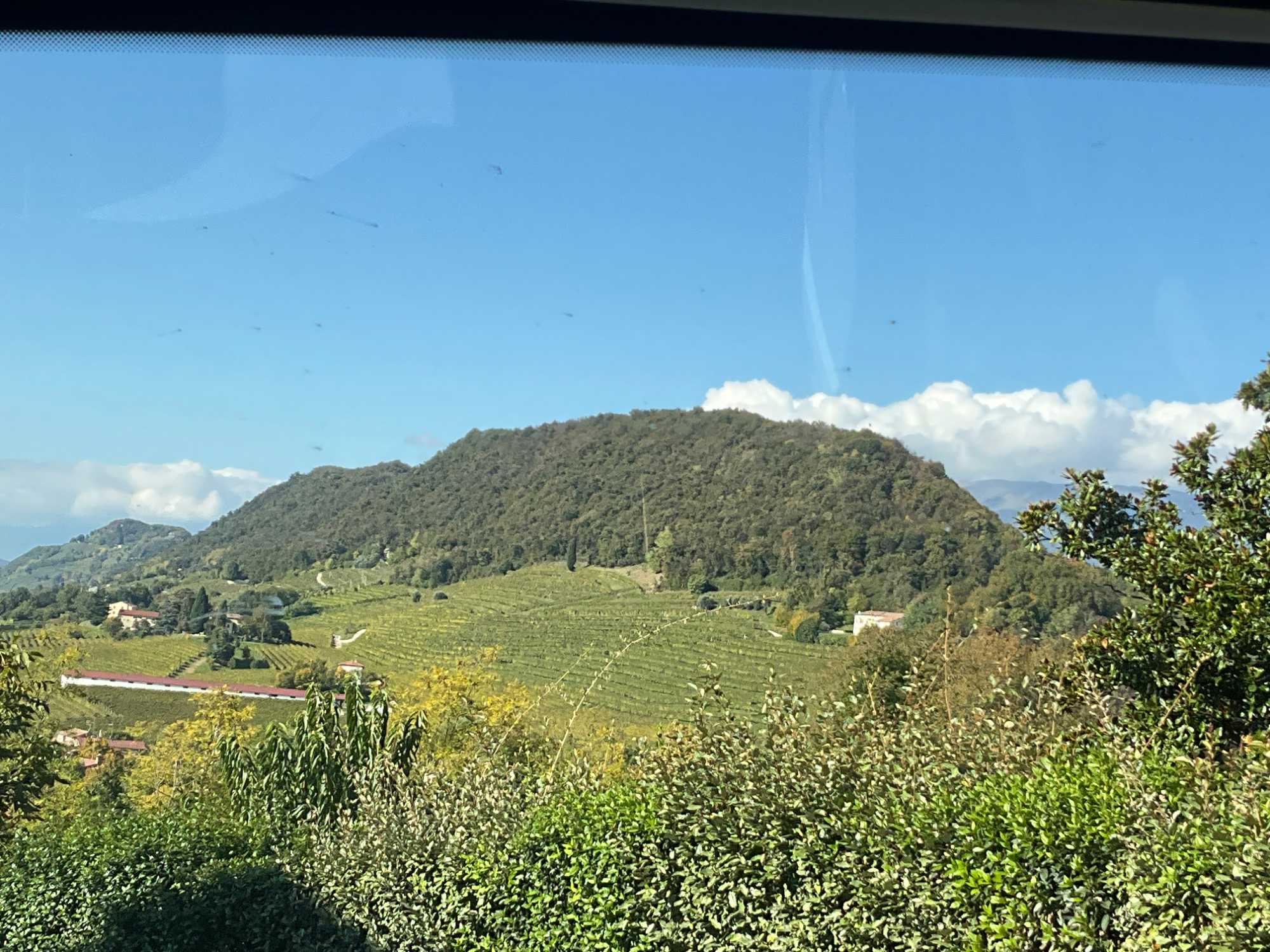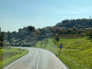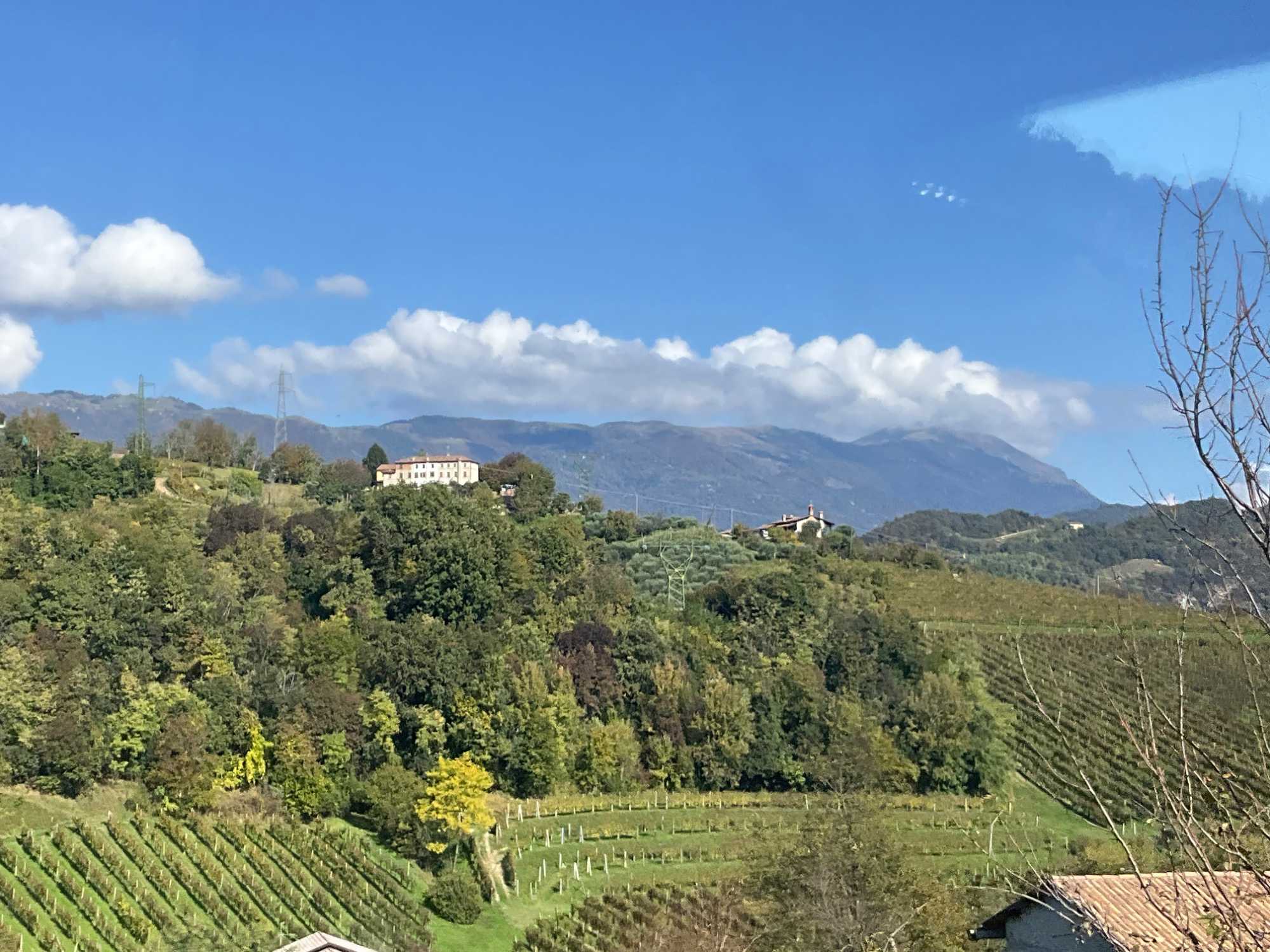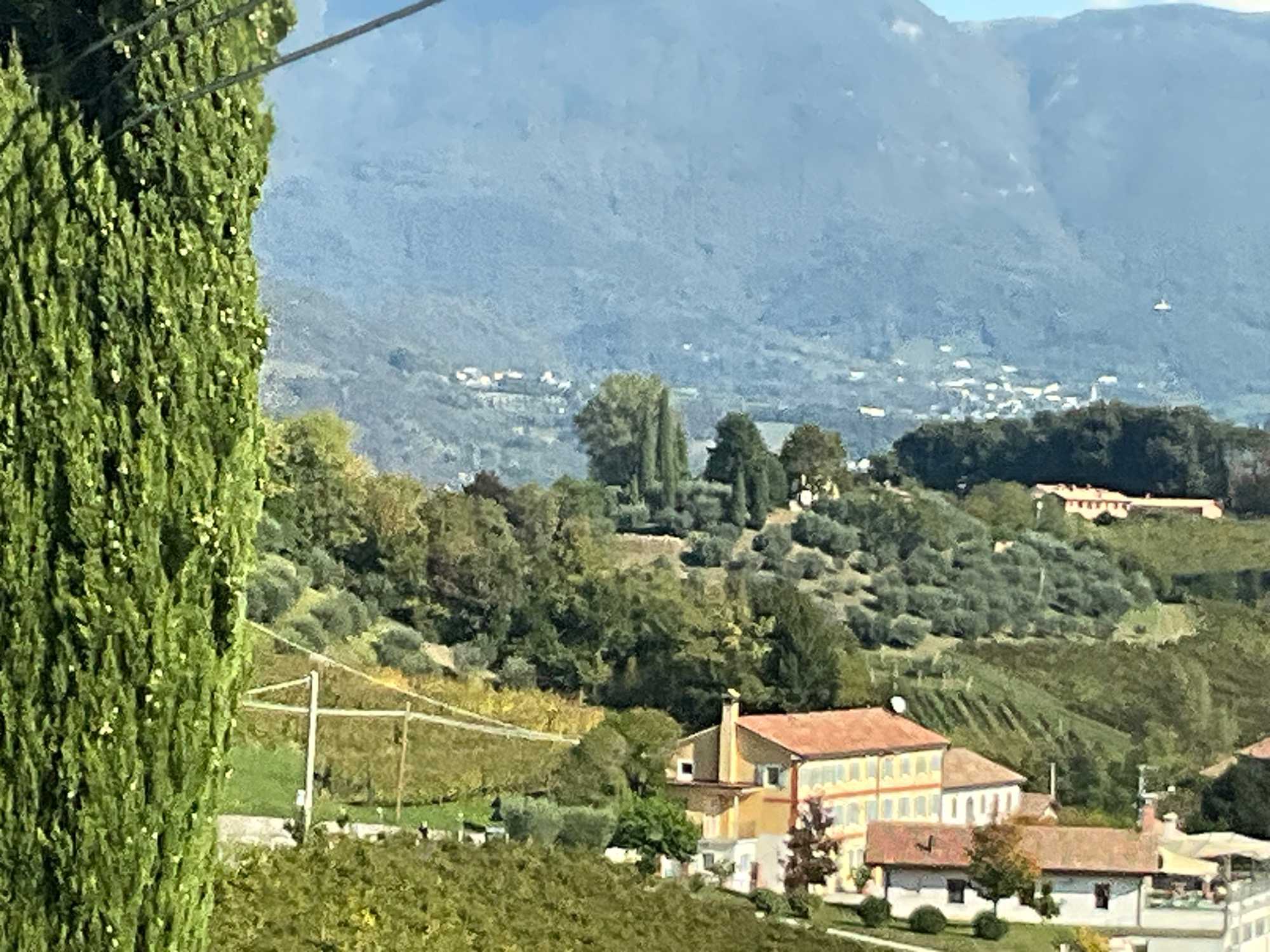 En passant par Spresiano, nous sommes dans les Pré Alpes mais déjà on voie apparaître les collines. C’est ici, entre la plaine et les Alpes, que le terrain favorise les vignes pour le sépage appelé Glera, maître suprême du Prosecco. D’ailleurs c’est également ici qu’on voie notre première affiche « Conigliano », l’un des deux villages entre lesquels se situent officiellement les Collines du Prosecco.