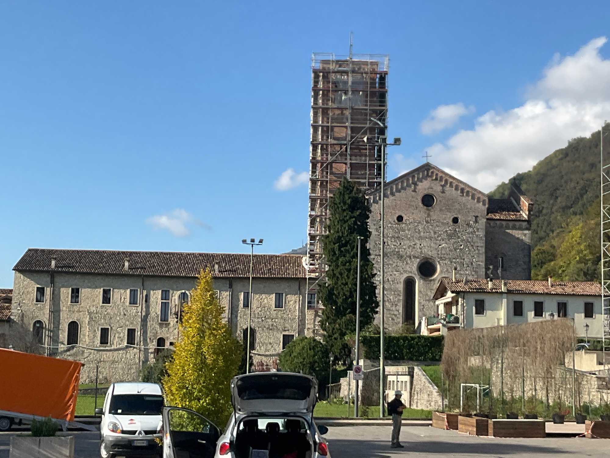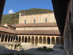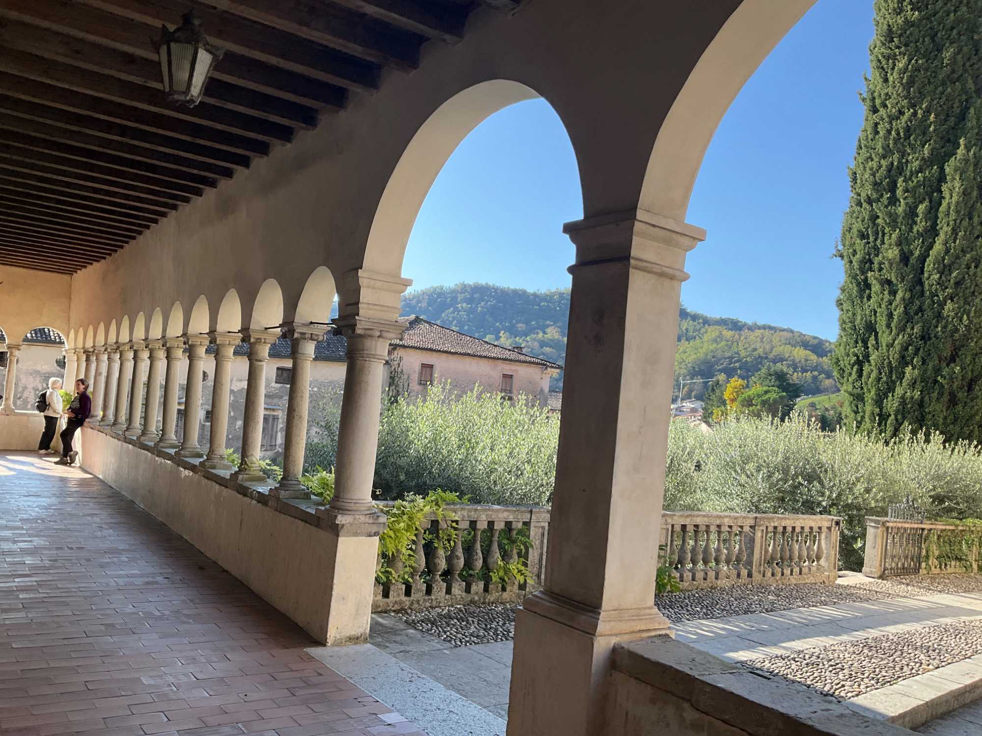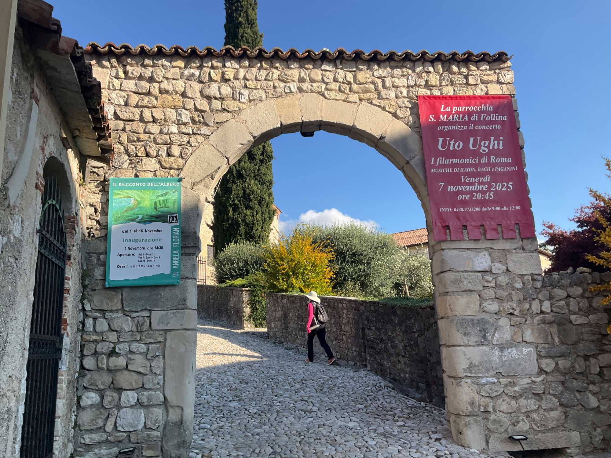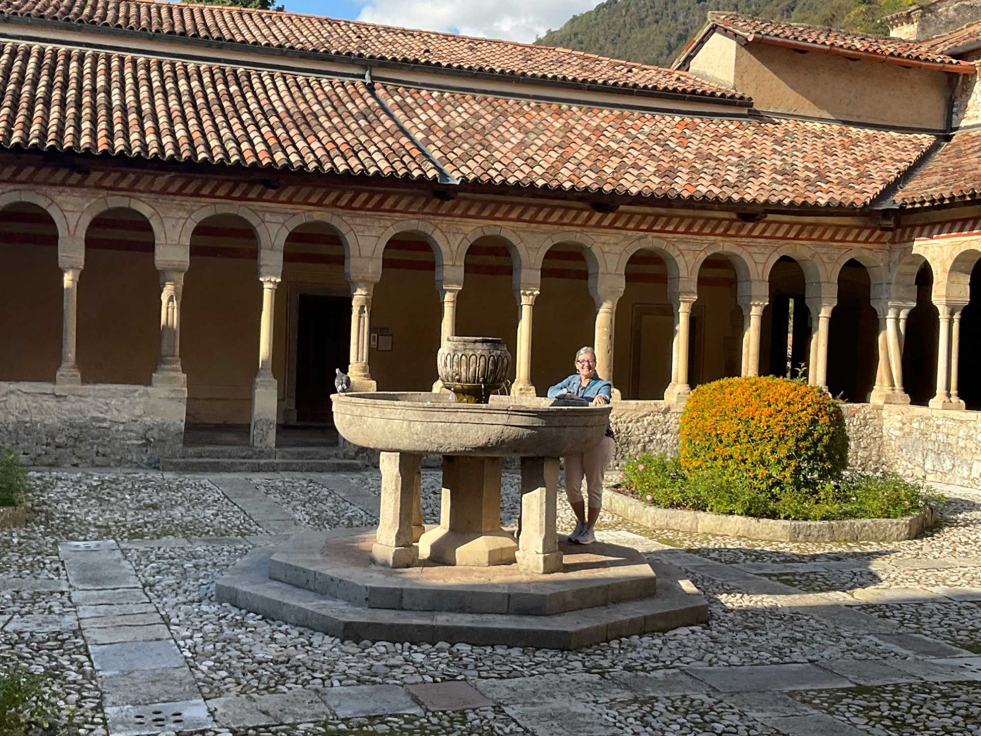 On s’arrête à l’un de ces petits villages de carte postale, Follina, pour y visiter un lieu religieux, une ancienne abbaye cistercienne de Santa Maria de Follina. On relate qu’il y avait eu une fondation bénédictine. Fondée en 1146, elle est fermée en 1771. Le démarrage probable de la construction du monastère aurait débuté en 1154. Vous imaginez, il y a pratiquement un millénaire. En 1229, le couvent a eu une vocation hospitalière. Puis les cisterciens sont remplacés par des moines camaldules (sorte de sous-branche des bénédictins). Par la suite, le cloître a été réparti entre plusieurs familles qui y construisent divers bâtiments. Puis en 1819, on lègue l’abbaye à la municipalité afin que celle-ci en fasse la paroisse de la ville. Durant la Première Guerre mondiale, l'abbaye s’est retrouvée au cœur des combats et a été fortement endommagée. Mais aujourd’hui, on a pu voir une restauration de grande ampleur, non seulement des dommages de la guerre, mais des destructions et pillages ayant affectés l'édifice depuis 1771, et tous ces travaux menés par des mains de maîtres… des communautés religieuses entre 1919 et 1922. À l’extérieur se niche la statue (1915) de la « bienheureuse Vierge de Follina ». La façade de l'abbatiale est de style roman. Ces ordres religieux nous laissent, de par leur mode de vie modeste, une église dénudée à l’intérieur, aucune décoration car, dit-on, notre regard doit se diriger vers le ciel…vers Dieu. Ce bâtiment est de style gothique italien. Des bénévoles assurent une présence qui nous permets de visiter la cour intérieure soit le cloître et sa fontaine,