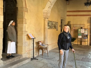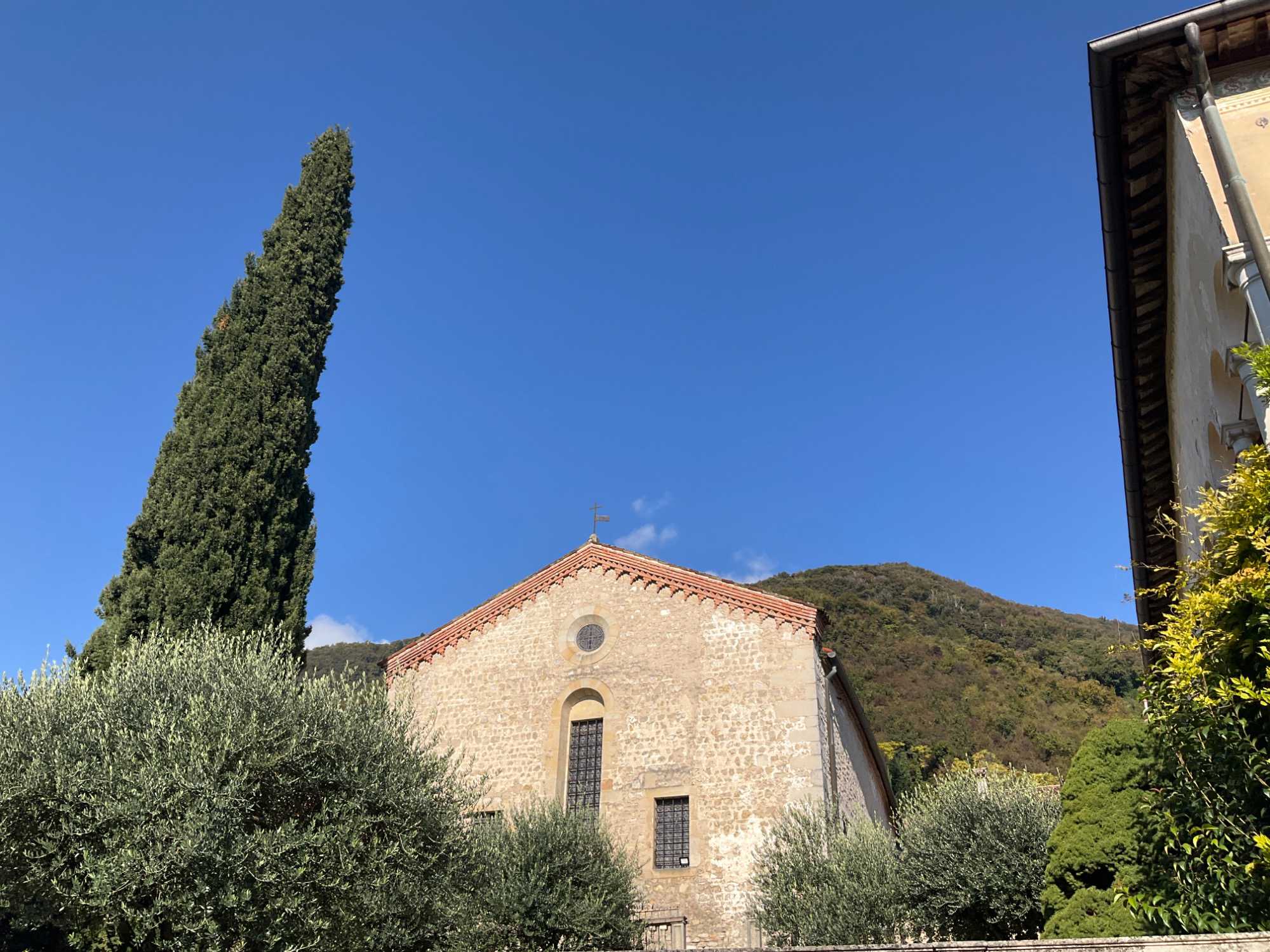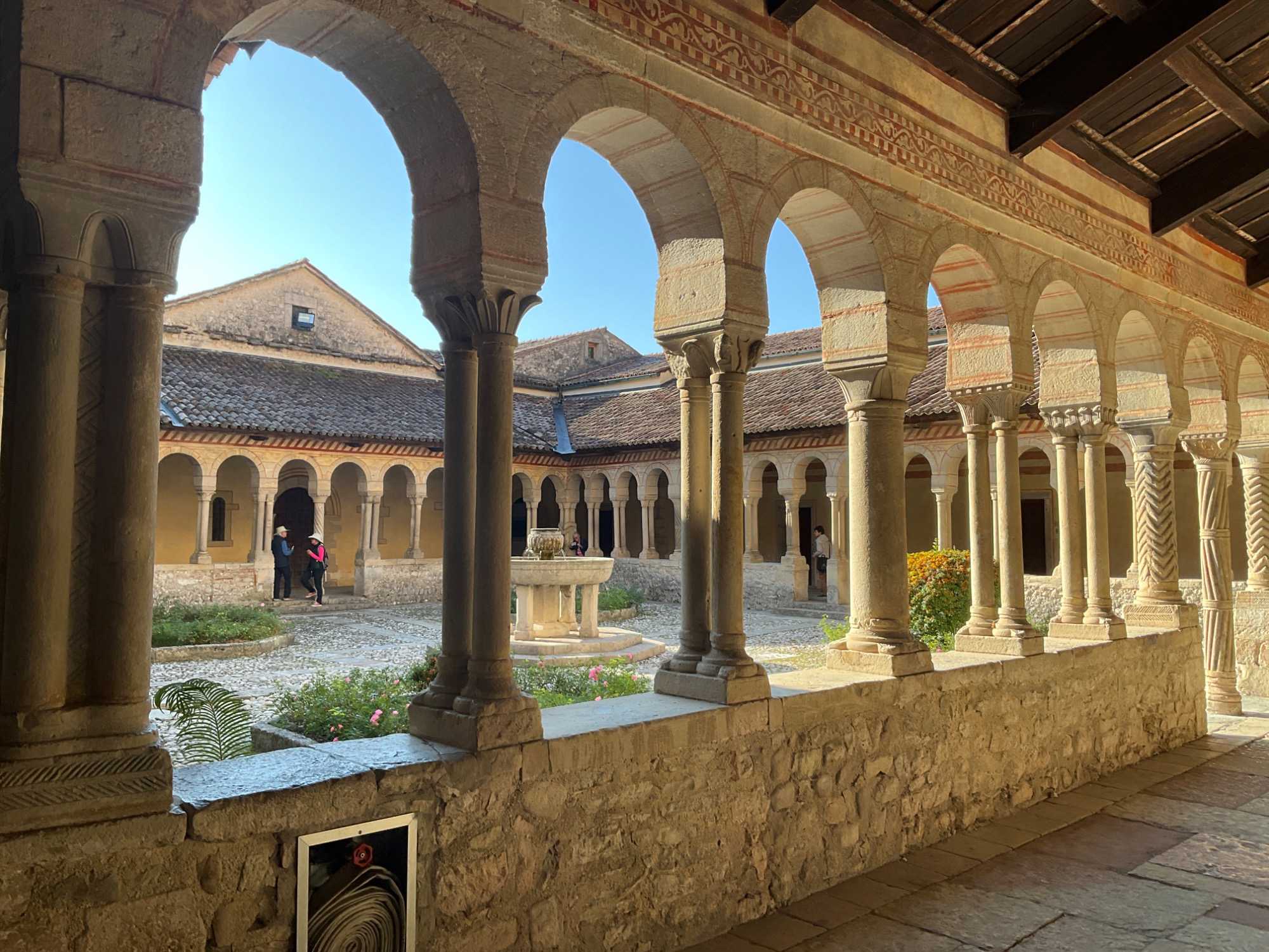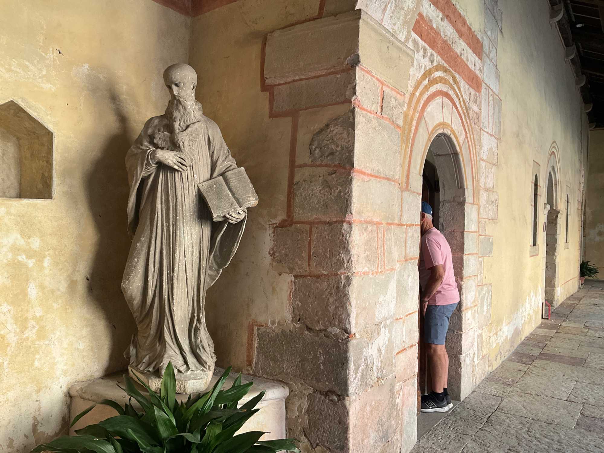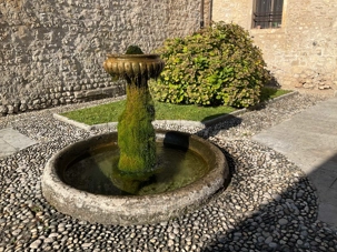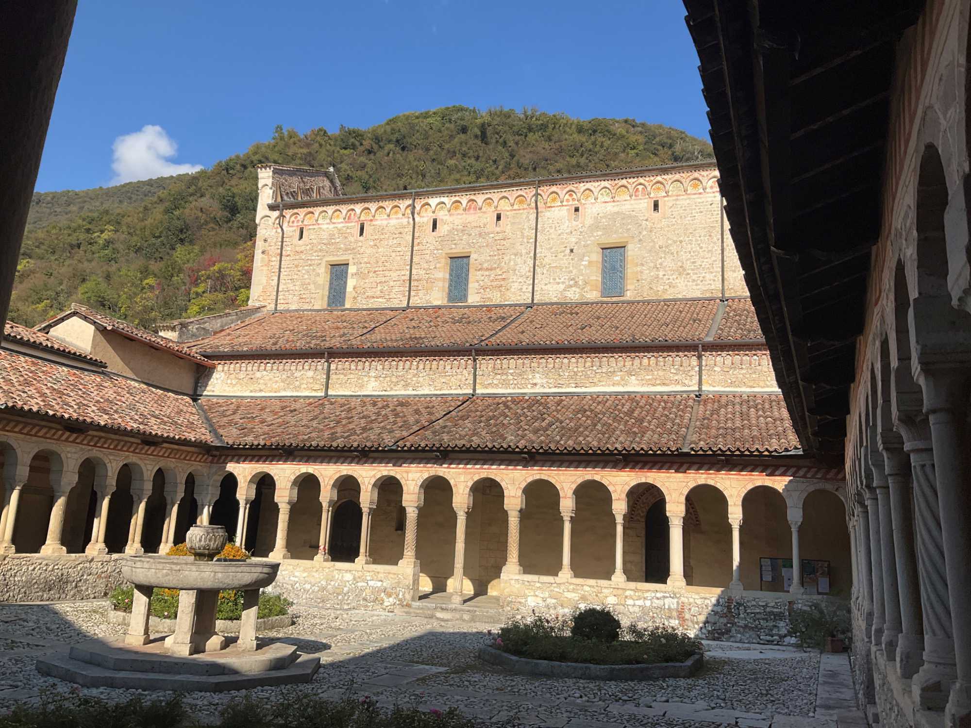 On s’arrête à l’un de ces petits villages de carte postale, Follina, pour y visiter un lieu religieux, une ancienne abbaye cistercienne de Santa Maria de Follina. On relate qu’il y avait eu une fondation bénédictine. Fondée en 1146, elle est fermée en 1771. Le démarrage probable de la construction du monastère aurait débuté en 1154. Vous imaginez, il y a pratiquement un millénaire. En 1229, le couvent a eu une vocation hospitalière. Puis les cisterciens sont remplacés par des moines camaldules (sorte de sous-branche des bénédictins). Par la suite, le cloître a été réparti entre plusieurs familles qui y construisent divers bâtiments. Puis en 1819, on lègue l’abbaye à la municipalité afin que celle-ci en fasse la paroisse de la ville. Durant la Première Guerre mondiale, l'abbaye s’est retrouvée au cœur des combats et a été fortement endommagée. Mais aujourd’hui, on a pu voir une restauration de grande ampleur, non seulement des dommages de la guerre, mais des destructions et pillages ayant affectés l'édifice depuis 1771, et tous ces travaux menés par des mains de maîtres… des communautés religieuses entre 1919 et 1922. À l’extérieur se niche la statue (1915) de la « bienheureuse Vierge de Follina ». La façade de l'abbatiale est de style roman. Ces ordres religieux nous laissent, de par leur mode de vie modeste, une église dénudée à l’intérieur, aucune décoration car, dit-on, notre regard doit se diriger vers le ciel…vers Dieu. Ce bâtiment est de style gothique italien. Des bénévoles assurent une présence qui nous permets de visiter la cour intérieure soit le cloître et sa fontaine,