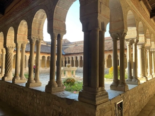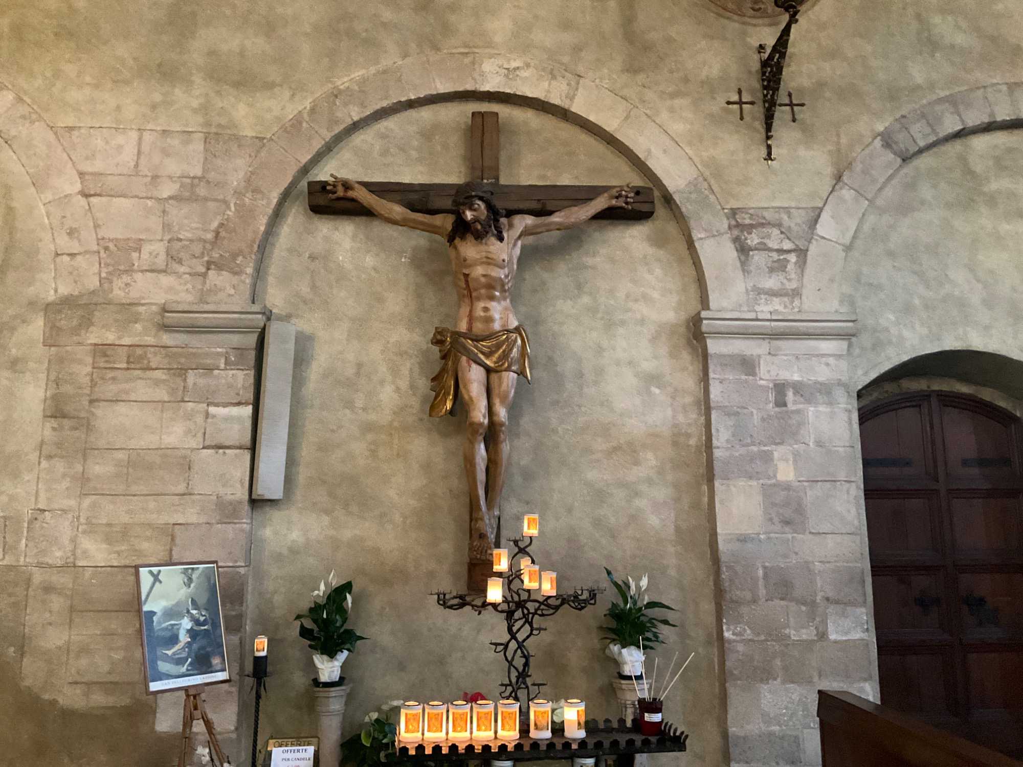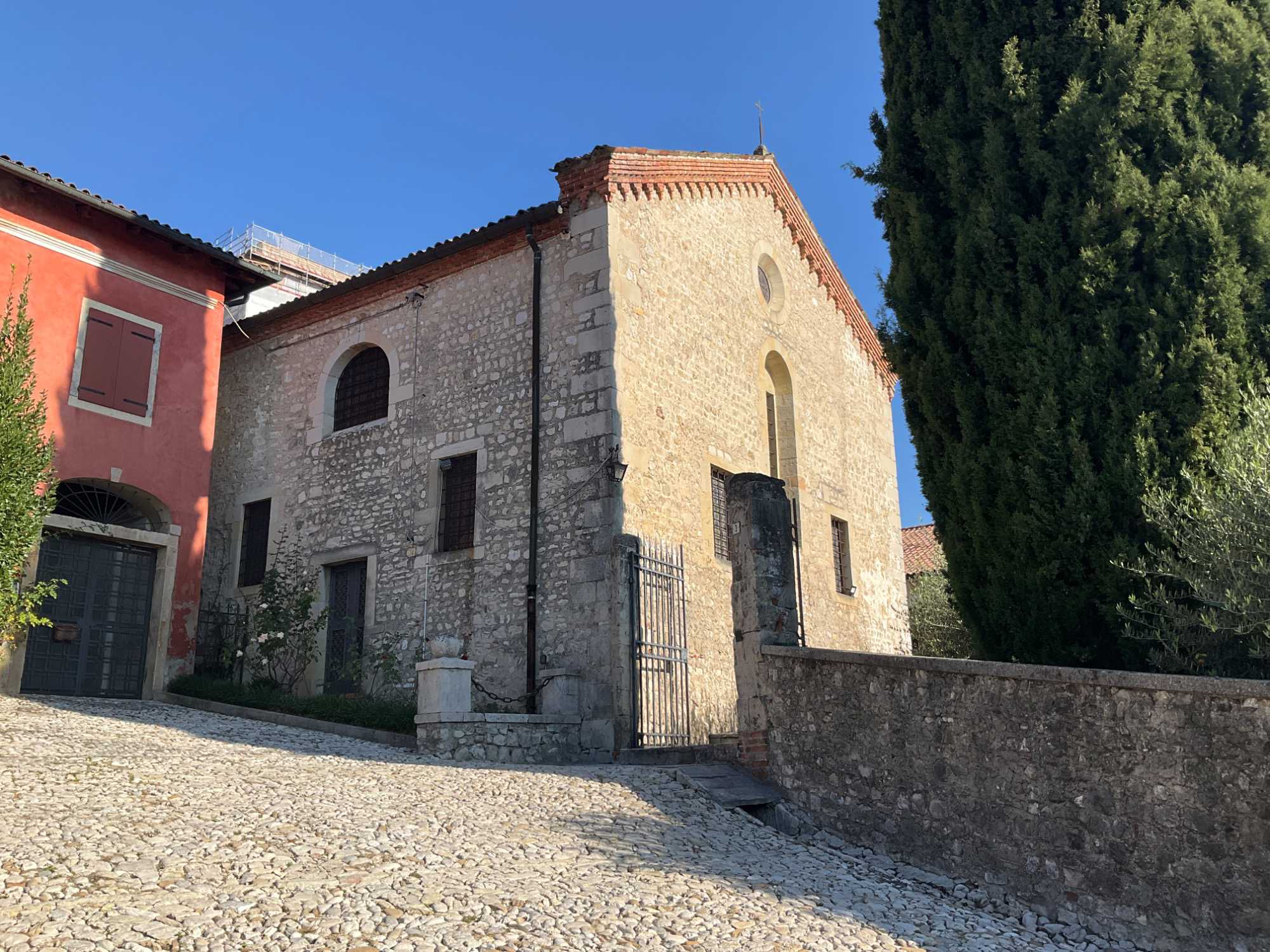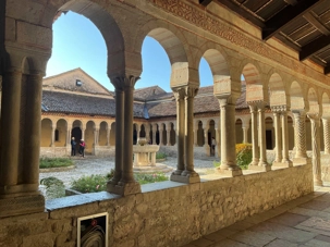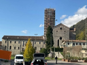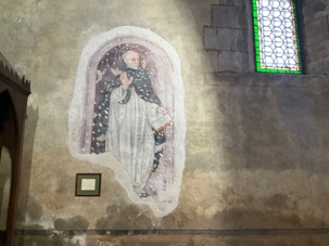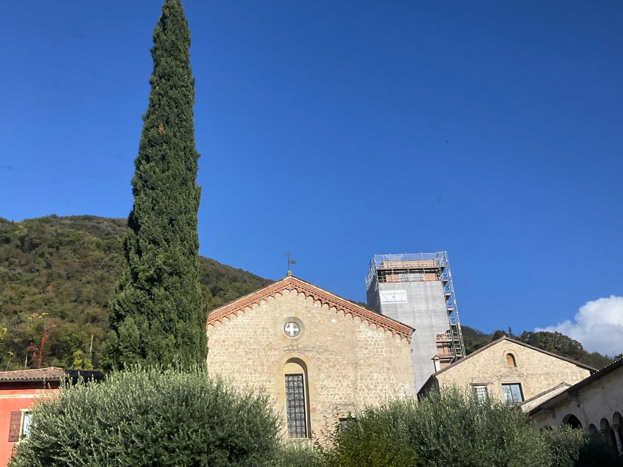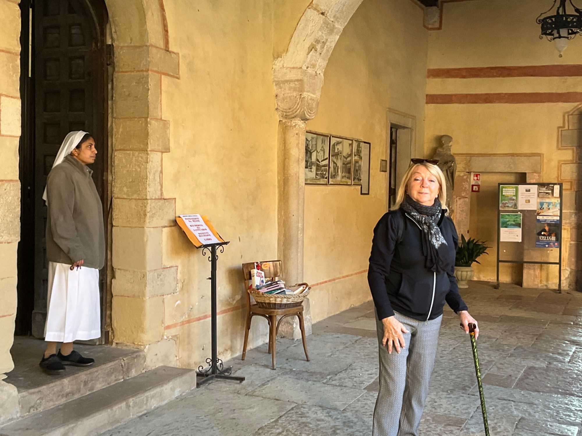 On s’arrête à l’un de ces petits villages de carte postale, Follina, pour y visiter un lieu religieux, une ancienne abbaye cistercienne de Santa Maria de Follina. On relate qu’il y avait eu une fondation bénédictine. Fondée en 1146, elle est fermée en 1771. Le démarrage probable de la construction du monastère aurait débuté en 1154. Vous imaginez, il y a pratiquement un millénaire. En 1229, le couvent a eu une vocation hospitalière. Puis les cisterciens sont remplacés par des moines camaldules (sorte de sous-branche des bénédictins). Par la suite, le cloître a été réparti entre plusieurs familles qui y construisent divers bâtiments. Puis en 1819, on lègue l’abbaye à la municipalité afin que celle-ci en fasse la paroisse de la ville. Durant la Première Guerre mondiale, l'abbaye s’est retrouvée au cœur des combats et a été fortement endommagée. Mais aujourd’hui, on a pu voir une restauration de grande ampleur, non seulement des dommages de la guerre, mais des destructions et pillages ayant affectés l'édifice depuis 1771, et tous ces travaux menés par des mains de maîtres… des communautés religieuses entre 1919 et 1922. À l’extérieur se niche la statue (1915) de la « bienheureuse Vierge de Follina ». La façade de l'abbatiale est de style roman. Ces ordres religieux nous laissent, de par leur mode de vie modeste, une église dénudée à l’intérieur, aucune décoration car, dit-on, notre regard doit se diriger vers le ciel…vers Dieu. Ce bâtiment est de style gothique italien. Des bénévoles assurent une présence qui nous permets de visiter la cour intérieure soit le cloître et sa fontaine,