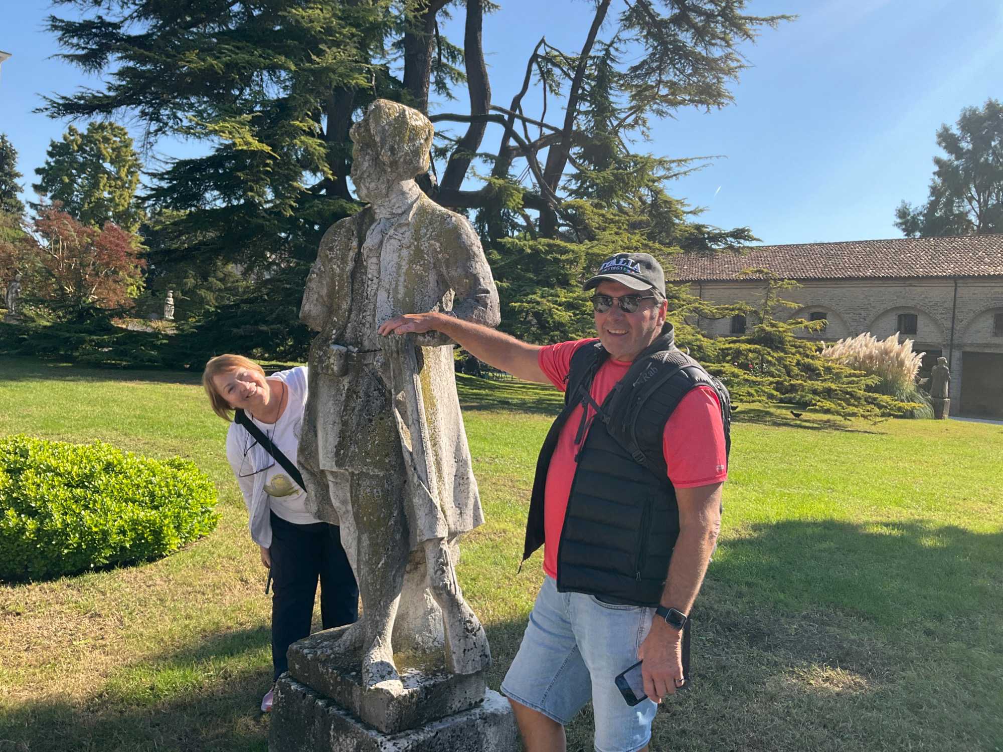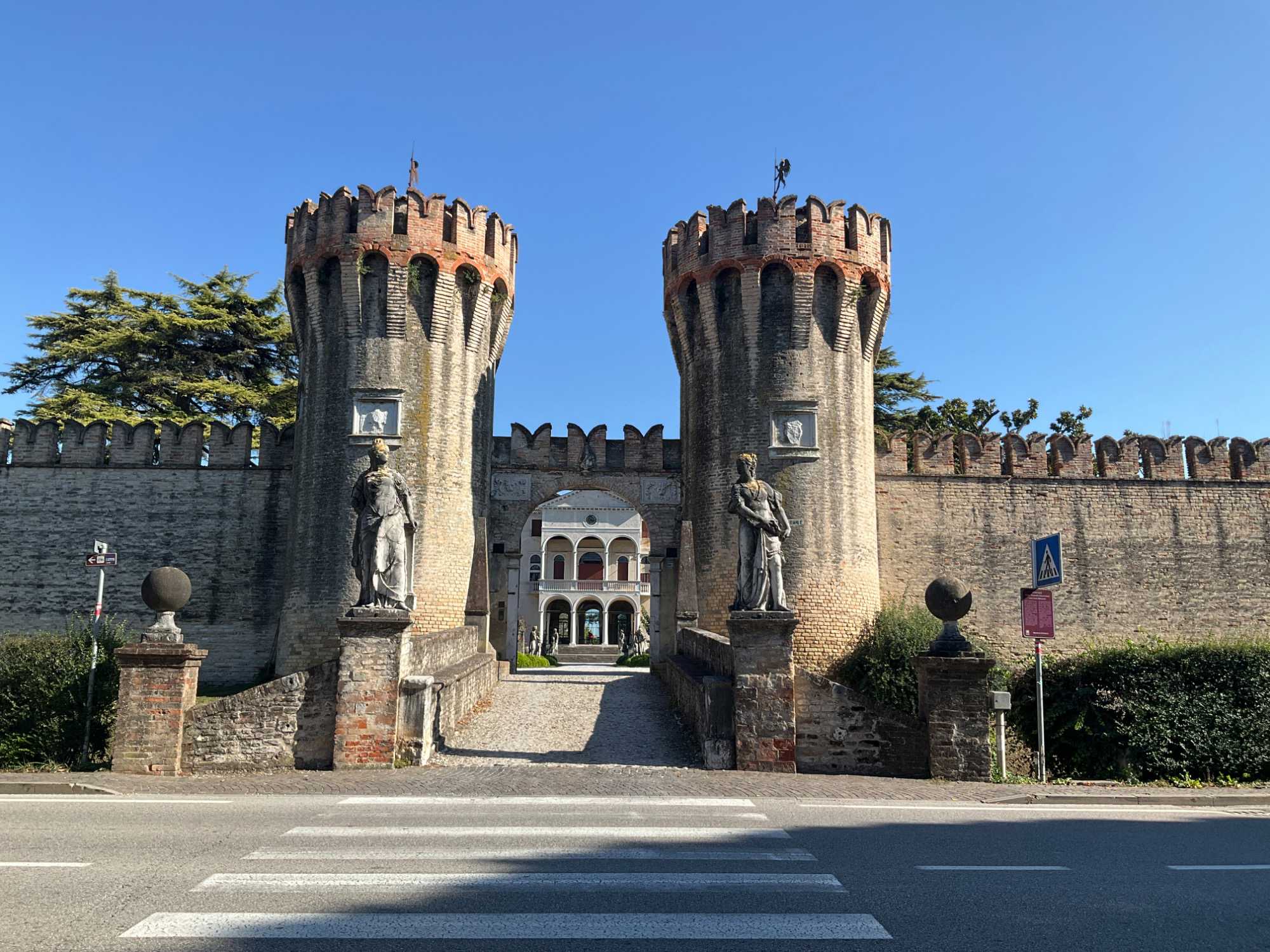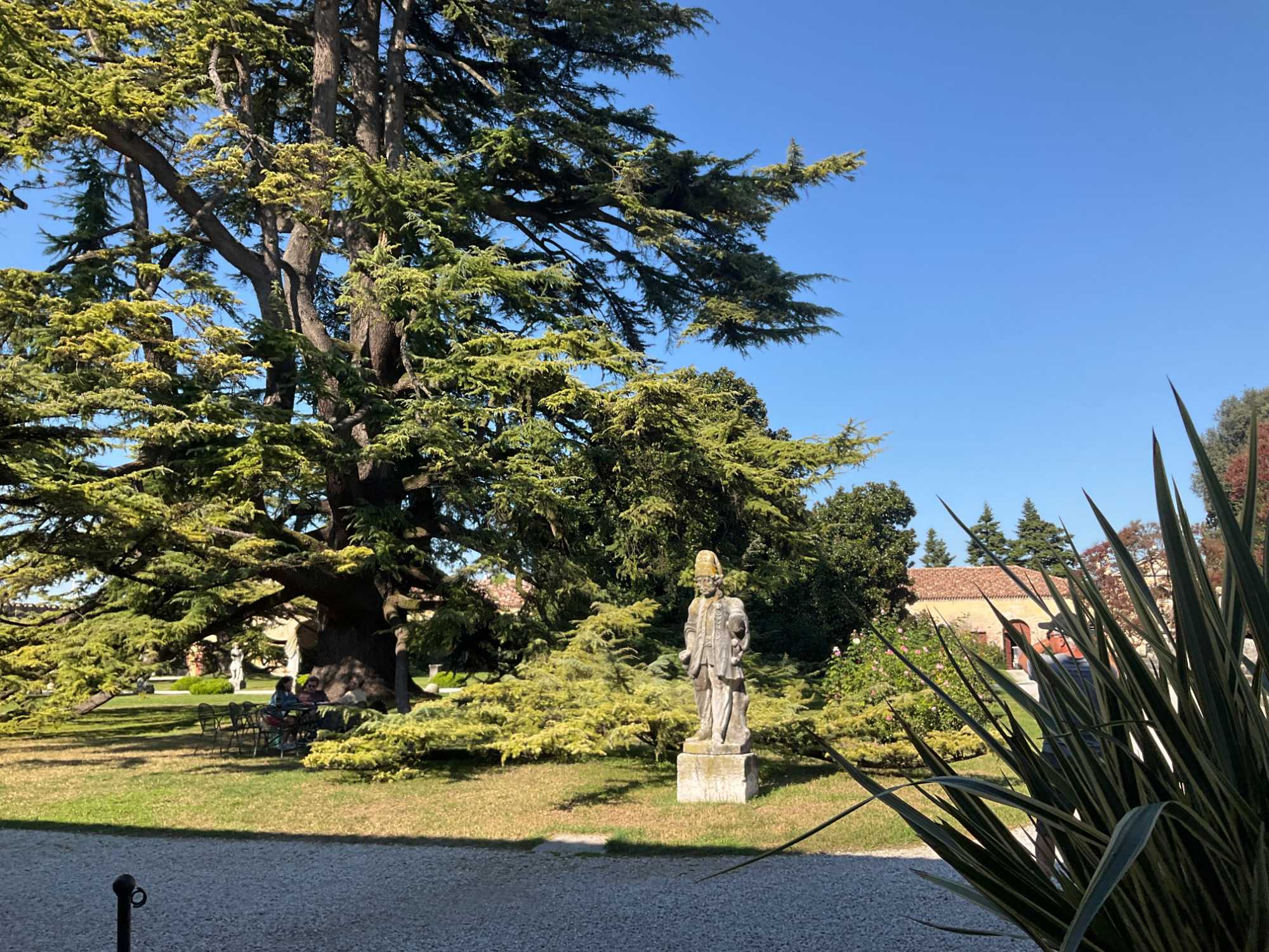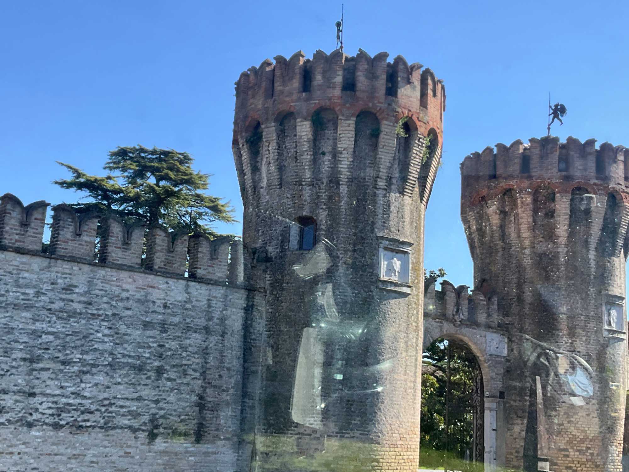 Puis, vint le moment du repas dégustation. L’autocar s’arrête devant un espèce de chateau. Ça ne semblait pas inclus dans l’horaire de notre journée. On descend et c’est à ce moment qu’Alex mentionne que c’est ici au Castello di Roncarde qu’a lieu notre activité tant attendu. On est tous bouche bée. Un si bel endroit! Pour se rendre au chateau et ses remparts, une série de statues bordent l’entrée, il serait ici question de modèles d’anciens esclaves libérés devenus soldats. Les jardins à l’entrée sont somptueux avec des spéciments d’arbres gigantesques: cèdres du Liban géant, magnolas, rosiers anciens…