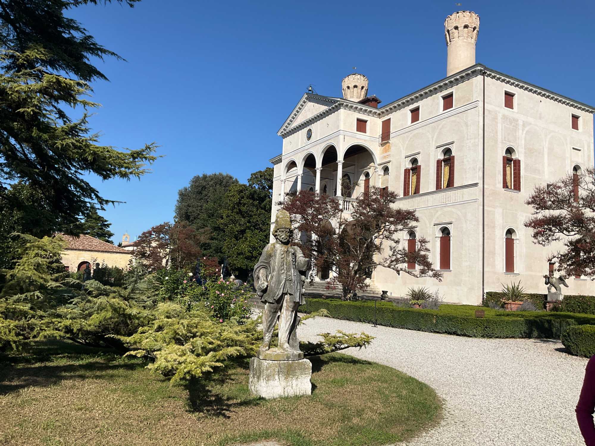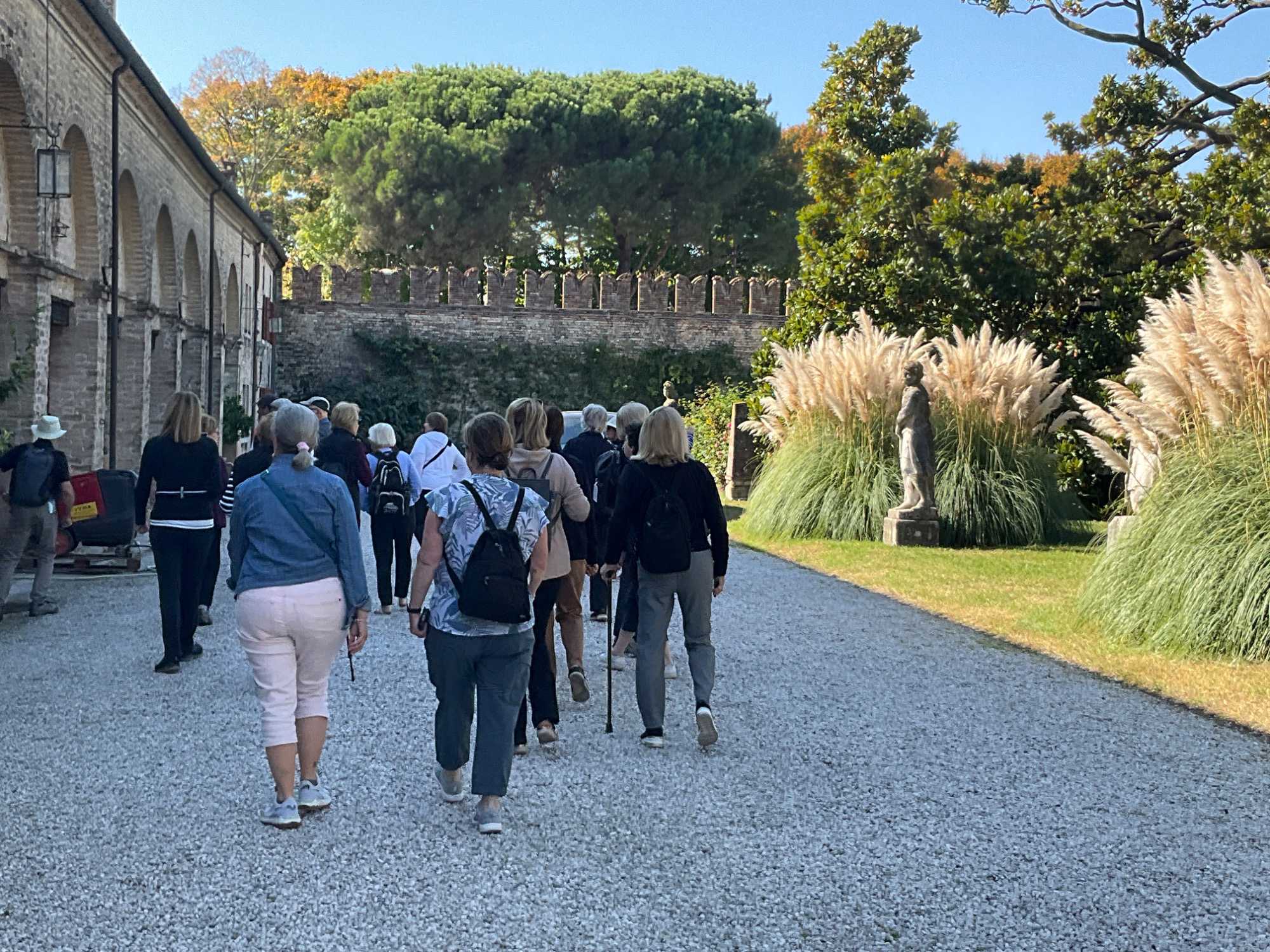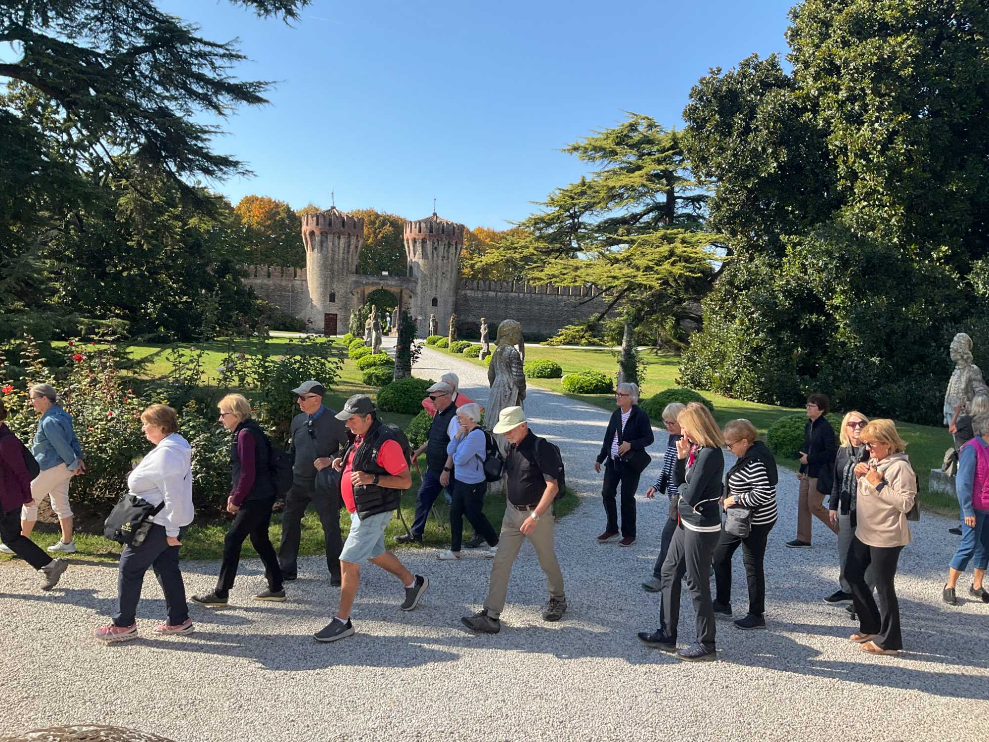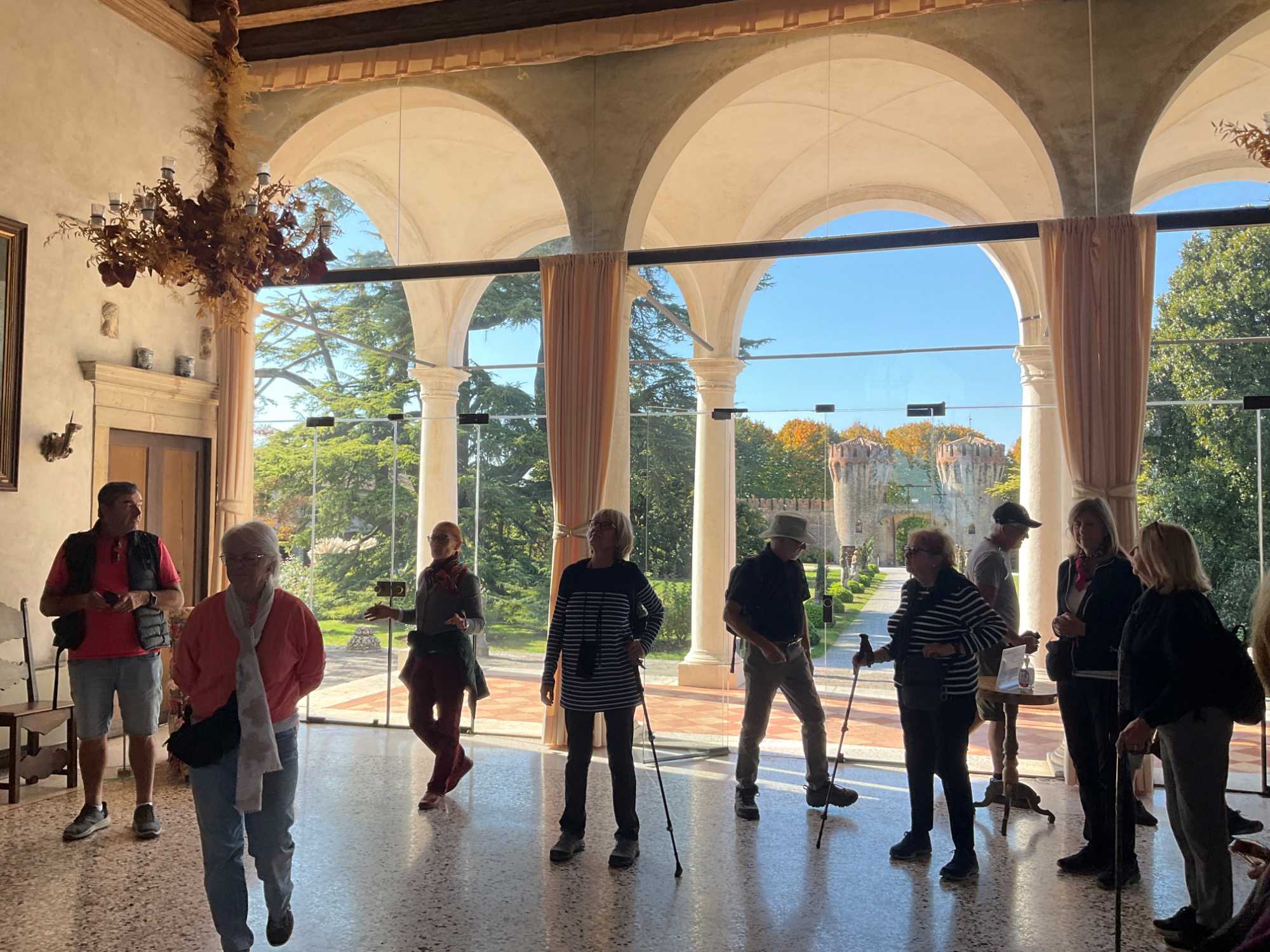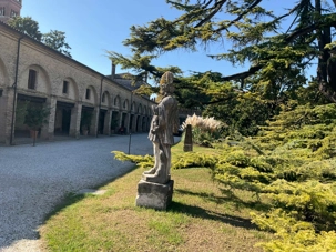 Puis, vint le moment du repas dégustation. L’autocar s’arrête devant un espèce de chateau. Ça ne semblait pas inclus dans l’horaire de notre journée. On descend et c’est à ce moment qu’Alex mentionne que c’est ici au Castello di Roncarde qu’a lieu notre activité tant attendu. On est tous bouche bée. Un si bel endroit! Pour se rendre au chateau et ses remparts, une série de statues bordent l’entrée, il serait ici question de modèles d’anciens esclaves libérés devenus soldats. Les jardins à l’entrée sont somptueux avec des spéciments d’arbres gigantesques: cèdres du Liban géant, magnolas, rosiers anciens…