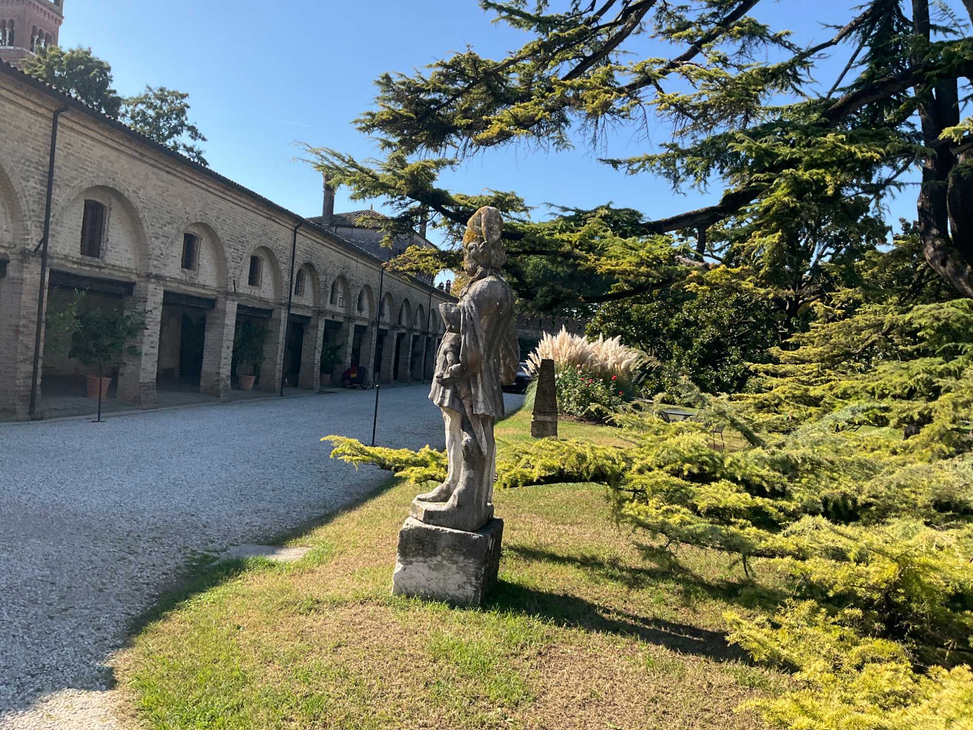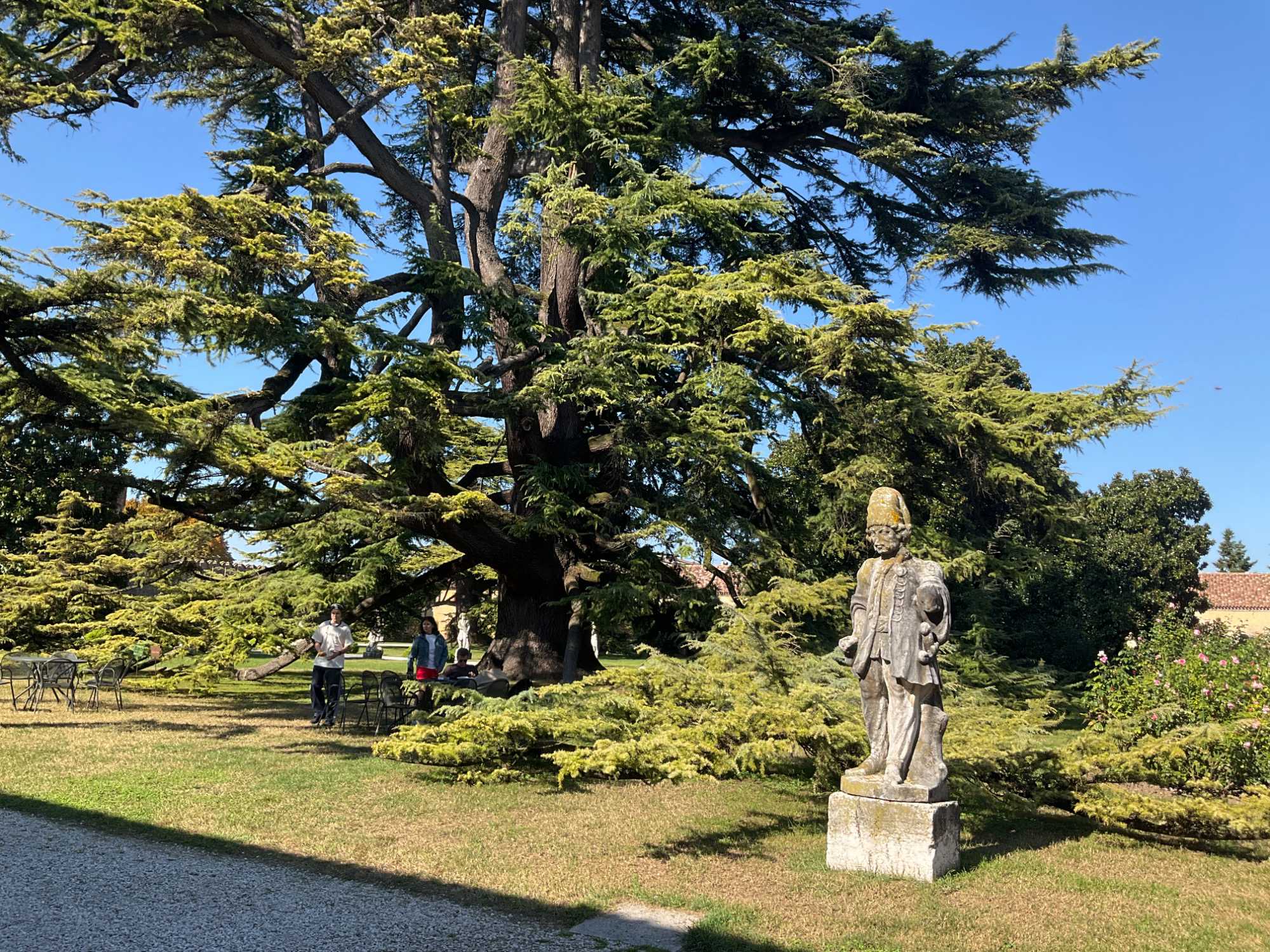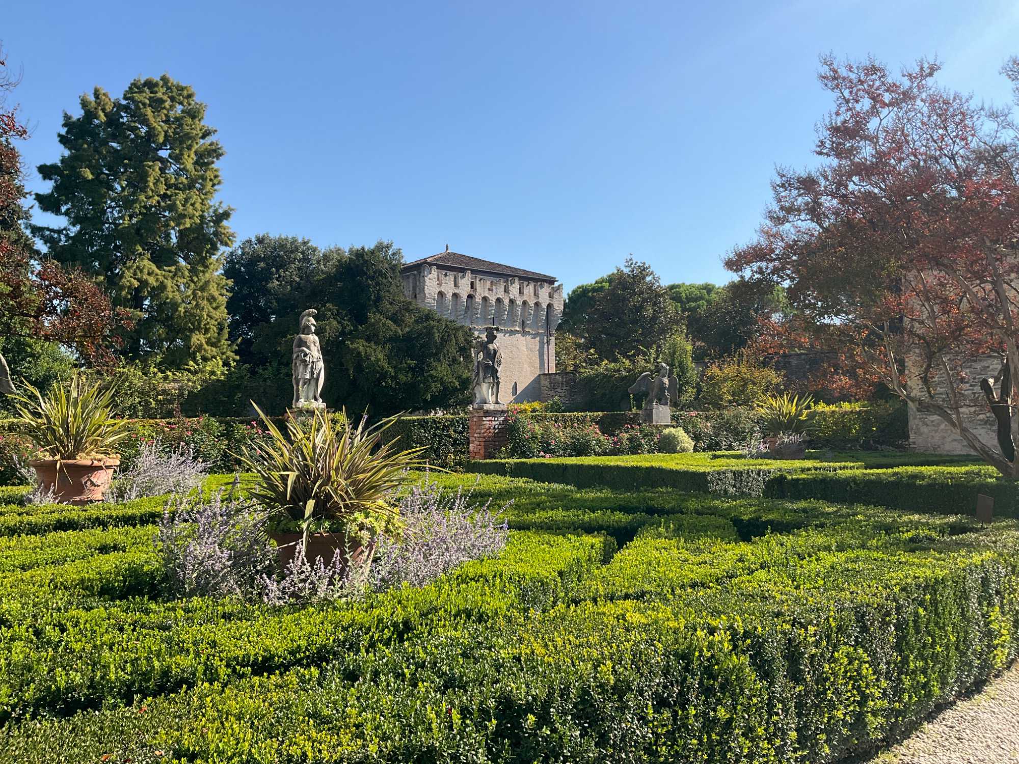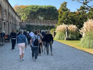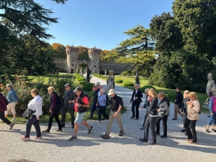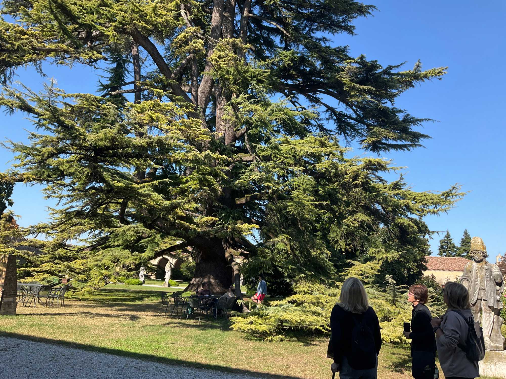 Puis, vint le moment du repas dégustation. L’autocar s’arrête devant un espèce de chateau. Ça ne semblait pas inclus dans l’horaire de notre journée. On descend et c’est à ce moment qu’Alex mentionne que c’est ici au Castello di Roncarde qu’a lieu notre activité tant attendu. On est tous bouche bée. Un si bel endroit! Pour se rendre au chateau et ses remparts, une série de statues bordent l’entrée, il serait ici question de modèles d’anciens esclaves libérés devenus soldats. Les jardins à l’entrée sont somptueux avec des spéciments d’arbres gigantesques: cèdres du Liban géant, magnolas, rosiers anciens…