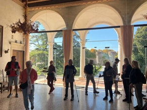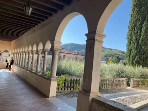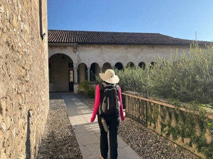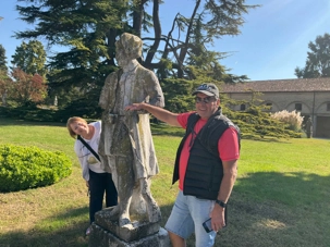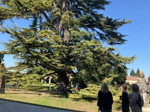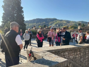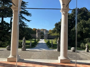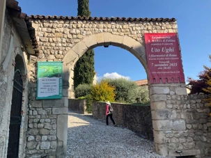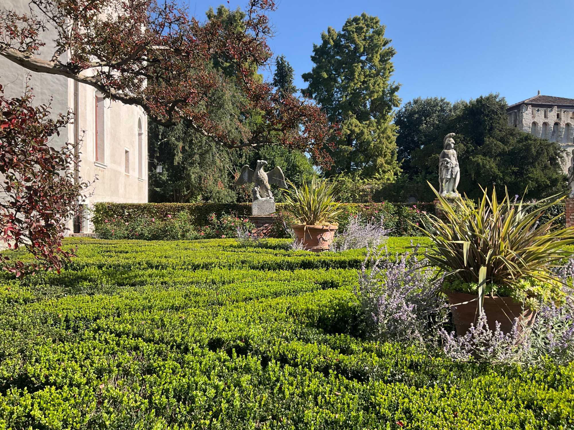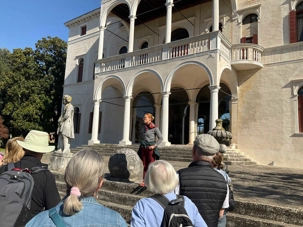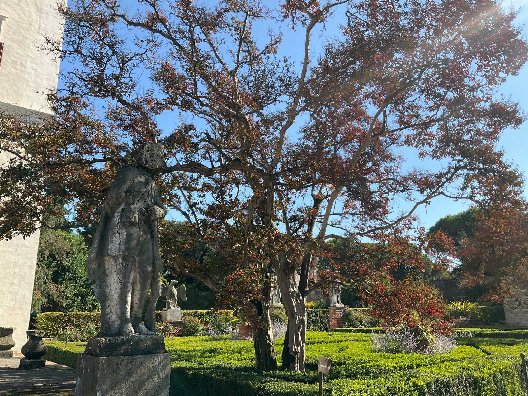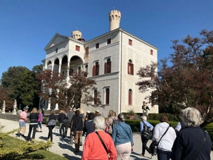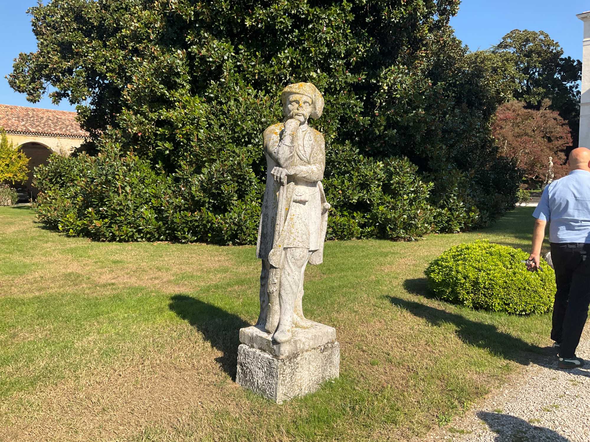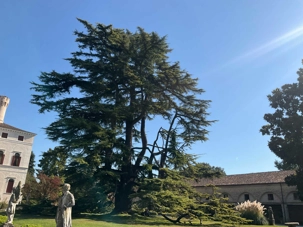 Puis, vint le moment du repas dégustation. L’autocar s’arrête devant un espèce de chateau. Ça ne semblait pas inclus dans l’horaire de notre journée. On descend et c’est à ce moment qu’Alex mentionne que c’est ici au Castello di Roncarde qu’a lieu notre activité tant attendu. On est tous bouche bée. Un si bel endroit! Pour se rendre au chateau et ses remparts, une série de statues bordent l’entrée, il serait ici question de modèles d’anciens esclaves libérés devenus soldats. Les jardins à l’entrée sont somptueux avec des spéciments d’arbres gigantesques: cèdres du Liban géant, magnolas, rosiers anciens…