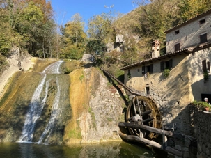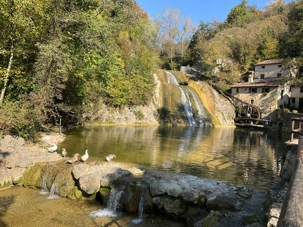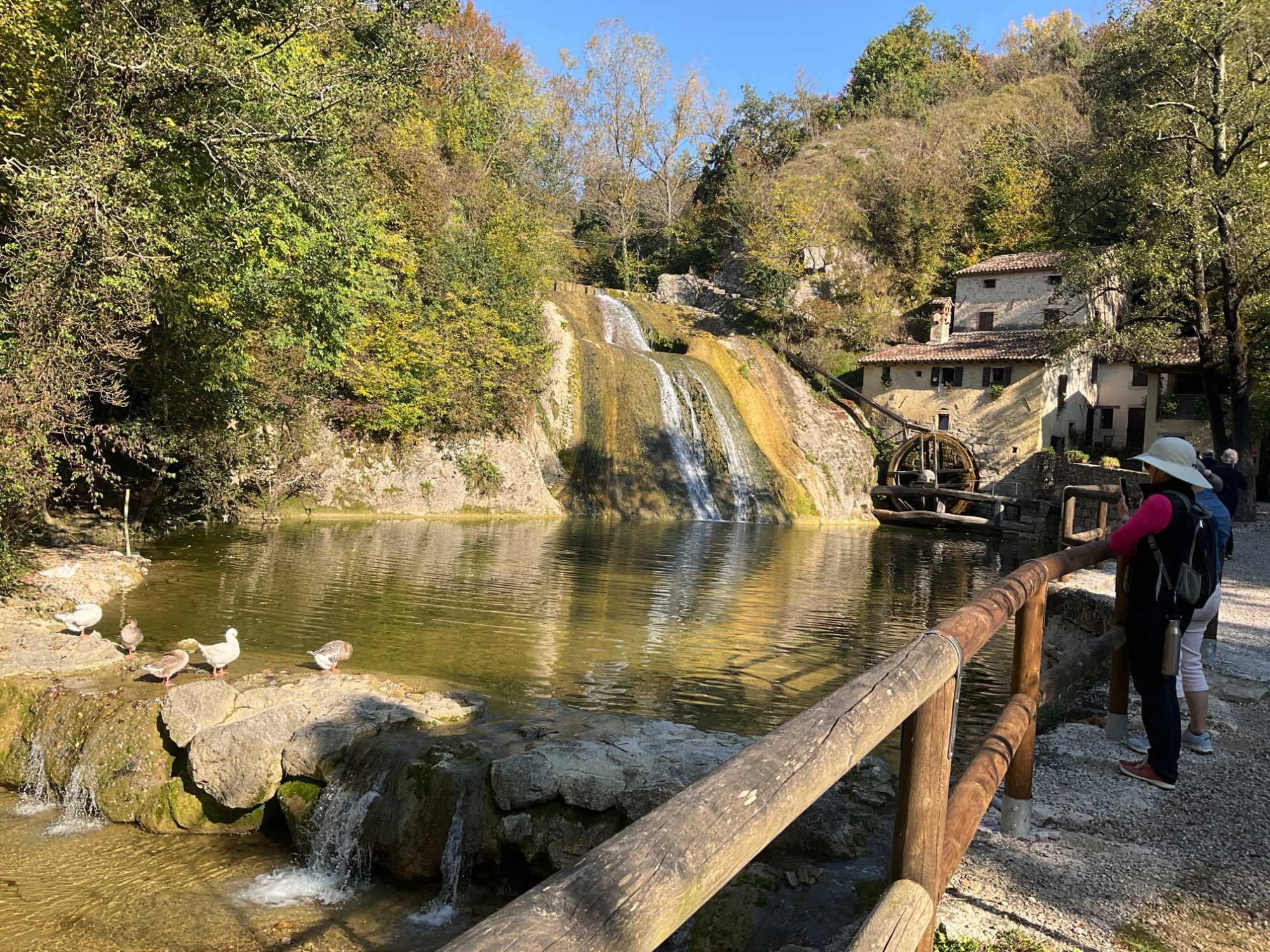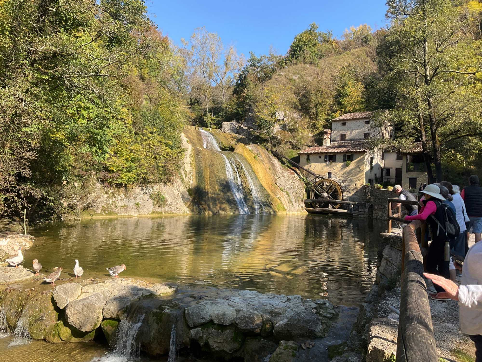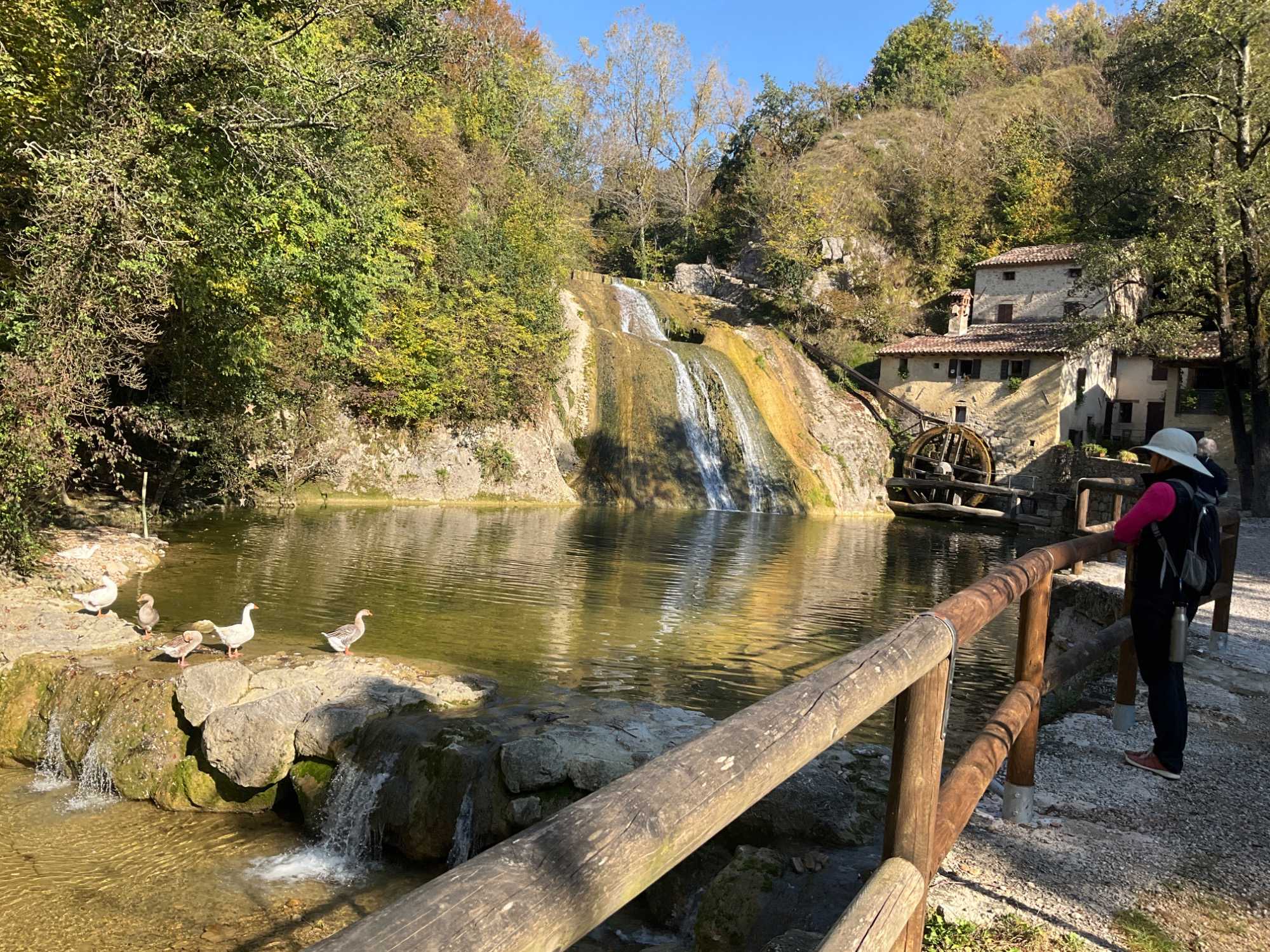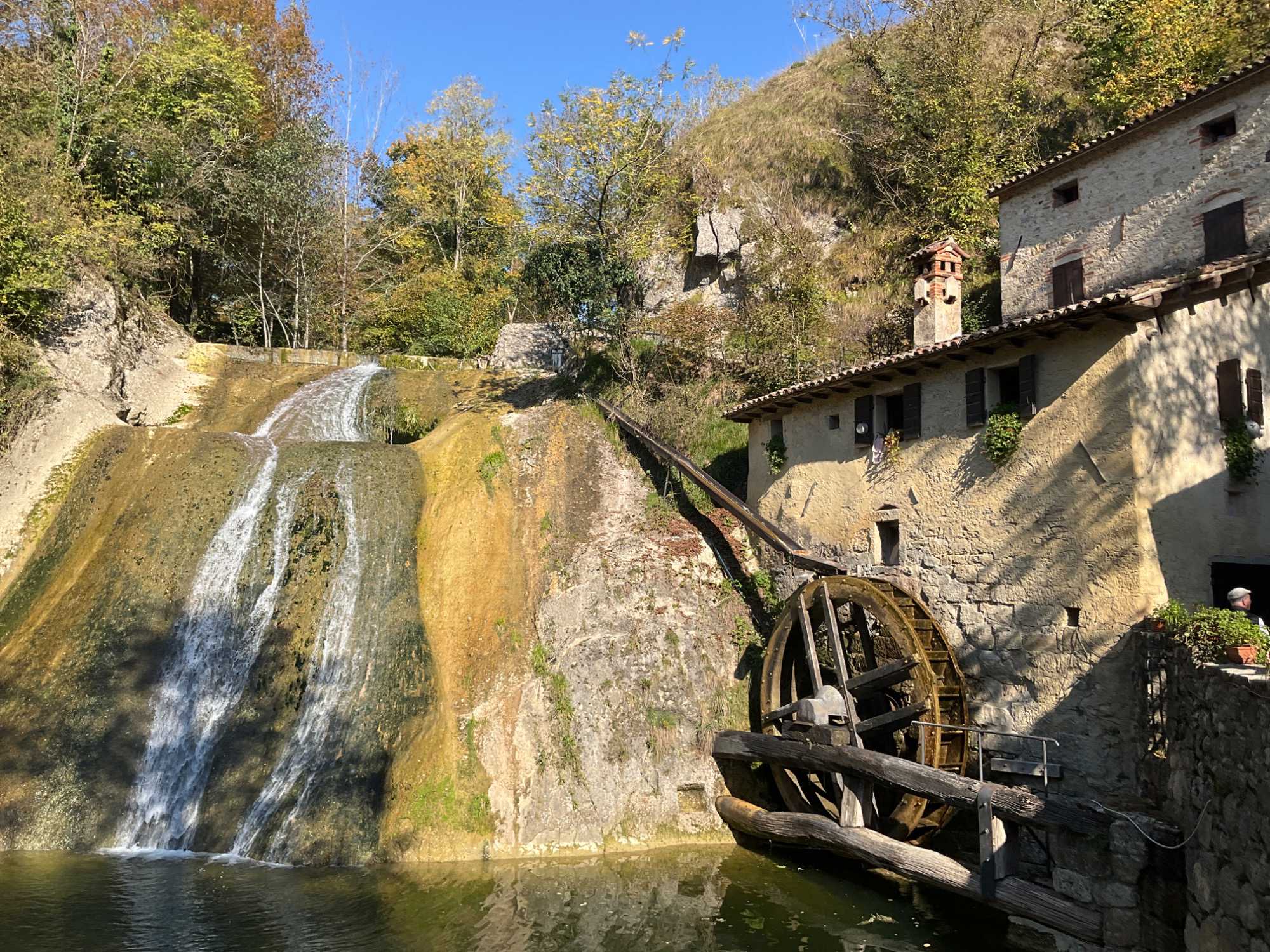 Tout près de là, à Refrontolo se cache un ancien moulin des années 1600 appelé Molinetto della Croda, juste au pied de la cascade du torrent Lierza qui a l’allure d’un voile de mariée. Il est un des rares moulins à eau en activité qui a su conserver son charme. Ce dernier se positionne sur un site enchanteur, auquel se dresse son immense roue et, quelques oies lors de notre passage, notre coup de coeur! On a pu apprécier les caractéristiques de l'architecture rurale du XVIIe siècle. Des informations confirment que le bâtiment a été construit en plusieurs étapes. Les fondations de la construction originale reposent sur la roche nue, précisément la « croda » de la montagne. On apprend que des agrandissements ultérieurs ont permis de créer des logements pour des familles modestes de meuniers, (l’histoire ne dit pas si les familles étaient composées de plusieurs enfants à cette époque comme les familles québécoises) toujours aux prises avec la pauvreté et la menace imminente d'inondations soudaines et dévastatrices comme ils ont eu en 1941 et 1953. Il était intéressant d’entrer en contact avec ce symbole d'une civilisation rurale au bord de l'extinction sous la pression de la civilisation industrielle ici aussi. Il a moulu sa dernière farine en 1953. Par la suite, il est resté inhabité pendant plusieurs années et dans un état d'abandon. Mais on l’a remis au goût du jour grâce à des travaux de restaurations minutieuses. Les artisans ont fait un travail consciencieux qui a permis de préserver intactes les caractéristiques du bâtiment. Le moulin a été fidèlement reconstitué et… fonctionne à nouveau. Bravo!