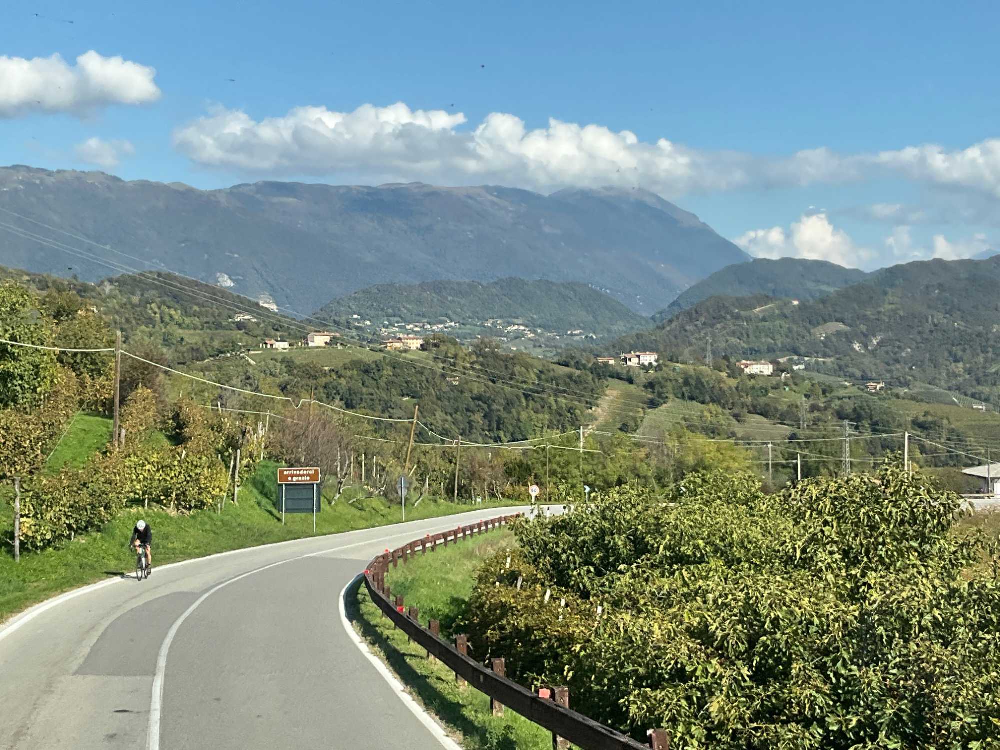 Alors, on vous énumère ici, dans l’ordre ou dans le désordre, le nom des petits villages que nous avons traversés pour vous mettre un peu dans l’ambiance: Musiele di Piave (Piave : fleuve ou pour nous: rivière), Fossalta di Piave, Zenson di Piave, Fagare di Bataglia, Breda di Piave, Maseronda sul Piave, Spresiano, Ponte della Priula, Colfosco, Pieve di Solego, Follina, Valsana, Pedeguarda, Refrontolo, Vittorio Veneto, Vittorio Venato, Cozzuilo….un chapelet de petits villages! Peut-être que vos Google Maps ne vous donneront pas certains de ces villages car ce sont en fait ce qu’on appelle ici des « frazione » ou si vous préférez, des bourgs.