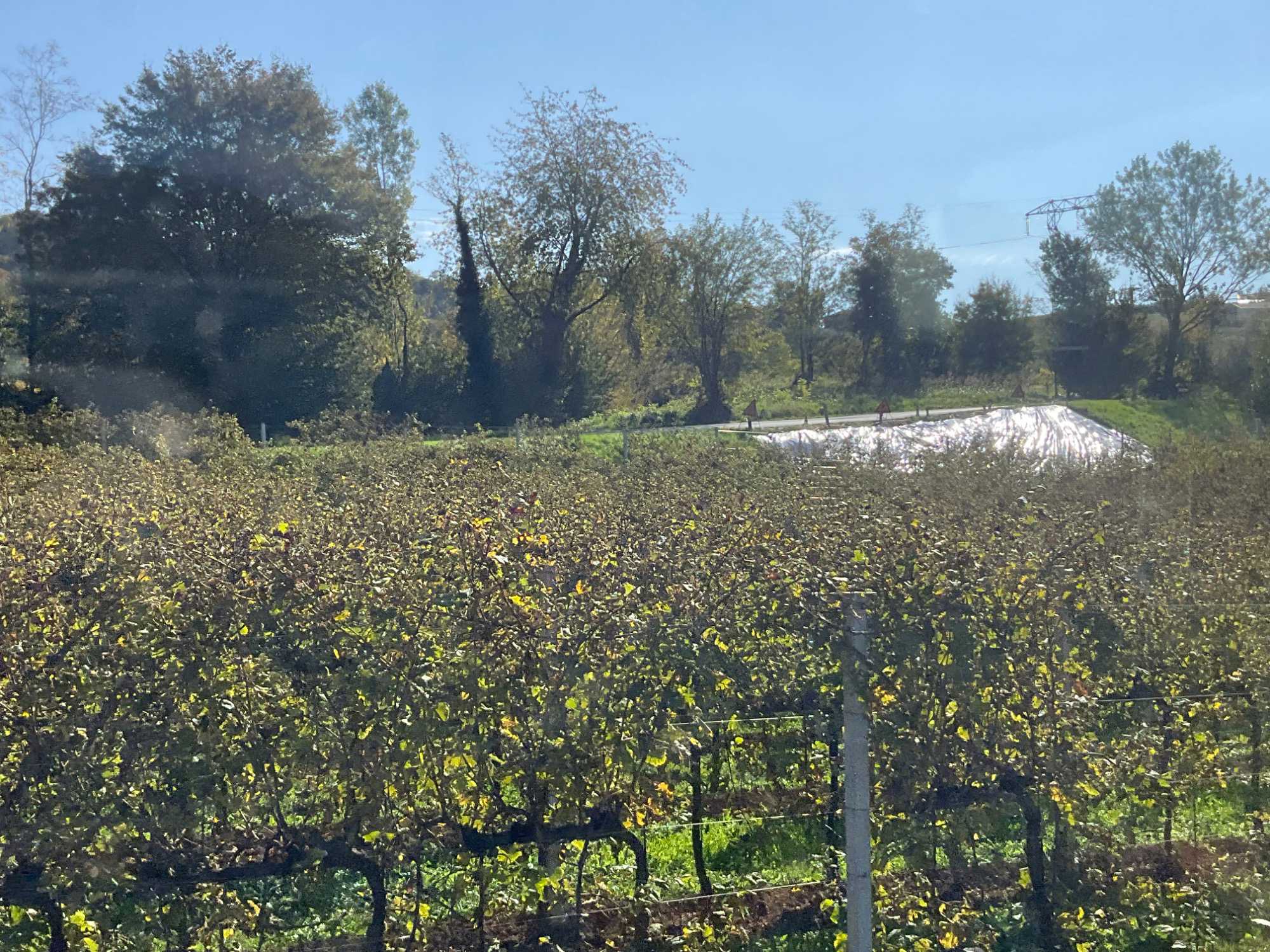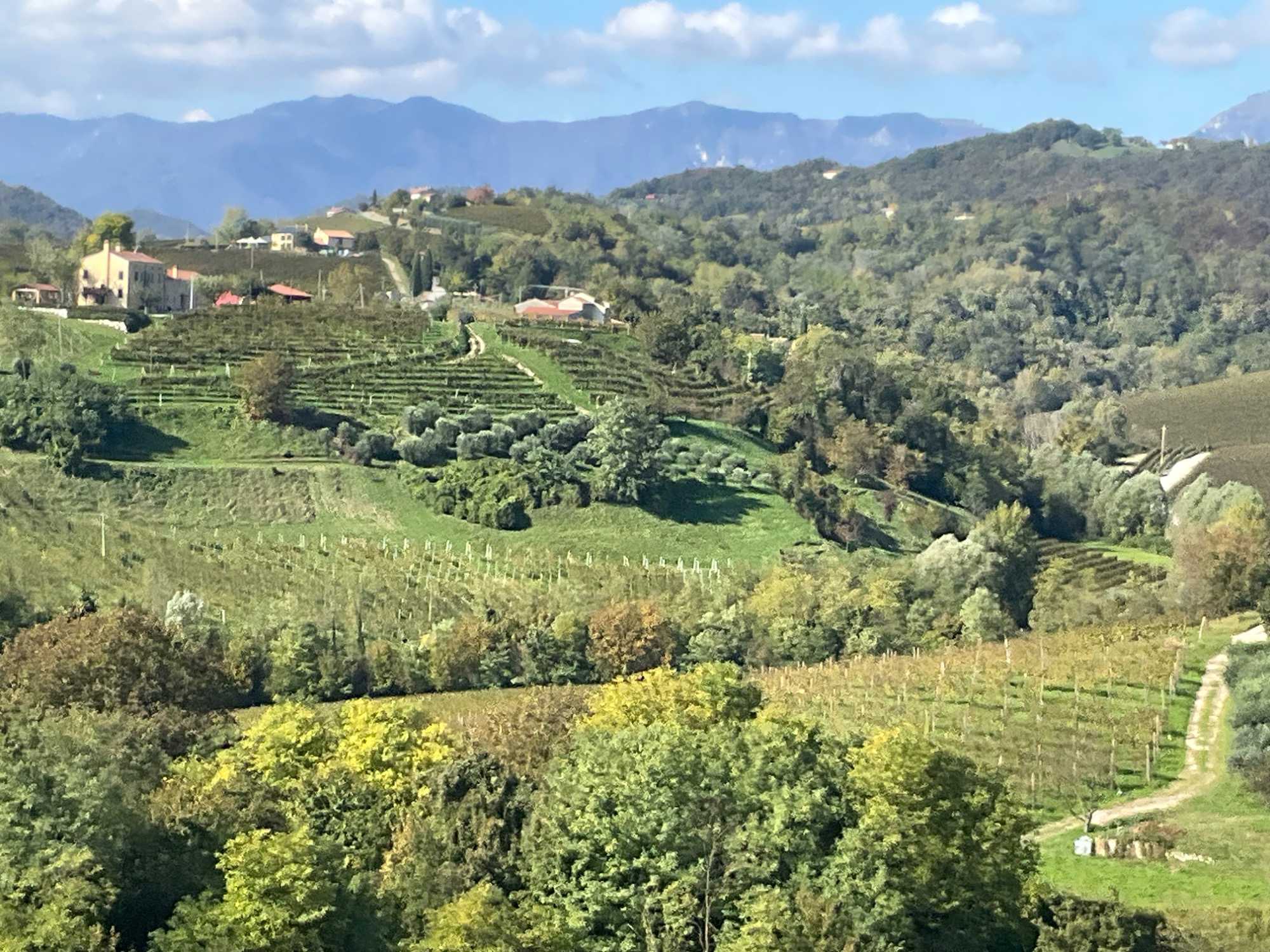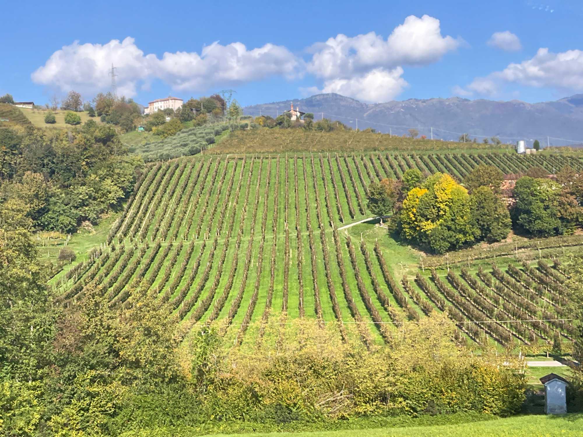 Alex mentionne que la quinzaine de communes de la région, productrices de Prosecco, ont ainsi favorisé la création d’un paysage agricole multiforme tant par sa forme que par sa composition. C’est le fameux « patchwork » ou si vous préférez, la « courte-pointe » qui a fait la réputation du prosecco superiore. Déjà en ce début d’automne ici, les vignes commencent à prendre les couleurs des courtepointes multicolores comme sur le lit de votre grand-mère. Pour toutes ses raisons, en 2019, les collines du Prosecco de Conegliano Valdobbiadene ont reçu la distinction suprême de patrimoine mondial de l’UNESCO grâce à leur paysage et culture ancienne unique au monde et, est devenue l’appellation d’origine contrôlée et garantie (DOCG) Conegliano Valdobbiadene.