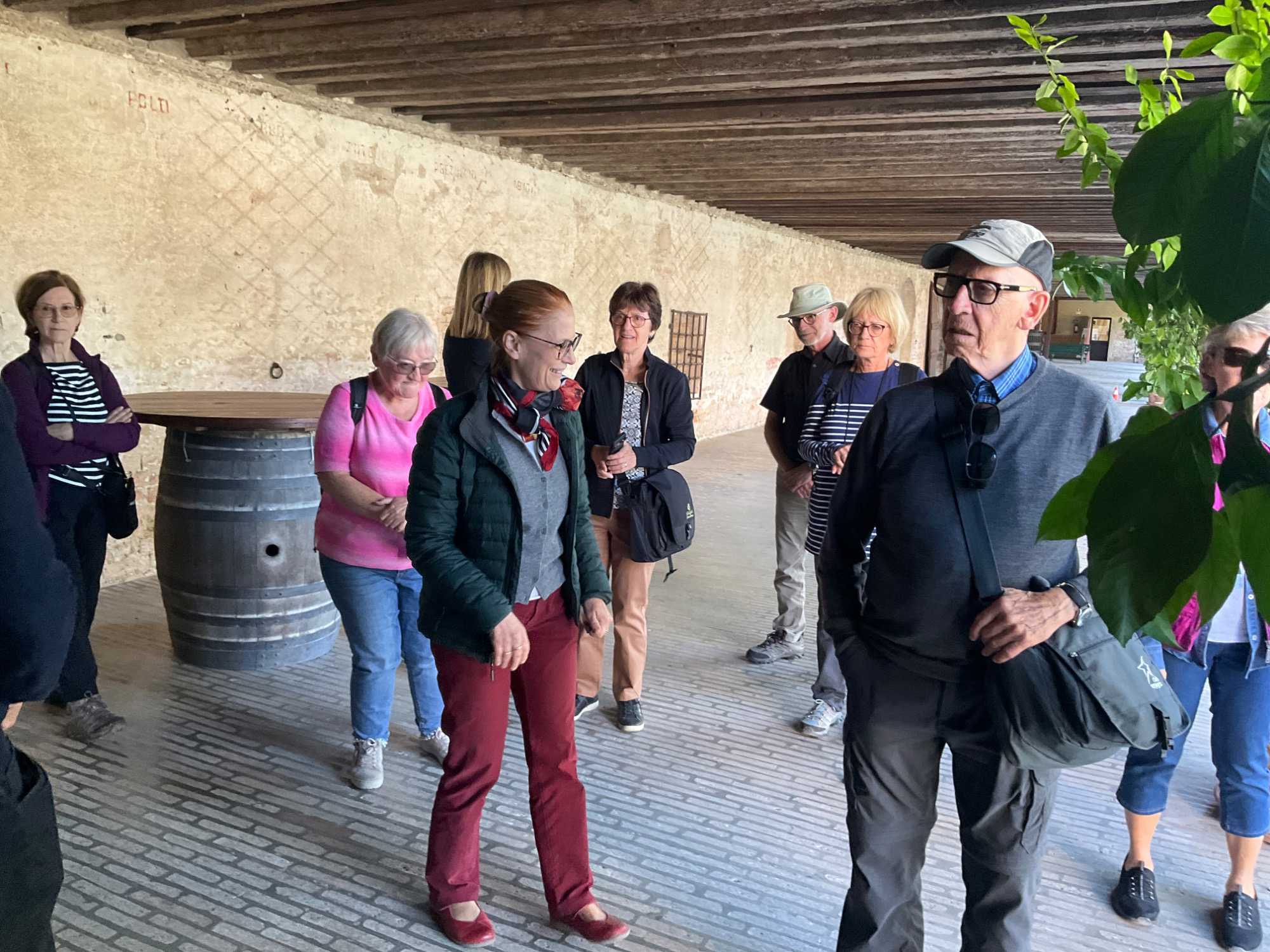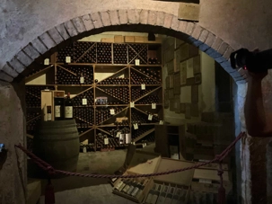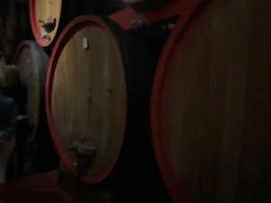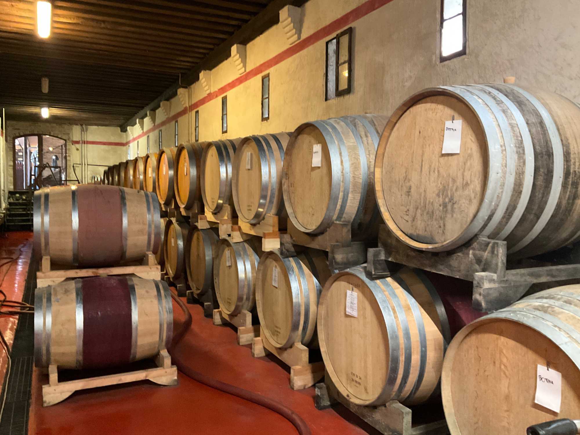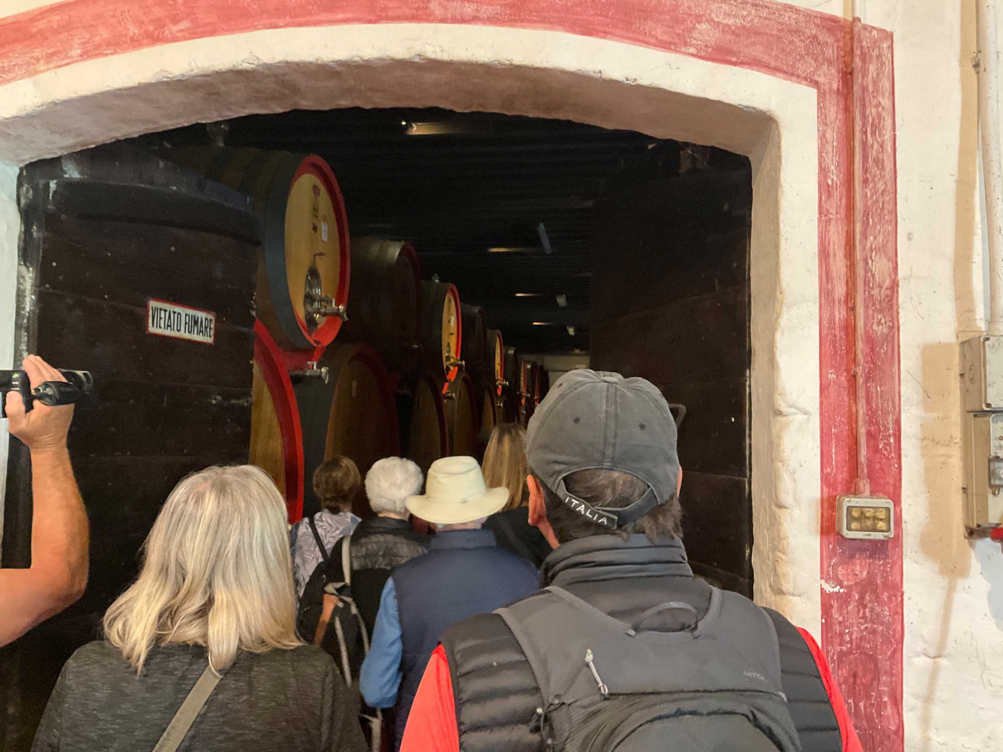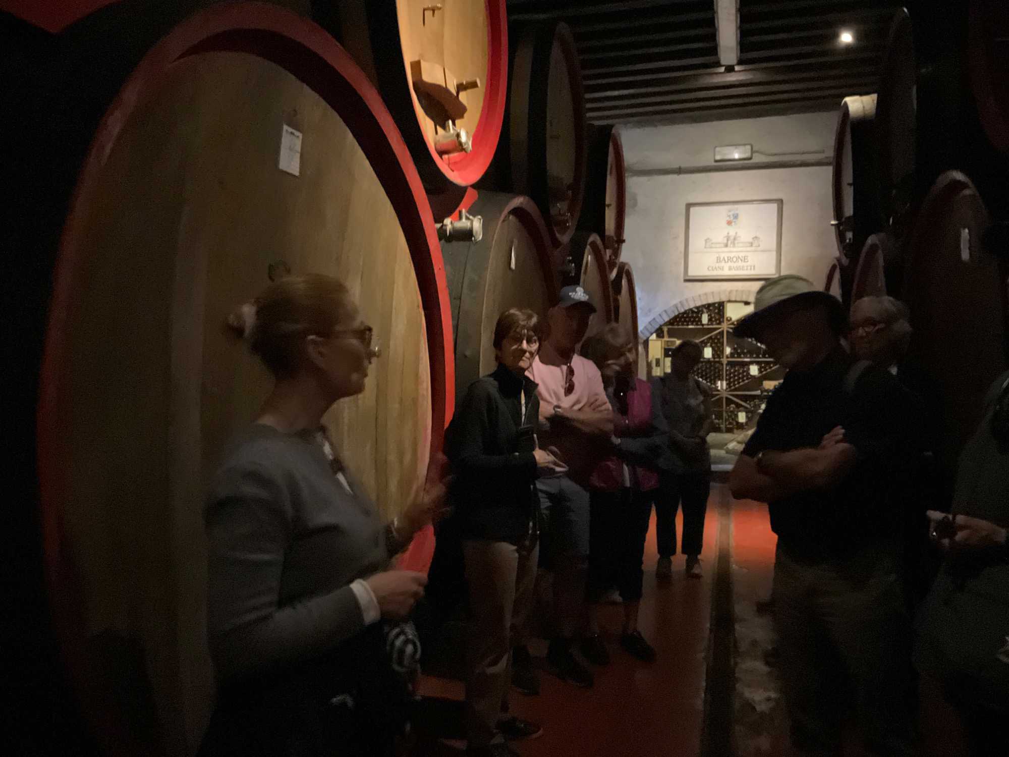 Emilia nous fait la présentation du salon de ce palais sous forme de chateau, à l’architecture vénitienne qui à l’époque, en 1508 appartenait à des entrepreneurs commerciaux : la famille Bassetti. Ces derniers, entrepreneurs agricoles y venaient…deux fois par année. Après la première guerre mondiale, la structure fut endommagée et les lieux servirent d’hôpital pour les soldats. Puis des années plus tard, d’autres propriétaires reprirent les lieux pour développer une cave à vins vieillis (vins de garde) munie de barils de chêne particuliers, petits et immenses, comme vous verrez sur les photos. Ici, on privilégie le vin de qualité à la quantité (400 000 bouteilles). Les vendanges sont effectuées de façon manuelle. Les épais murs de pierres et les minuscules fenêtres assurent une température constante.