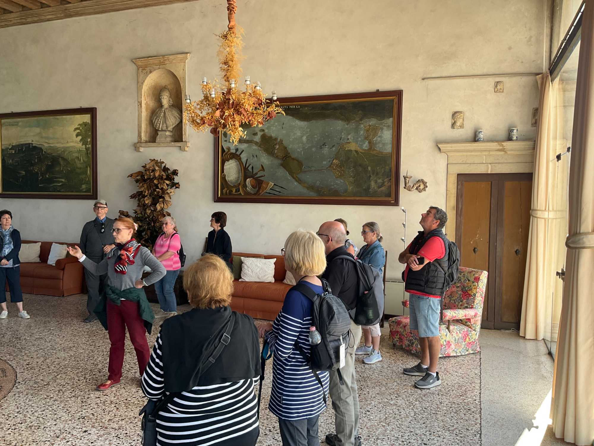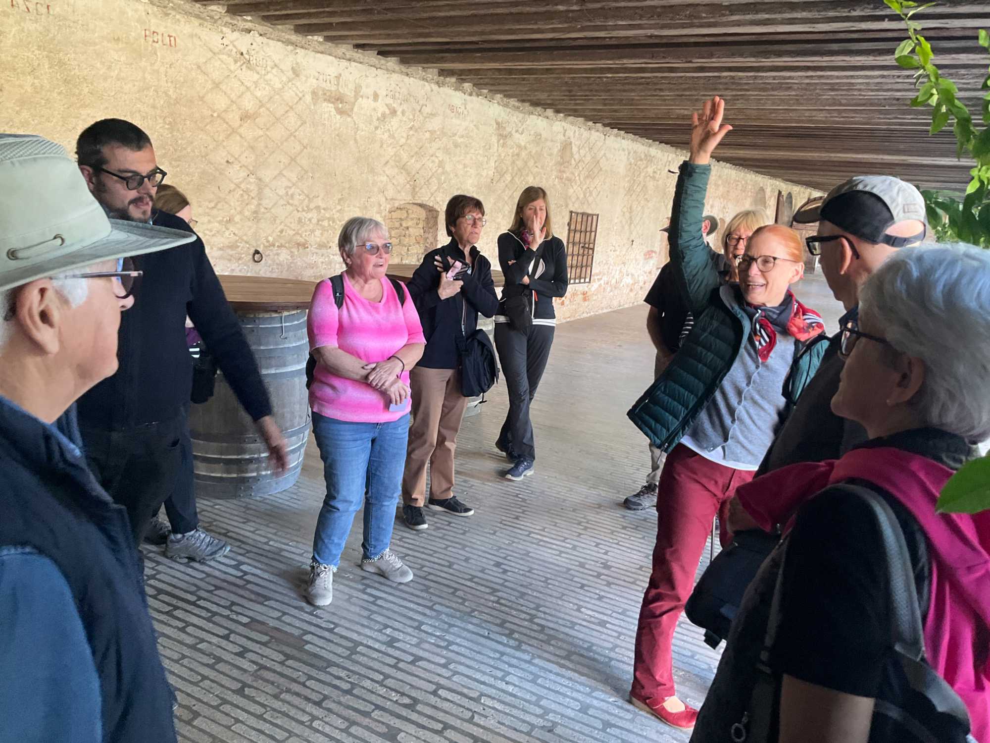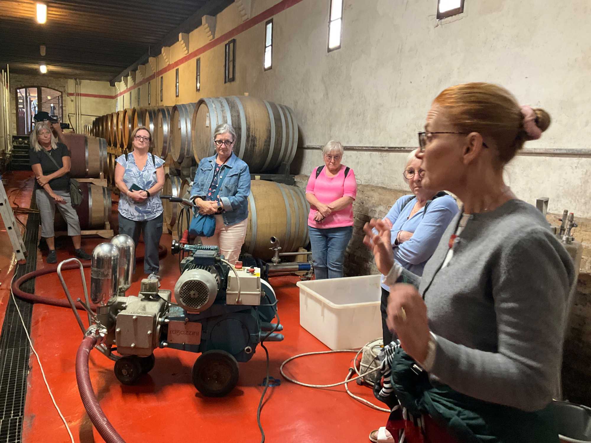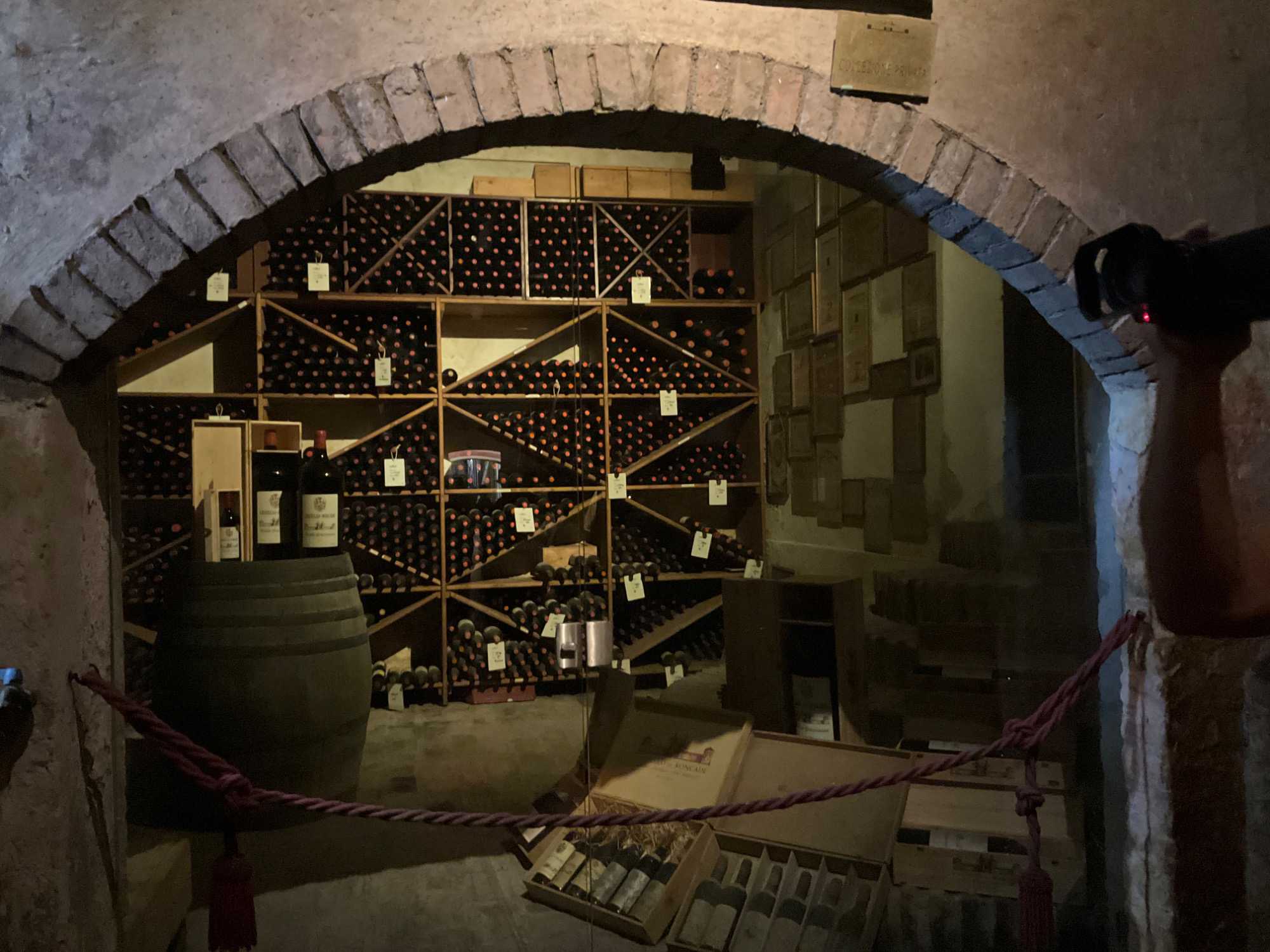 Emilia nous fait la présentation du salon de ce palais sous forme de chateau, à l’architecture vénitienne qui à l’époque, en 1508 appartenait à des entrepreneurs commerciaux : la famille Bassetti. Ces derniers, entrepreneurs agricoles y venaient…deux fois par année. Après la première guerre mondiale, la structure fut endommagée et les lieux servirent d’hôpital pour les soldats. Puis des années plus tard, d’autres propriétaires reprirent les lieux pour développer une cave à vins vieillis (vins de garde) munie de barils de chêne particuliers, petits et immenses, comme vous verrez sur les photos. Ici, on privilégie le vin de qualité à la quantité (400 000 bouteilles). Les vendanges sont effectuées de façon manuelle. Les épais murs de pierres et les minuscules fenêtres assurent une température constante.