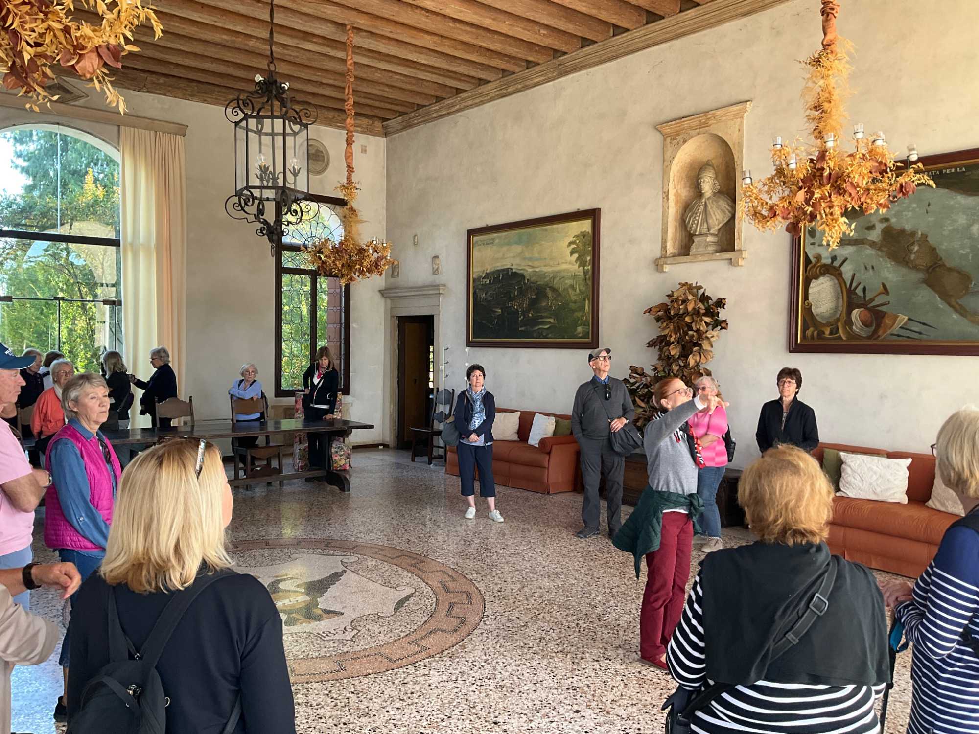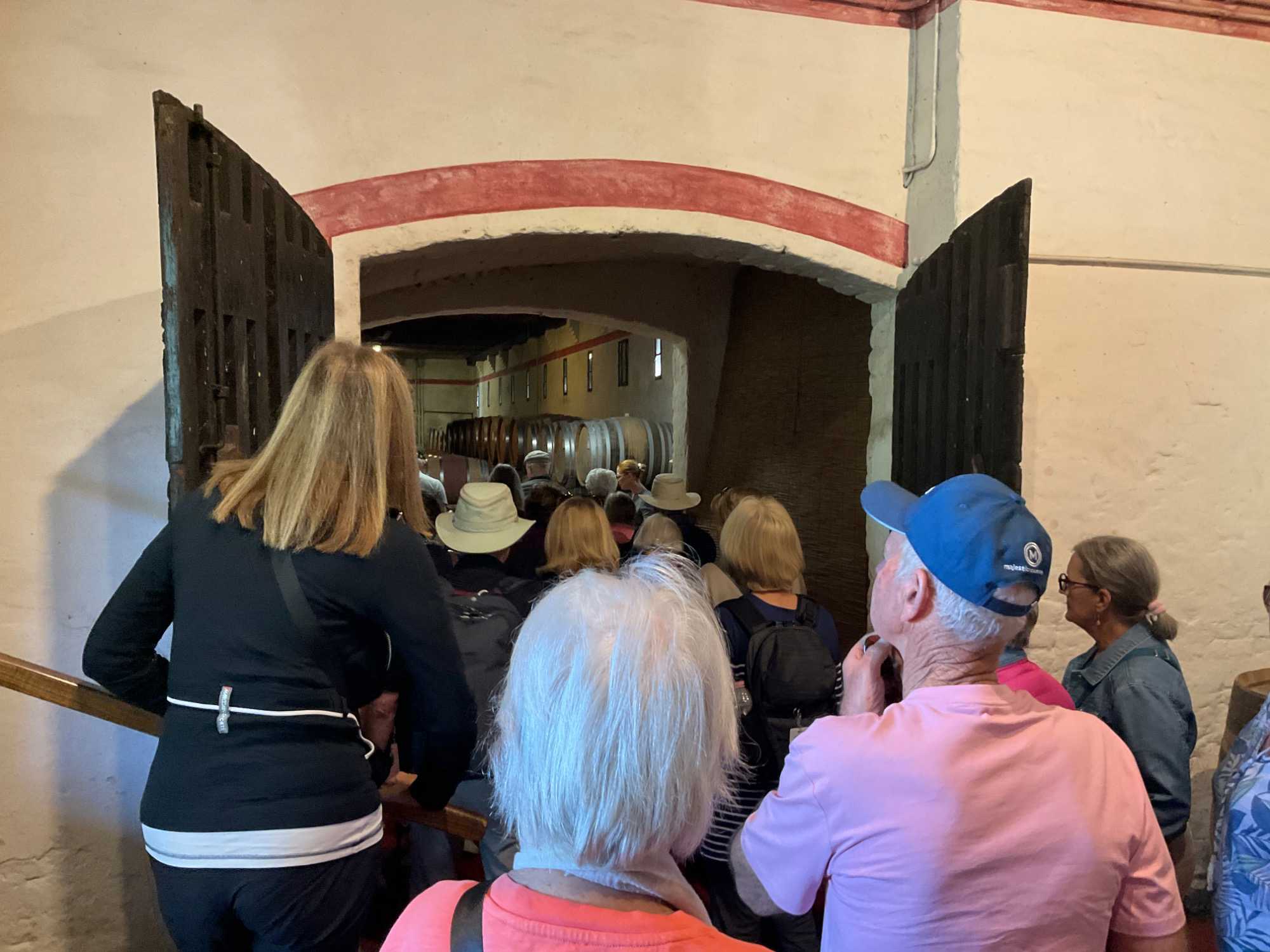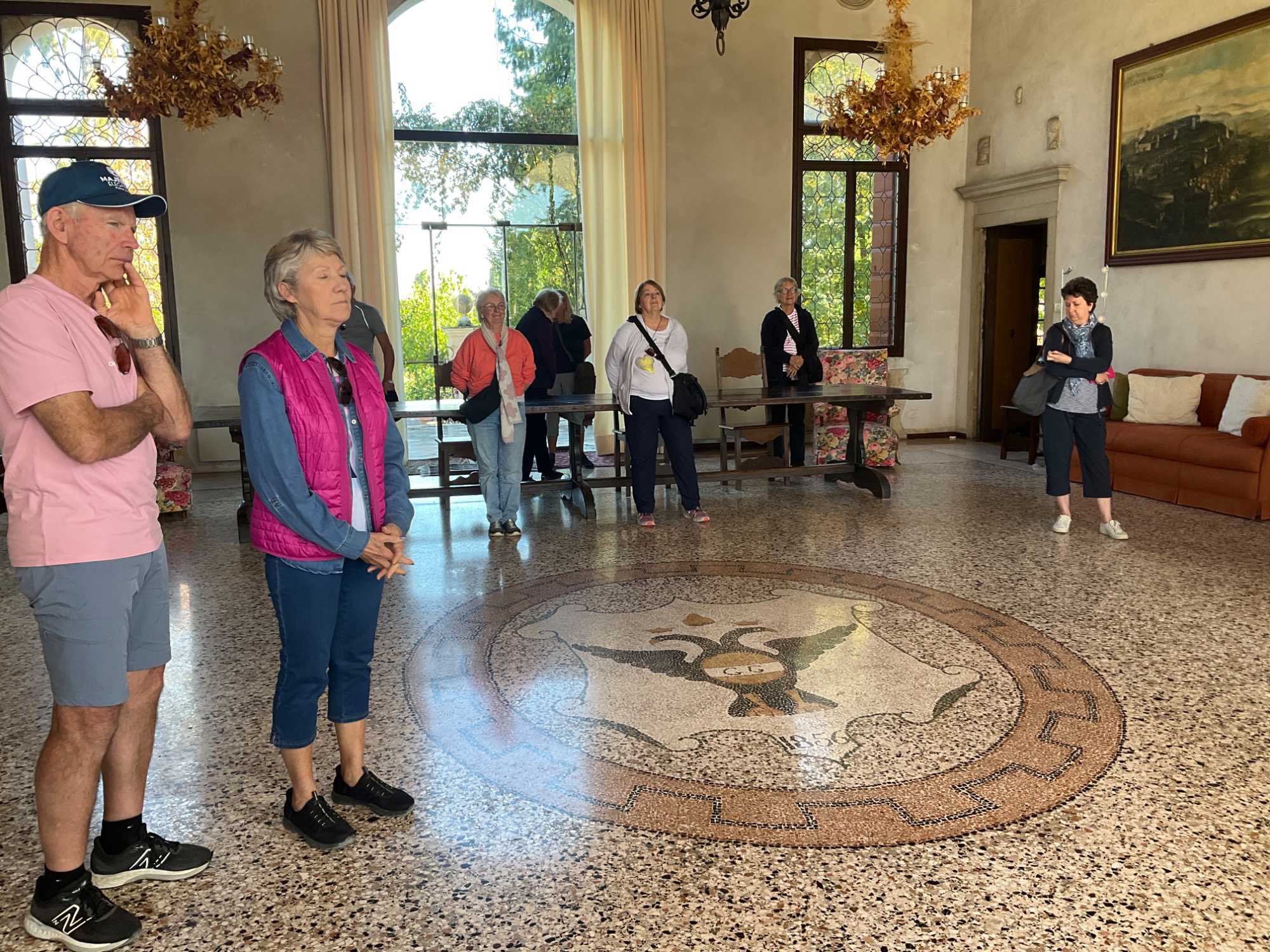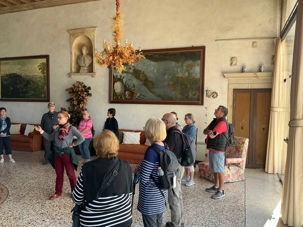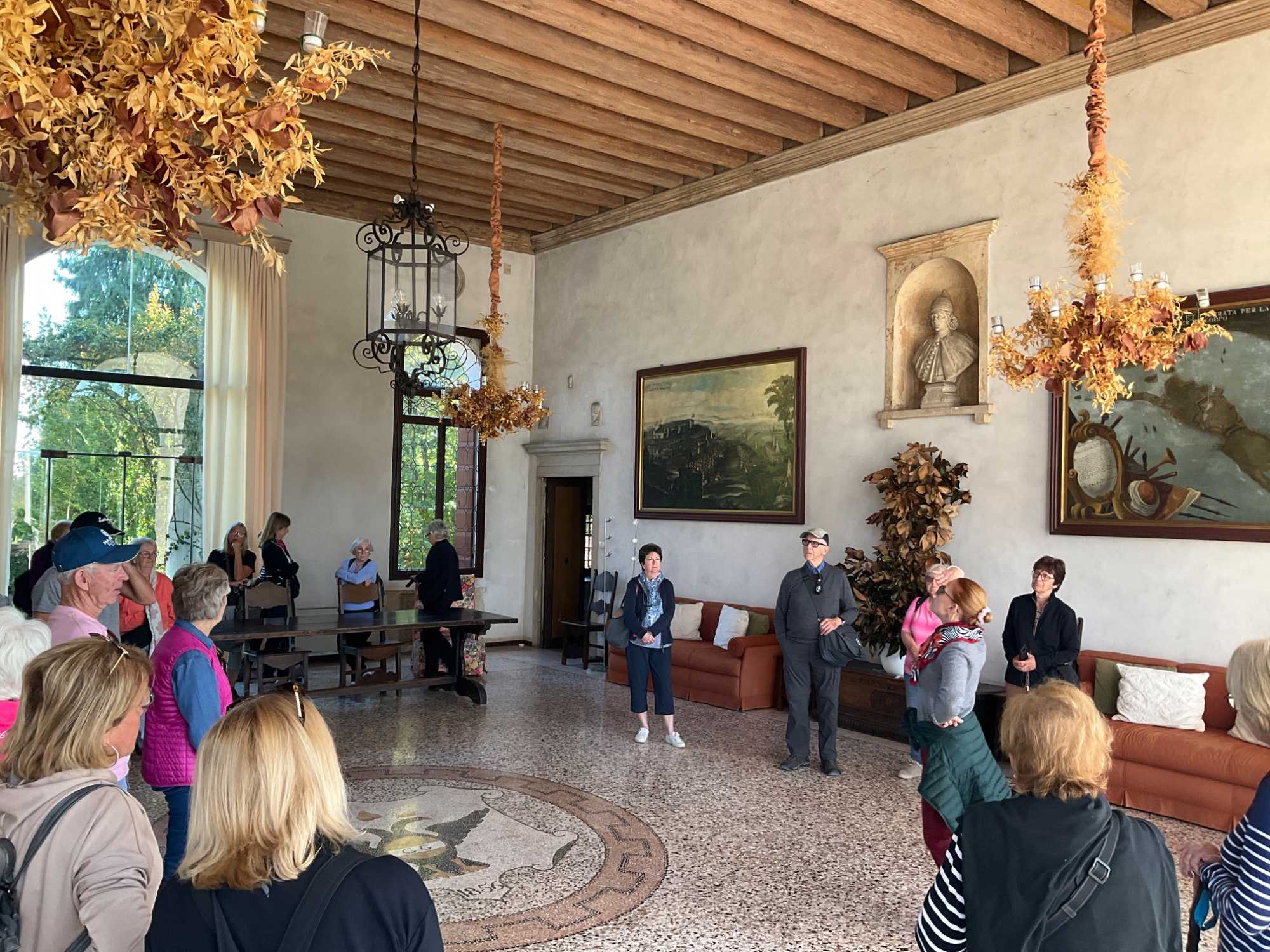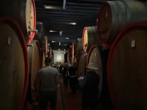 Emilia nous fait la présentation du salon de ce palais sous forme de chateau, à l’architecture vénitienne qui à l’époque, en 1508 appartenait à des entrepreneurs commerciaux : la famille Bassetti. Ces derniers, entrepreneurs agricoles y venaient…deux fois par année. Après la première guerre mondiale, la structure fut endommagée et les lieux servirent d’hôpital pour les soldats. Puis des années plus tard, d’autres propriétaires reprirent les lieux pour développer une cave à vins vieillis (vins de garde) munie de barils de chêne particuliers, petits et immenses, comme vous verrez sur les photos. Ici, on privilégie le vin de qualité à la quantité (400 000 bouteilles). Les vendanges sont effectuées de façon manuelle. Les épais murs de pierres et les minuscules fenêtres assurent une température constante.