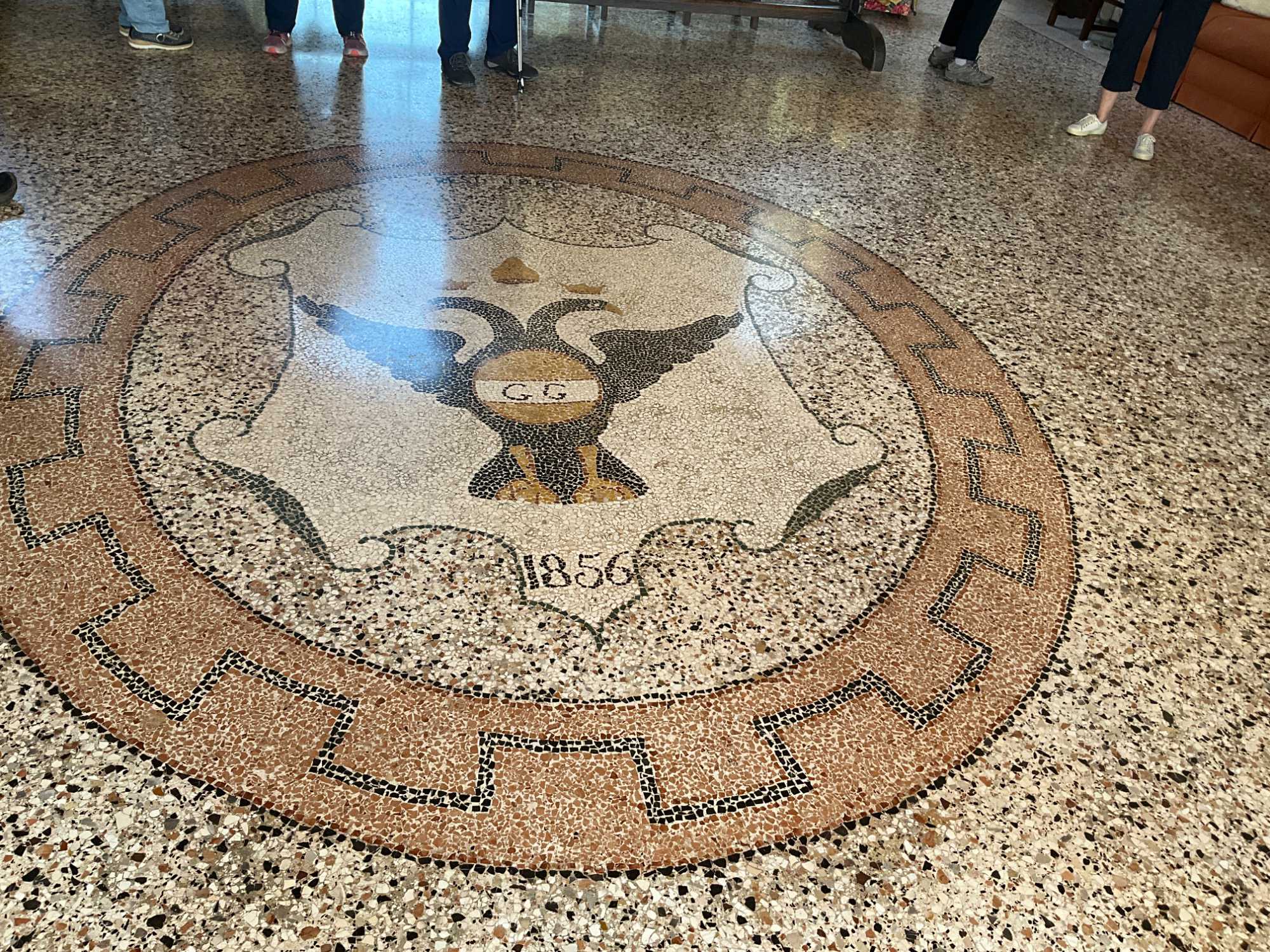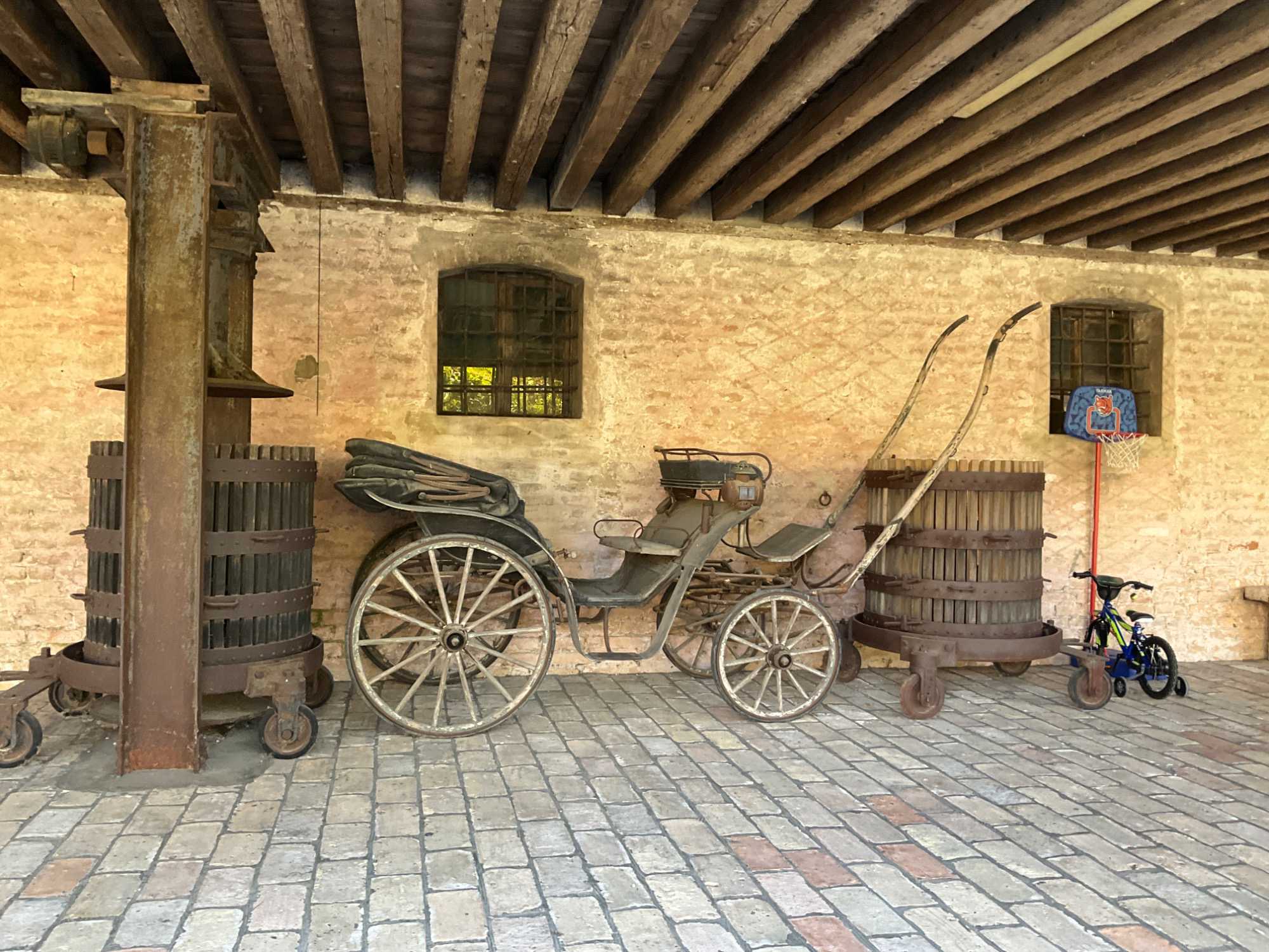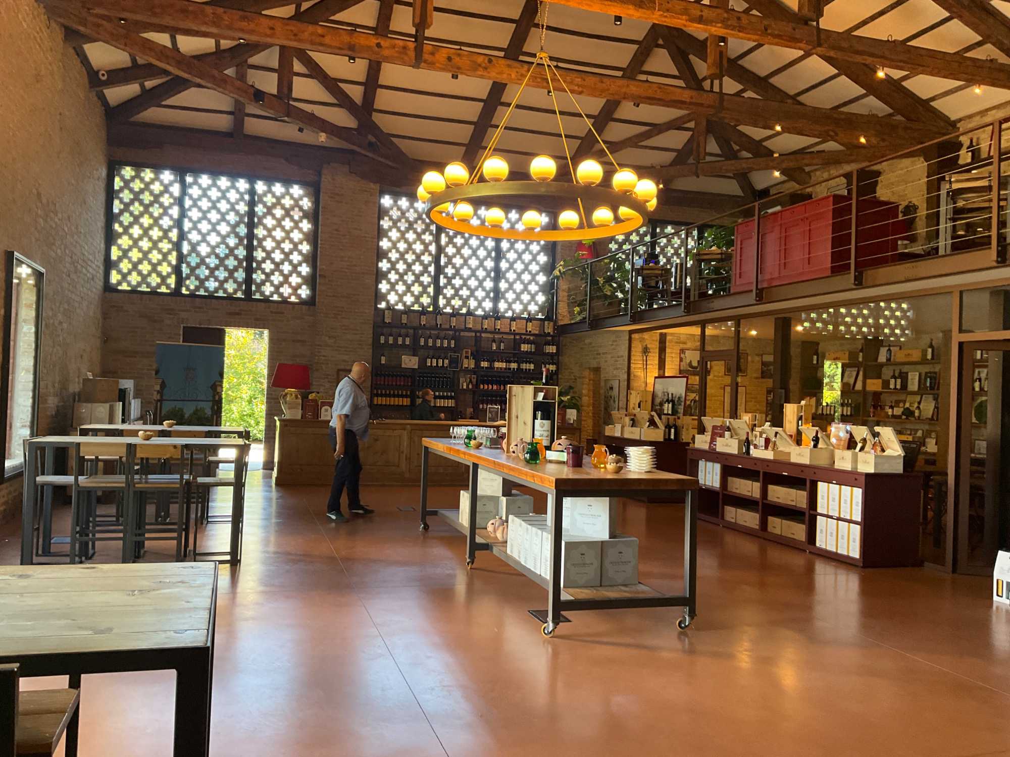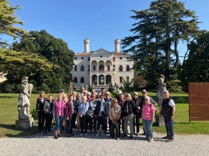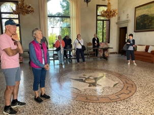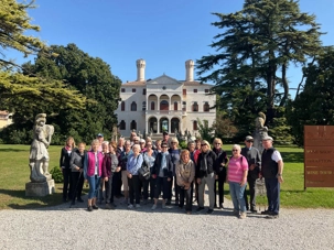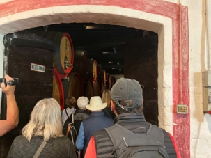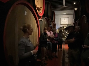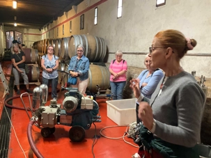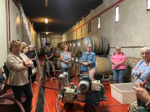 Emilia nous fait la présentation du salon de ce palais sous forme de chateau, à l’architecture vénitienne qui à l’époque, en 1508 appartenait à des entrepreneurs commerciaux : la famille Bassetti. Ces derniers, entrepreneurs agricoles y venaient…deux fois par année. Après la première guerre mondiale, la structure fut endommagée et les lieux servirent d’hôpital pour les soldats. Puis des années plus tard, d’autres propriétaires reprirent les lieux pour développer une cave à vins vieillis (vins de garde) munie de barils de chêne particuliers, petits et immenses, comme vous verrez sur les photos. Ici, on privilégie le vin de qualité à la quantité (400 000 bouteilles). Les vendanges sont effectuées de façon manuelle. Les épais murs de pierres et les minuscules fenêtres assurent une température constante.