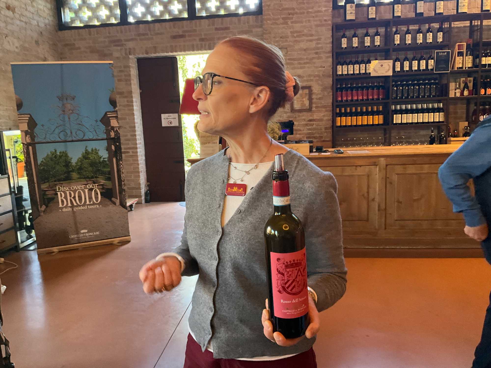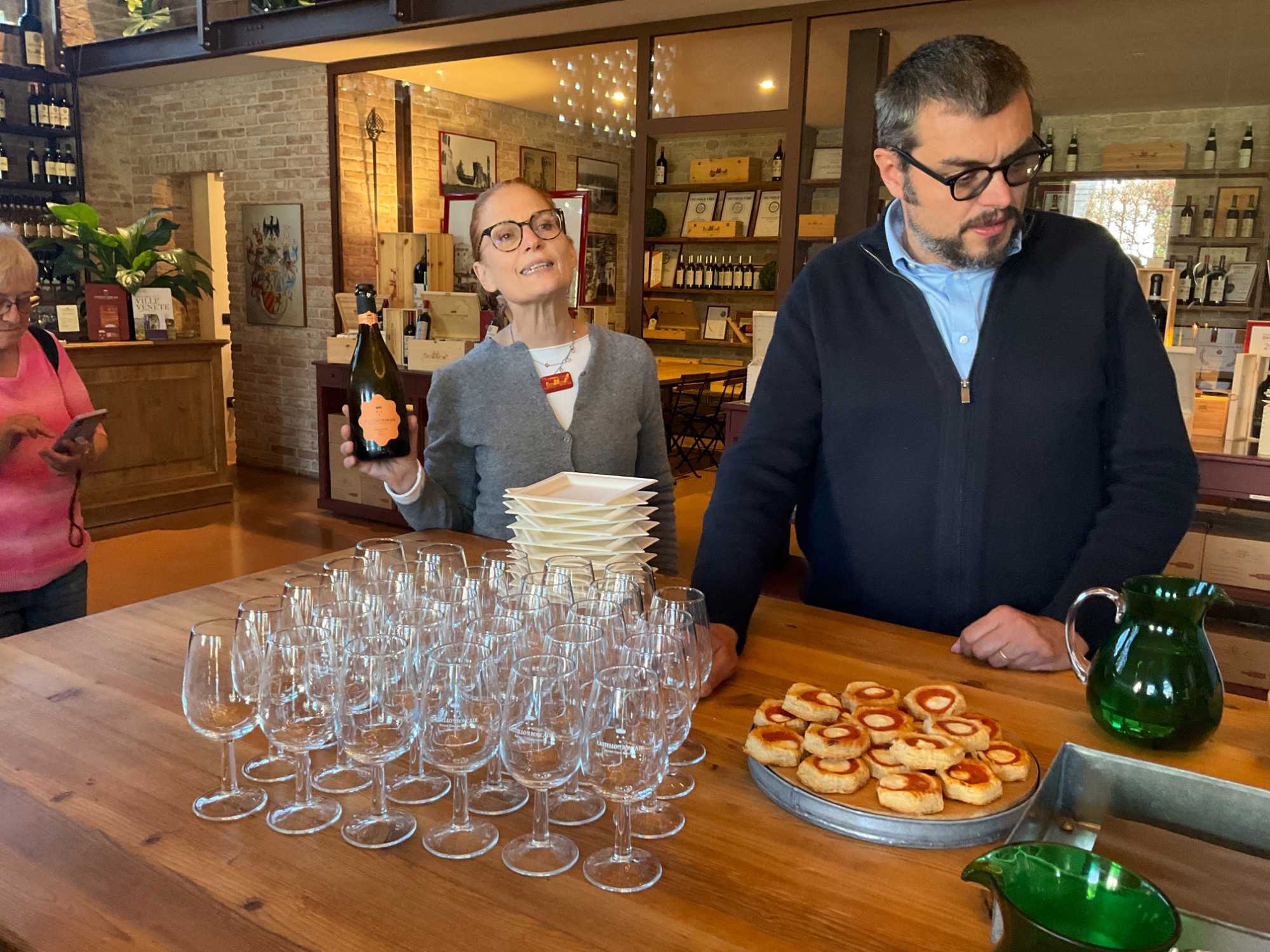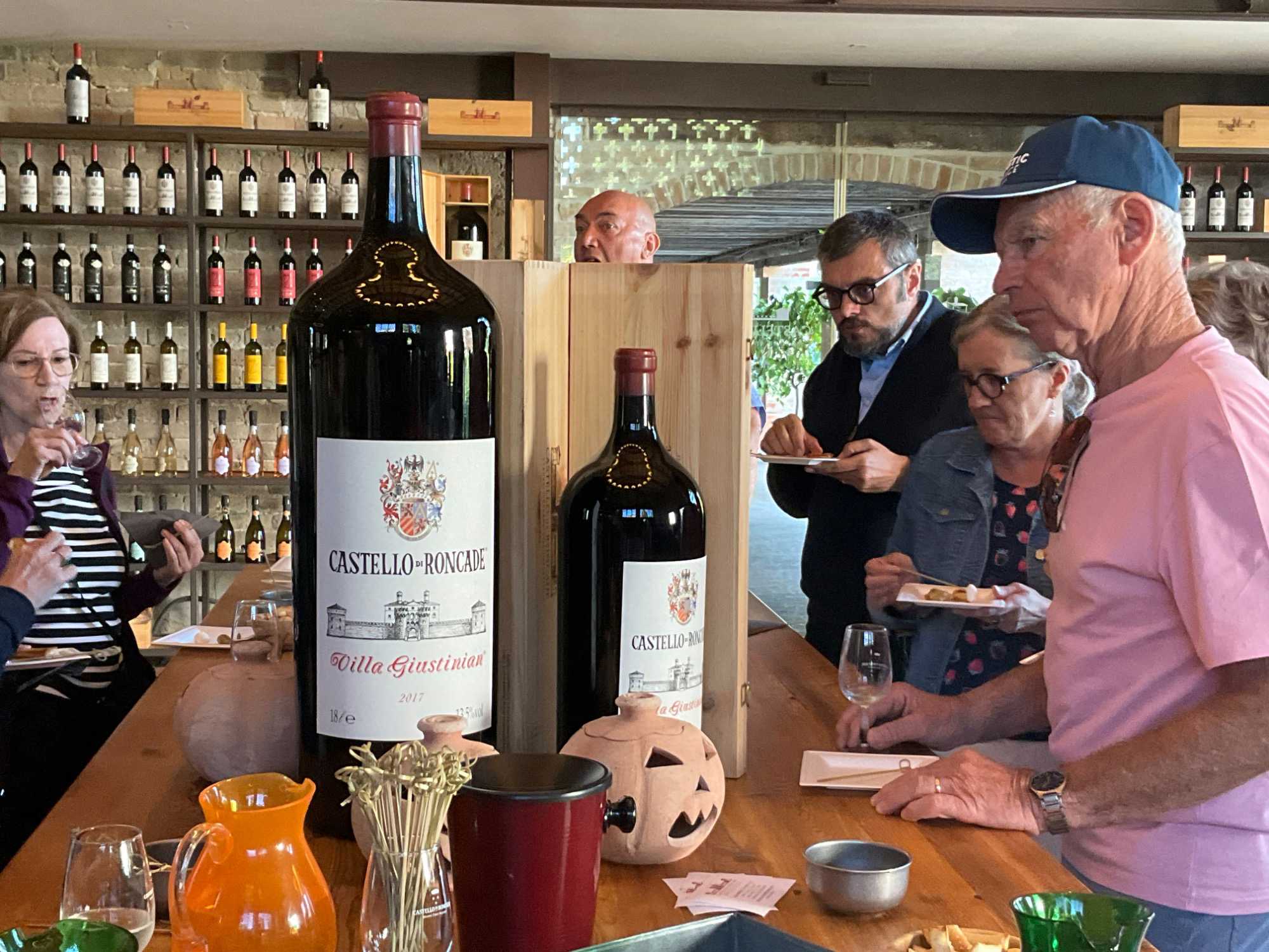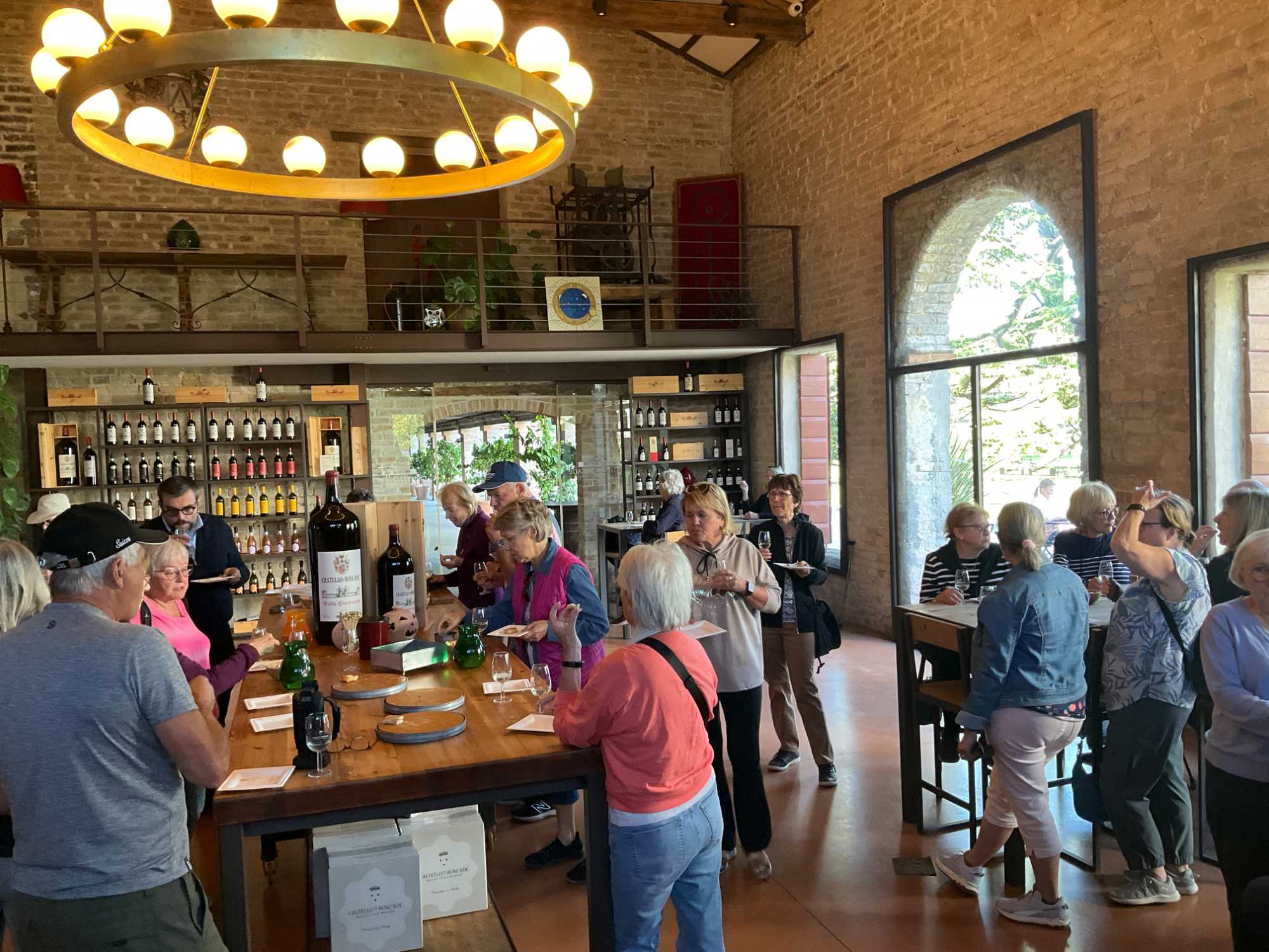 Enfin arrive le vrai moment de la dégustation. On débute, région oblige, par un délicieux Prosecco bien sec. La table dispose de bouchées de charcuterie, proscuito, mortadelle, olives, grissili, fromage, et diverses bouchées de jambon…un délice. Puis place à un vin, un blanc, puis, un premier rouge d’un premier baril, un Merlot, suit le dernier, un quatrième verre, d’un second baril, un rouge plus corsé. Emilia a tenu à faire de nous des connaisseurs en nous faisant vivre les trois étapes de la dégustation: avec les yeux, l’odorat et le goût. Vous pourrez découvrir ces vins sur une photo. Plusieurs voyageurs sont ressortis de la dégustation avec des provisions pour de bons soupers entre amis ou en famille.