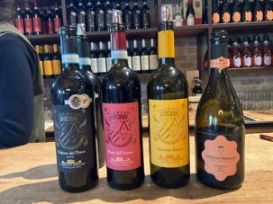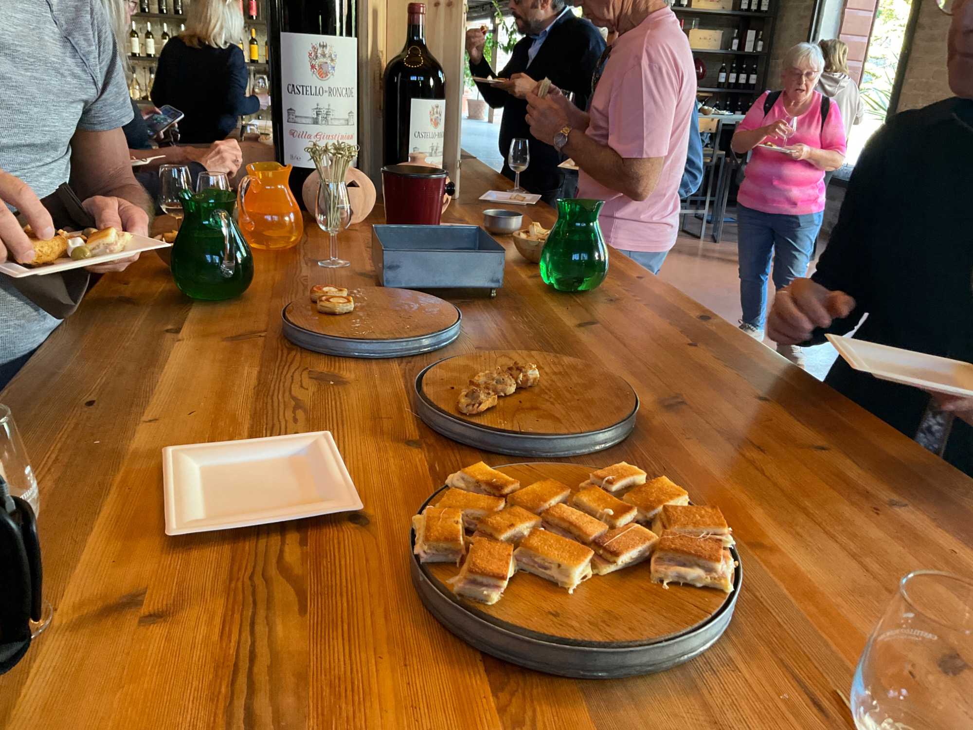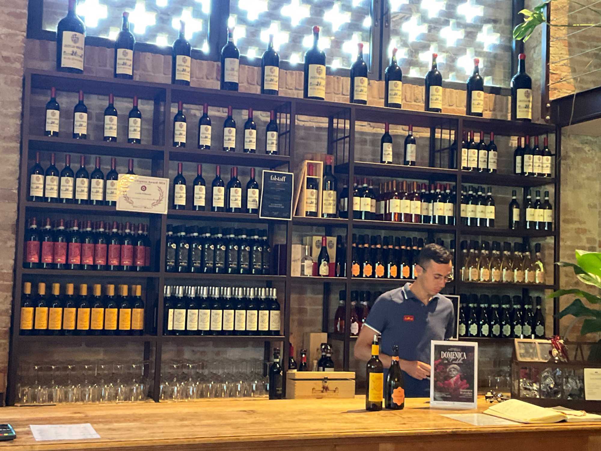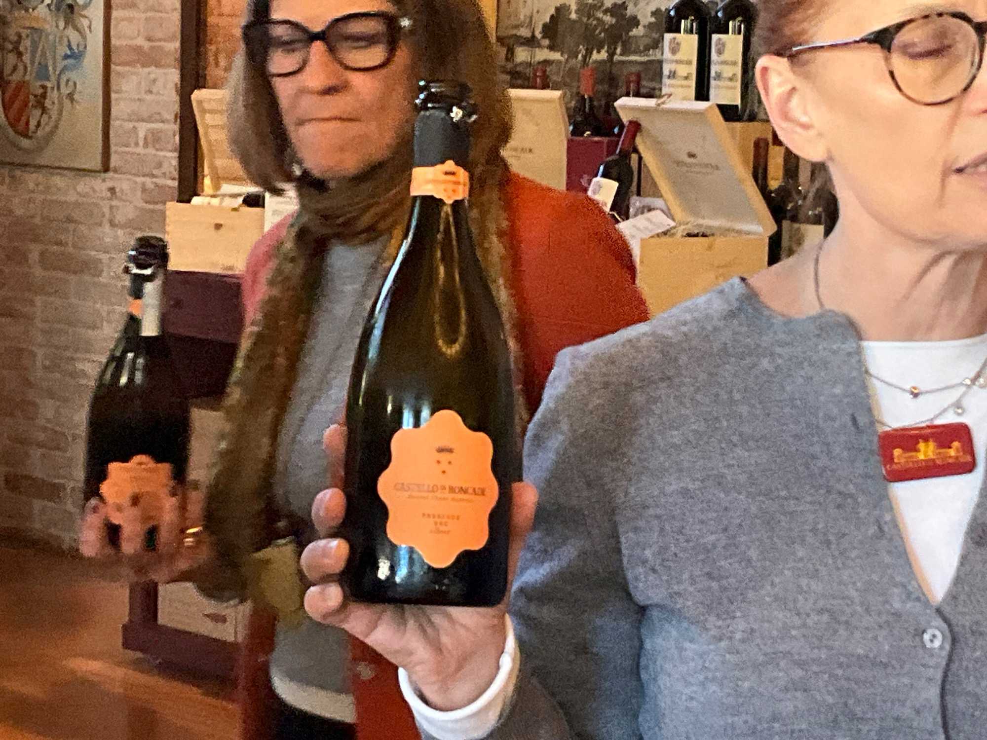 Enfin arrive le vrai moment de la dégustation. On débute, région oblige, par un délicieux Prosecco bien sec. La table dispose de bouchées de charcuterie, proscuito, mortadelle, olives, grissili, fromage, et diverses bouchées de jambon…un délice. Puis place à un vin, un blanc, puis, un premier rouge d’un premier baril, un Merlot, suit le dernier, un quatrième verre, d’un second baril, un rouge plus corsé. Emilia a tenu à faire de nous des connaisseurs en nous faisant vivre les trois étapes de la dégustation: avec les yeux, l’odorat et le goût. Vous pourrez découvrir ces vins sur une photo. Plusieurs voyageurs sont ressortis de la dégustation avec des provisions pour de bons soupers entre amis ou en famille.