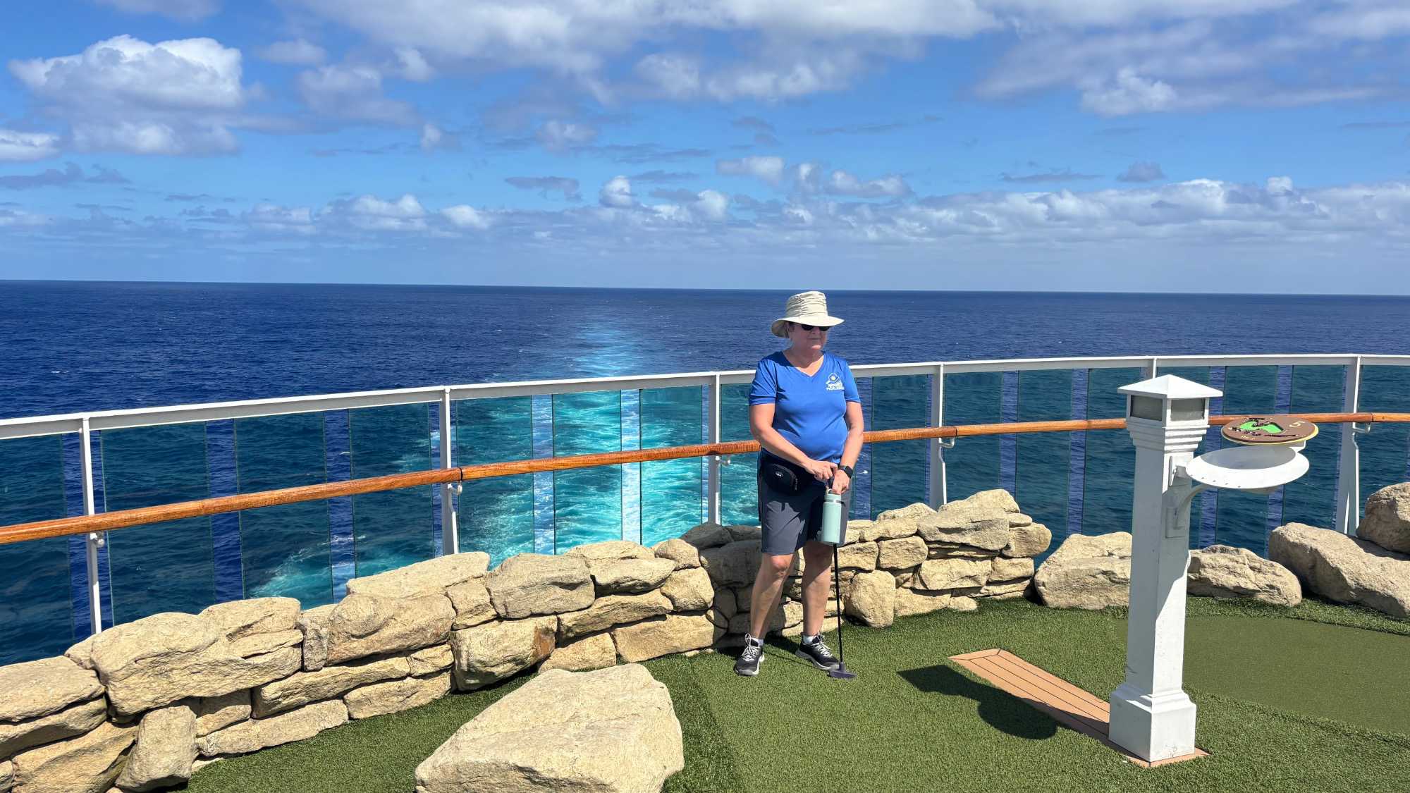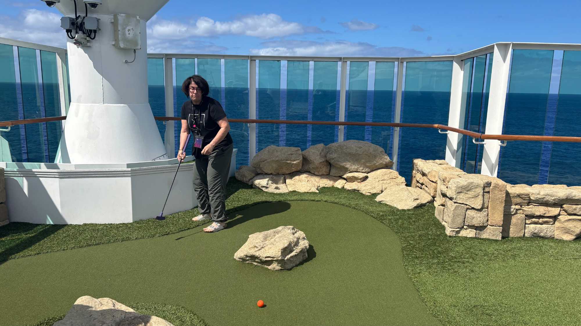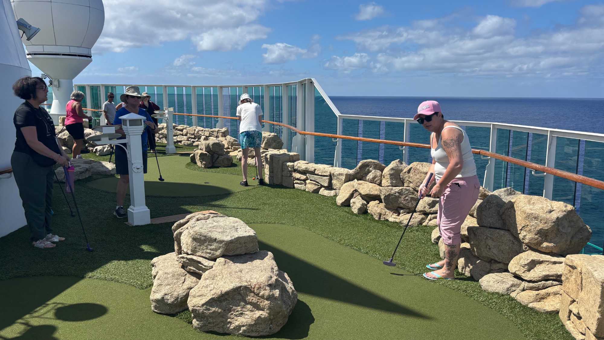 À 10 h 30, Nathalie et moi avions donné rendez-vous au reste du groupe pour une partie de mini-putt… sur le bateau, rien de moins ! Sous un magnifique soleil, sept d’entre nous ont pris le départ pour un parcours de neuf trous. Fous rires garantis ! Certains n’avaient pas touché un bâton depuis des années, mais les réflexes sont vite revenus.