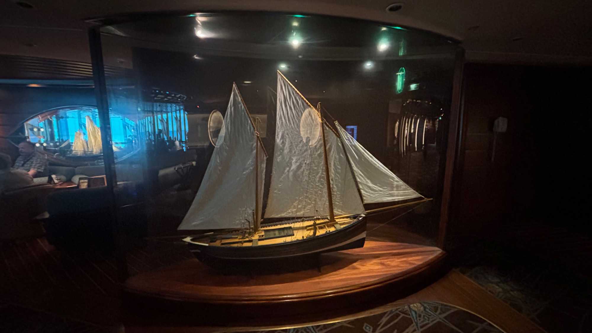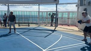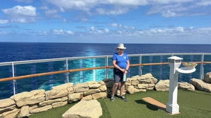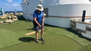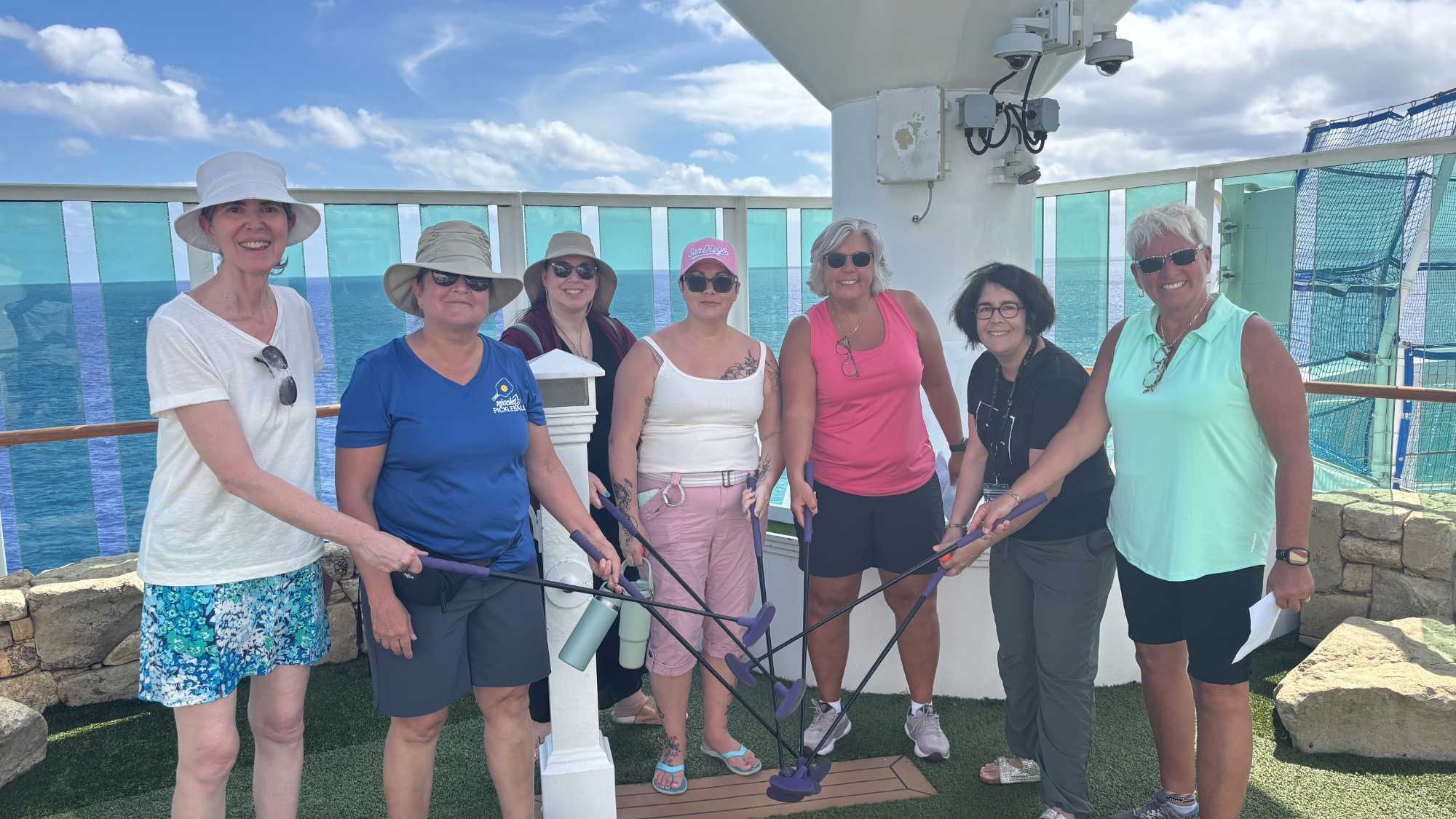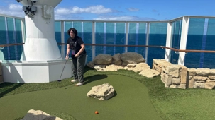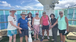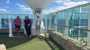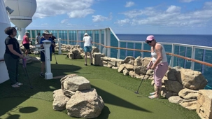 À 10 h 30, Nathalie et moi avions donné rendez-vous au reste du groupe pour une partie de mini-putt… sur le bateau, rien de moins ! Sous un magnifique soleil, sept d’entre nous ont pris le départ pour un parcours de neuf trous. Fous rires garantis ! Certains n’avaient pas touché un bâton depuis des années, mais les réflexes sont vite revenus.