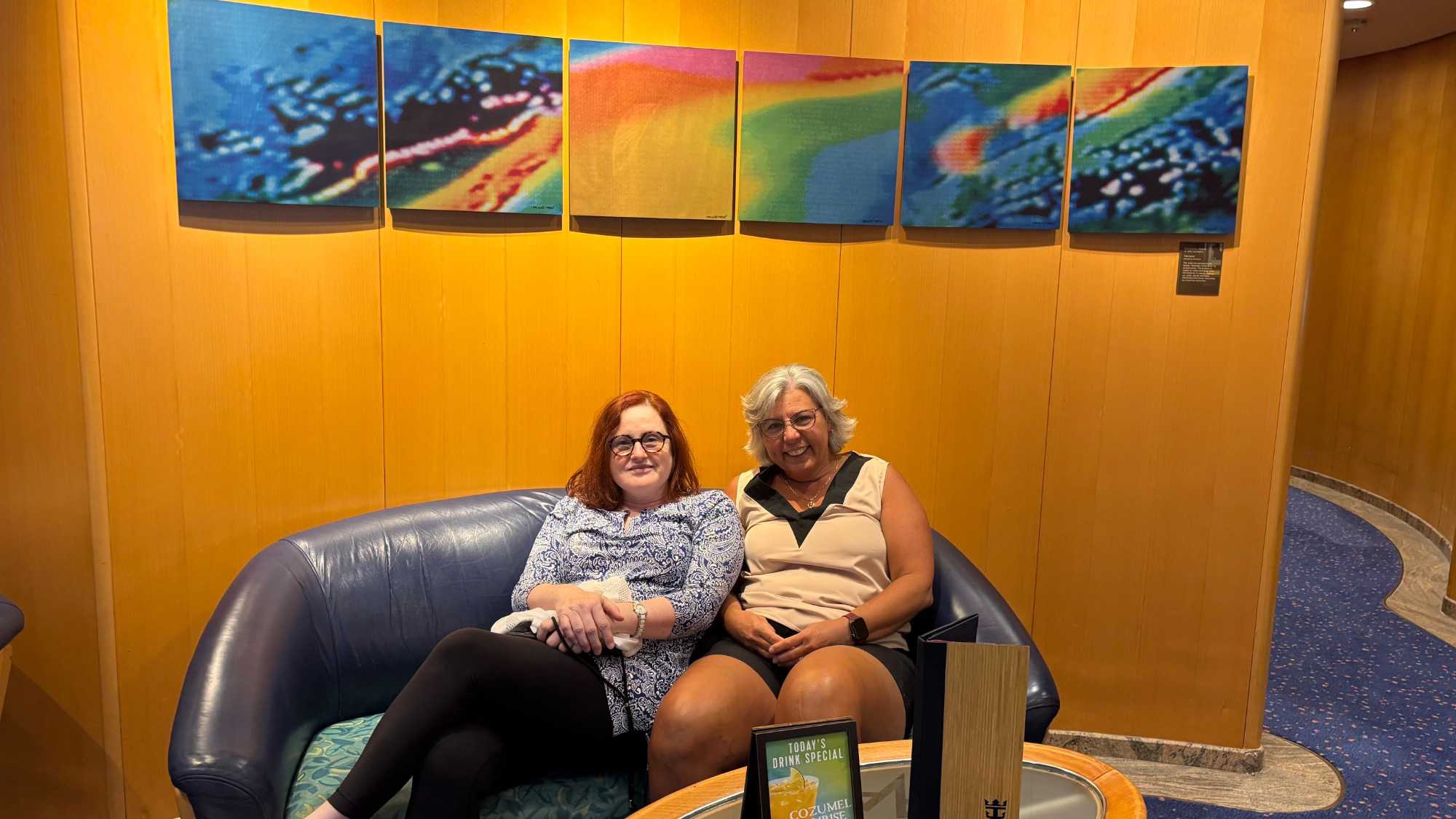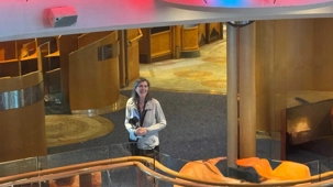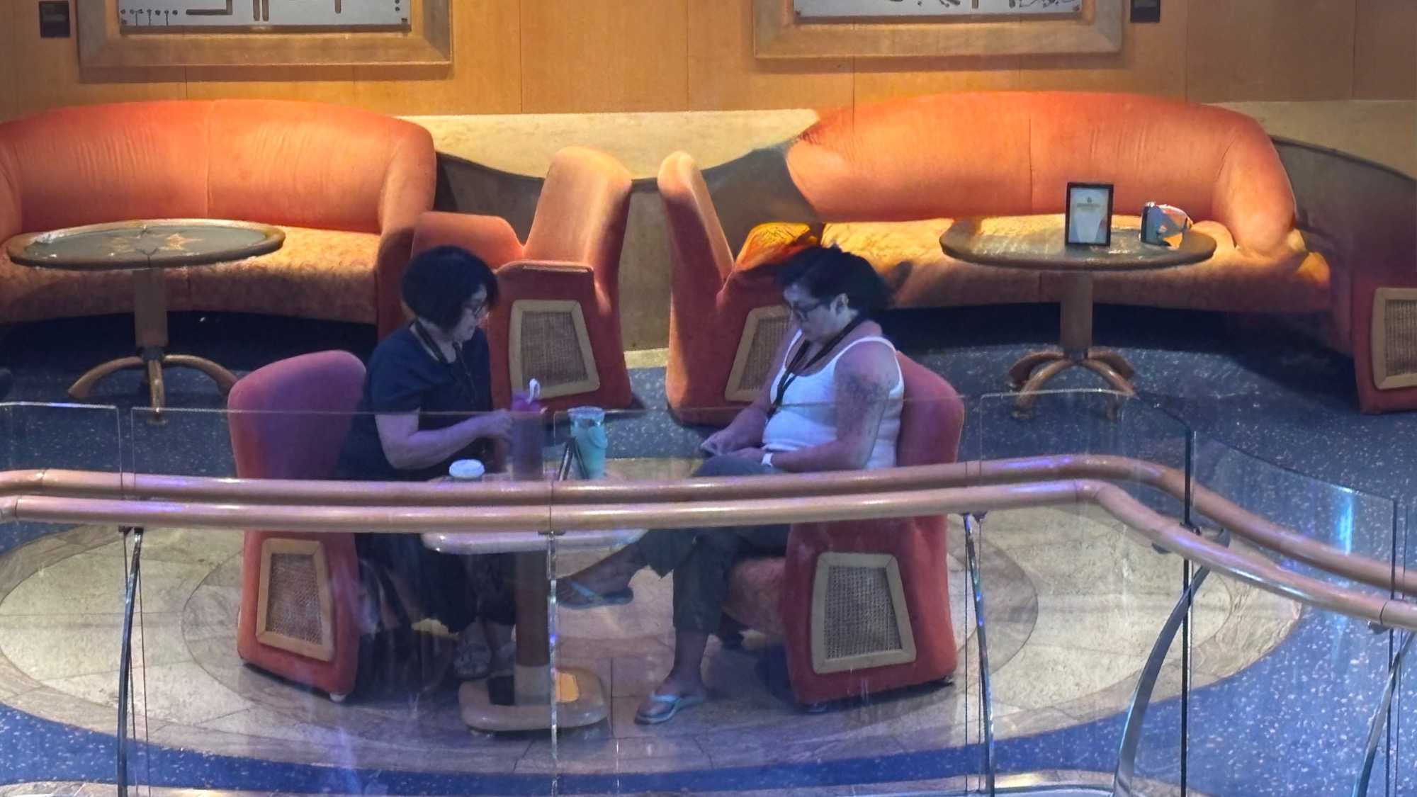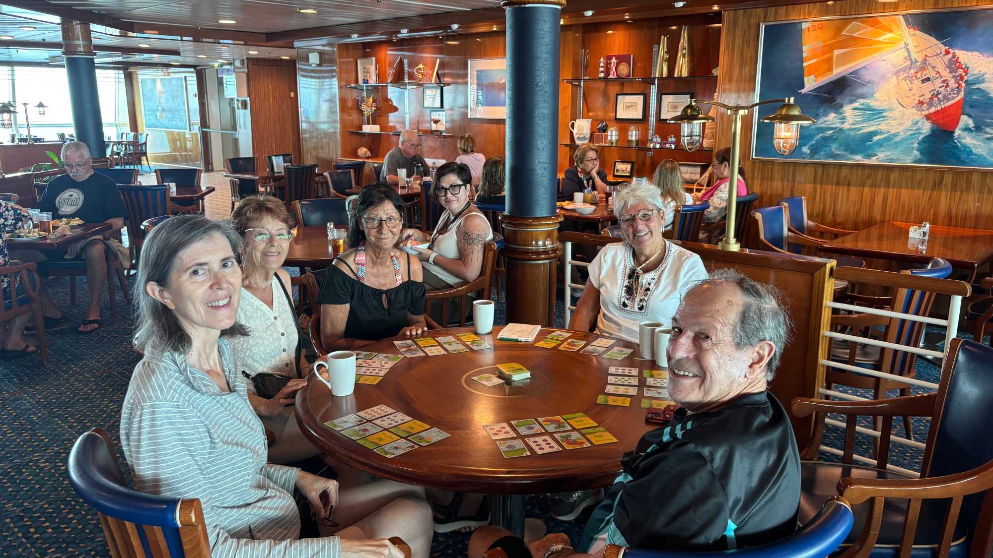 Une autre journée en mer se dessine, aujourd’hui, la mer semble vouloir nous accorder un peu de répit : les vagues se font plus douces et le navire tangue avec légèreté. Nous avions prévu un tournoi amical de shuffleboard sur le pont, histoire de profiter de l’air marin et de quelques éclats de rire partagés.Mais voilà que la pluie s’invite à la fête, fine d’abord, puis décidée à rester ! Qu’à cela ne tienne — impossible de laisser la météo dicter notre bonne humeur. Nous passons donc en plan B : activités intérieures, ambiance conviviale garantie.