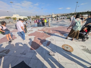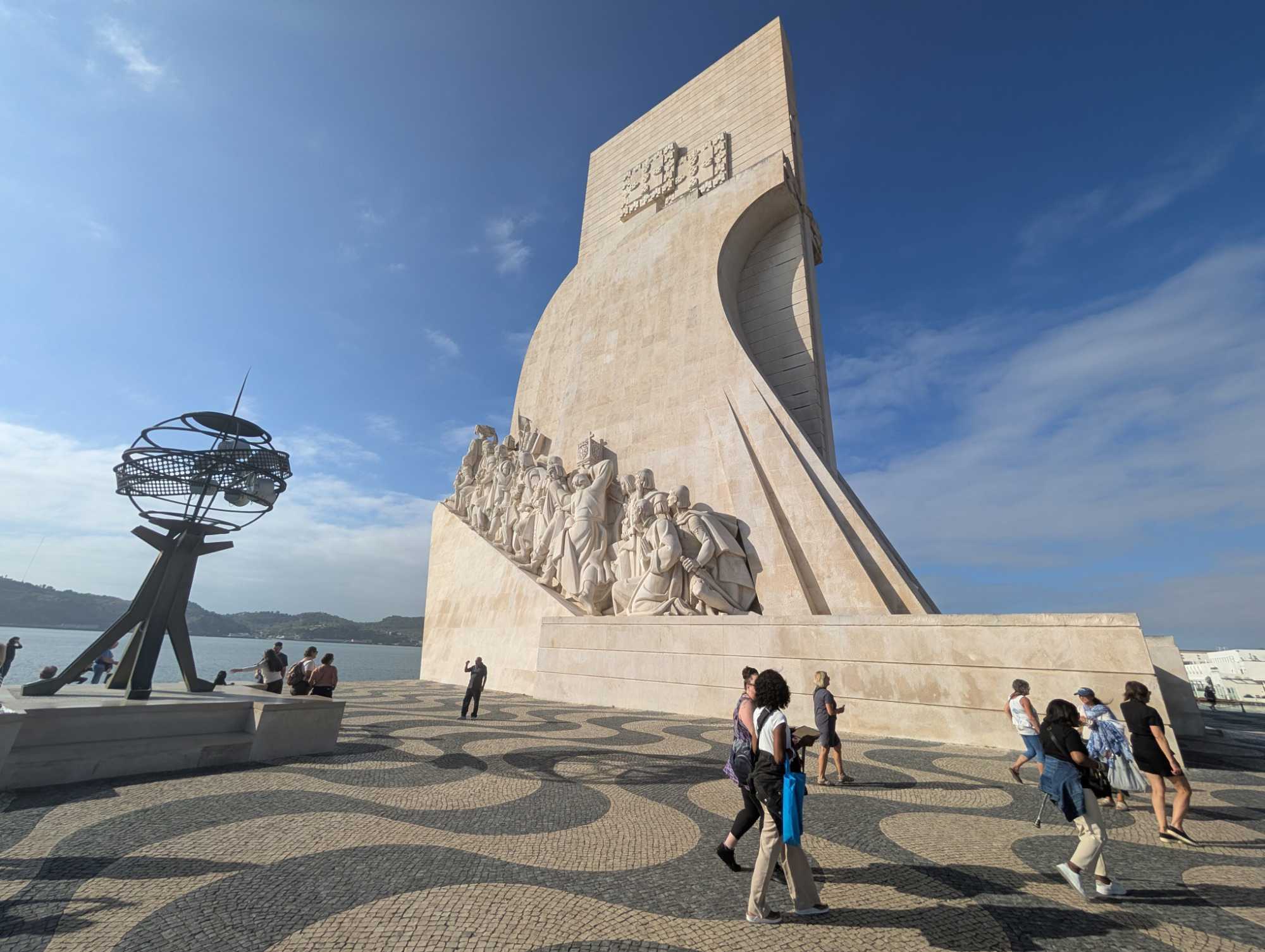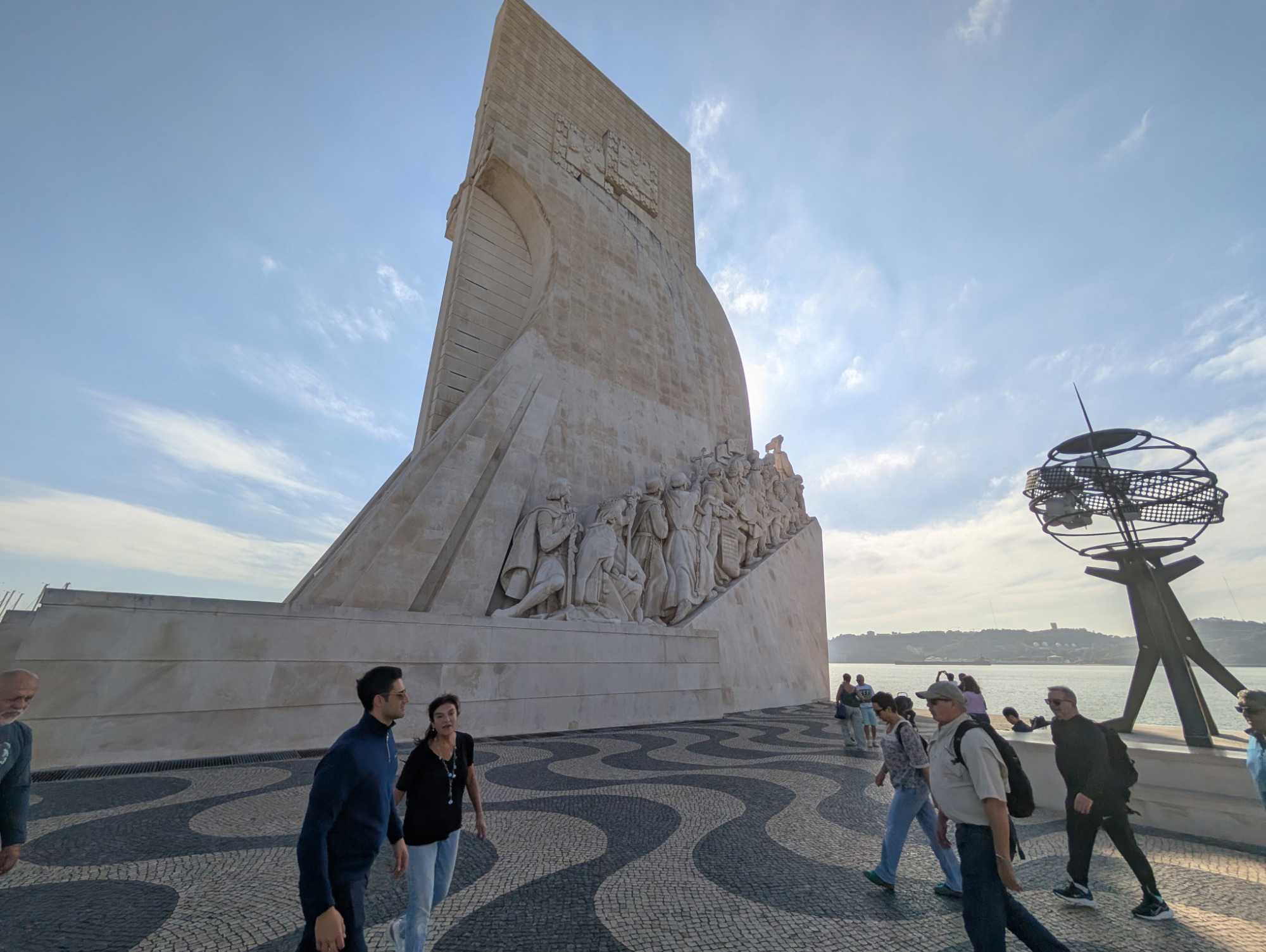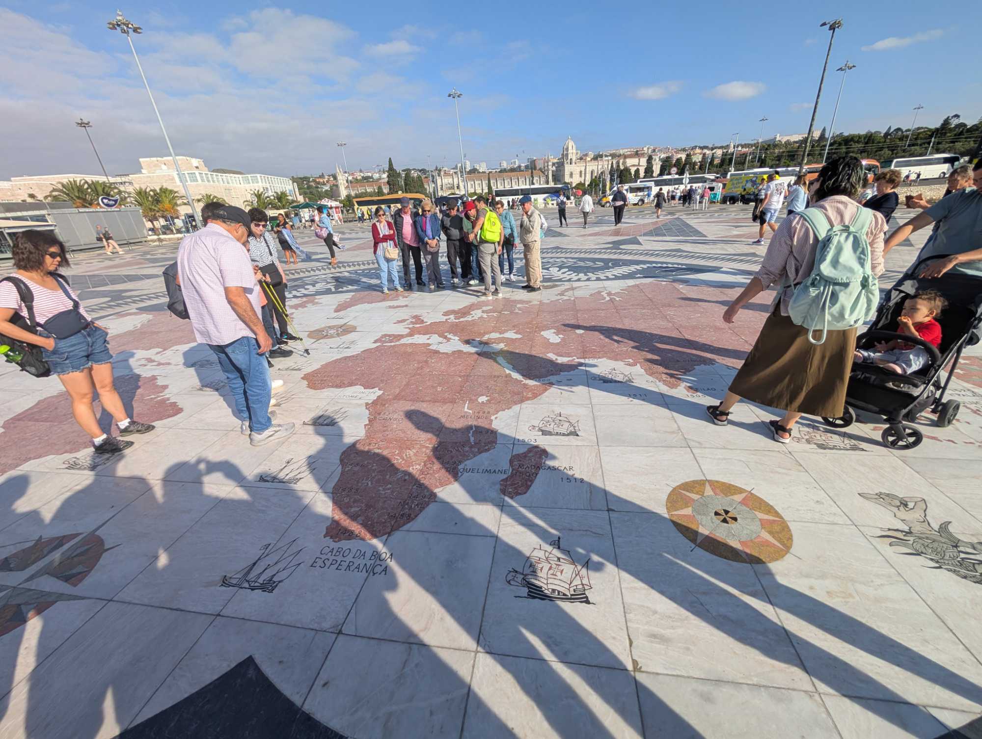 Nous débarquons donc à la Torre Do Padrāo et contemplons sur le sol l'immense carte en marbre gisant au pied du monument qui indique toutes les découvertes du monde exploré par les navigateurs portugais ainsi que les dates où elles ont été faites.
