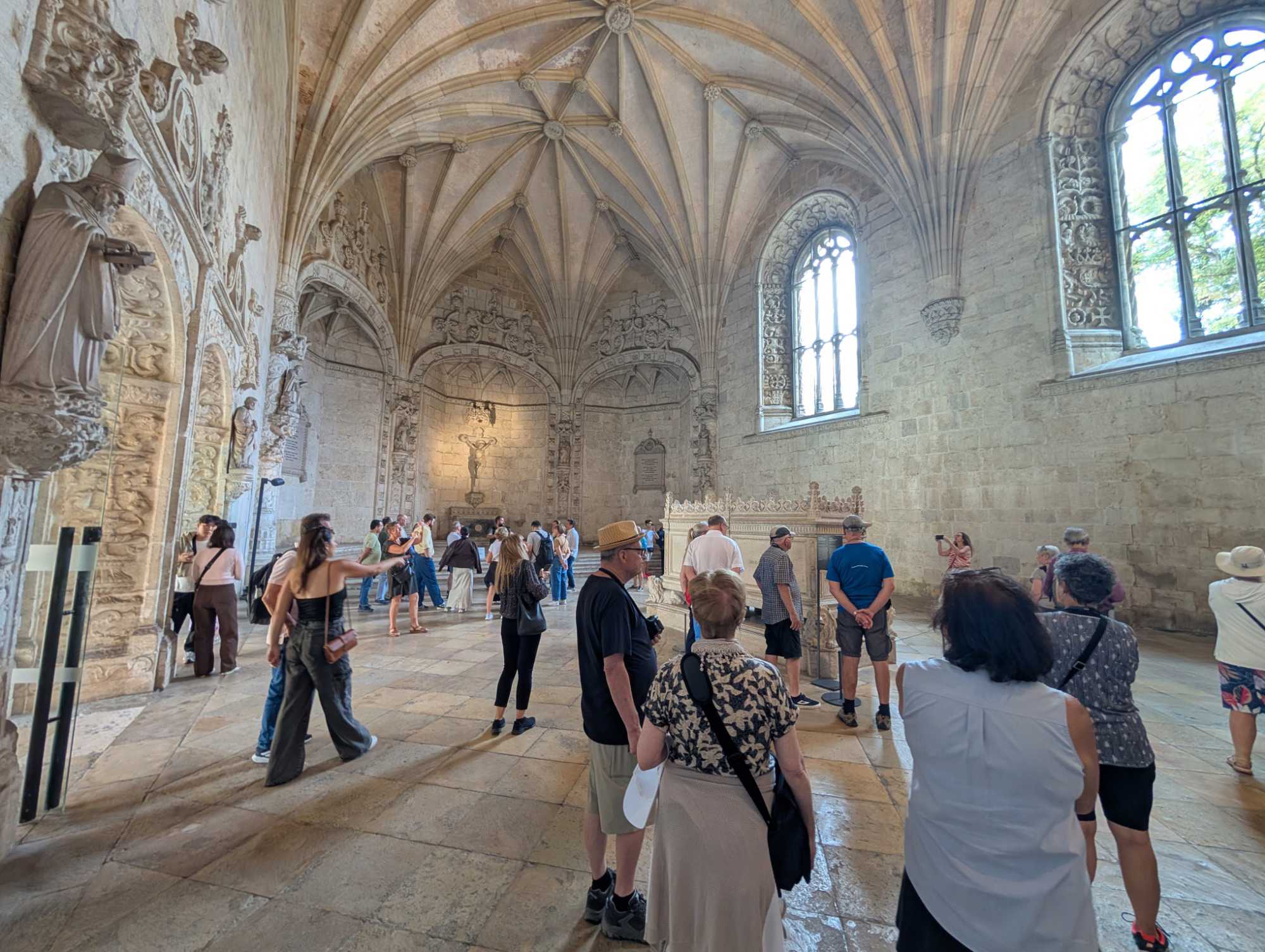 À l'intérieur, le monastère respire une sérénité impressionnante. Le cloître, avec ses arcs délicatement sculptés, est un havre de paix où la lumière joue sur les colonnes ouvragées. L'église, avec ses voûtes élancées qui semblent flotter sans support, est d'une grandeur à couper le souffle. C'est ici que reposent les figures emblématiques de l'histoire portugaise, comme le poète Fernando Pessoa ou le navigateur Vasco de Gama, dont la tombe est un rappel poignant de l'audace et du sacrifice des explorateurs. Le monastère est un lieu où l'architecture elle-même raconte l'épopée d'une nation. Nous faisons une pause déjeuner avant de poursuivre notre visite de Lisbonne.