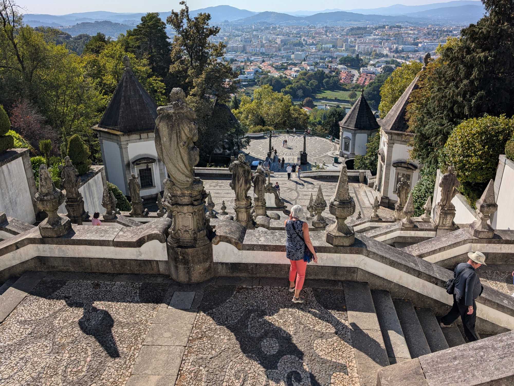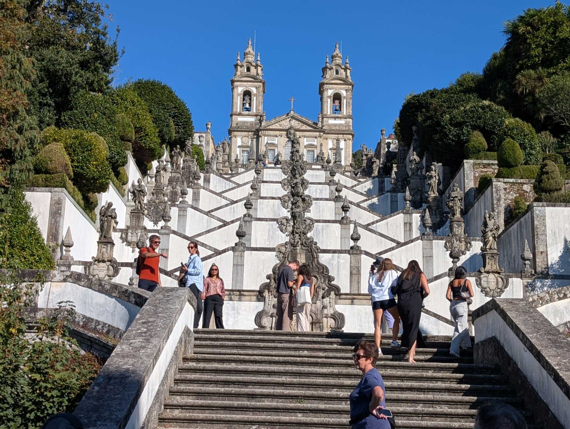 Classé au patrimoine mondial de l'UNESCO, le Sanctuaire de Bom Jesus do Monte n'est pas qu'un lieu de culte, mais une ascension spirituelle. Situé sur une colline boisée près de Braga, il est célèbre pour son monumental escalier en zigzag, un chef-d'œuvre de l'art baroque. Chaque palier représente une étape du chemin de croix, orné de fontaines et de statues qui racontent l'histoire de la Passion du Christ. La montée, bien que physiquement exigeante, est une expérience contemplative, où chaque pas vous rapproche d'une sérénité grandissante. Au sommet, le sanctuaire vous accueille dans une atmosphère de paix, avec une vue panoramique époustouflante sur la ville de Braga et les paysages luxuriants du Minho. C'est un lieu qui allie la grandeur architecturale à une profonde spiritualité. Plutôt que de monter les 600 marches en bons pélerins, nous avons pris le funiculaire de Bom Jesus qui n'est pas qu'un simple moyen de transport, c'est une véritable machine à remonter le temps. Construit en 1882, il est le plus ancien funiculaire en service au monde qui utilise le contrepoids de l'eau. Pour monter, un réservoir d'eau est rempli à la station supérieure, son poids faisant descendre le wagon opposé et remonter celui du bas. C'est une technologie ingénieuse et écologique qui ajoute un charme unique à l'ascension. Le funiculaire offre un contraste saisissant avec la montée à pied par le grand escalier baroque, permettant une arrivée en douceur au sommet du sanctuaire.