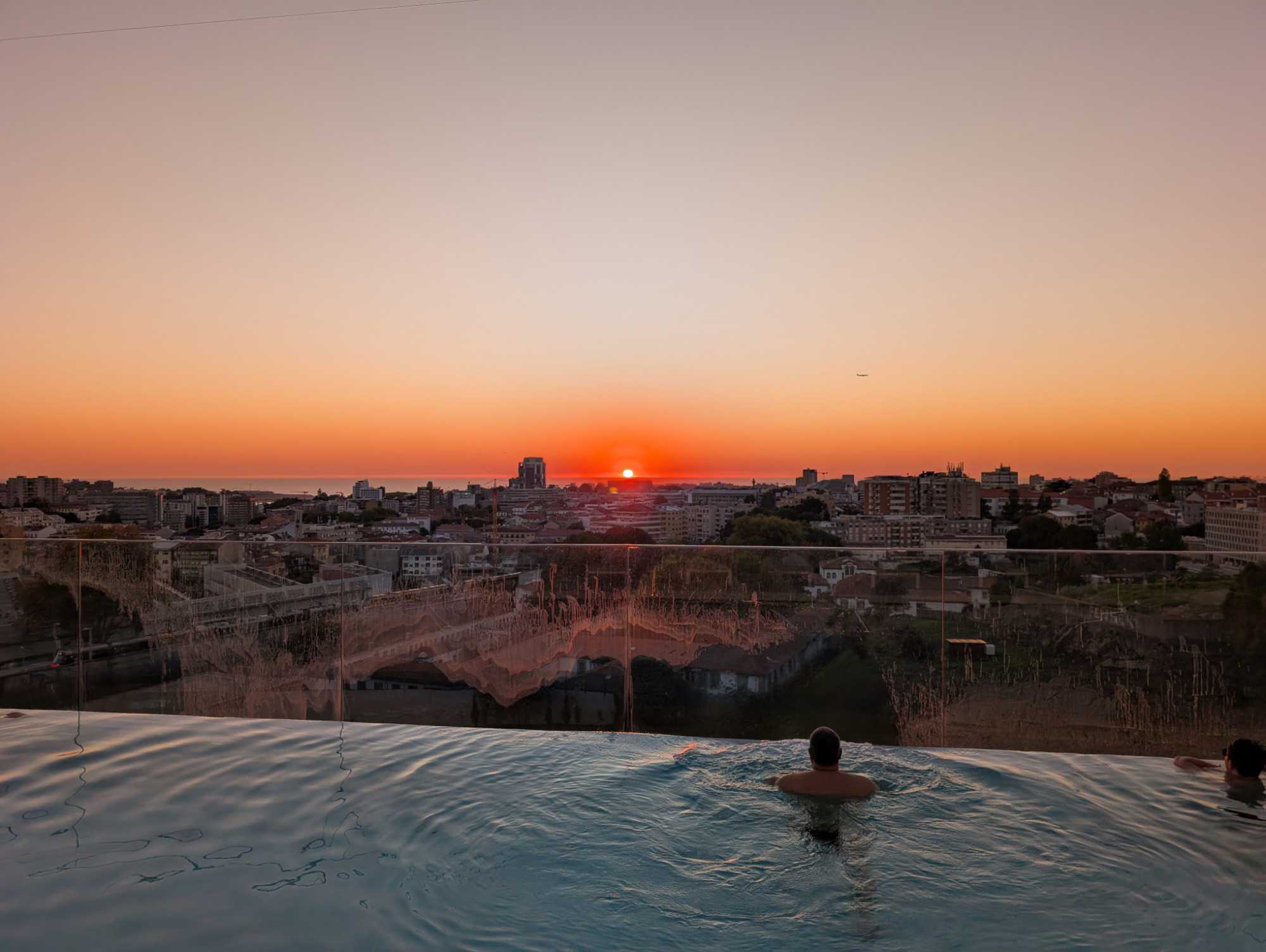 Nos visites pour la journée terminées, nous regagnons notre autocar et nous dirigeons vers notre hôtel à Porto pour quelques heures de détente avant le festin habituel de fin de soirée au restaurant de l'hôtel. Les plus chanceux d'entre nous aurons profité de ce répit pour aller à la piscine de l'hôtel afin d'admirer notre astre enflammé dans sa descente dans l'Atlantique.