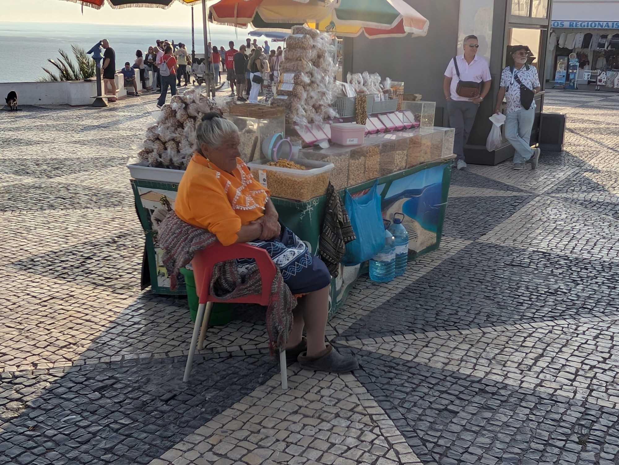 Nazaré, c'est l'histoire d'un duel permanent entre la douceur de la tradition et la force brute de l'océan. La ville s'articule en deux parties : en bas, le village de pêcheurs, avec ses ruelles et sa grande plage. En haut, sur le promontoire du Sítio, on trouve le Belvédère de Suberco (Miradouro do Suberco) qui est bien plus qu'un simple point de vue : c'est le grand balcon de Nazaré, suspendu au-dessus de l'océan. Perché sur la falaise abrupte du Sítio, il offre une vue à couper le souffle sur le village de pêcheurs en contrebas, sa plage en forme de croissant et les vagues qui se brisent sur le sable. L'air y est vivifiant et les mouettes tournoient au-dessus de la mer, créant une ambiance de liberté et de grandeur. C'est aussi un lieu chargé de légende : on y trouve une petite chapelle, la Mémoire du miraculeux sauvetage de Dom Fuas Roupinho par la Vierge Marie, ce qui ajoute une touche de mysticisme à l'expérience. Juste en face, des femmes vêtues du costume traditionnel de Nazaré avec la jupe à sept jupons font commerce. Le Sanctuaire de Notre-Dame de Nazaré est un imposant édifice baroque qui se dresse fièrement sur le promontoire du Sítio. Loin de la modestie de la Chapelle de la Mémoire, il est un lieu de pèlerinage majeur, une expression grandiose de la foi et de la gratitude envers la Vierge qui aurait sauvé le chevalier D. Fuas Roupinho. Sa façade richement décorée et son intérieur majestueux contrastent avec le paysage sauvage de la côte. En se promenant sur la grande place qui lui fait face, on peut contempler l'immensité de l'océan d'un côté et la solennité du sanctuaire de l'autre, un lieu où la grandeur de la nature et celle de l'âme humaine se rencontrent.