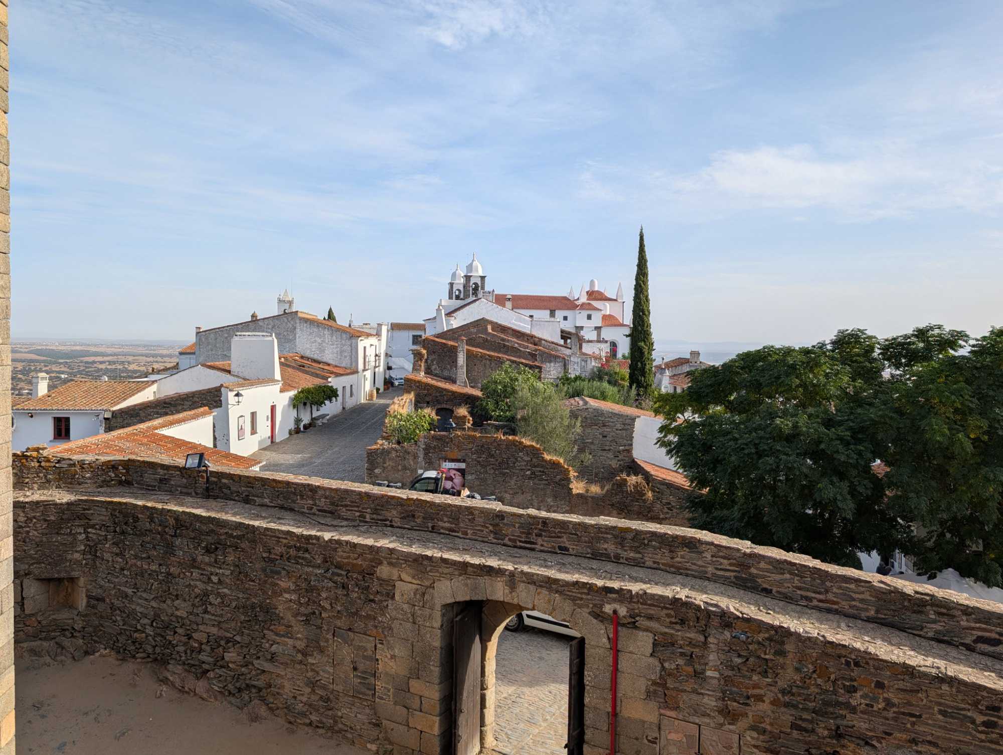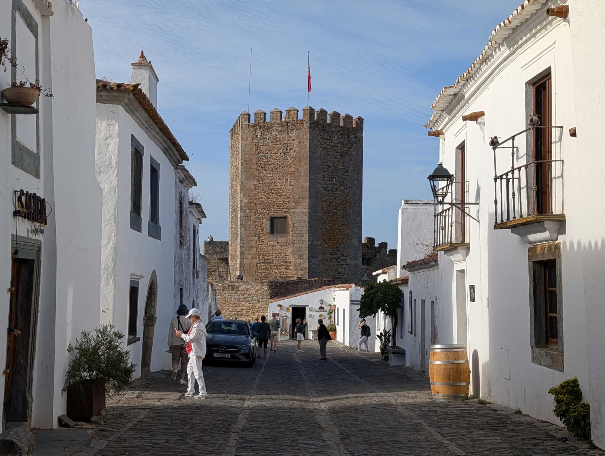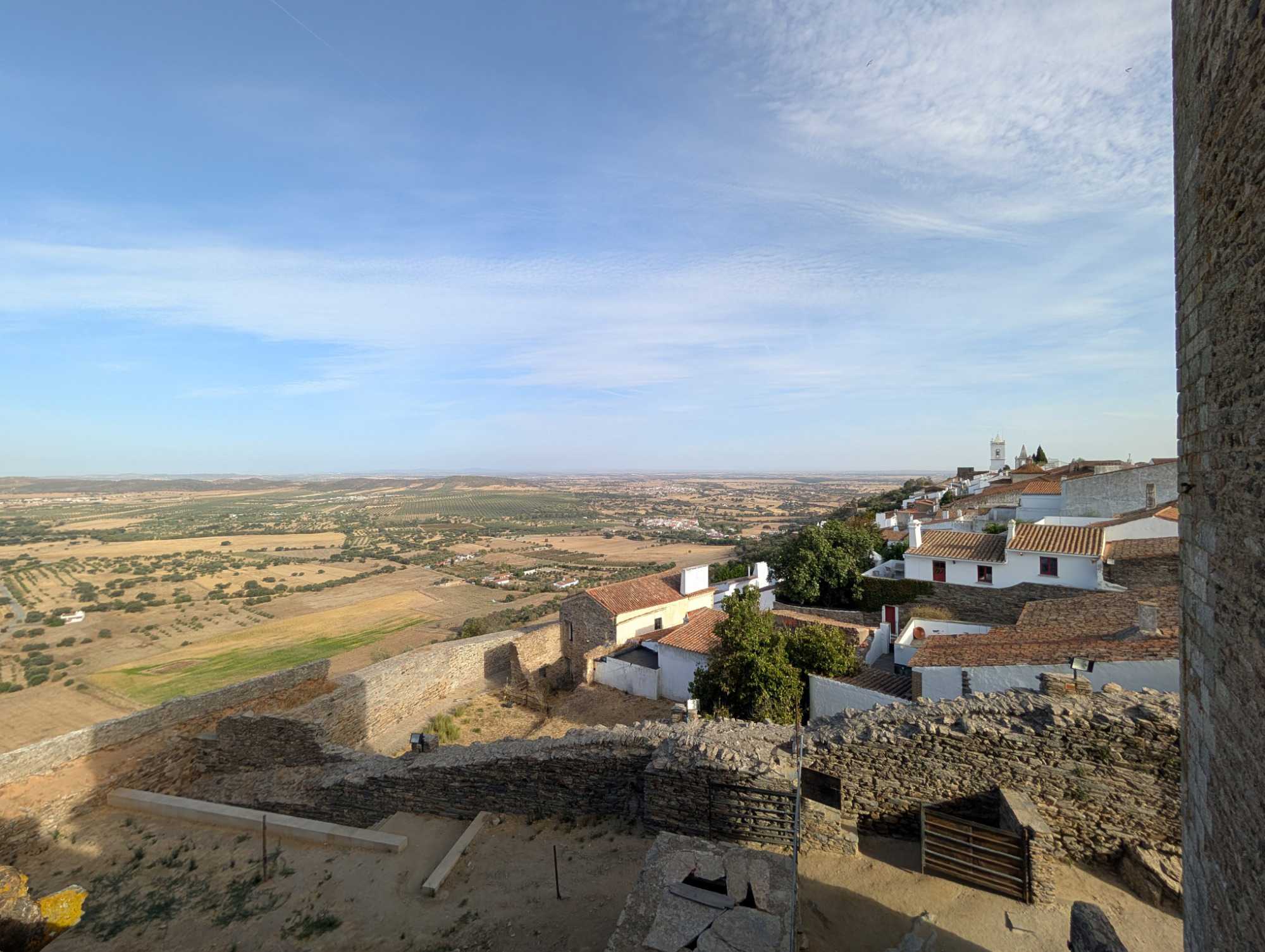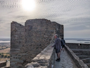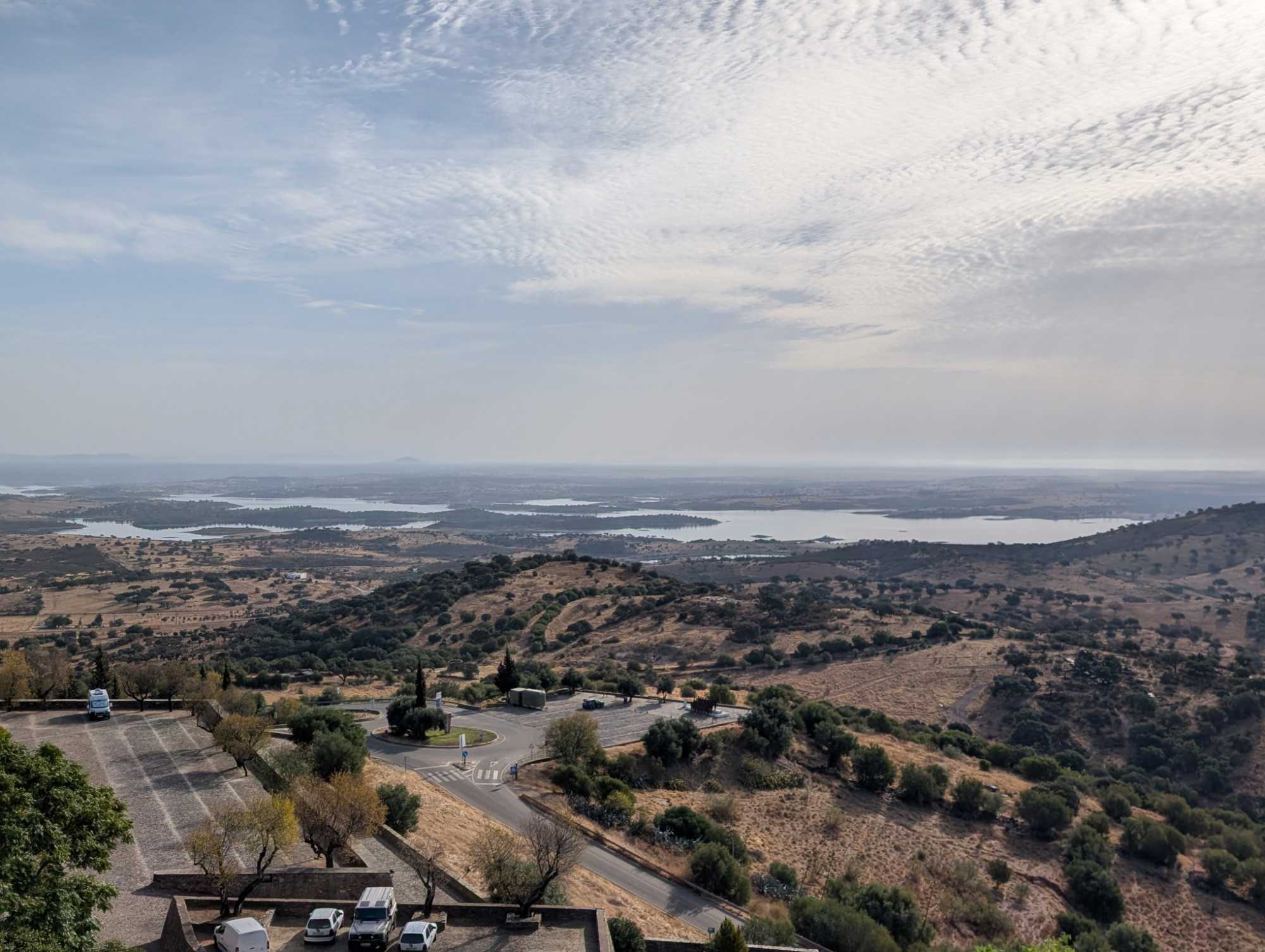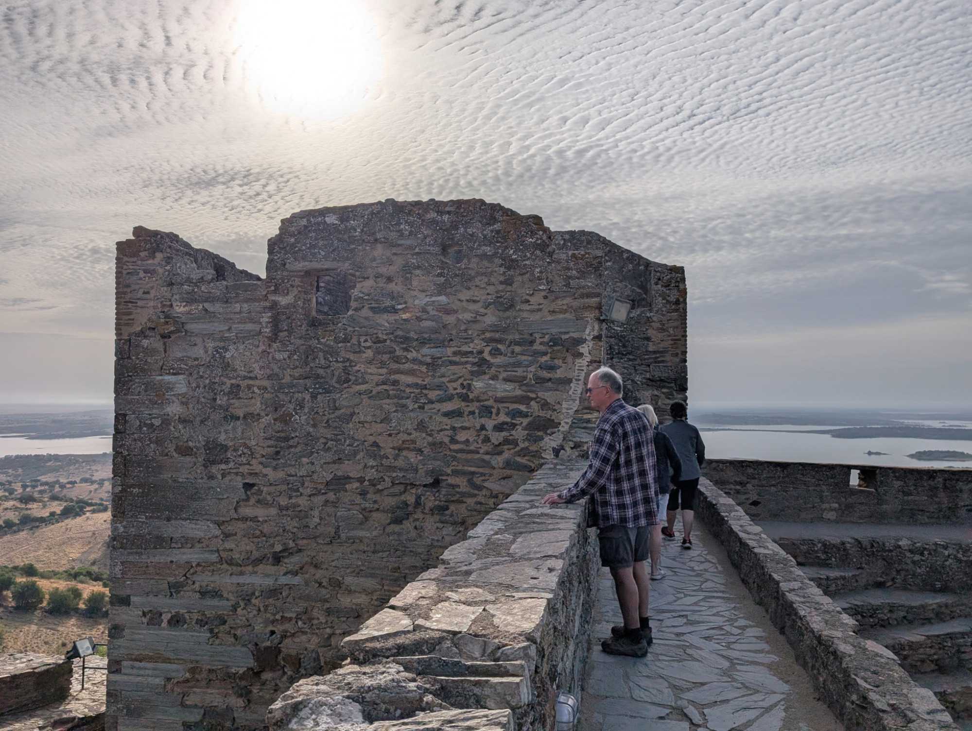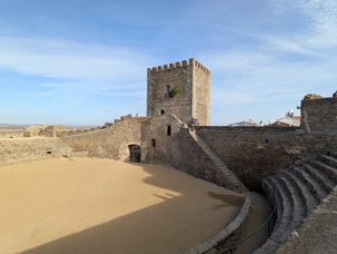 Nous arrivons à Monsaraz, tout près de la frontière espagnole. Perché au sommet d'une colline, le village médiéval de Monsaraz surplombe le plus grand lac artificiel d'Europe, le lac d'Alqueva. Ses rues étroites et pavées, bordées de maisons blanchies à la chaux, mènent à un château et à des remparts qui offrent une vue à couper le souffle sur le paysage de l'Alentejo. Le lieu dégage une atmosphère de paix et de sérénité, figée dans le temps. Son château médiéval aux toits rougeâtres fait face au arage hydro-électrique d'Alqueva.