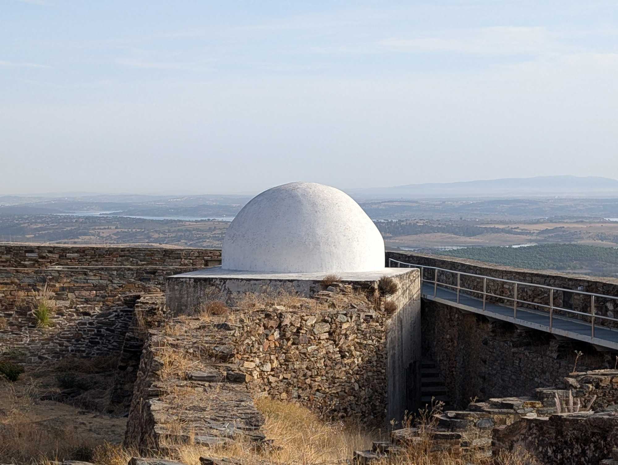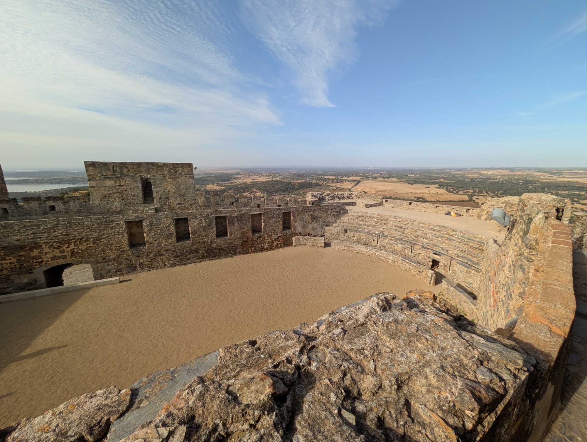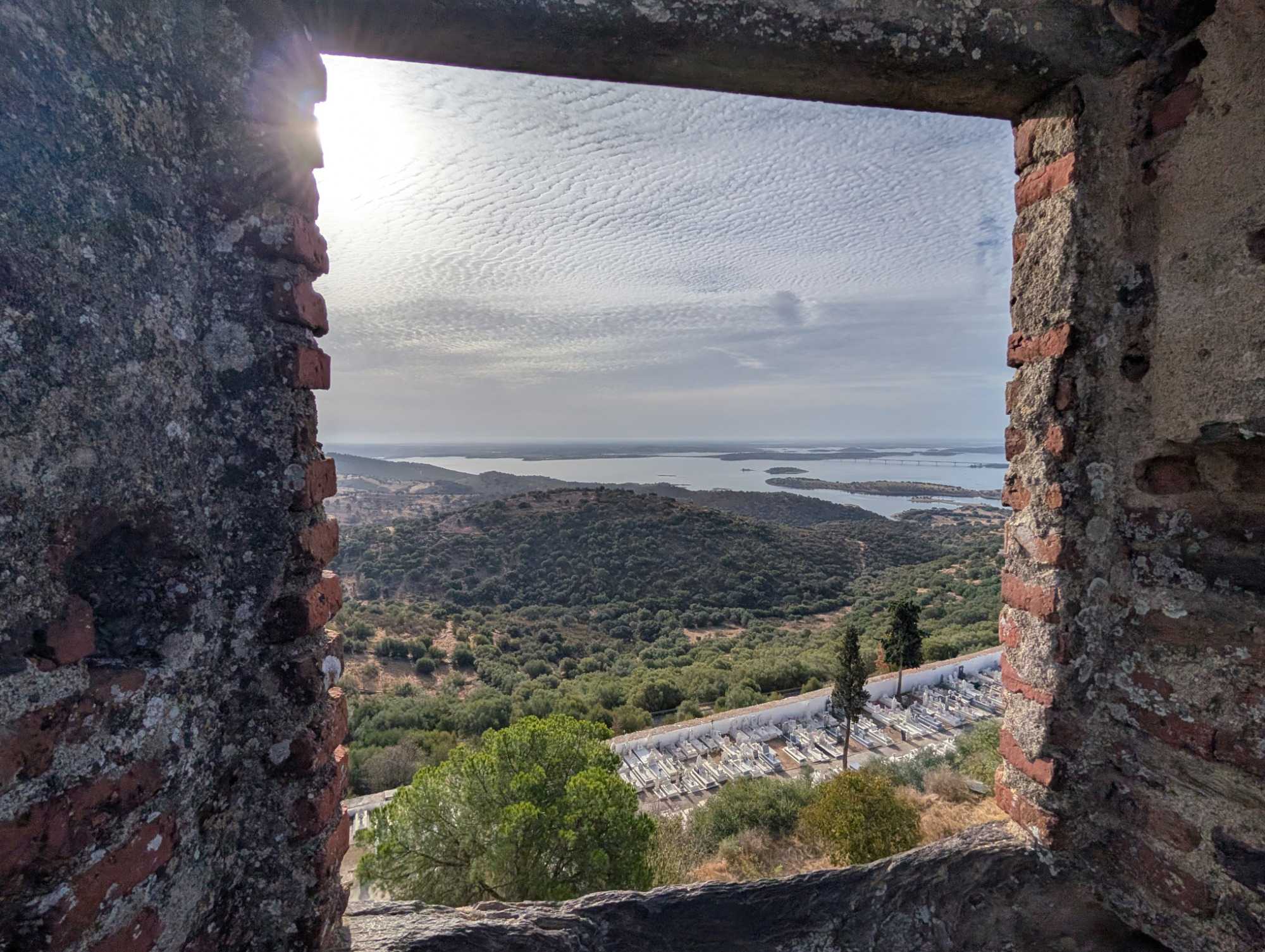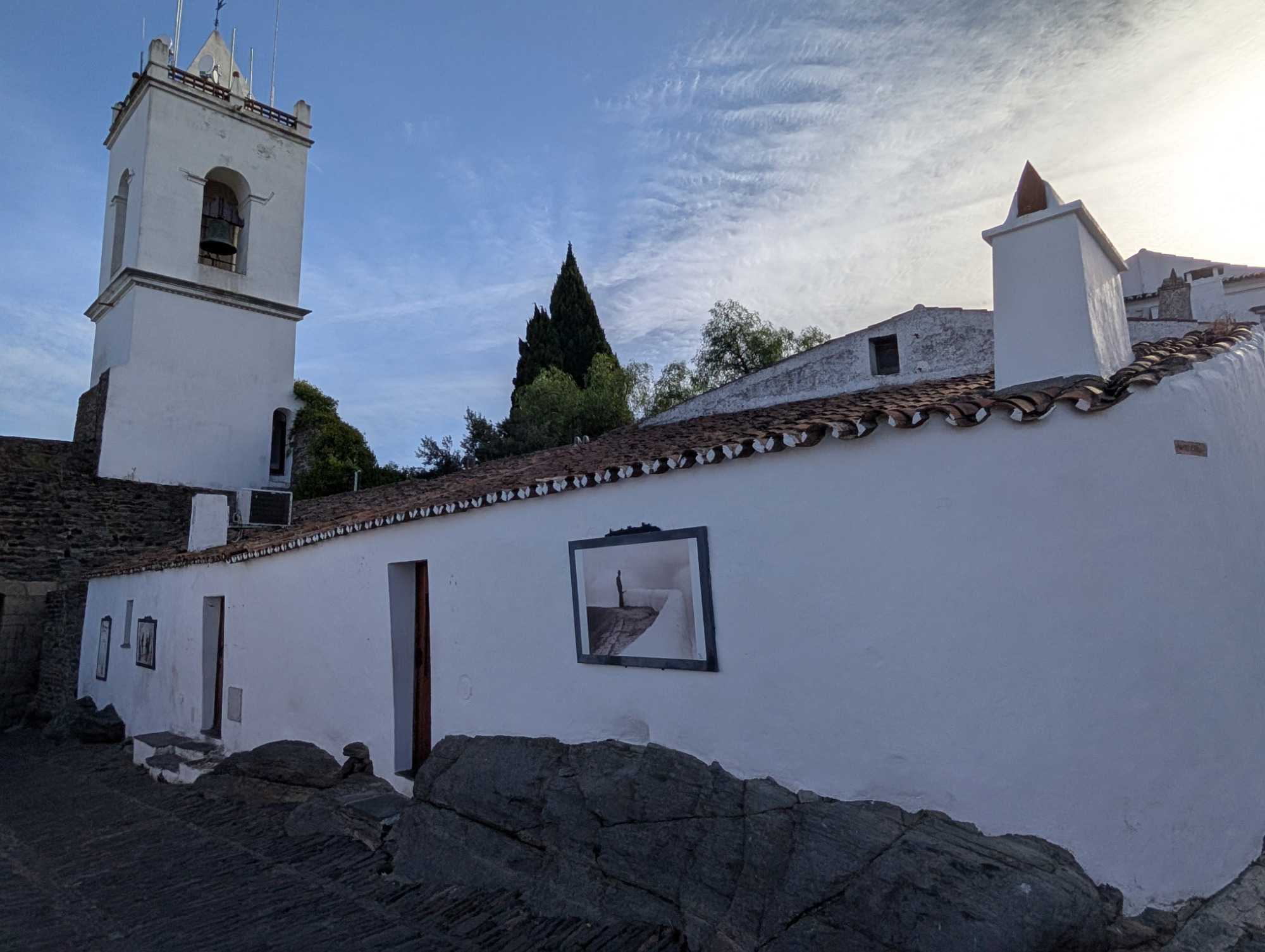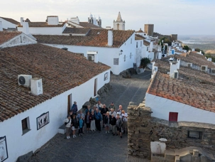 Nous arrivons à Monsaraz, tout près de la frontière espagnole. Perché au sommet d'une colline, le village médiéval de Monsaraz surplombe le plus grand lac artificiel d'Europe, le lac d'Alqueva. Ses rues étroites et pavées, bordées de maisons blanchies à la chaux, mènent à un château et à des remparts qui offrent une vue à couper le souffle sur le paysage de l'Alentejo. Le lieu dégage une atmosphère de paix et de sérénité, figée dans le temps. Son château médiéval aux toits rougeâtres fait face au arage hydro-électrique d'Alqueva.