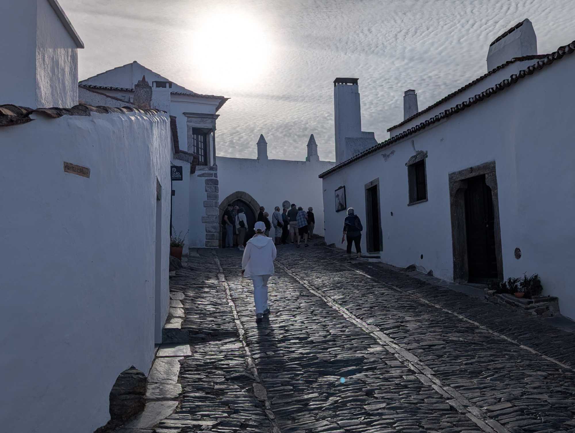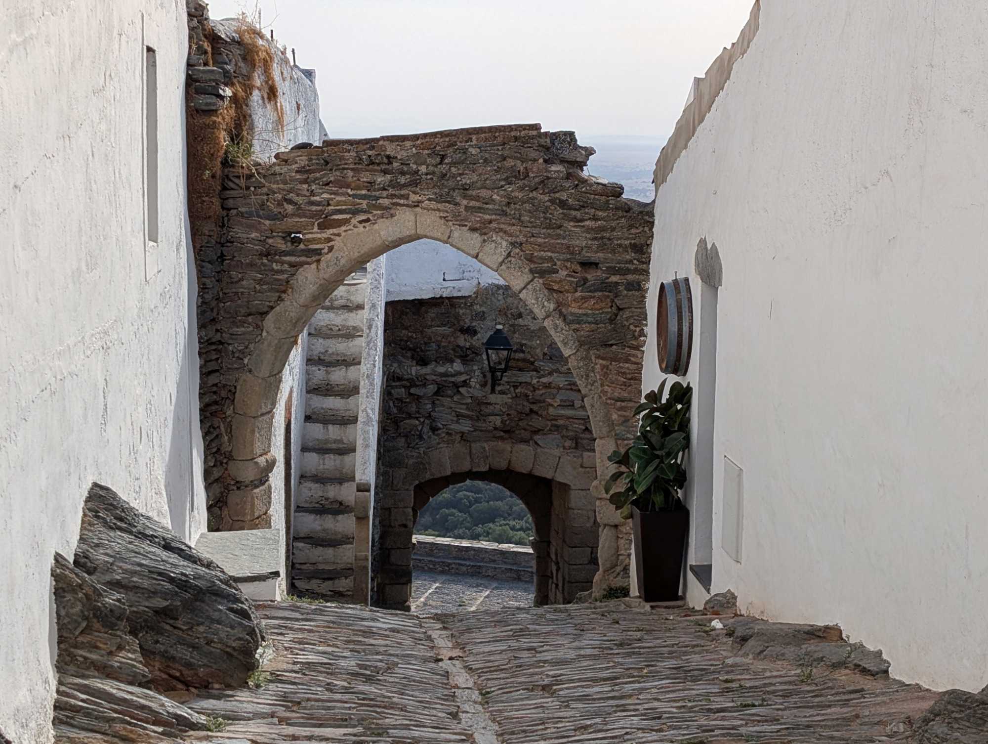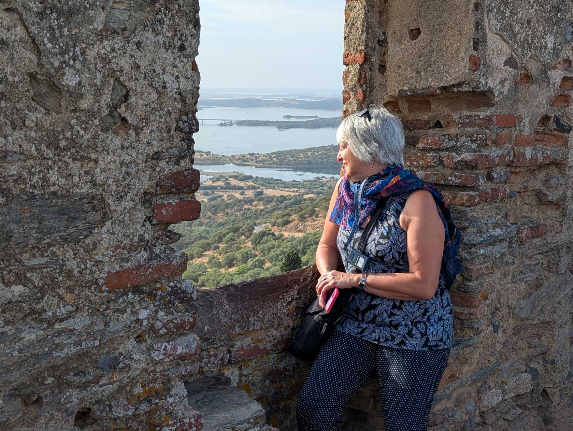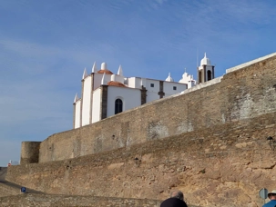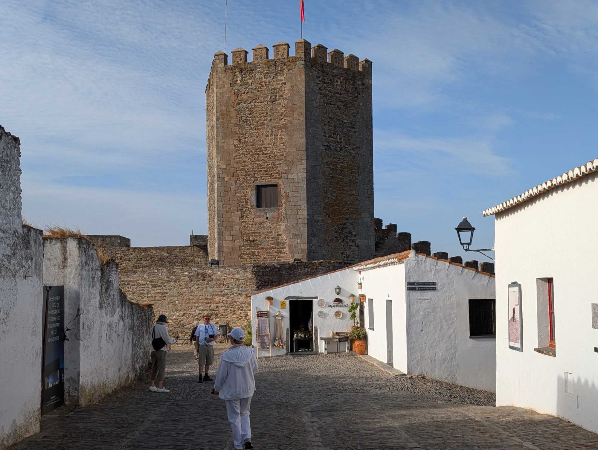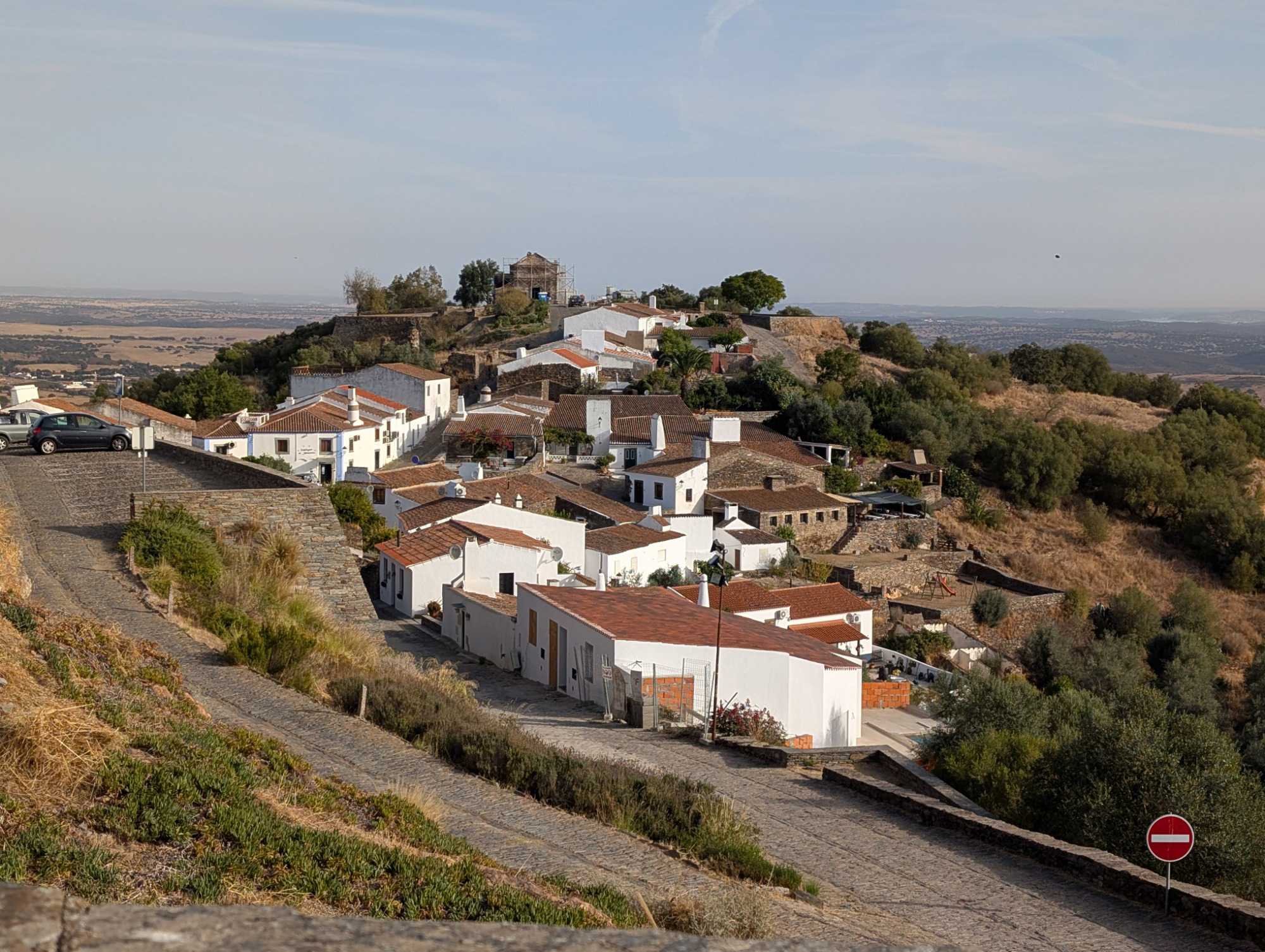 Nous arrivons à Monsaraz, tout près de la frontière espagnole. Perché au sommet d'une colline, le village médiéval de Monsaraz surplombe le plus grand lac artificiel d'Europe, le lac d'Alqueva. Ses rues étroites et pavées, bordées de maisons blanchies à la chaux, mènent à un château et à des remparts qui offrent une vue à couper le souffle sur le paysage de l'Alentejo. Le lieu dégage une atmosphère de paix et de sérénité, figée dans le temps. Son château médiéval aux toits rougeâtres fait face au arage hydro-électrique d'Alqueva.
