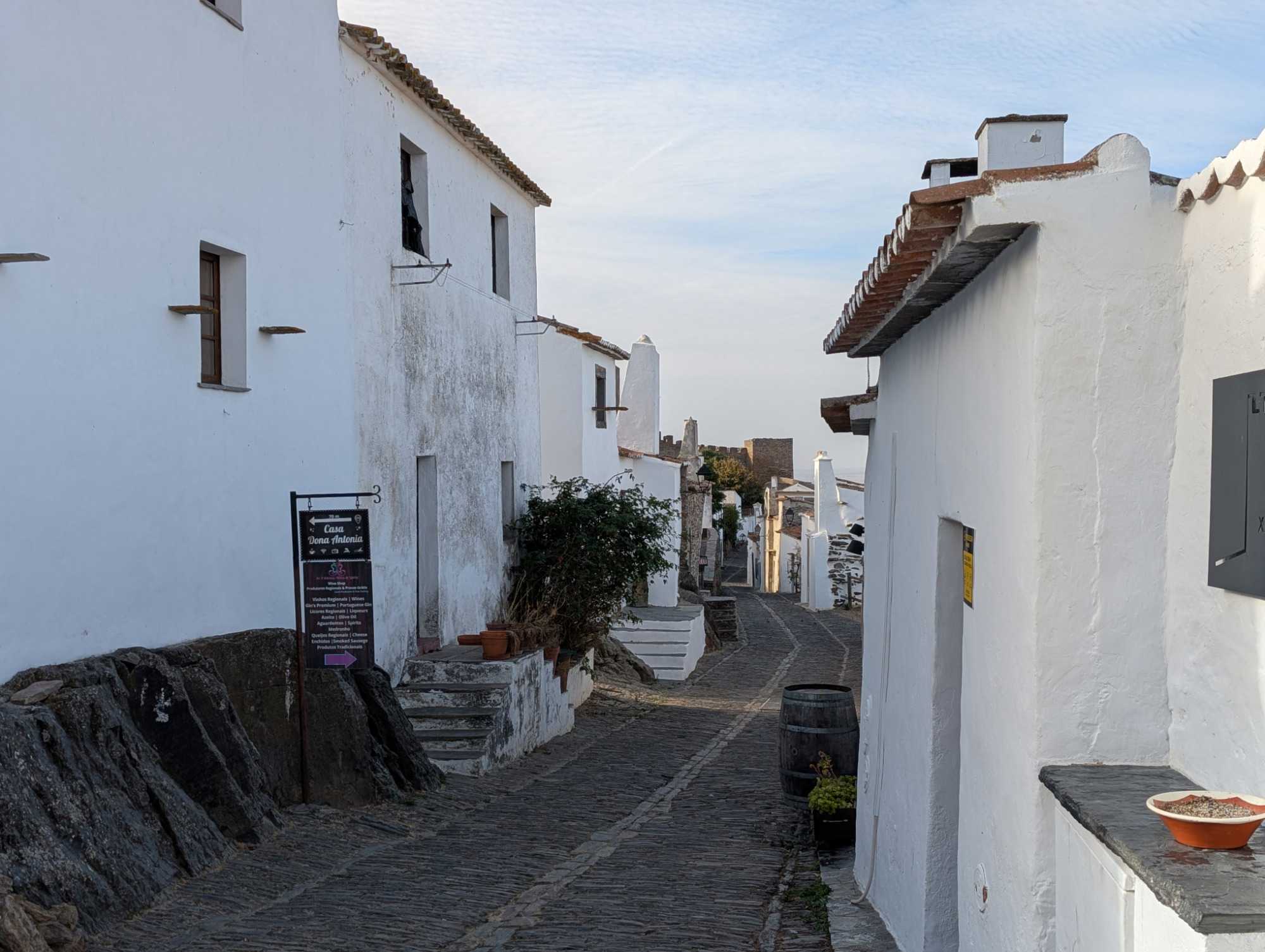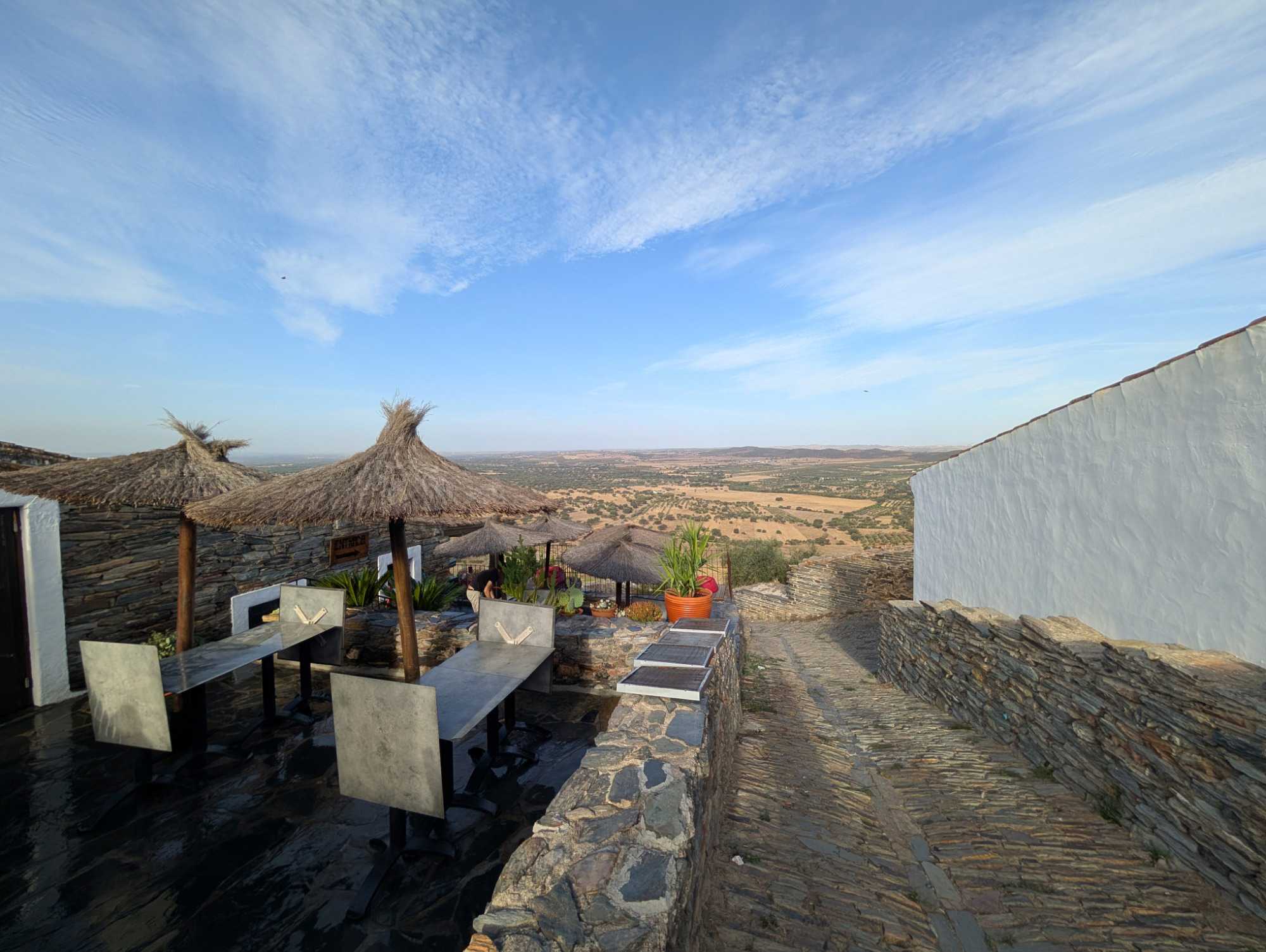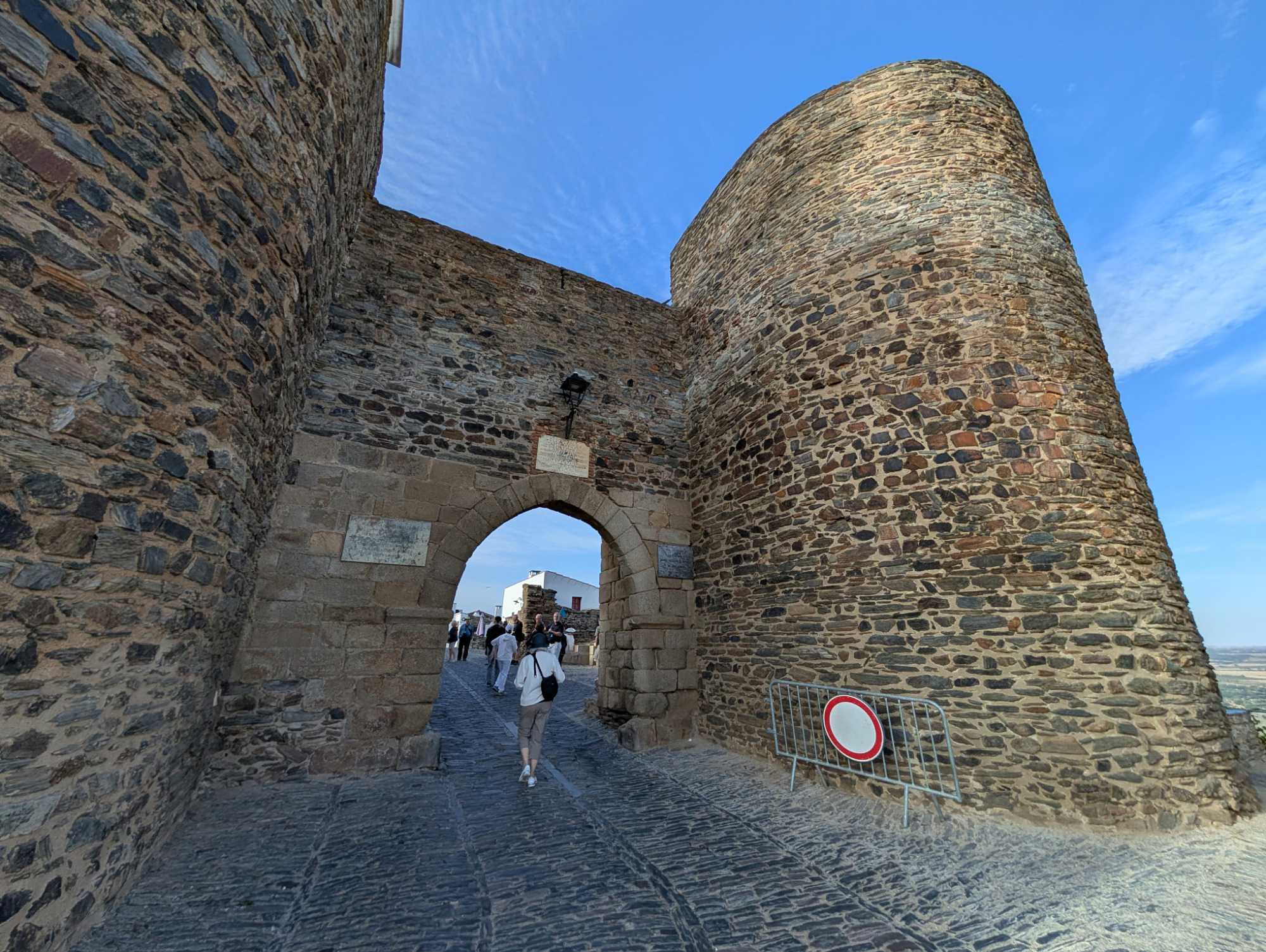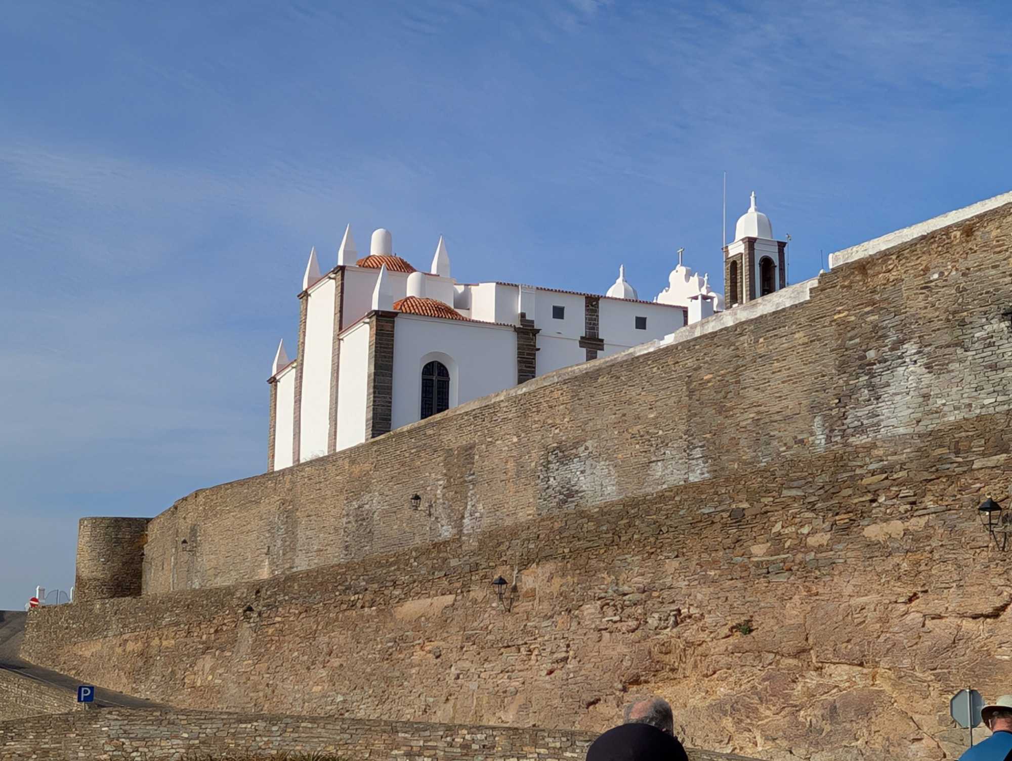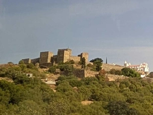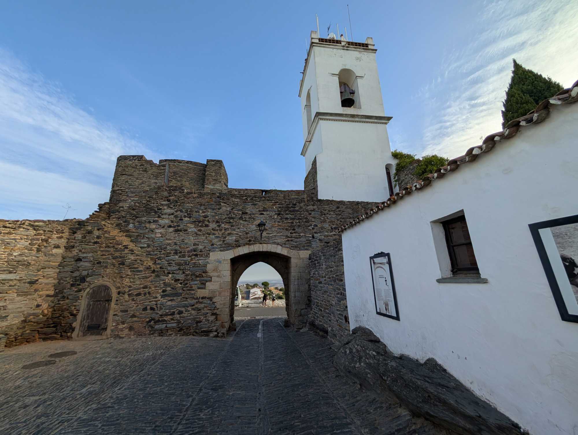 Nous arrivons à Monsaraz, tout près de la frontière espagnole. Perché au sommet d'une colline, le village médiéval de Monsaraz surplombe le plus grand lac artificiel d'Europe, le lac d'Alqueva. Ses rues étroites et pavées, bordées de maisons blanchies à la chaux, mènent à un château et à des remparts qui offrent une vue à couper le souffle sur le paysage de l'Alentejo. Le lieu dégage une atmosphère de paix et de sérénité, figée dans le temps. Son château médiéval aux toits rougeâtres fait face au arage hydro-électrique d'Alqueva.