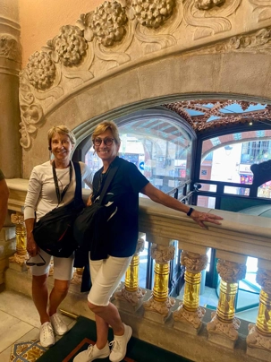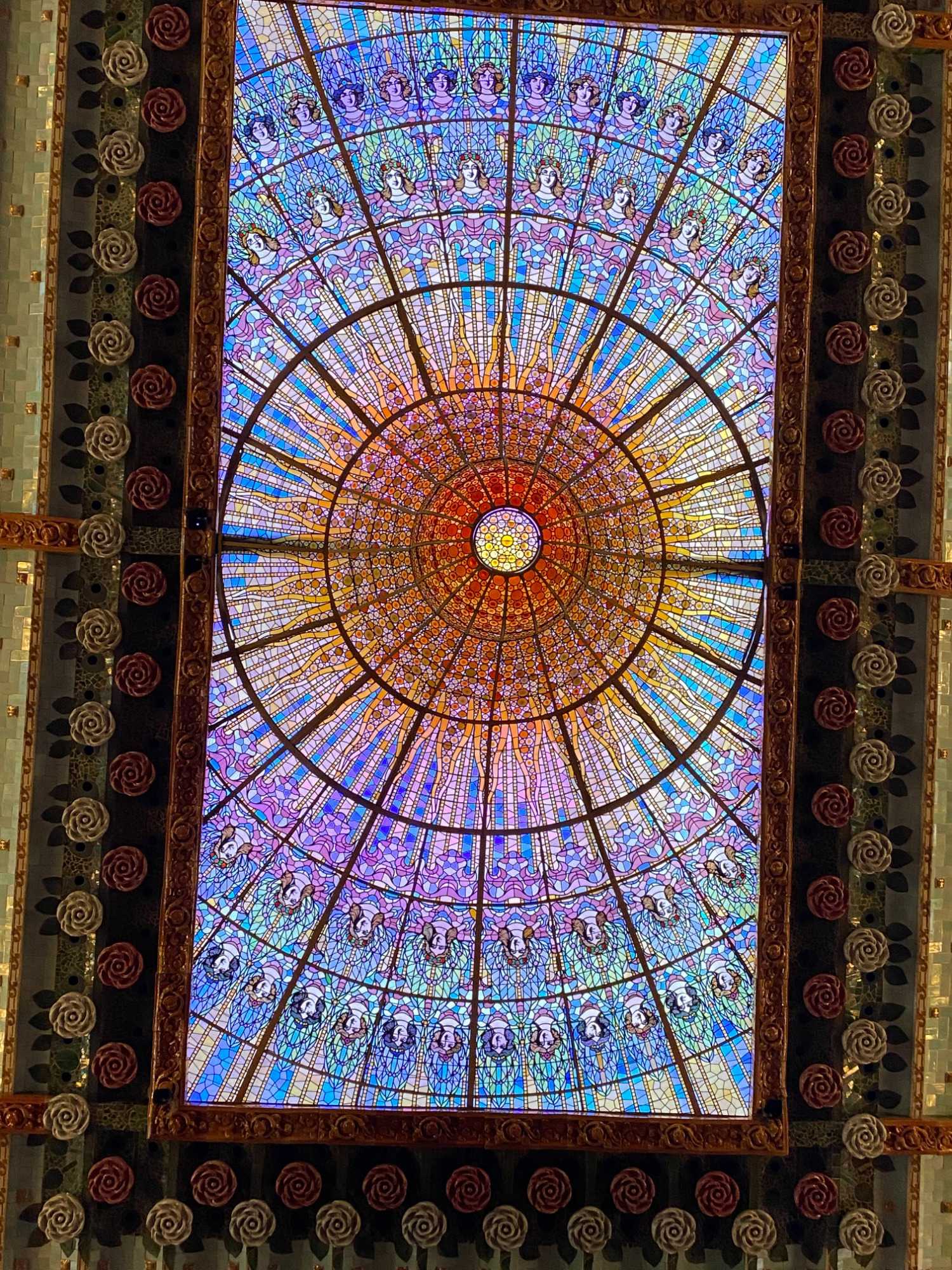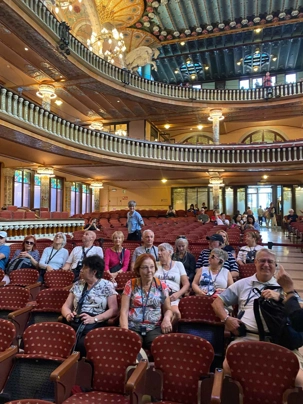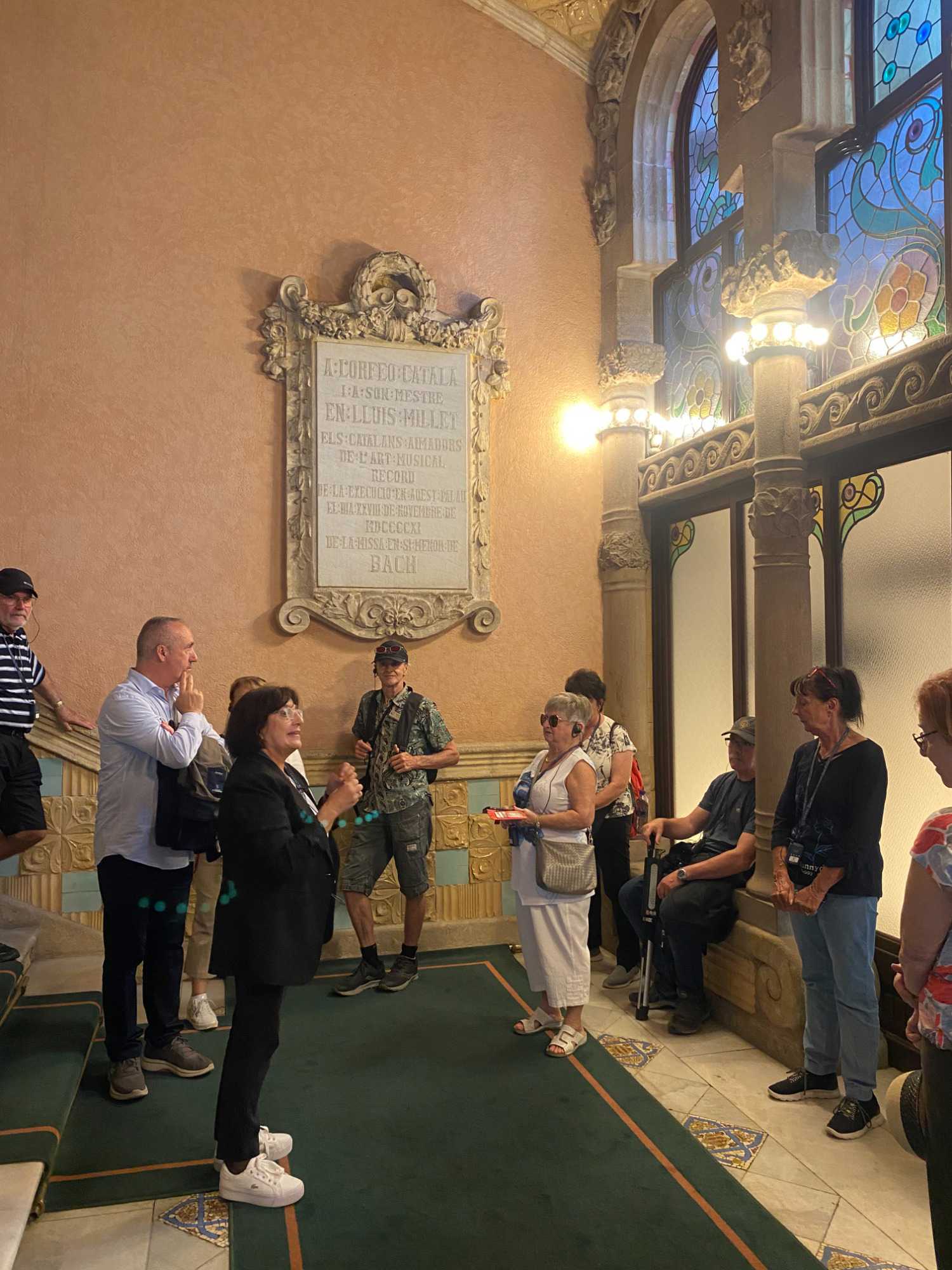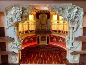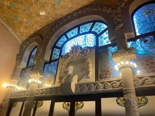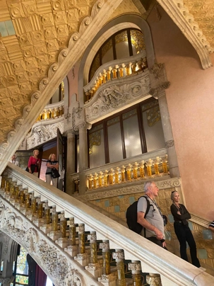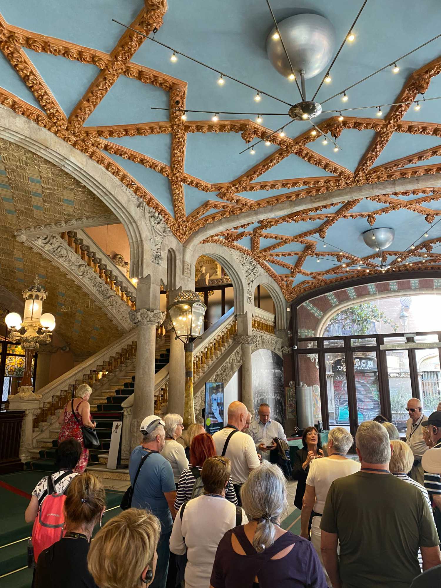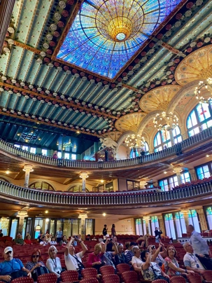 À l’intérieur, nous visitons la salle de spectacle qui peut accueillir environ 2 000 spectateurs sur trois niveaux. Classée aujourd’hui au patrimoine mondial de l’UNESCO, elle éblouit par son décor: colonnes ornées, vitraux colorés, mosaïques étincelantes et détails sculptés à profusion. Partout, les motifs floraux et naturels rappellent l’importance de la nature dans l’art moderniste, avec des fleurs, des feuilles et des arabesques qui semblent donner vie aux murs. Le plafond est dominé par un immense vitrail central en forme de coupole inversée, qui inonde la salle de lumière naturelle. Au-dessus de la scène, les célèbres 18 muses symbolisant l’art et la musique dans toute leur splendeur. Une belle visite qui nous émerveille!