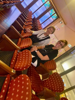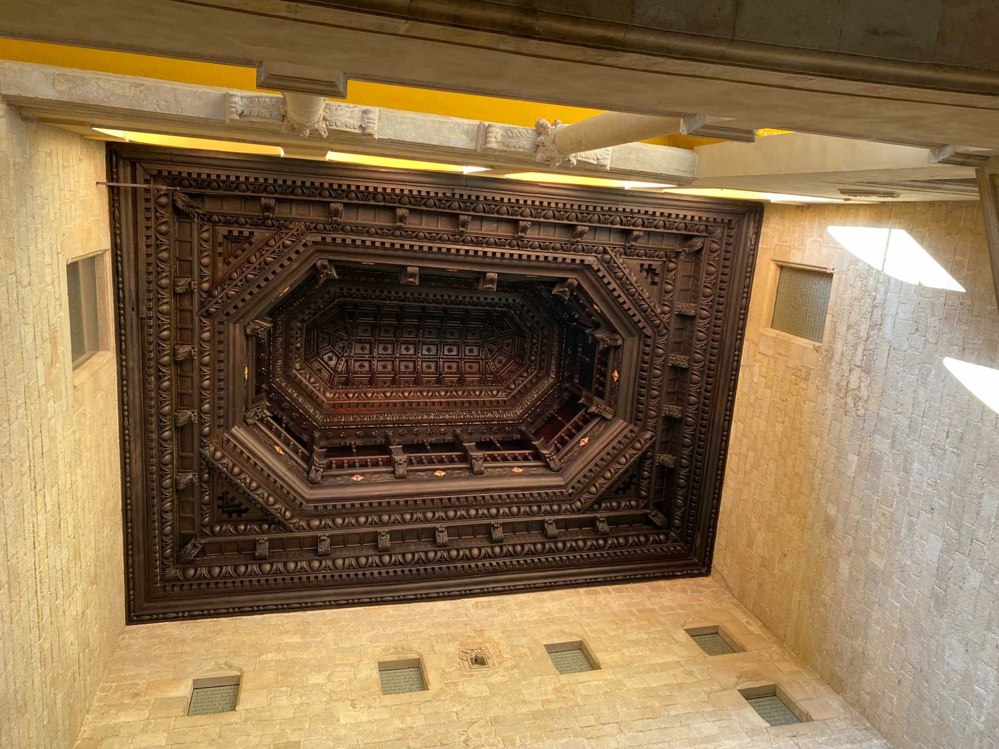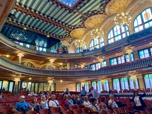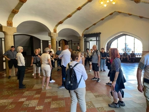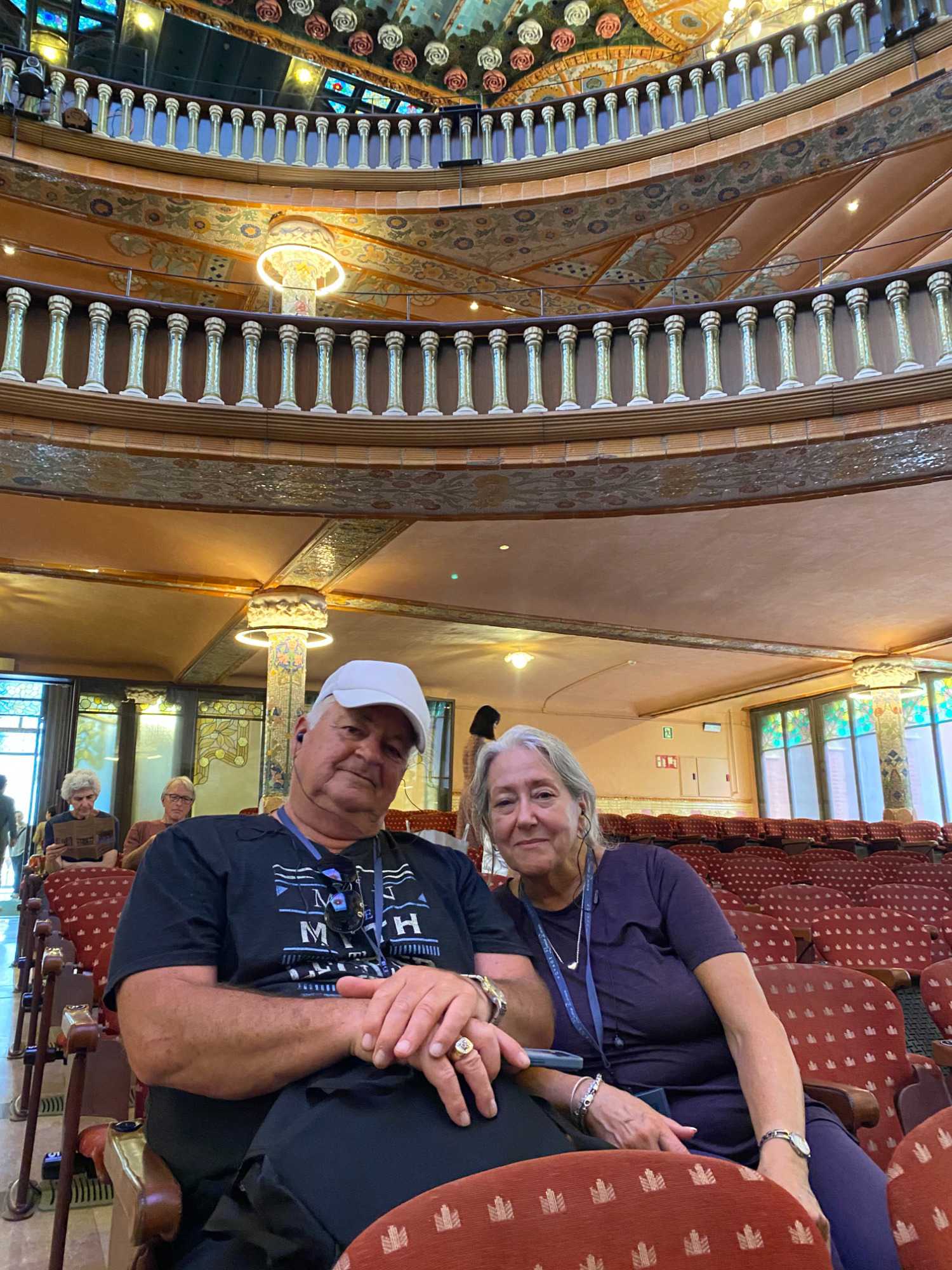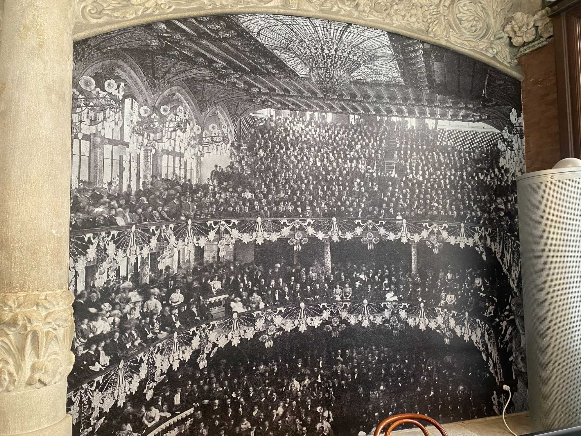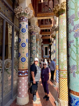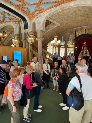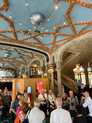 À l’intérieur, nous visitons la salle de spectacle qui peut accueillir environ 2 000 spectateurs sur trois niveaux. Classée aujourd’hui au patrimoine mondial de l’UNESCO, elle éblouit par son décor: colonnes ornées, vitraux colorés, mosaïques étincelantes et détails sculptés à profusion. Partout, les motifs floraux et naturels rappellent l’importance de la nature dans l’art moderniste, avec des fleurs, des feuilles et des arabesques qui semblent donner vie aux murs. Le plafond est dominé par un immense vitrail central en forme de coupole inversée, qui inonde la salle de lumière naturelle. Au-dessus de la scène, les célèbres 18 muses symbolisant l’art et la musique dans toute leur splendeur. Une belle visite qui nous émerveille!