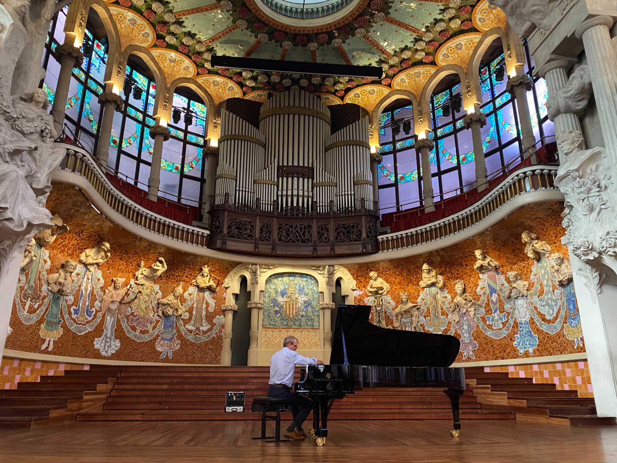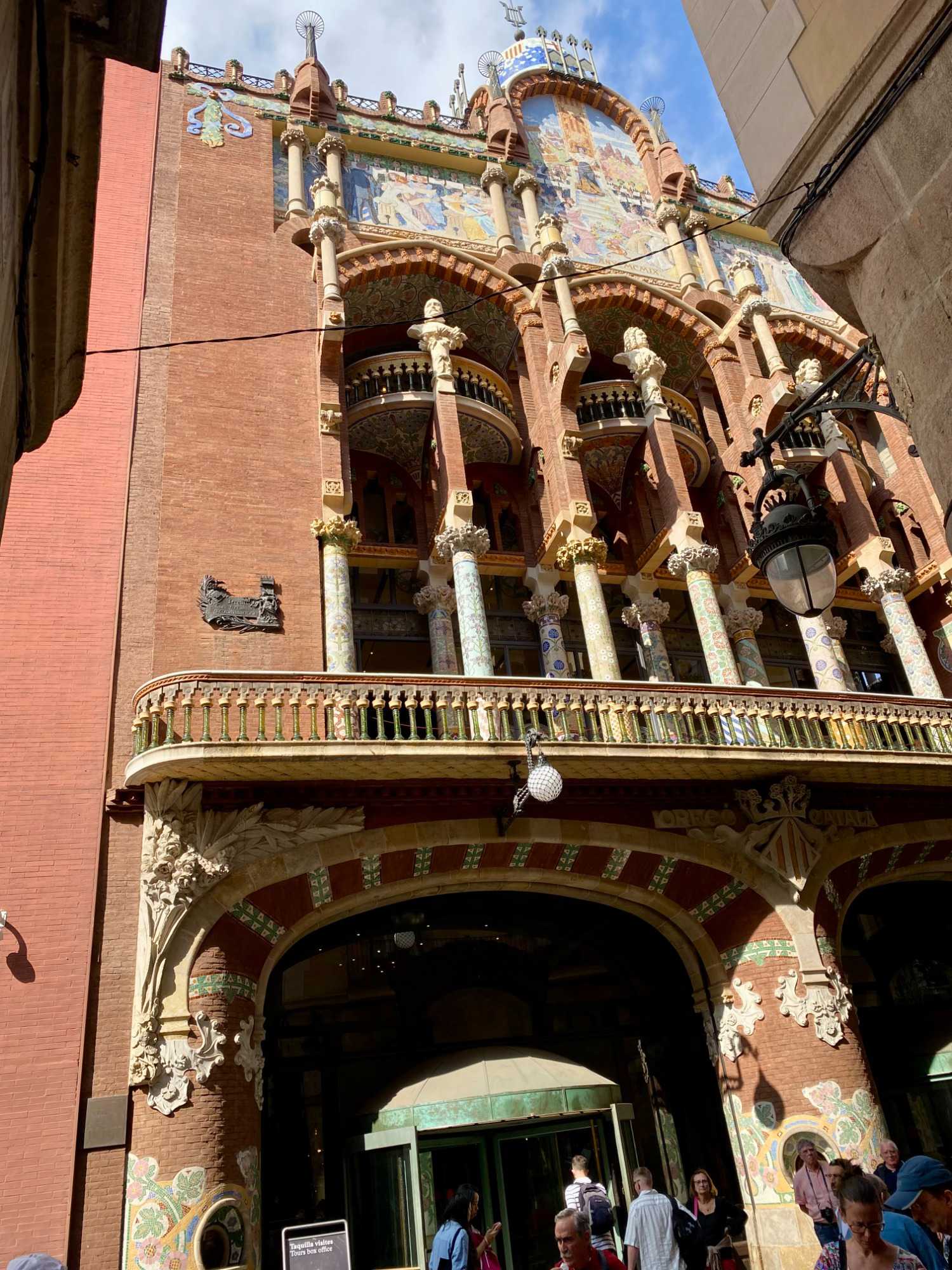 Le palais a été construit entre 1905 et 1908, au cœur de la ville, dans un quartier déjà densément bâti. Ce choix n’est pas anodin: les musiciens et les chorales qui ont financé le projet voulaient rester proches de leur maison et de leur famille, ce qui explique pourquoi l’édifice s’élève presque coincé entre les immeubles voisins. De l’extérieur, on remarque ses façades richement décorées de mosaïques, colonnes colorées et sculptures, un véritable manifeste du modernisme catalan. On y distingue aussi les bustes de grands musiciens et compositeurs tels que Beethoven, Bach, Wagner et Palestrina.