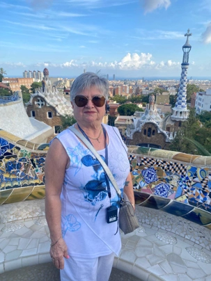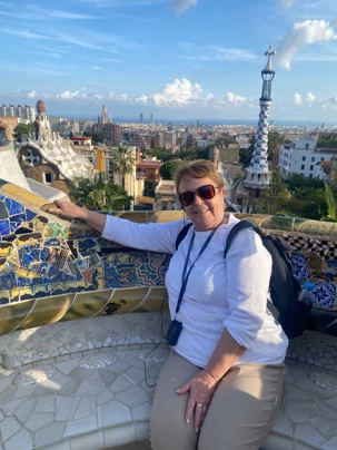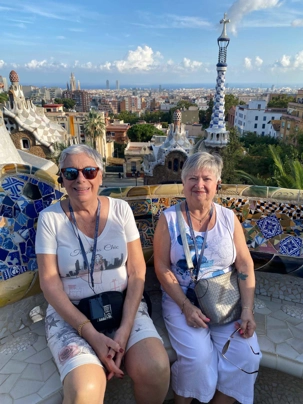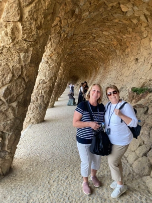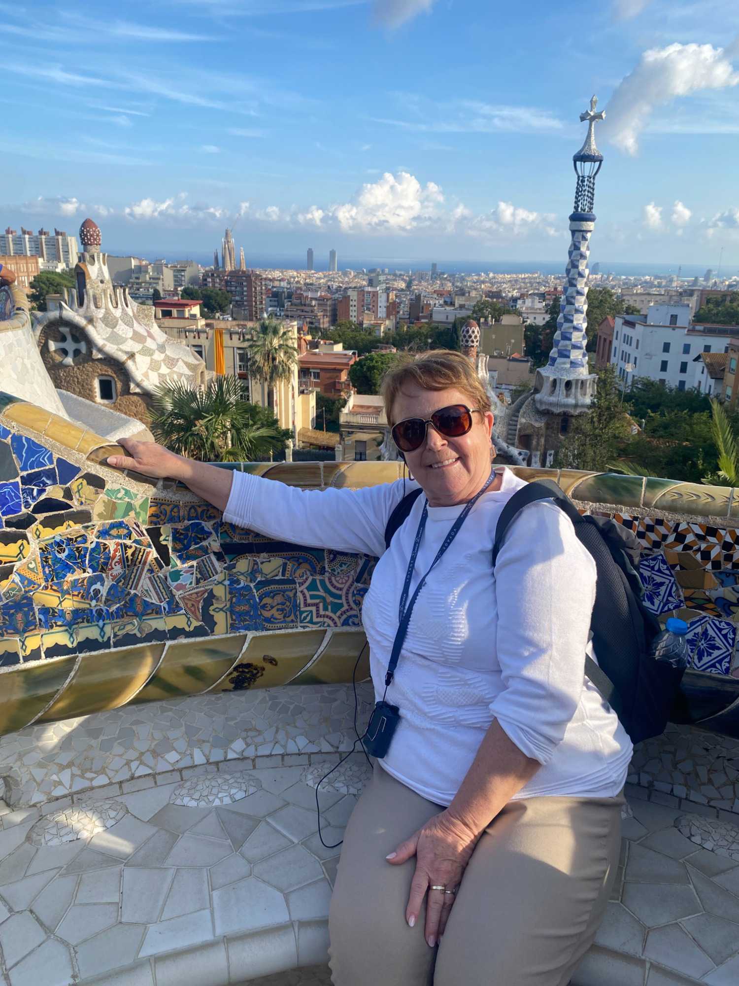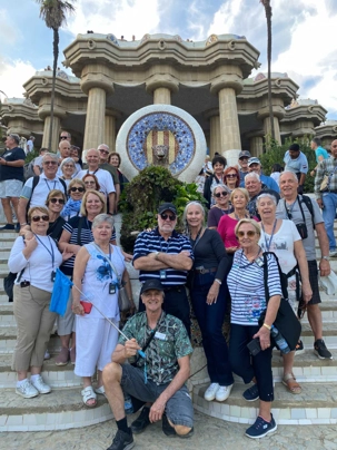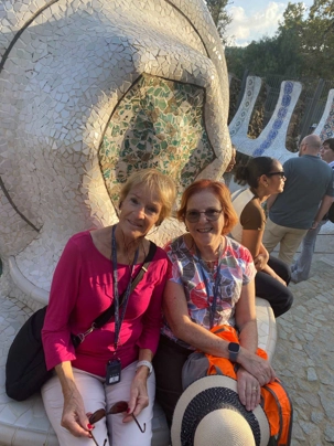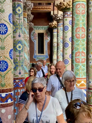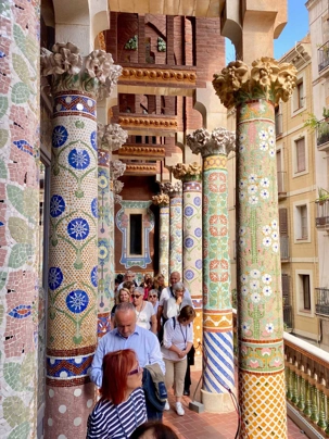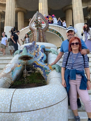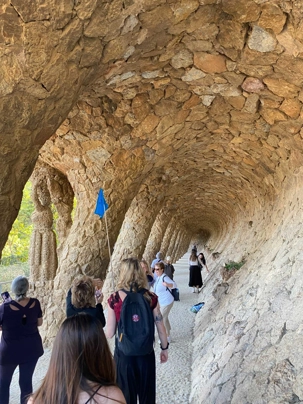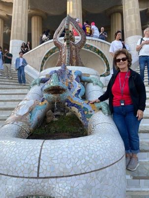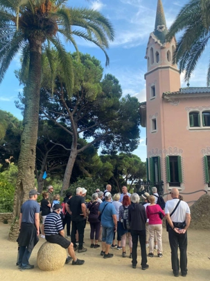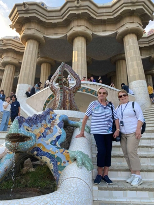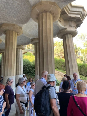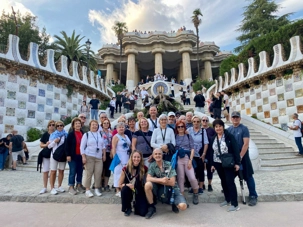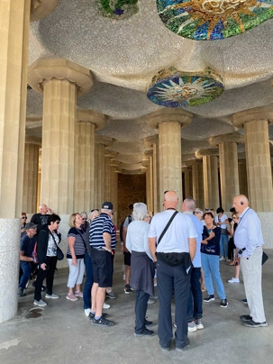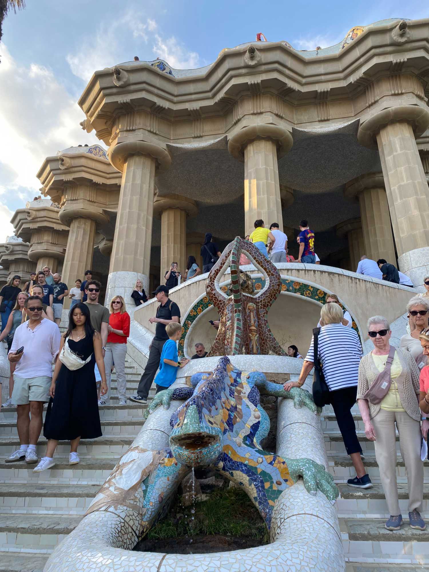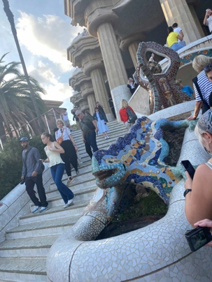 Le Parc Güell est un lieu qui semble tout droit sorti d’un conte de fées! Ici, chaque courbe, chaque structure est une ode à la nature. Les colonnes des allées, par exemple, rappellent des troncs d’arbres, comme si la forêt elle-même avait sculpté ces formes. À l’entrée, deux maisons en forme de champignons encadrent un portail qui invite les visiteurs dans ce monde enchanteur. Une fois cette entrée franchie, on découvre un impressionnant escalier central orné de fontaines, dont la plus célèbre est la salamandre, aussi appelée "El Drac," devenue l’emblème du parc. Nous en profitons pour prendre une photo de groupe.