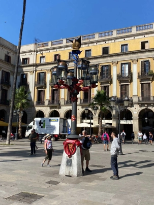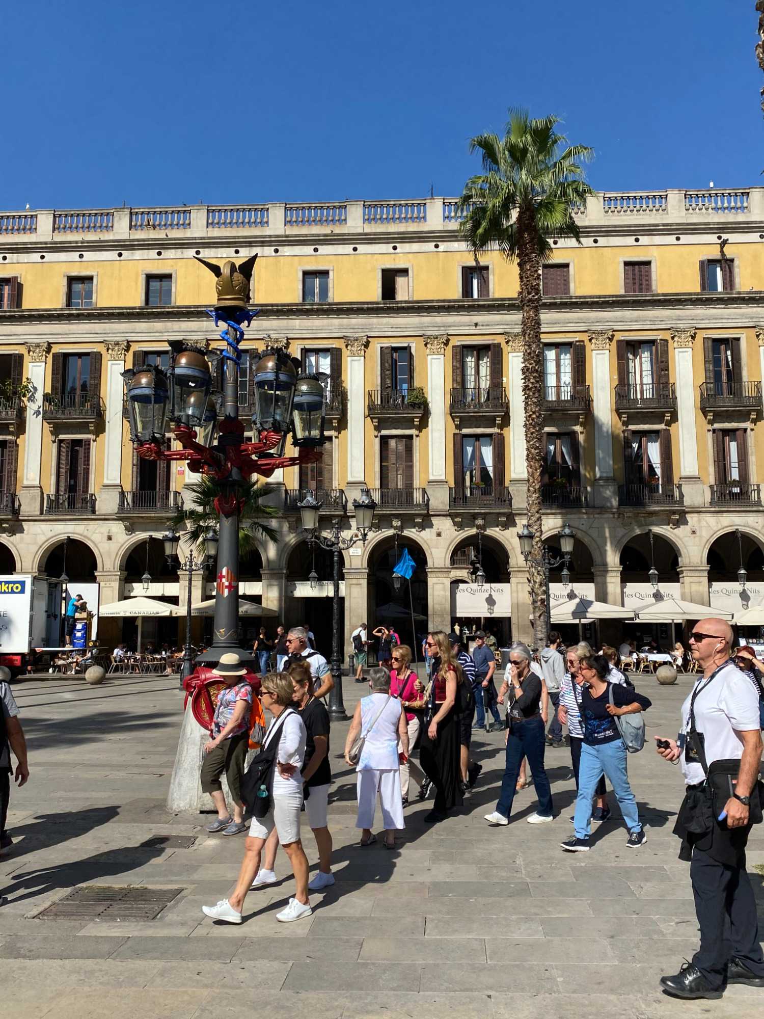Nous poursuivons notre visite en nous dirigeant vers La Rambla, l’avenue emblématique de Barcelone. Longue d’environ 1,6 km, elle relie la Plaça de Catalunya au port. Comme l’a expliqué Miquel, elle est considérée comme le véritable centre de la ville, le lieu de rencontre par excellence pour les Barcelonais et les visiteurs. Aujourd’hui, c’est une promenade animée bordée de cafés, de magasins, de fleurs et d’artistes de rue, qui reflète toute l’effervescence de la vie barcelonaise.