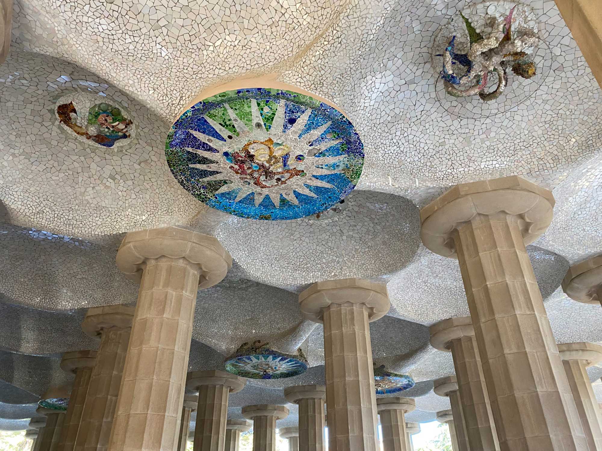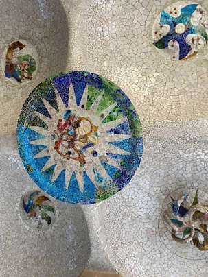 Au sommet, la place centrale dévoile le banc ondulé le plus long du monde, s’étirant sur 110 mètres. Ce banc, à la fois fonctionnel et poétique, est décoré de mosaïques éclatantes, réalisées avec la technique du trencadís — un procédé cher à Gaudí, qui consiste à assembler des morceaux de céramique ou de verre brisés pour en faire une œuvre vibrante de couleurs.