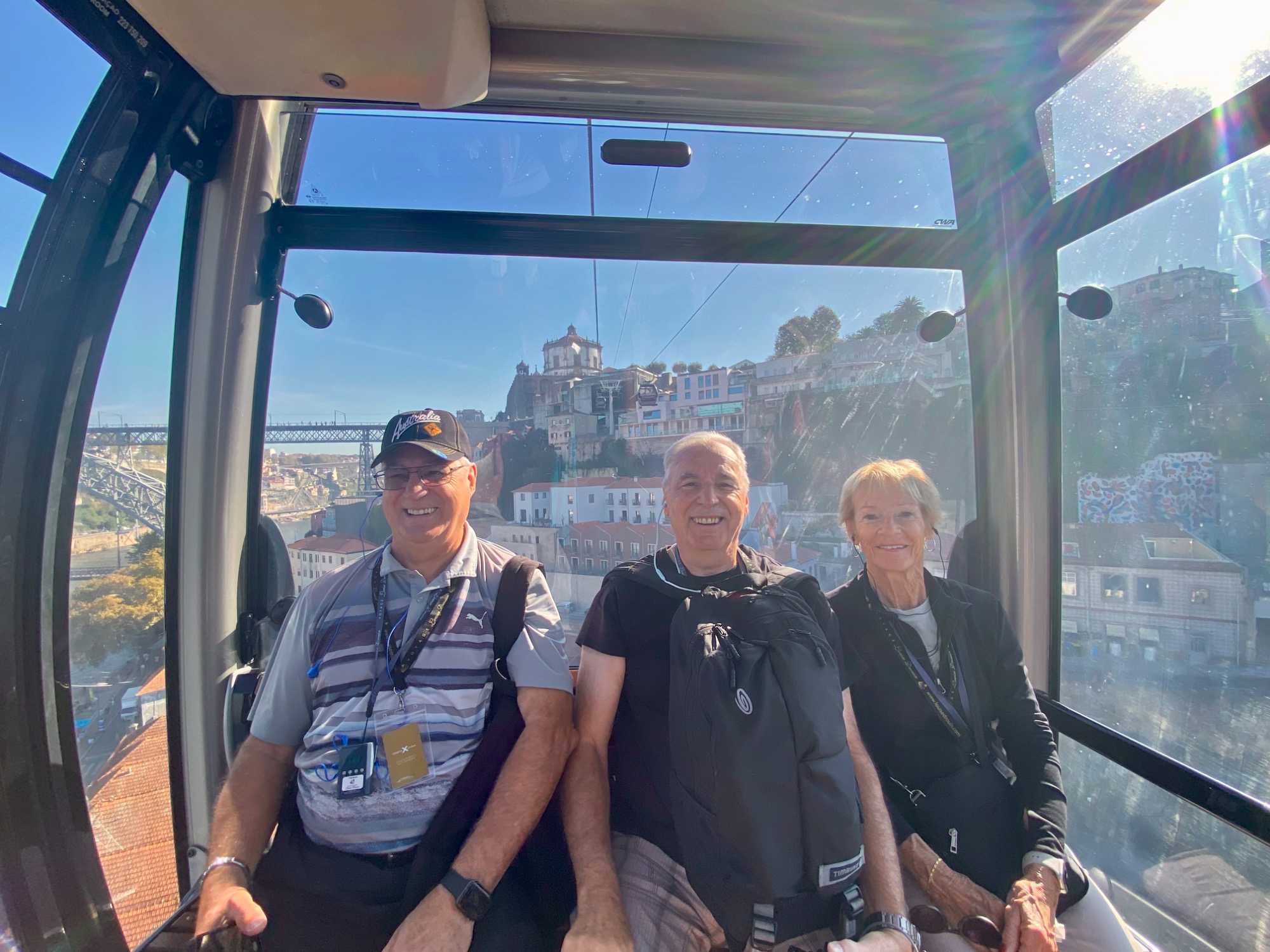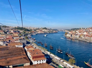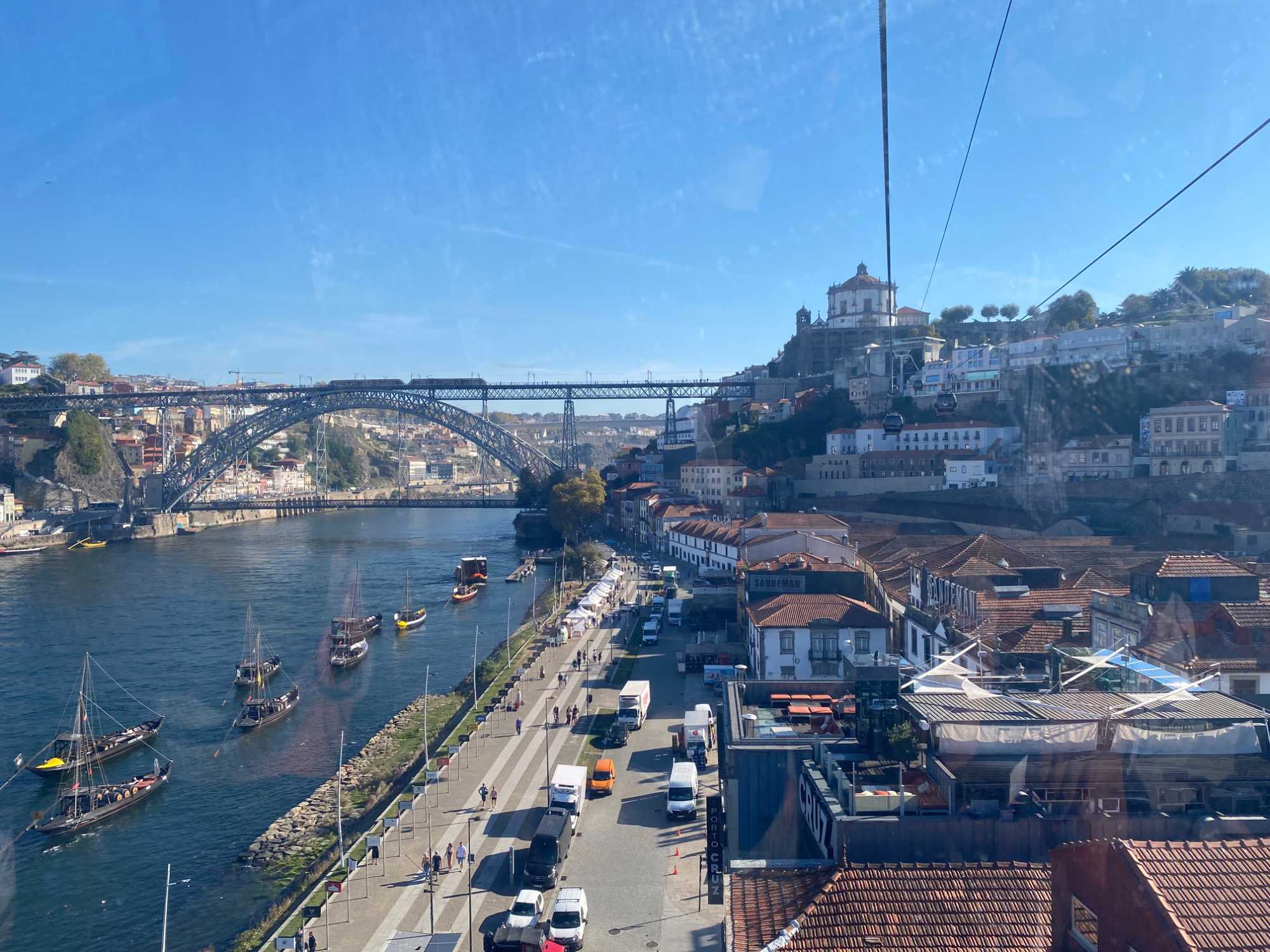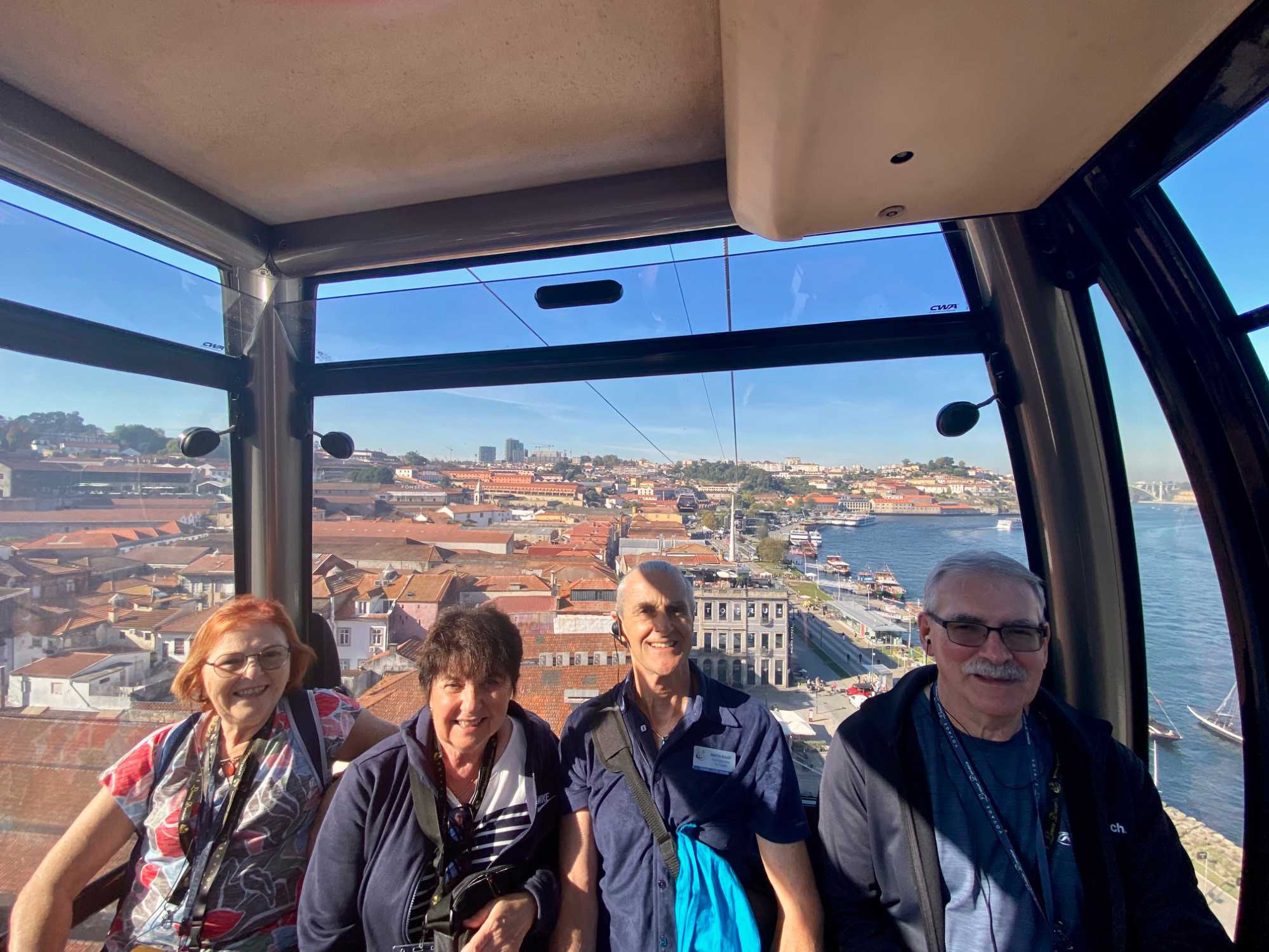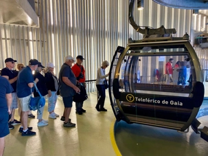 Nous avons ensuite traversé le pont Dom Luís I, chef-d’œuvre de l’ingénieur Théophile Seyrig, ancien collaborateur de Gustave Eiffel. Sa structure métallique à deux niveaux est impressionnante et offre une vue spectaculaire sur le fleuve et les toits colorés de Porto — un panorama digne d’une carte postale que plusieurs ont immortalisé en photo. De l’autre côté du Douro, à Vila Nova de Gaia, nous avons emprunté le Teleférico de Gaia, un parcours d’environ 600 mètres suspendu à près de 60 mètres de hauteur. La vue y était à couper le souffle, bien que certains voyageurs aient préféré garder les yeux rivés au plancher plutôt que d’admirer le paysage à l’extérieur! 🚡