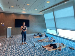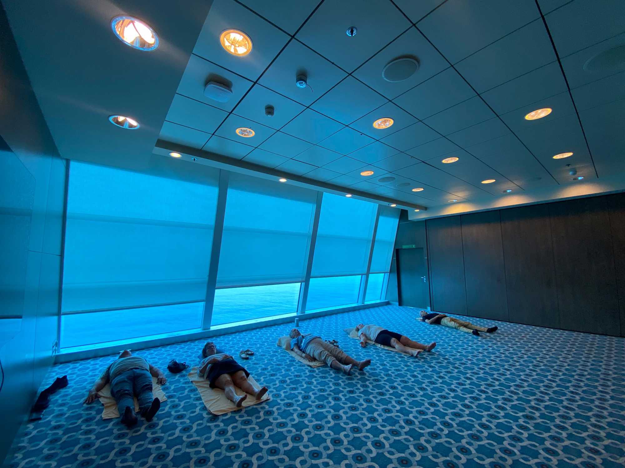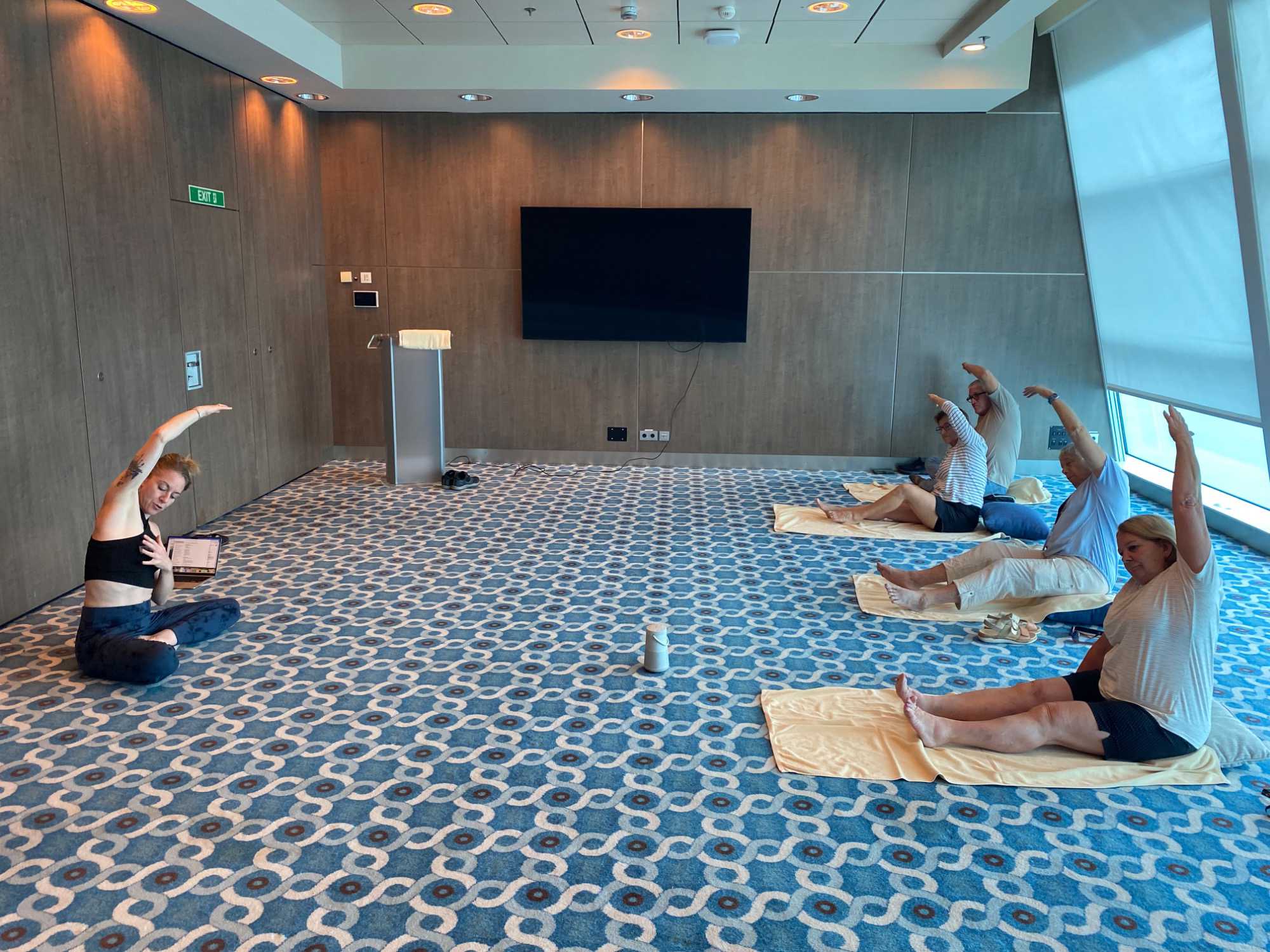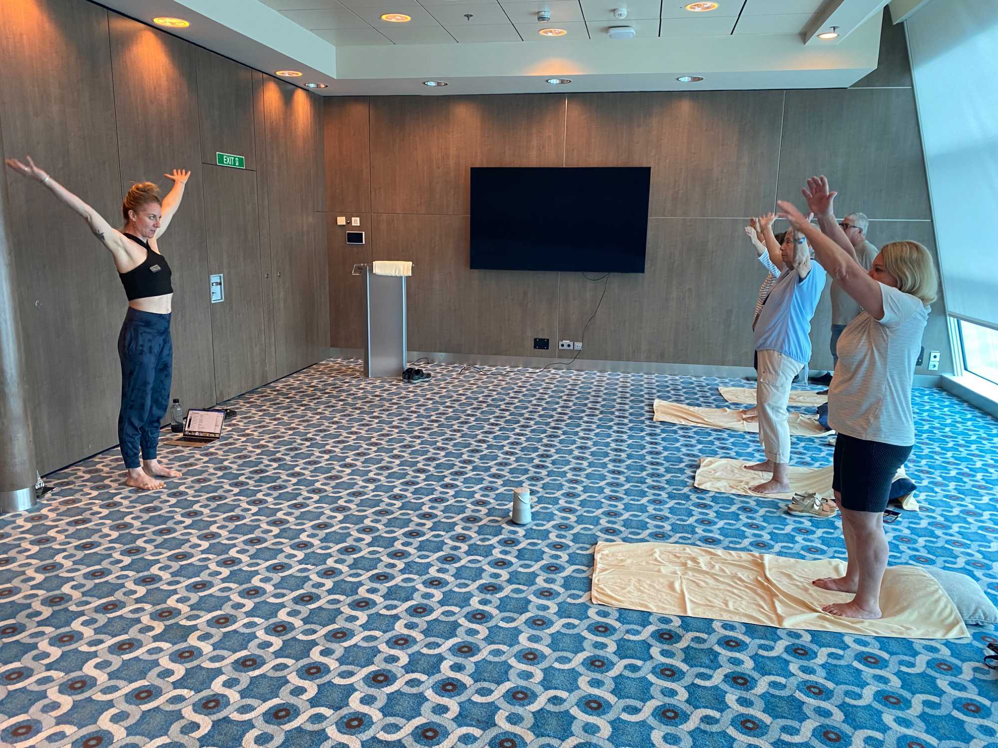 En fin d’après-midi, Juliane offre un deuxième atelier de bien-être au groupe. Quelques voyageurs se joignent à elle pour s’offrir un moment de reconnexion à soi. Au programme: quelques étirements doux pour activer le corps, de la respiration consciente pour apaiser le système nerveux et une touche de méditation pour calmer l’esprit. Pendant la séance, Juliane a même aperçu des dauphins bondissant près du navire, pendant que les participants méditaient les yeux fermés — un joli clin d’œil de la nature! 🐬