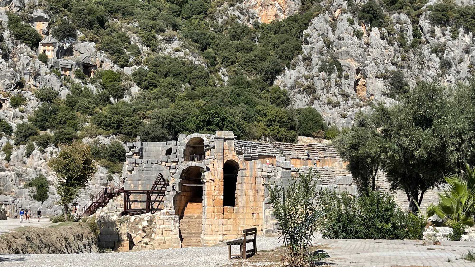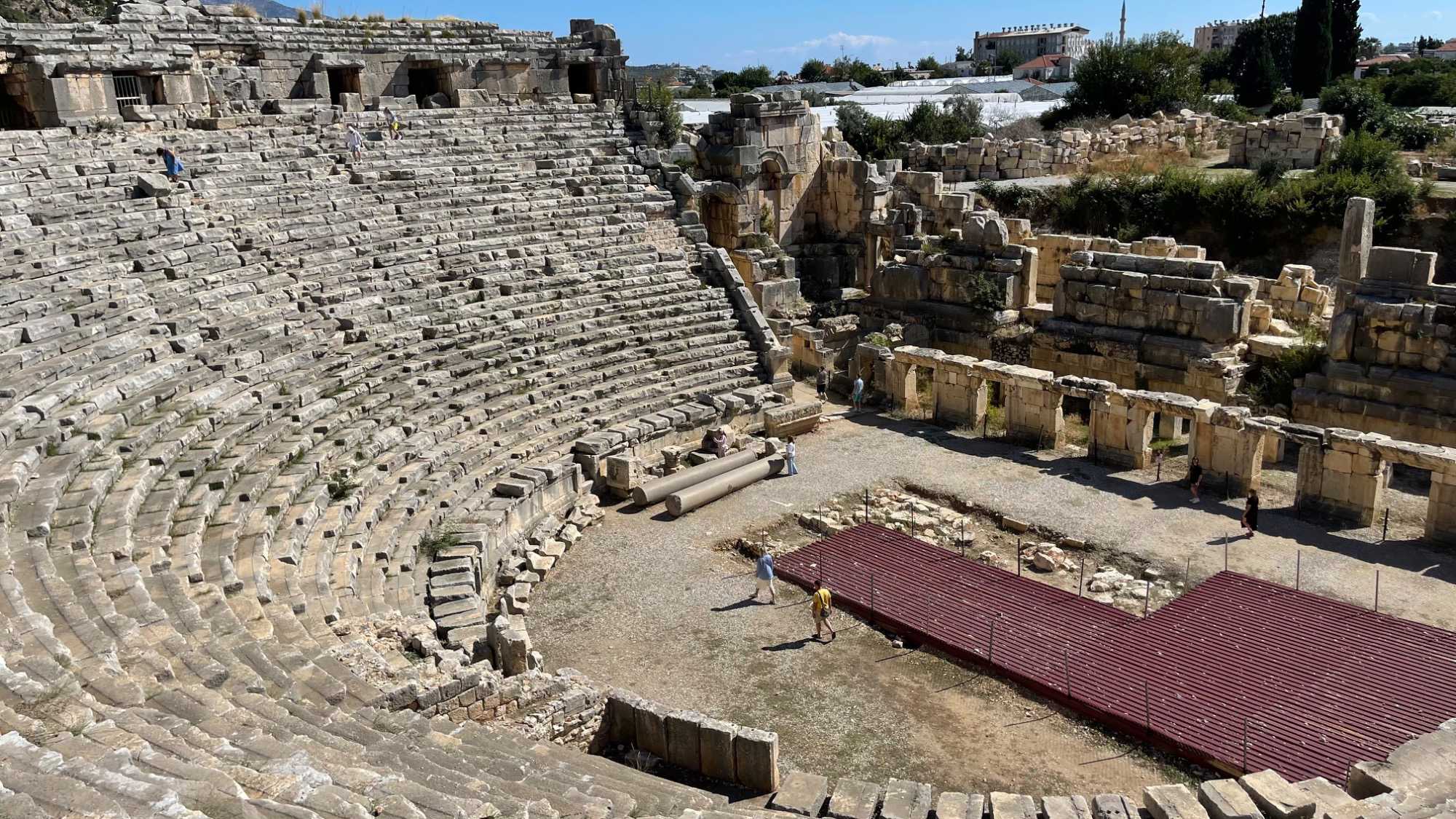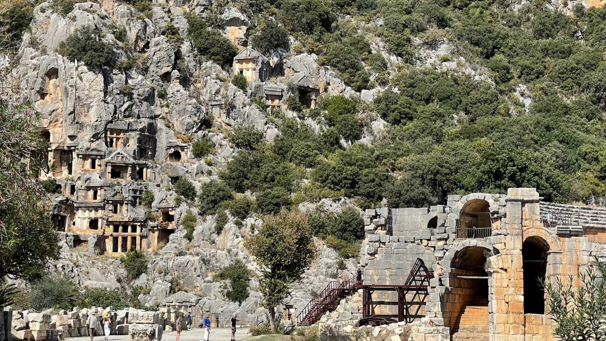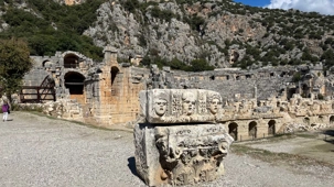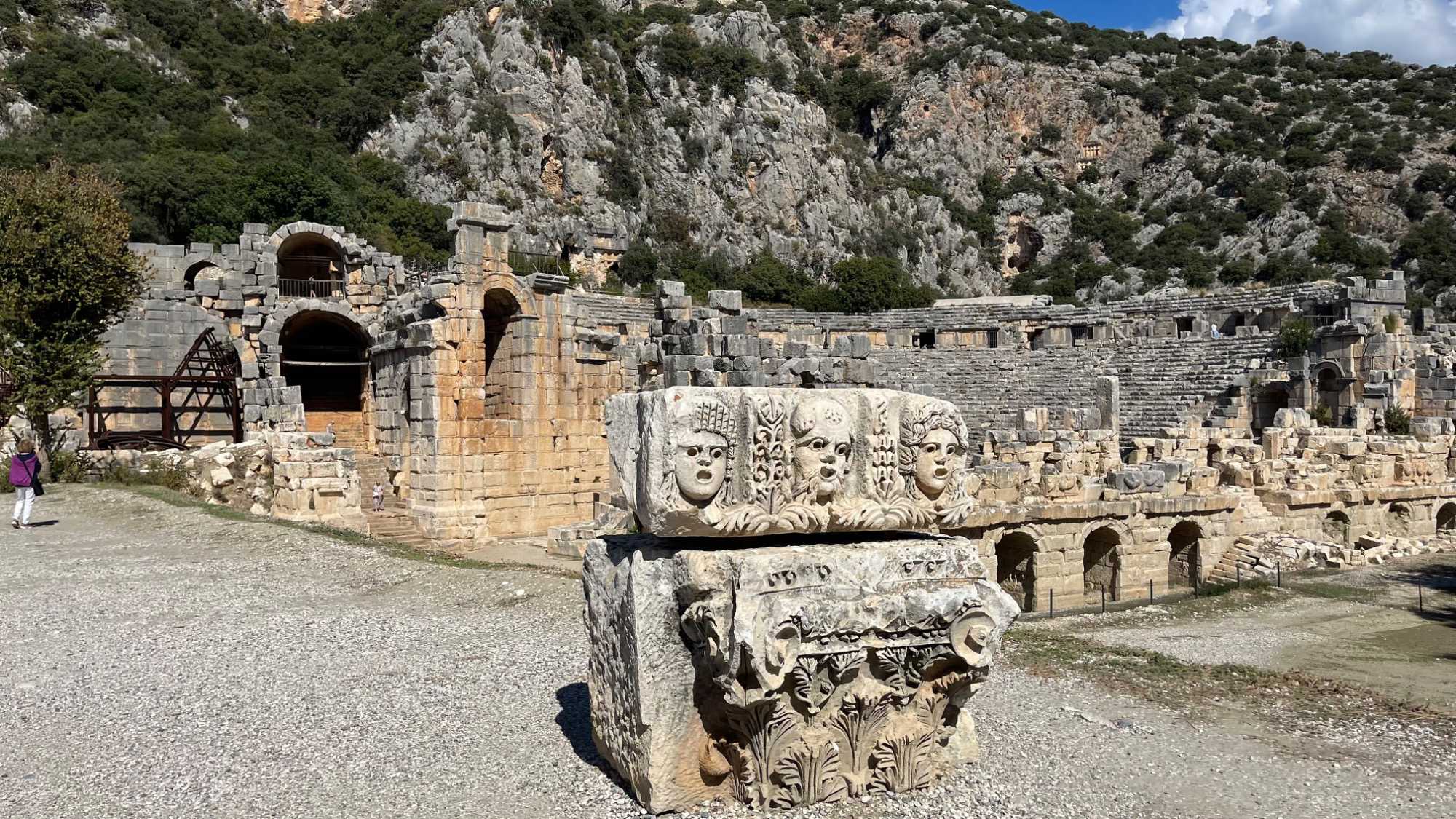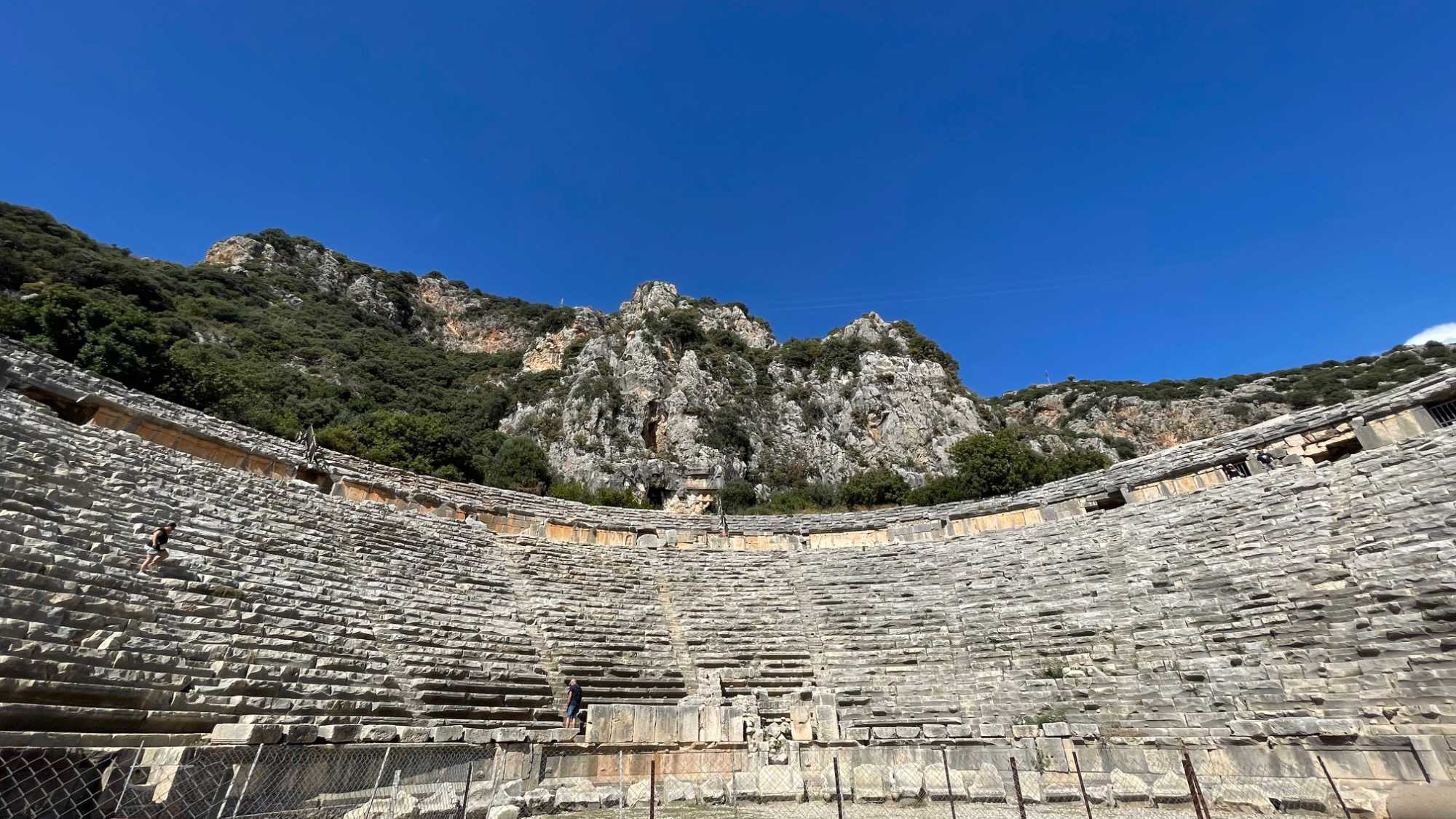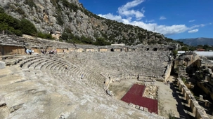 Les ruines du plus grand théâtre de Lycie subsistent encore aujourd'hui, ce qui en fait le théâtre le mieux préservé, avec ses 29 rangées de sièges et sa capacité de 9 000 à 10 000 spectateurs, le théâtre est adossé à une colline. Aujourd'hui encore, il accueille occasionnellement des festivals et des pièces de théâtre. Le théâtre, qui est divisé en métropoles orientale et occidentale, fut construit sur la colline rocheuse. Aussi, la métropole abrite d'importants exemples de différents types de tombes lyciennes. Les tombes étaient creusées dans la roche et décorées de bas-reliefs et d'inscriptions. On observe et on se demande comment ils ont bien pu effectuer un travail aussi précis! Aujourd’hui nous avons les outils nécessaires mais au 5e siècle!