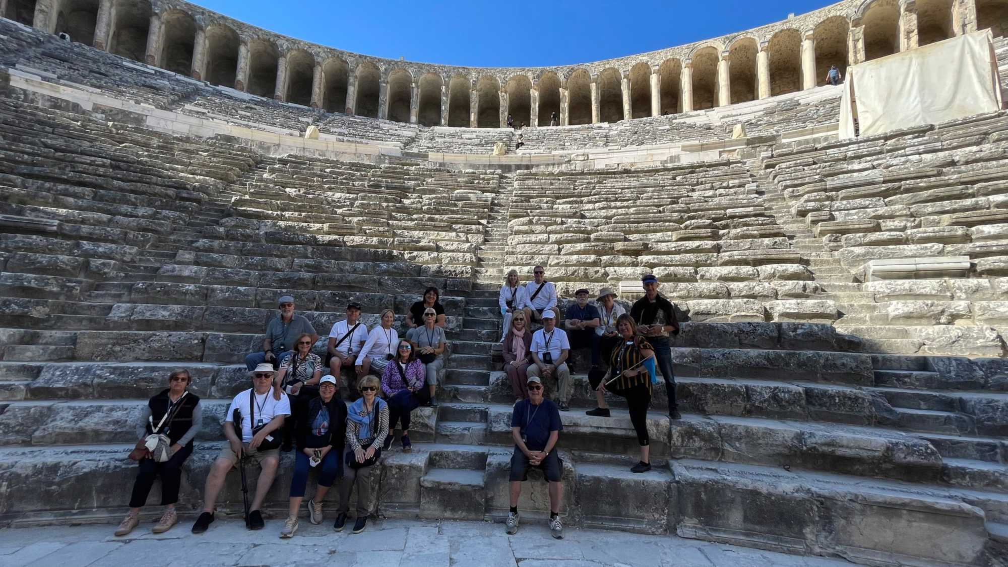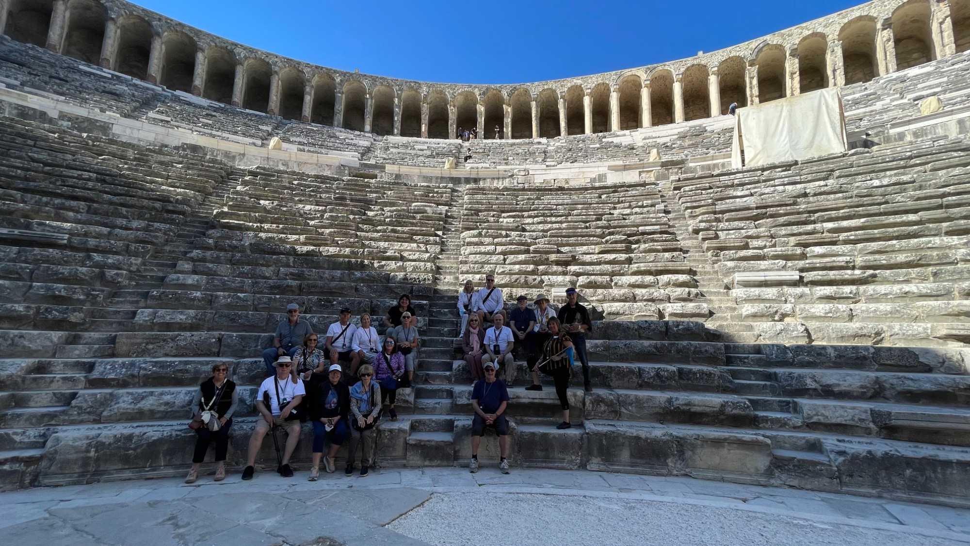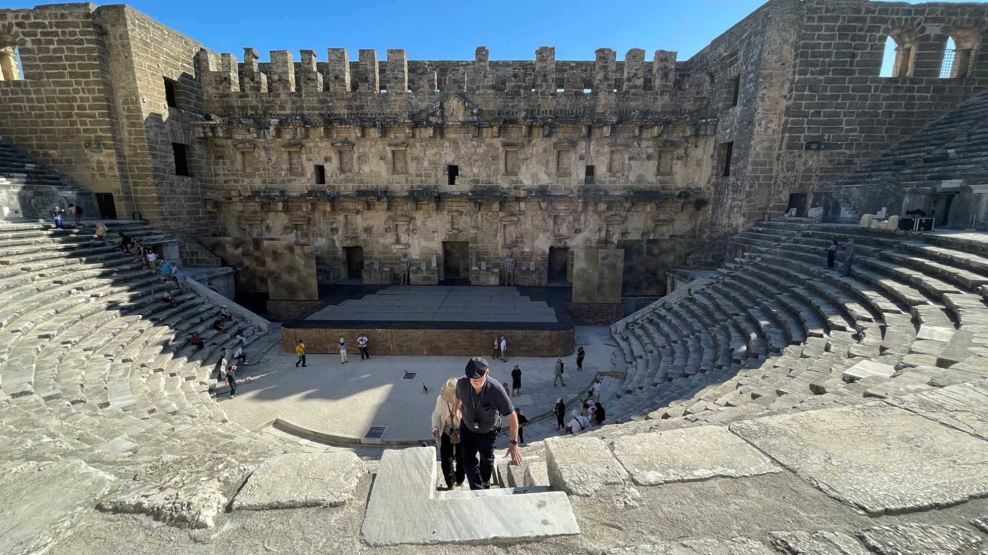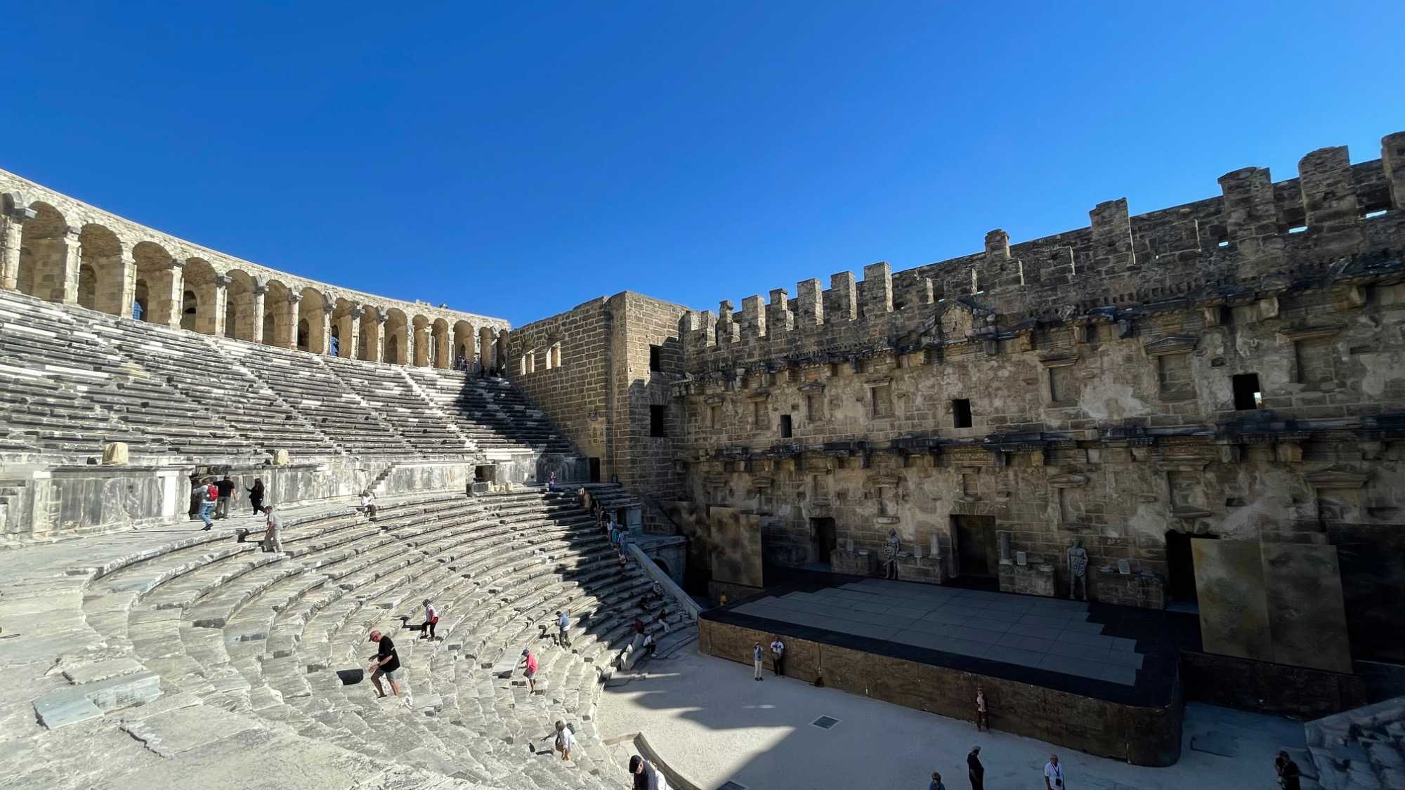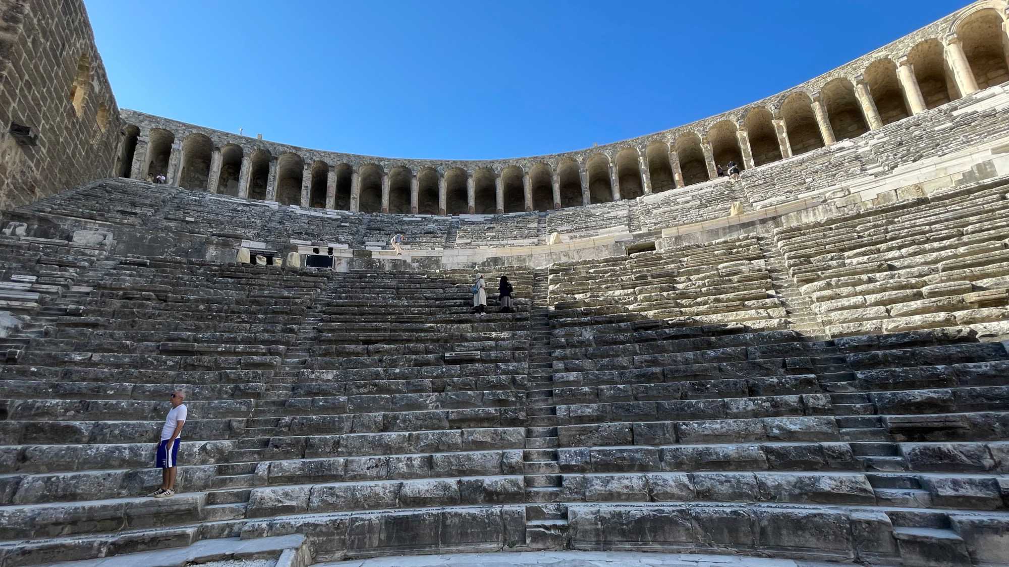 Arrêt à Aspendos, ancienne cité gréco-romaine situé à 45 km d’Antalya. Elle se distingue par son théâtre romain le mieux conservé de toute l'Asie Mineure, dans lequel tous les étés des spectacles sont organisés. Dans l’Antiquité, le théâtre d’Aspendos pouvait accueillir environ 12 000 spectateurs. La ville fut fondée, selon la tradition antique, à l'époque préhellénique (XIIe siècle avant J.-C). Dalida a donné son dernier concert dans ce théâtre, le 28 avril 1987. Nous sommes sous le charme dans ce théâtre bâtit il y a des siècles.