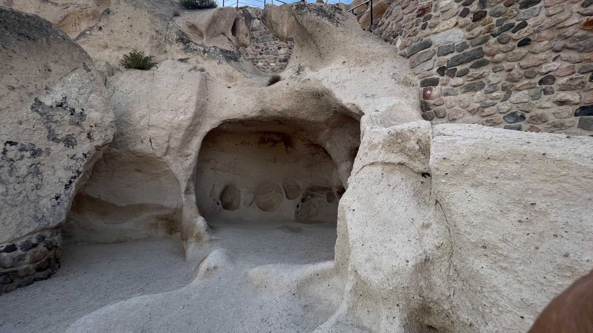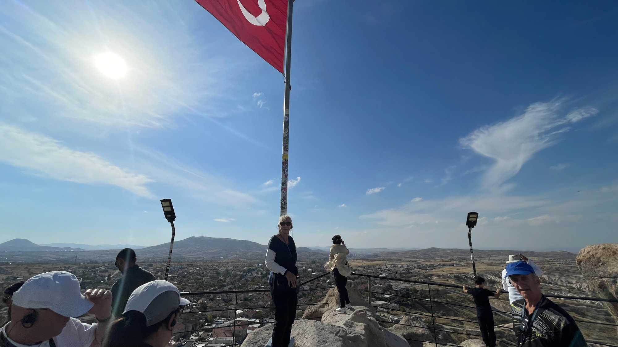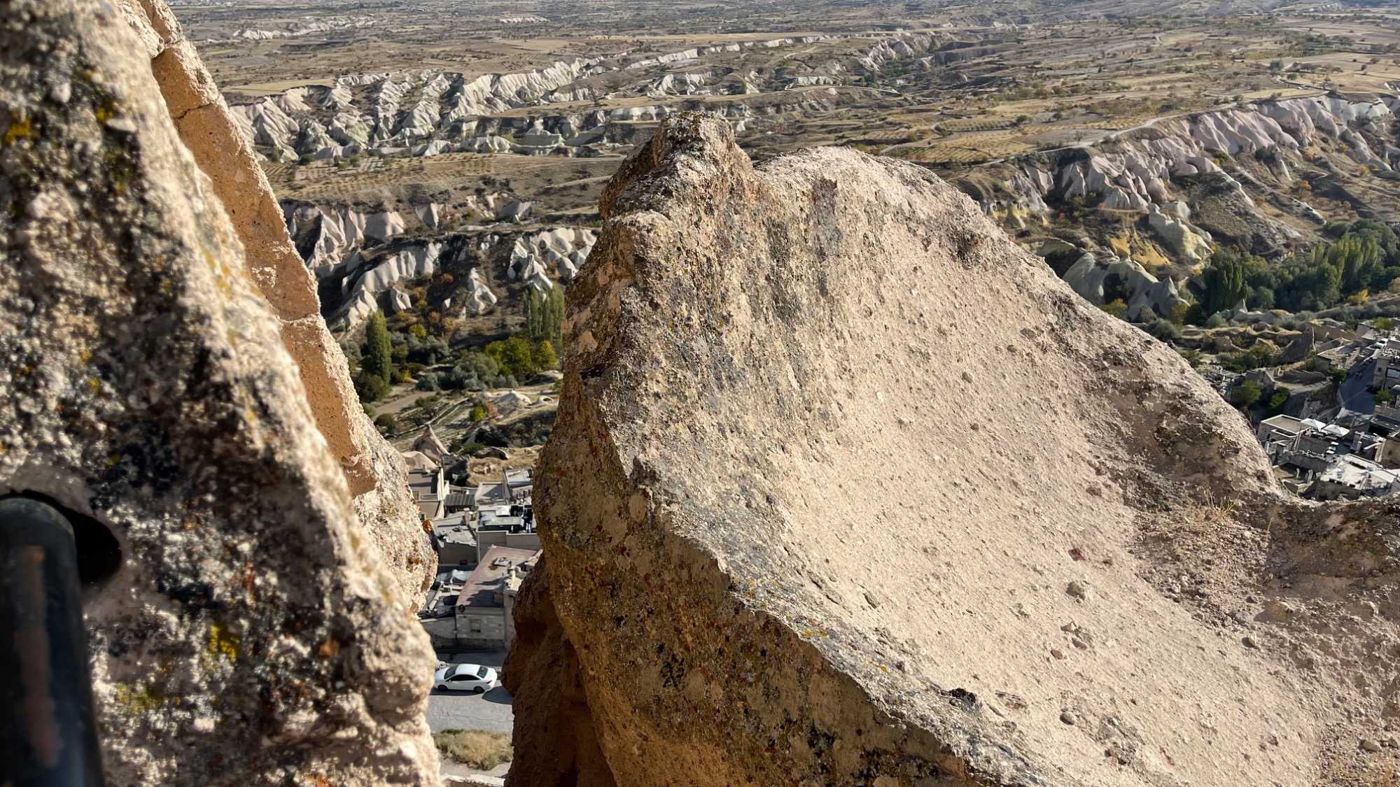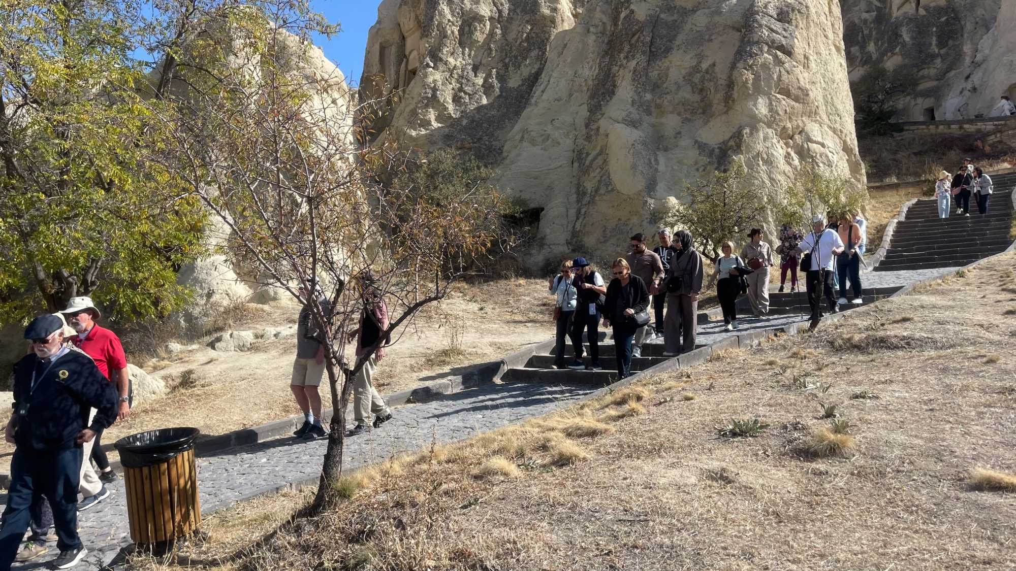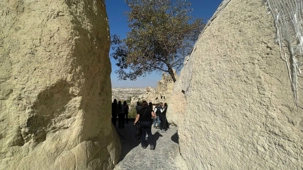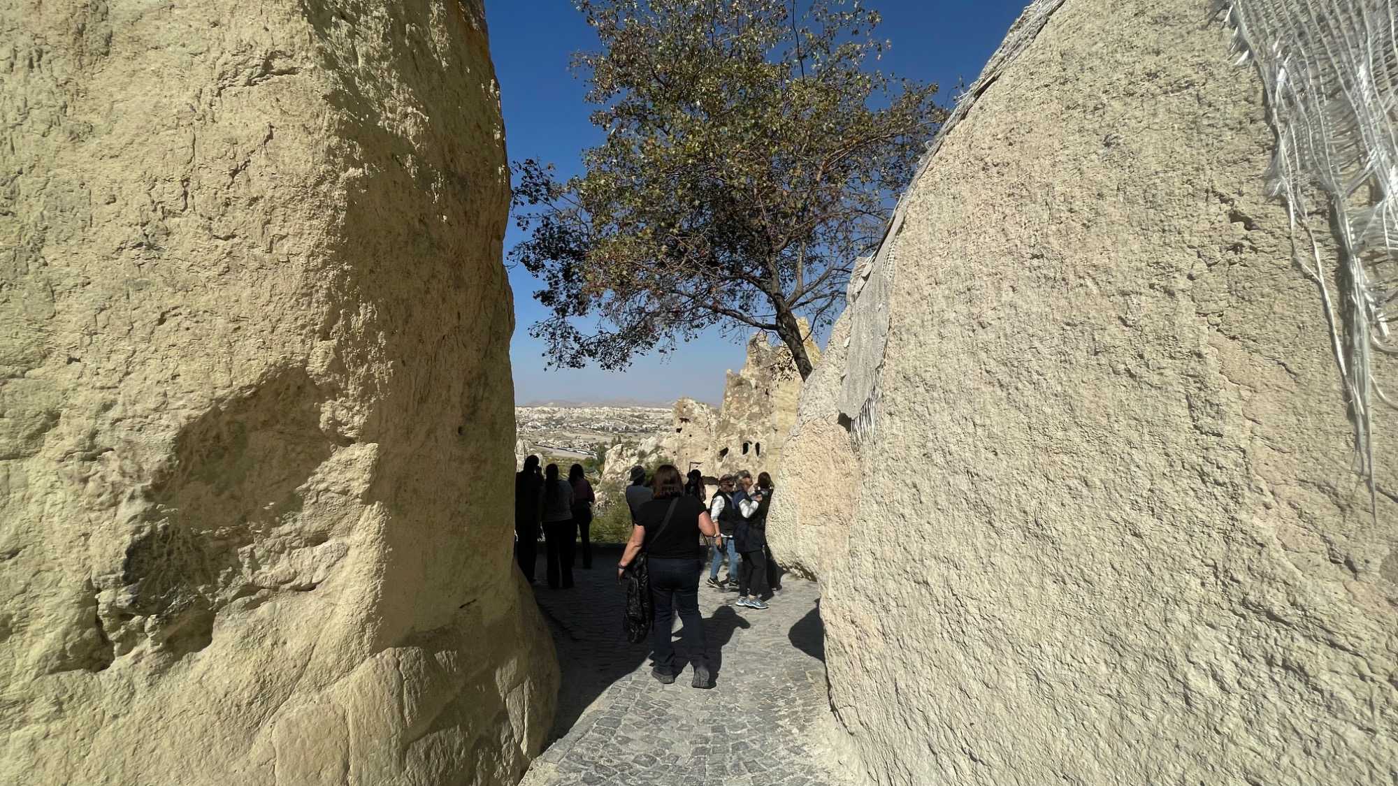 Puis nous visitons le château de la ville situé à quelques minutes à pied. Uçhisar signifie « citadelle extérieure » en turc et fait référence à l'énorme cône rocheux qui constitue son élément central. Quelques braves sont montés en haut de la colline, 60 mètres de haut -, 275 marches- Il est sillonné de nombreux passages et salles souterrains, aujourd'hui pour la plupart bloqués ou impraticables. Ils servaient de quartiers résidentiels et, peut-être, de cloîtres à l'époque byzantine. Environ 1 000 personnes vivaient autrefois dans le château. Il n'est plus habité aujourd'hui et la vue à son sommet est magnifique.