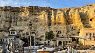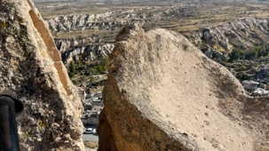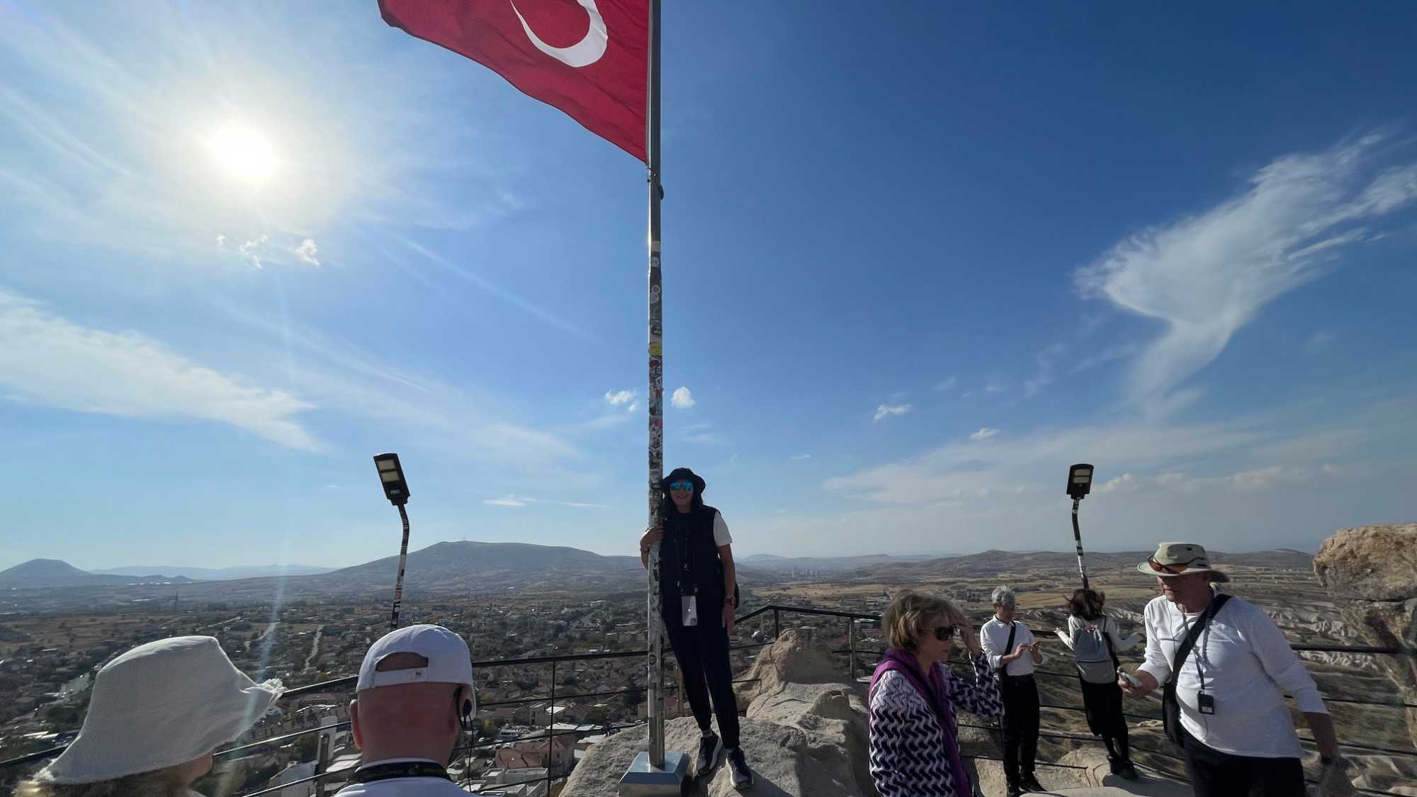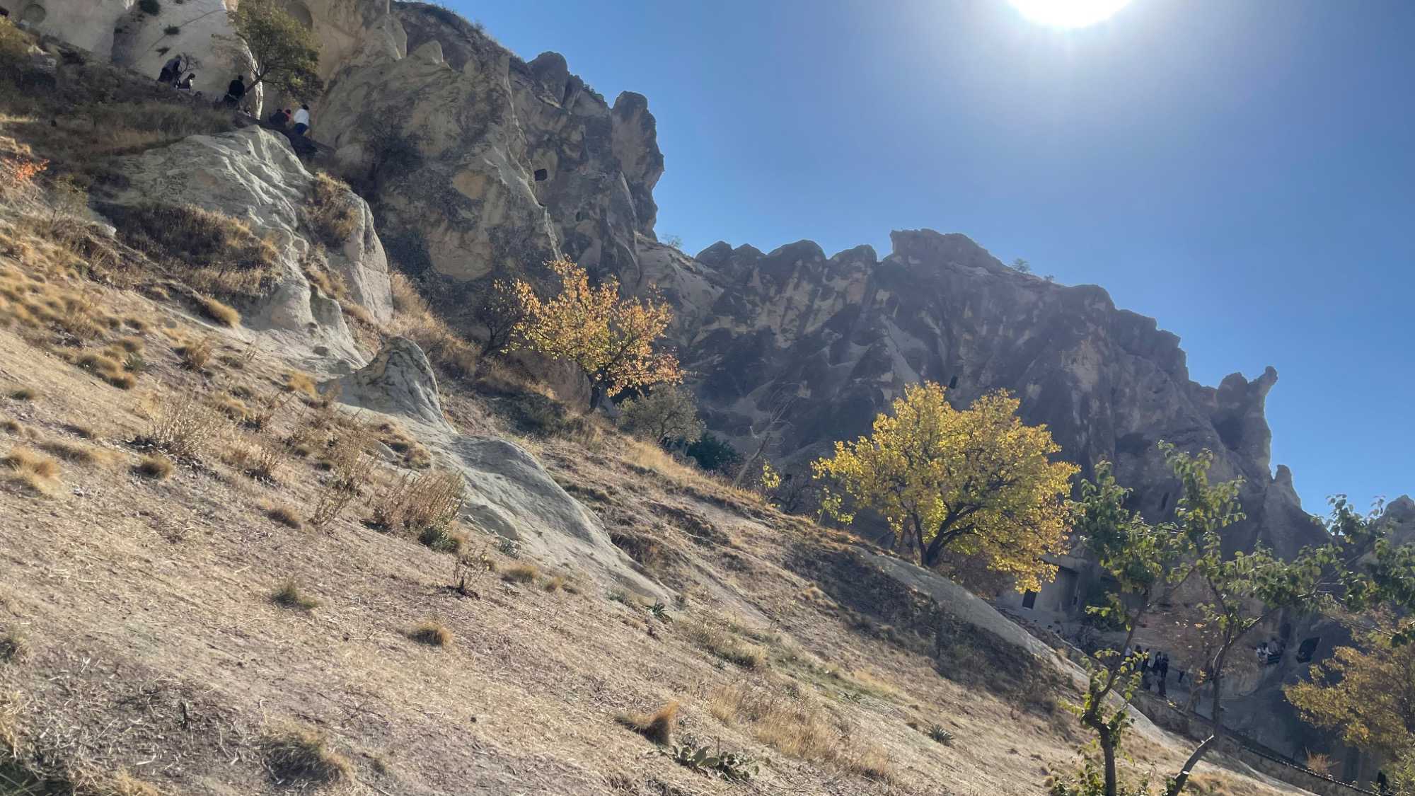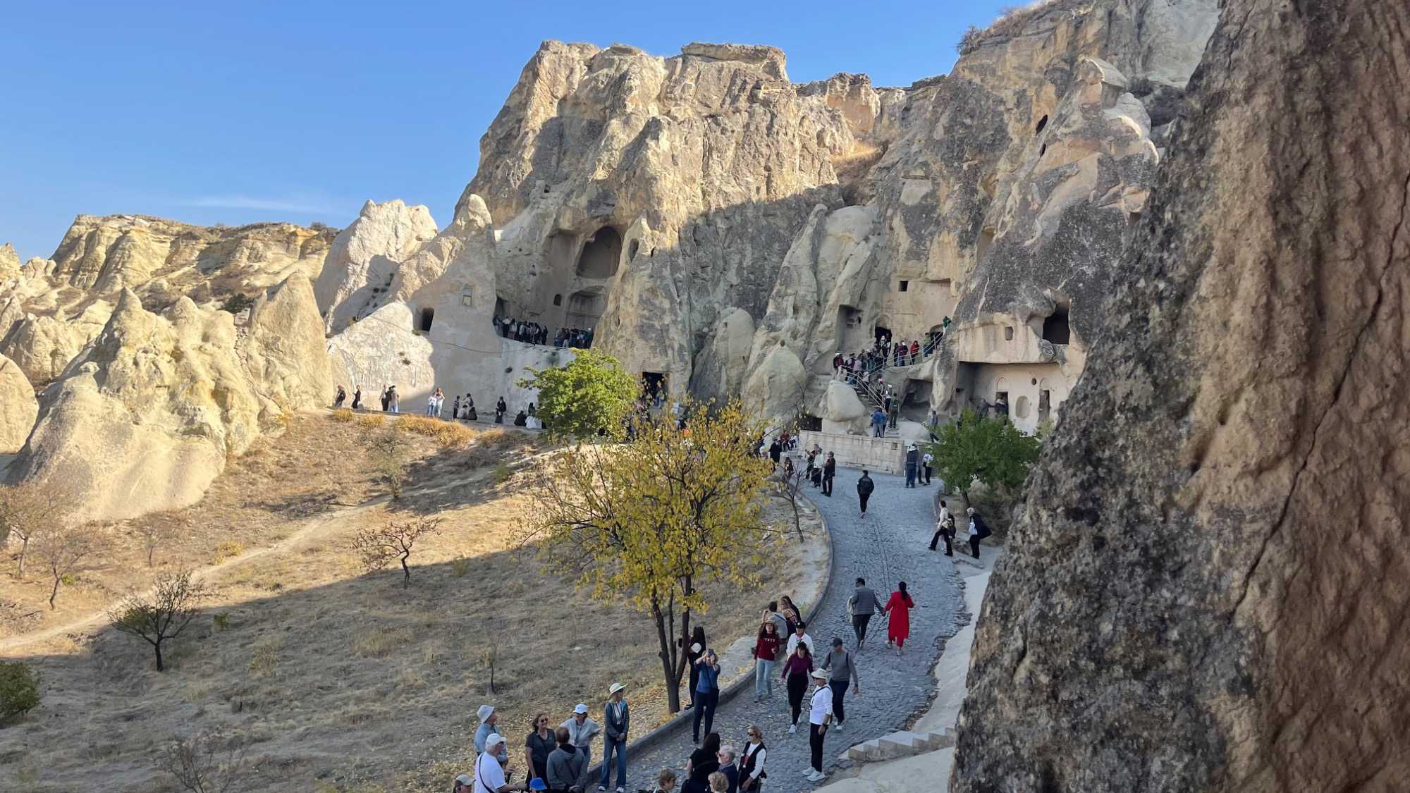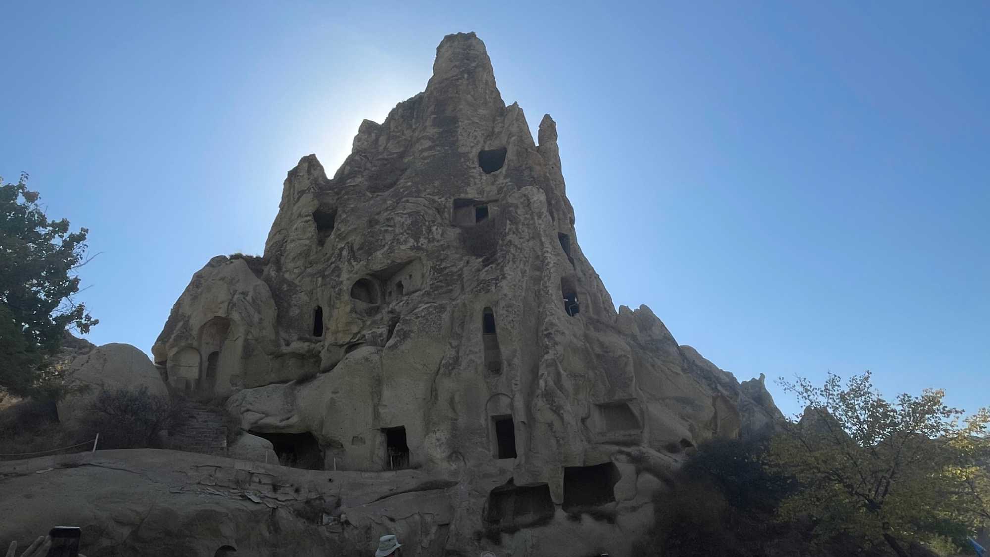 Puis nous visitons le château de la ville situé à quelques minutes à pied. Uçhisar signifie « citadelle extérieure » en turc et fait référence à l'énorme cône rocheux qui constitue son élément central. Quelques braves sont montés en haut de la colline, 60 mètres de haut -, 275 marches- Il est sillonné de nombreux passages et salles souterrains, aujourd'hui pour la plupart bloqués ou impraticables. Ils servaient de quartiers résidentiels et, peut-être, de cloîtres à l'époque byzantine. Environ 1 000 personnes vivaient autrefois dans le château. Il n'est plus habité aujourd'hui et la vue à son sommet est magnifique.