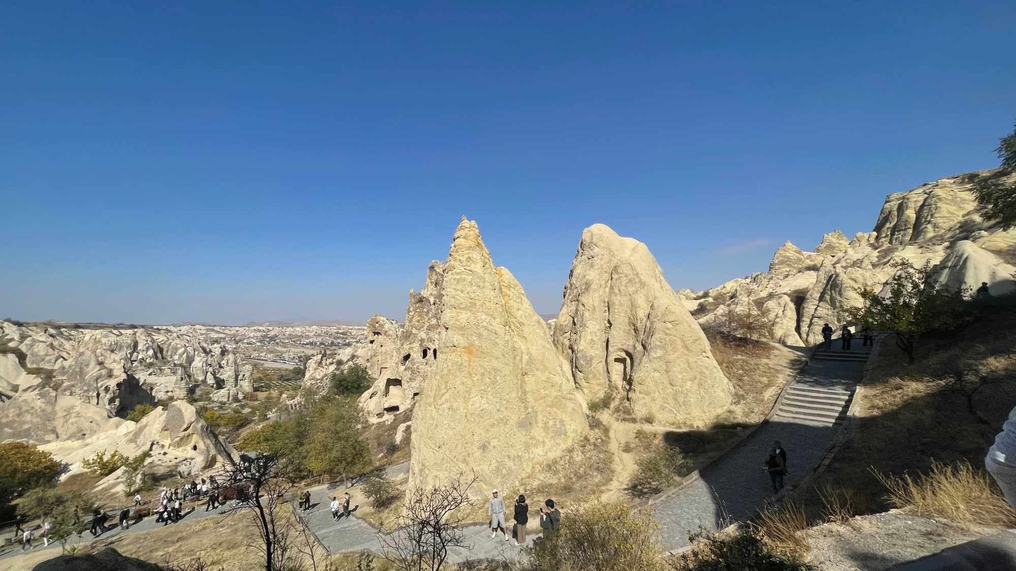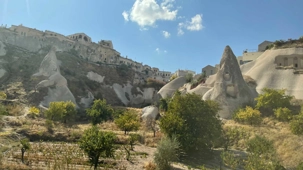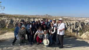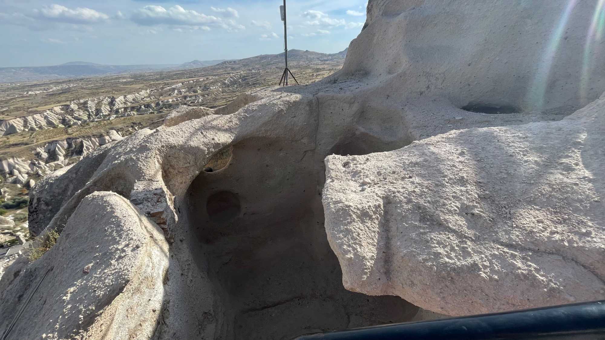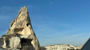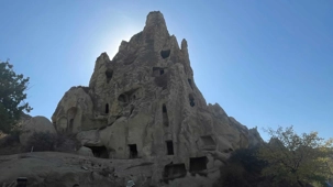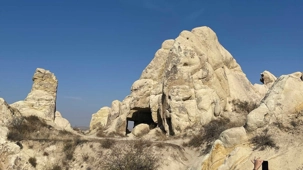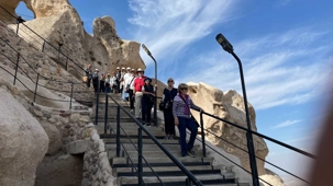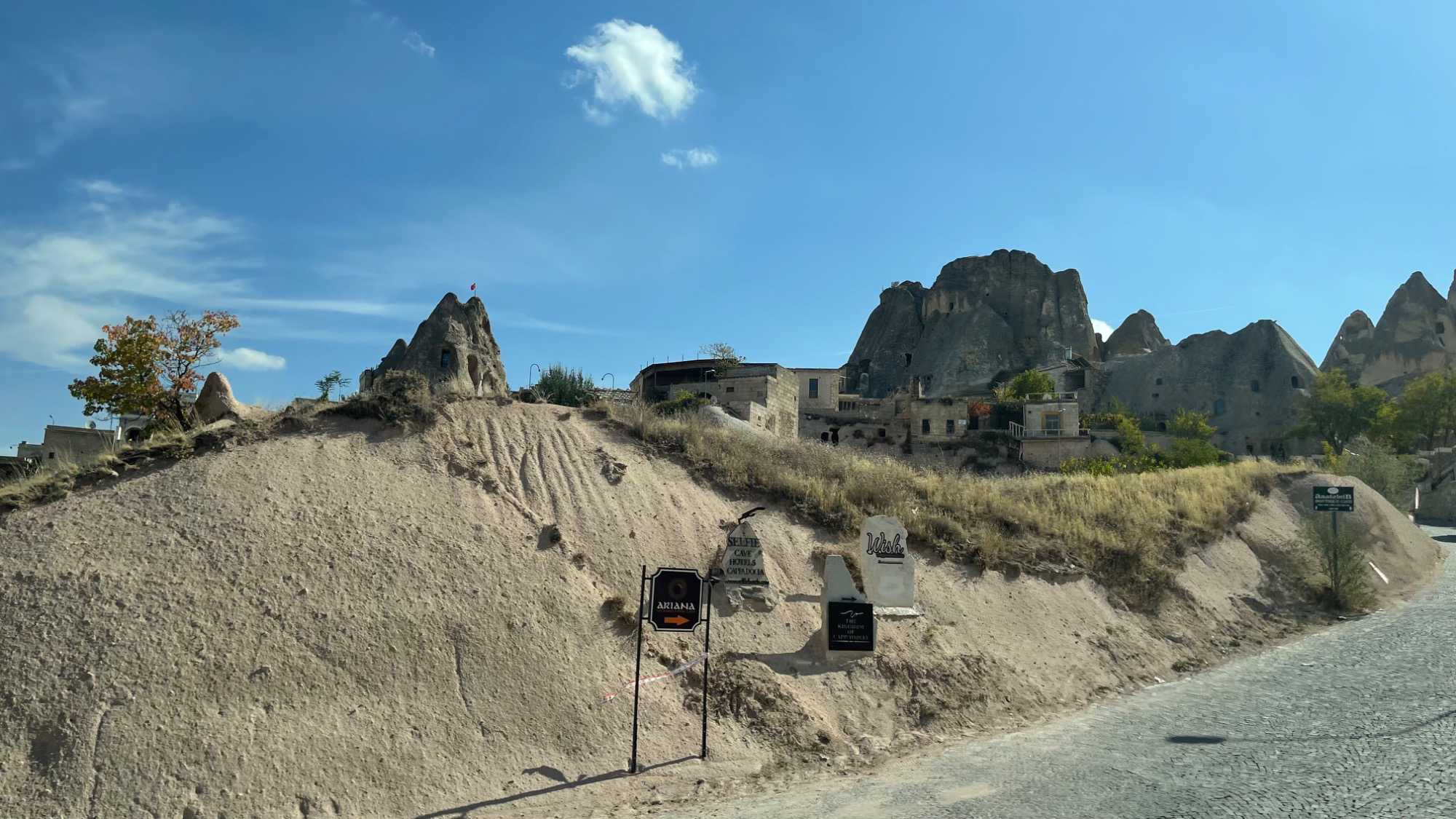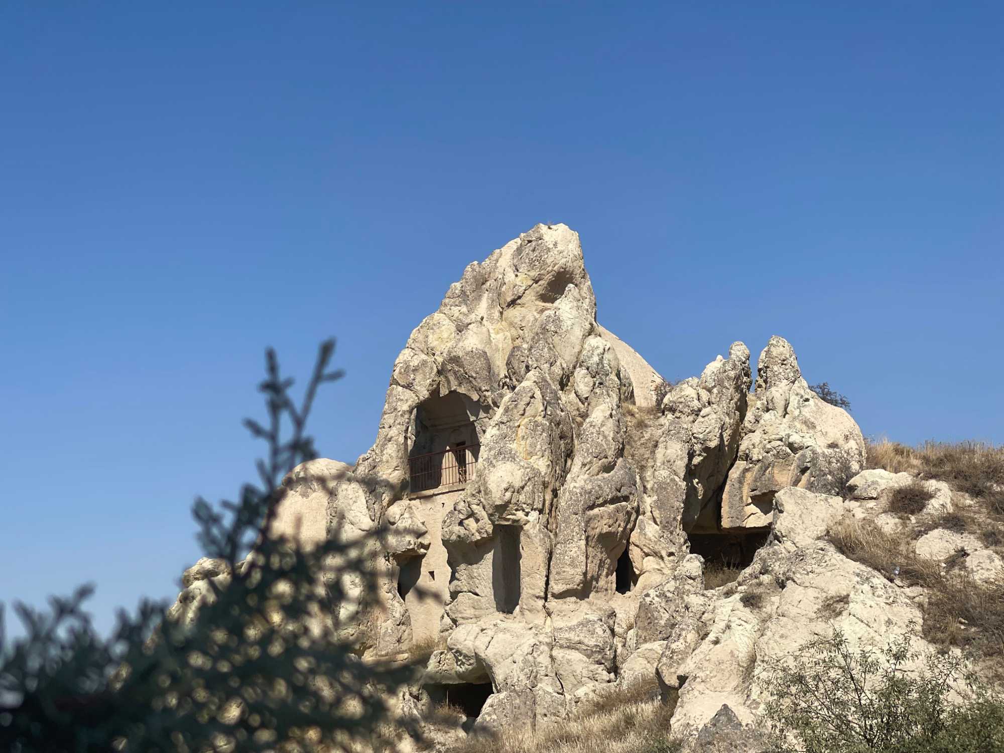 Puis nous visitons le château de la ville situé à quelques minutes à pied. Uçhisar signifie « citadelle extérieure » en turc et fait référence à l'énorme cône rocheux qui constitue son élément central. Quelques braves sont montés en haut de la colline, 60 mètres de haut -, 275 marches- Il est sillonné de nombreux passages et salles souterrains, aujourd'hui pour la plupart bloqués ou impraticables. Ils servaient de quartiers résidentiels et, peut-être, de cloîtres à l'époque byzantine. Environ 1 000 personnes vivaient autrefois dans le château. Il n'est plus habité aujourd'hui et la vue à son sommet est magnifique.
