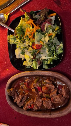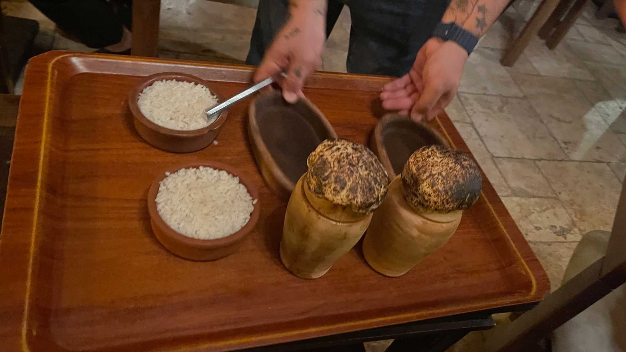 Diner dans un restaurant typique dans la ville d’Uçhisar, délicieuse soupe chaude accompagnée d’une aubergine farcie d’un délicieux mélange de bœuf et d’épices, de riz et d’un dessert local.