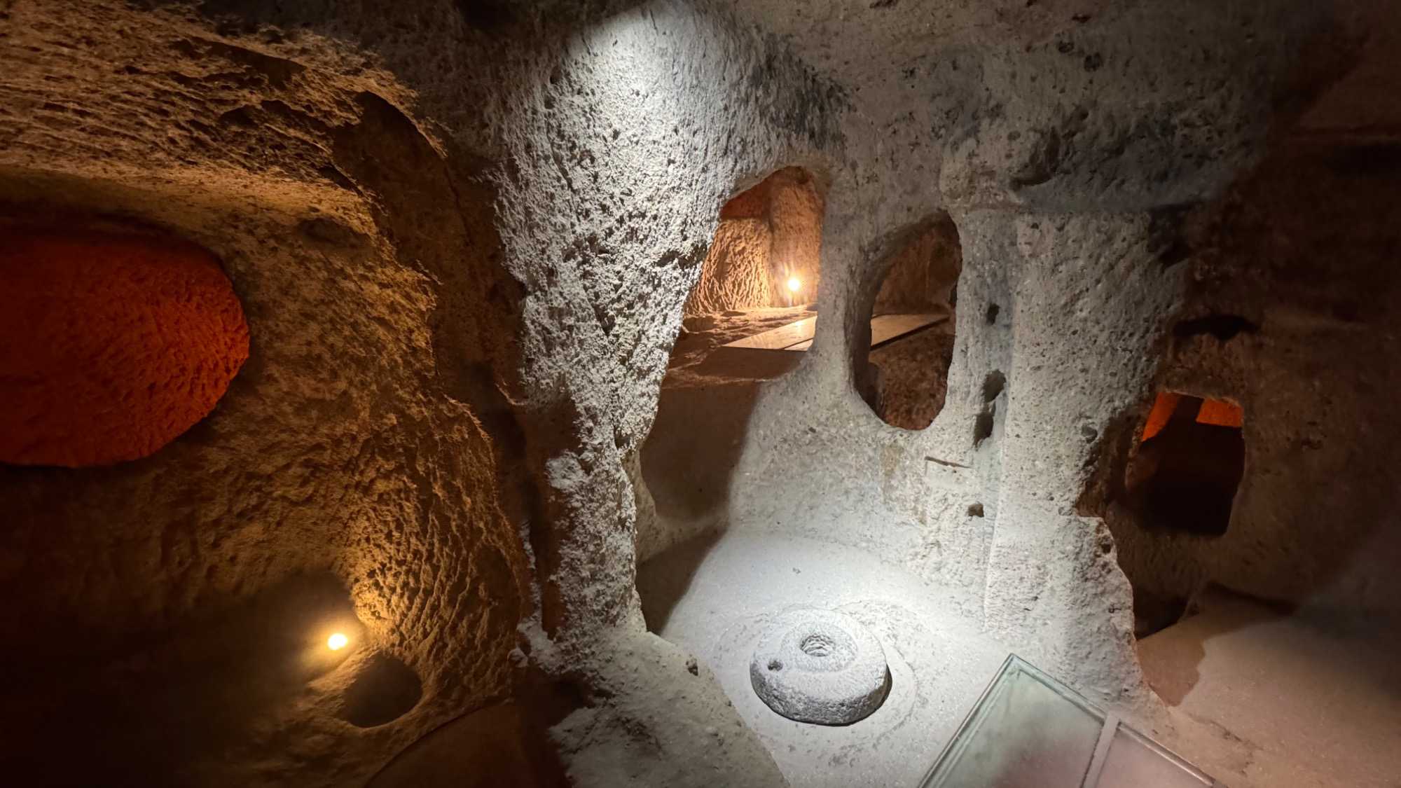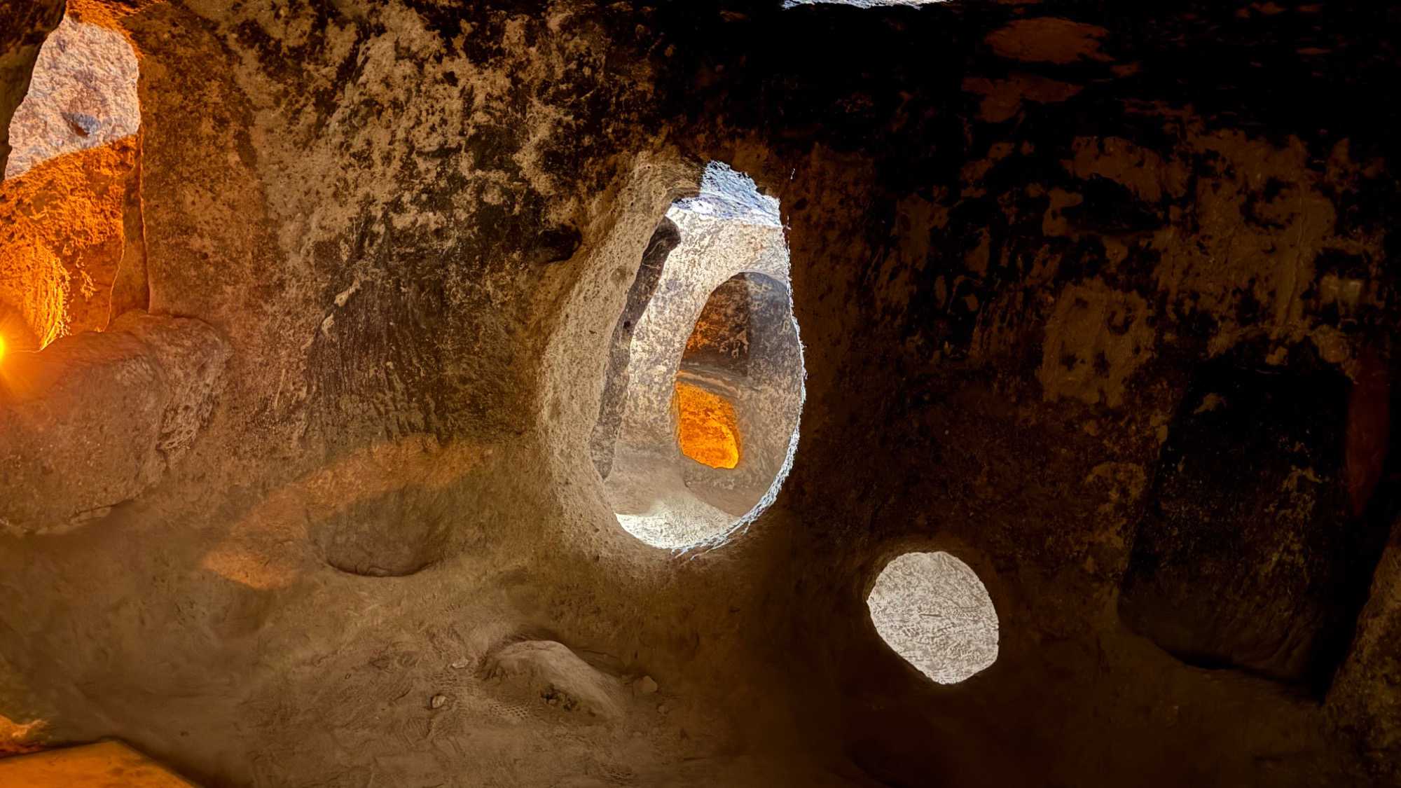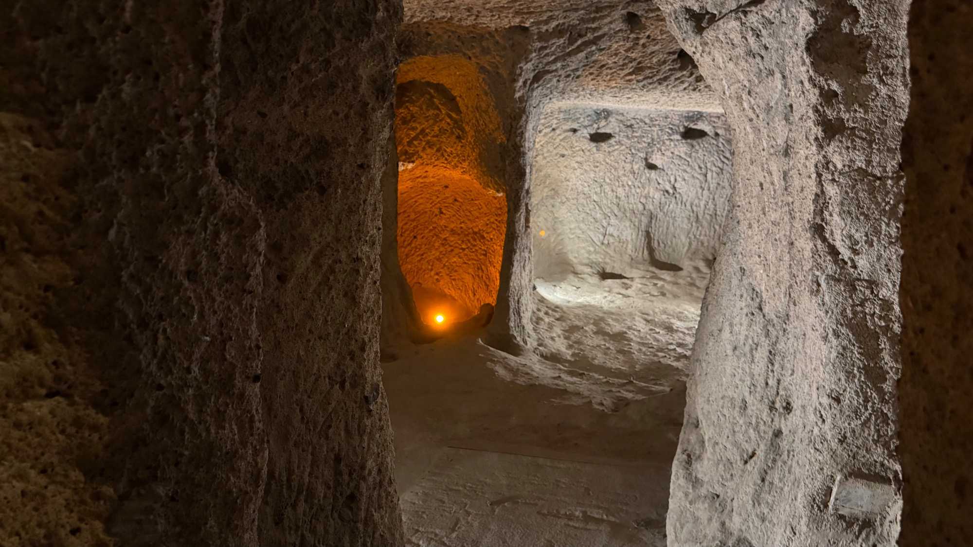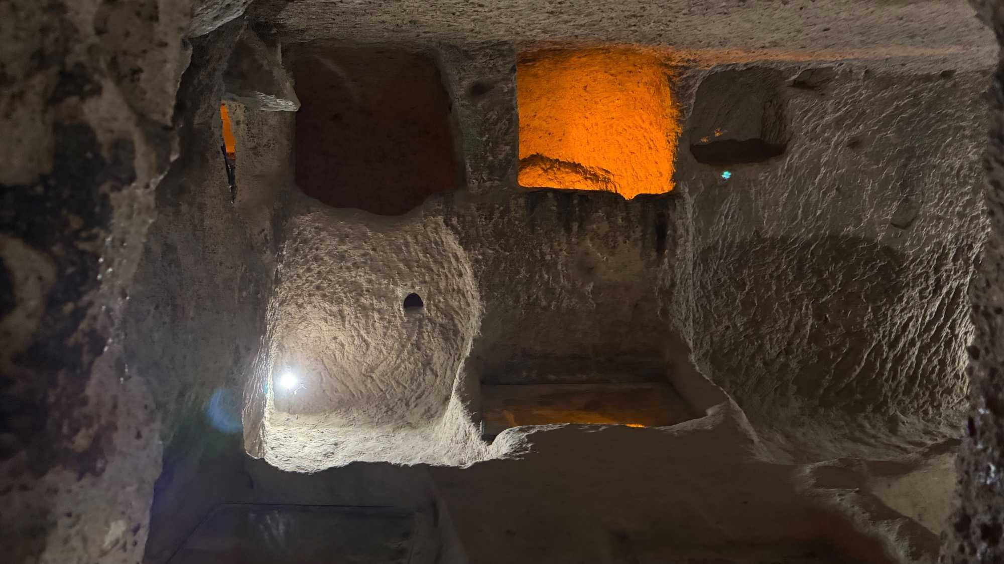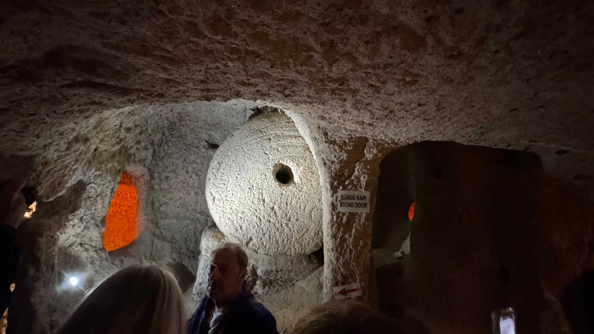 Second arrêt : la ville souterraine de Kaymakli, la plus remarquable des cinq cités souterraines ouvertes au public, sur un total de 200 sites de ce genre. Les premières excavations dans le tuf friable de la colline remontent vers 1300 av. J.-C, l'existence d'habitations souterraines dans la région est attestée par Xénophon (Ve-IVe siècles av. J.-C.). Mais cette cité, comme les autres, a été essentiellement creusée par des populations paléochrétiennes souhaitant se protéger contre des persécutions et des invasions. Huit mille chrétiens, fuyant les persécutions romaines, y auraient trouvé refuge. Plus tard, des populations s'y réfugièrent, notamment à partir du VIIe siècle. Elle a grandi au fil des siècles, comptant finalement des kilomètres de galeries. L'espace est organisé autour de cheminées d'aération. Une seule de ces cheminées dessert les pièces ouvertes au public.
