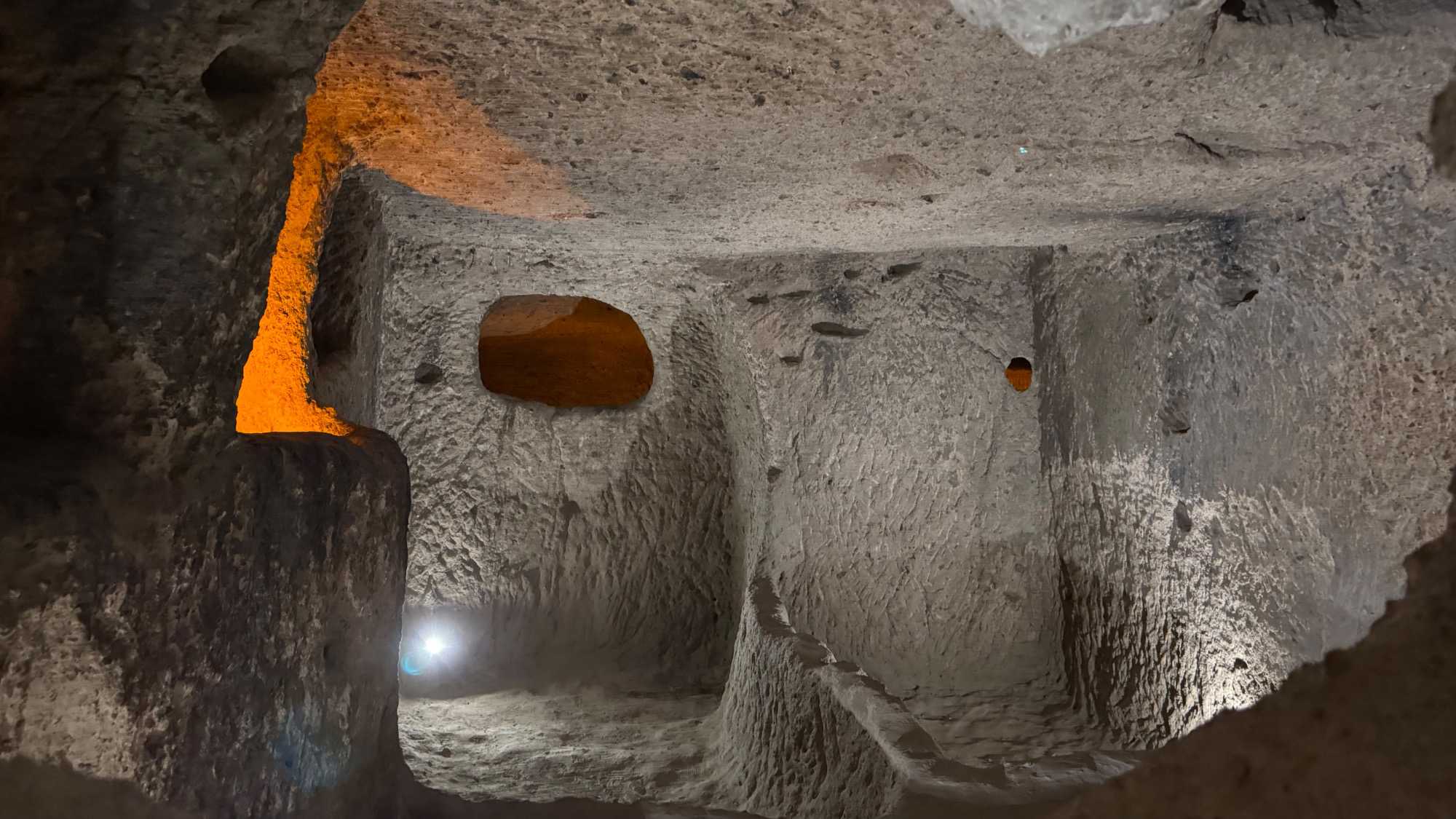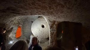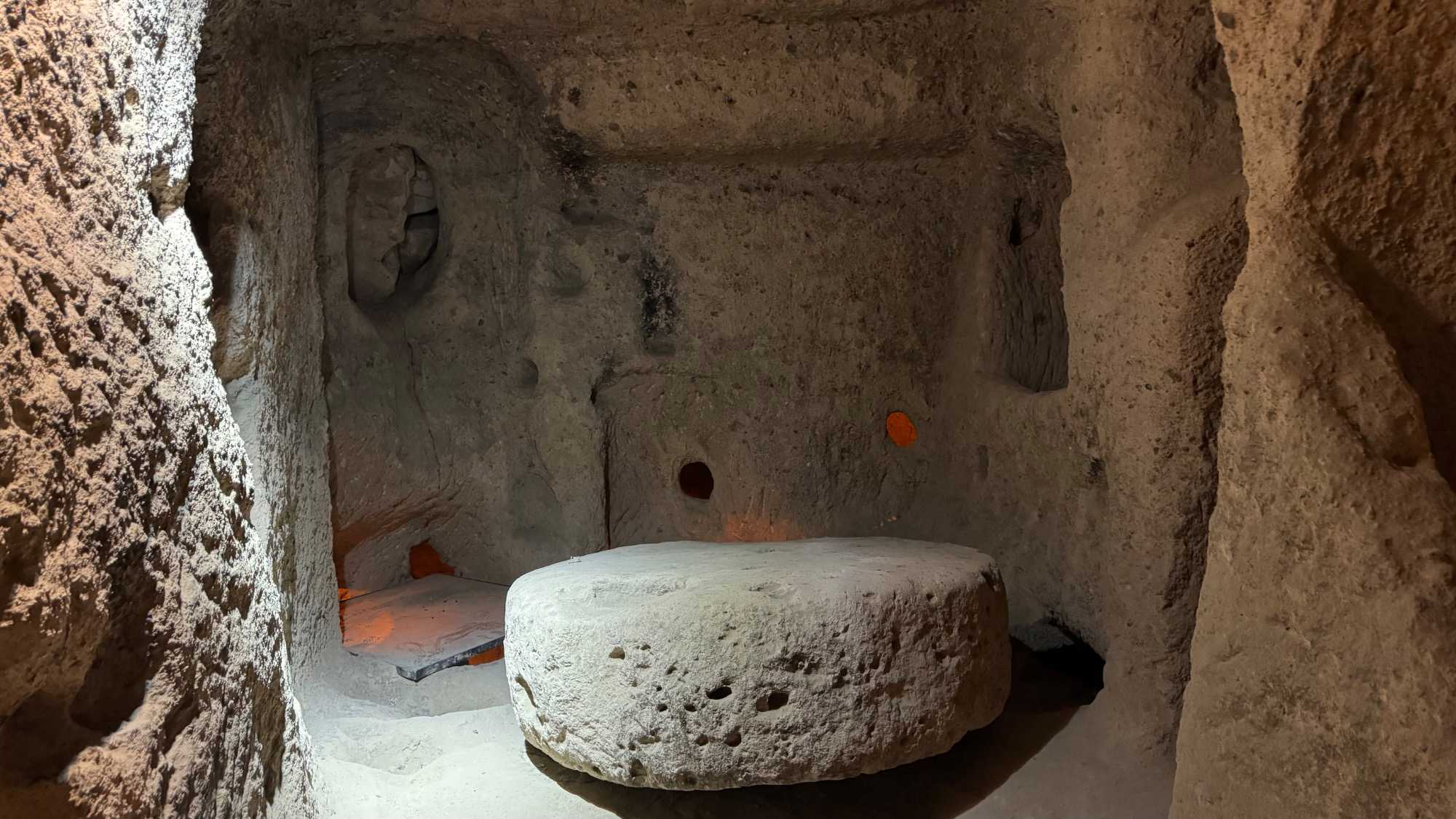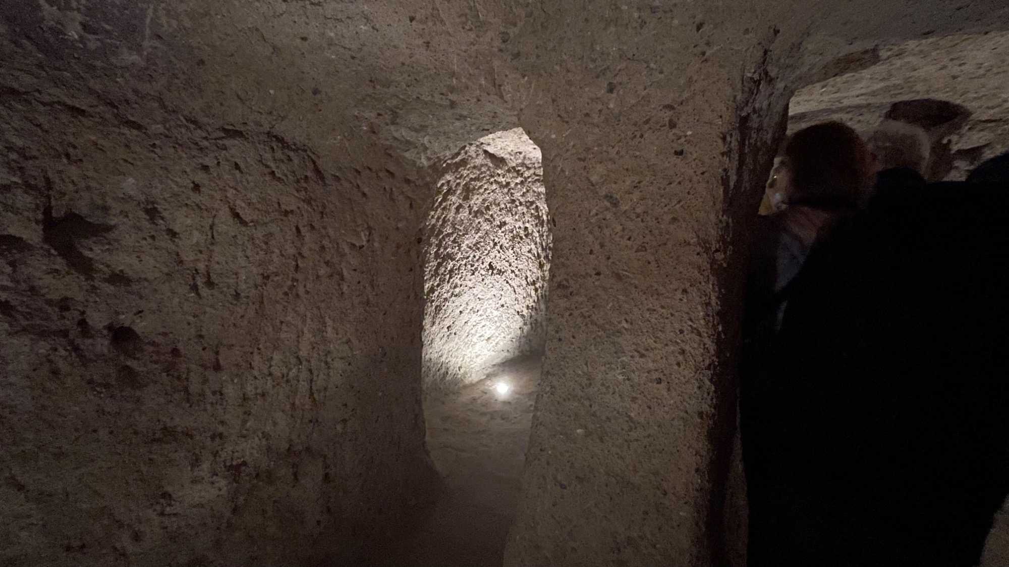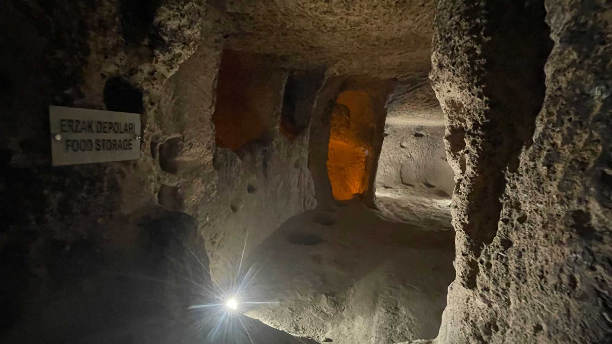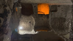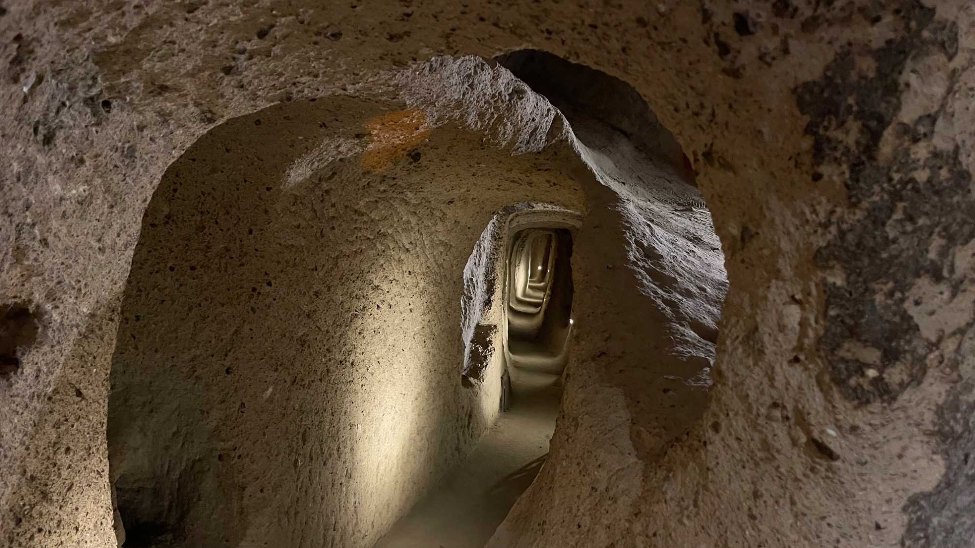 Second arrêt : la ville souterraine de Kaymakli, la plus remarquable des cinq cités souterraines ouvertes au public, sur un total de 200 sites de ce genre. Les premières excavations dans le tuf friable de la colline remontent vers 1300 av. J.-C, l'existence d'habitations souterraines dans la région est attestée par Xénophon (Ve-IVe siècles av. J.-C.). Mais cette cité, comme les autres, a été essentiellement creusée par des populations paléochrétiennes souhaitant se protéger contre des persécutions et des invasions. Huit mille chrétiens, fuyant les persécutions romaines, y auraient trouvé refuge. Plus tard, des populations s'y réfugièrent, notamment à partir du VIIe siècle. Elle a grandi au fil des siècles, comptant finalement des kilomètres de galeries. L'espace est organisé autour de cheminées d'aération. Une seule de ces cheminées dessert les pièces ouvertes au public.