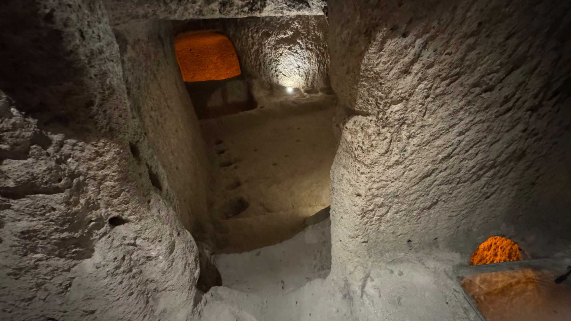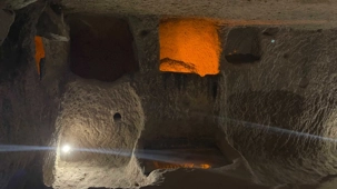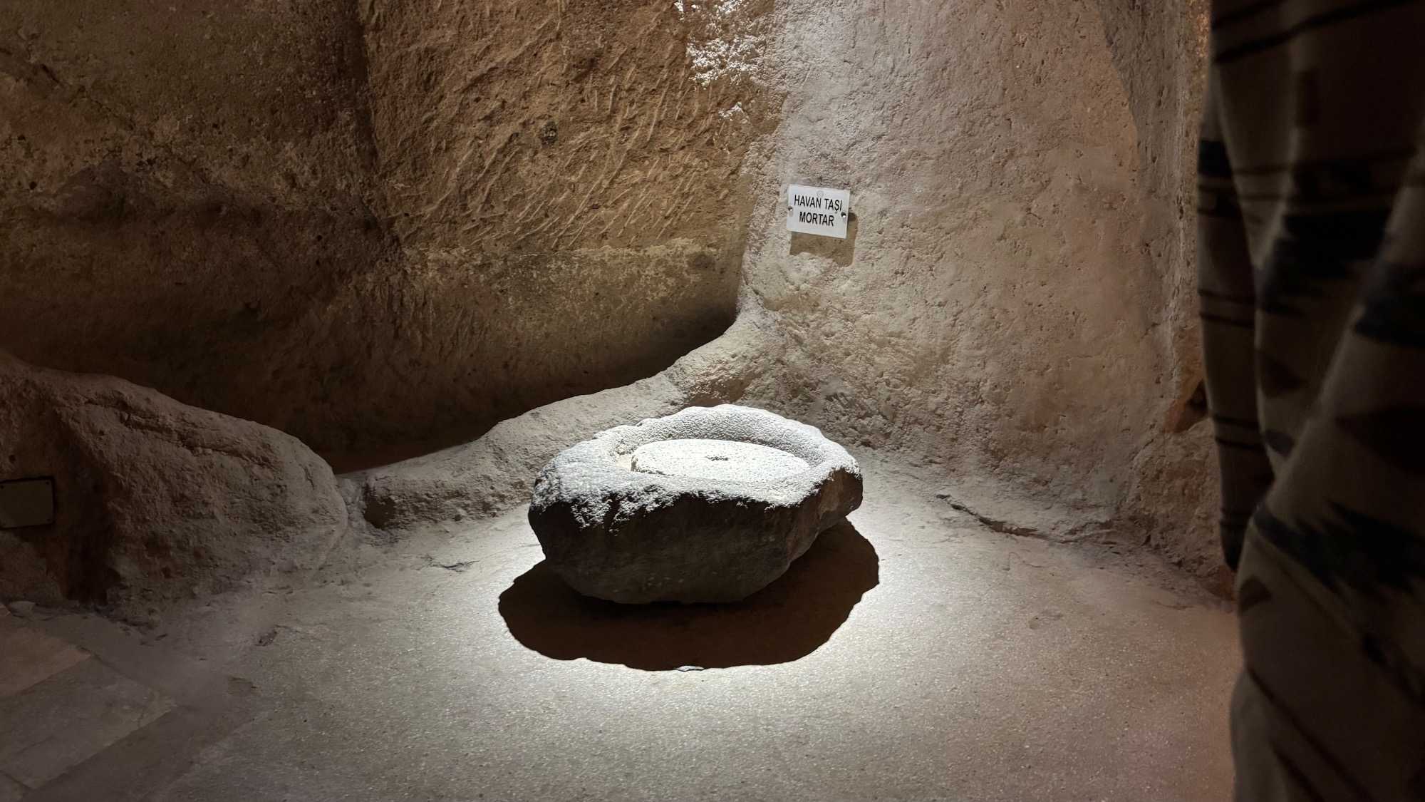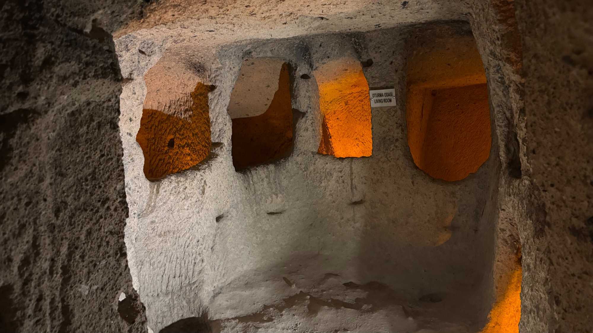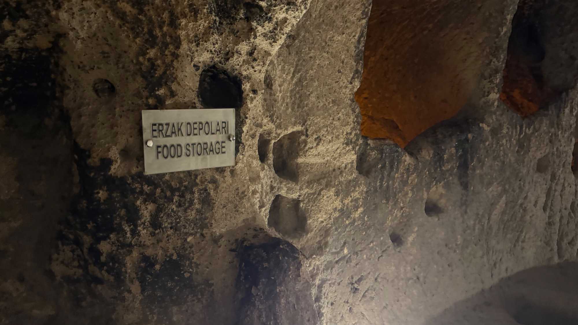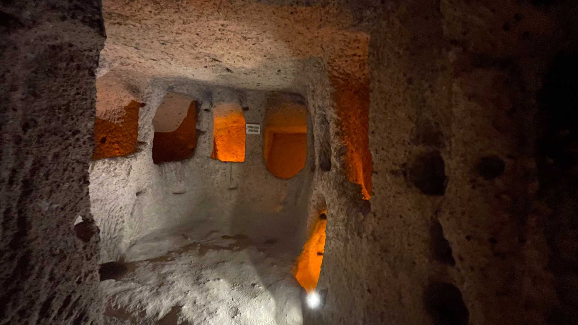 Second arrêt : la ville souterraine de Kaymakli, la plus remarquable des cinq cités souterraines ouvertes au public, sur un total de 200 sites de ce genre. Les premières excavations dans le tuf friable de la colline remontent vers 1300 av. J.-C, l'existence d'habitations souterraines dans la région est attestée par Xénophon (Ve-IVe siècles av. J.-C.). Mais cette cité, comme les autres, a été essentiellement creusée par des populations paléochrétiennes souhaitant se protéger contre des persécutions et des invasions. Huit mille chrétiens, fuyant les persécutions romaines, y auraient trouvé refuge. Plus tard, des populations s'y réfugièrent, notamment à partir du VIIe siècle. Elle a grandi au fil des siècles, comptant finalement des kilomètres de galeries. L'espace est organisé autour de cheminées d'aération. Une seule de ces cheminées dessert les pièces ouvertes au public.