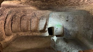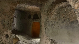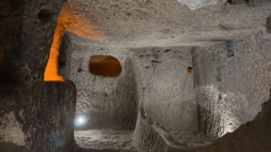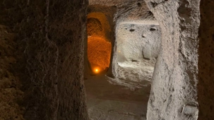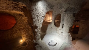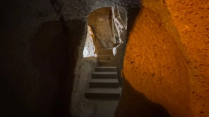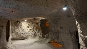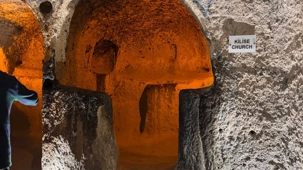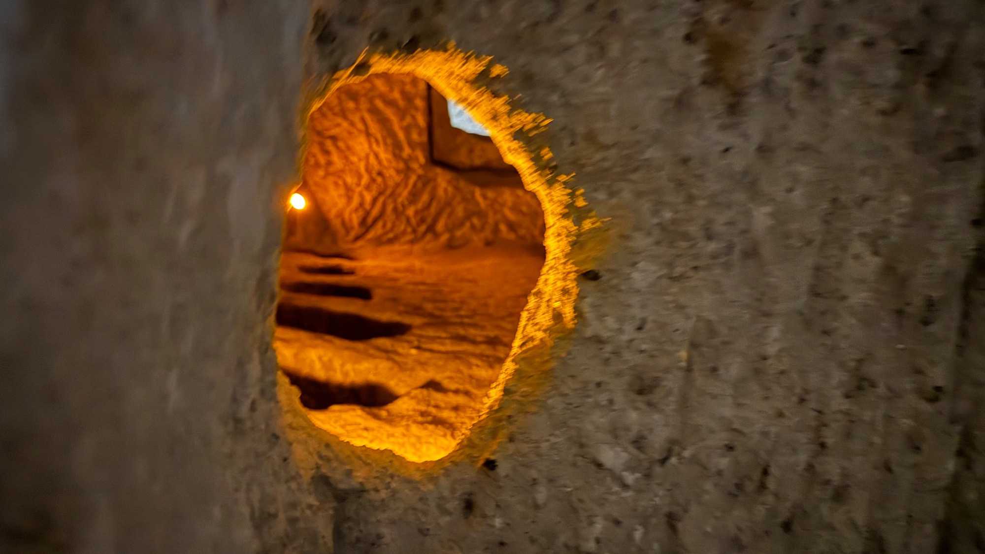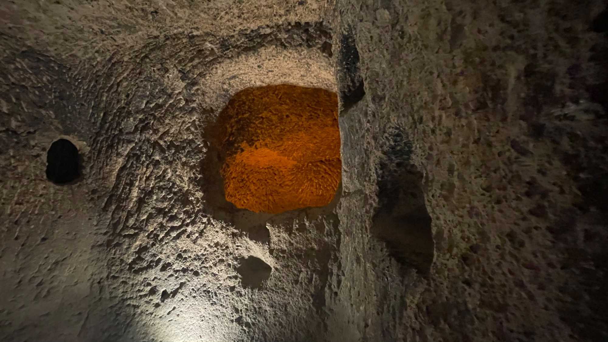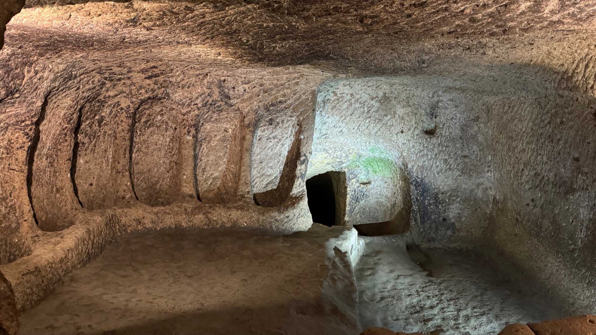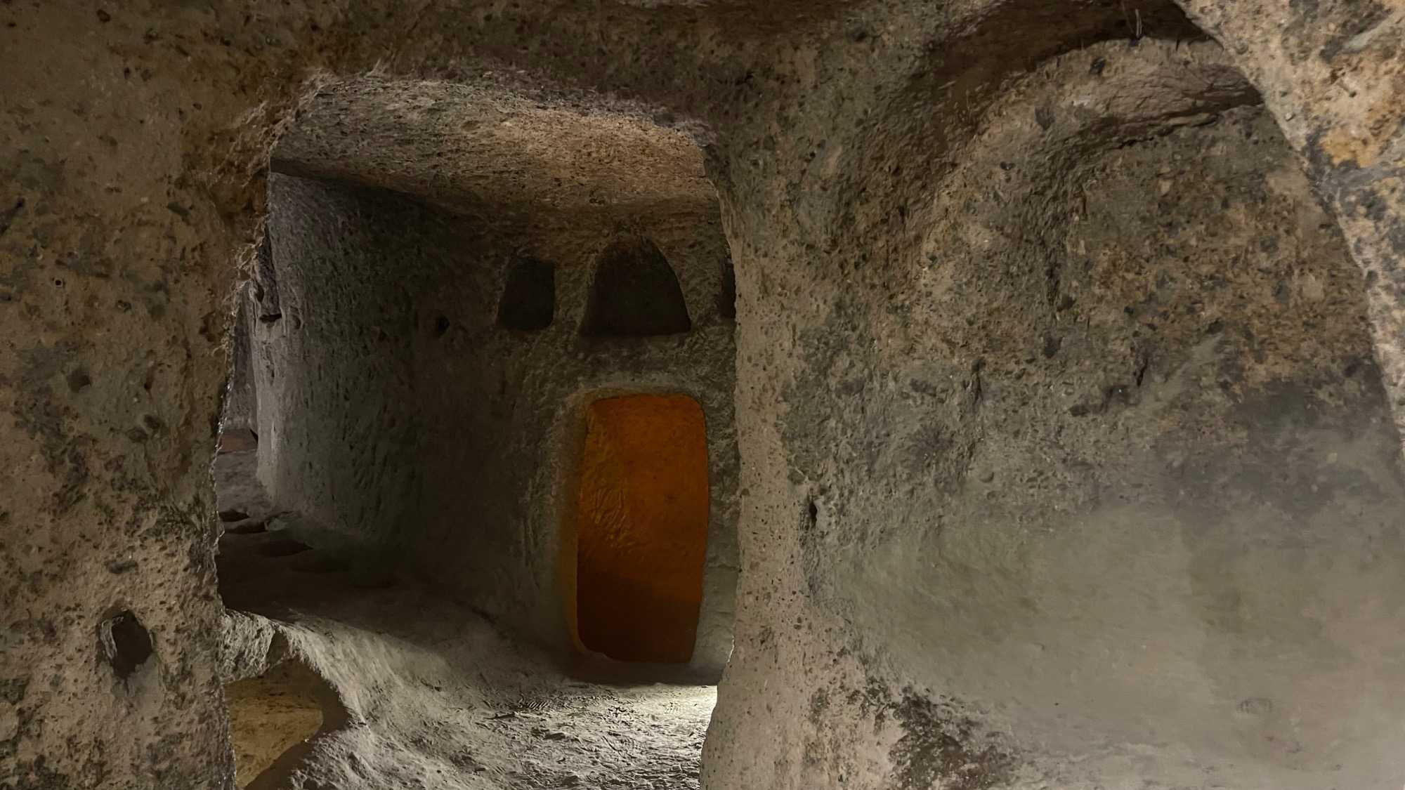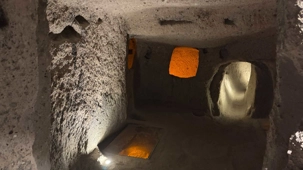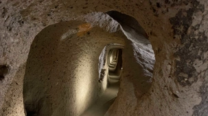 Second arrêt : la ville souterraine de Kaymakli, la plus remarquable des cinq cités souterraines ouvertes au public, sur un total de 200 sites de ce genre. Les premières excavations dans le tuf friable de la colline remontent vers 1300 av. J.-C, l'existence d'habitations souterraines dans la région est attestée par Xénophon (Ve-IVe siècles av. J.-C.). Mais cette cité, comme les autres, a été essentiellement creusée par des populations paléochrétiennes souhaitant se protéger contre des persécutions et des invasions. Huit mille chrétiens, fuyant les persécutions romaines, y auraient trouvé refuge. Plus tard, des populations s'y réfugièrent, notamment à partir du VIIe siècle. Elle a grandi au fil des siècles, comptant finalement des kilomètres de galeries. L'espace est organisé autour de cheminées d'aération. Une seule de ces cheminées dessert les pièces ouvertes au public.