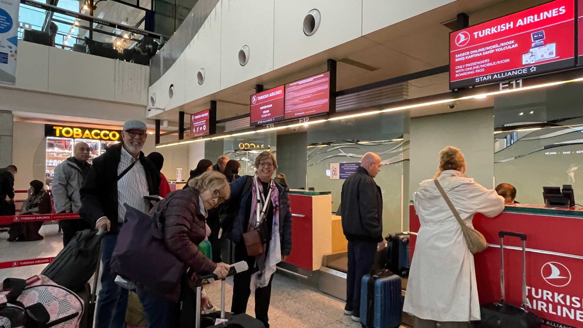 Nous arrivons avec une heure d’avance pour notre transfert vers le Québec et c’était juste assez, pas trop car nous traversons l’aéroport. C’est ici que notre guide, Yavuz, et nos amis Richard et Chantal nous quittent. Nous passons la sécurité, pour une troisième fois, et commençons l’embarquement mais avant un petit coup de sécurité 😉 les aéroports sont très sécuritaires en Turquie je vous en avais parlé. Juste avant l’embarquement, un dernier coup de sécurité mais cette fois-ci elle se fait de façon aléatoire et c’est Marcel et Chantal les heureux élus : les bagages à mains sont fouillés. Enfin nous embarquons dans l’avion qui nous mènera vers la maison. Un vol parfait.