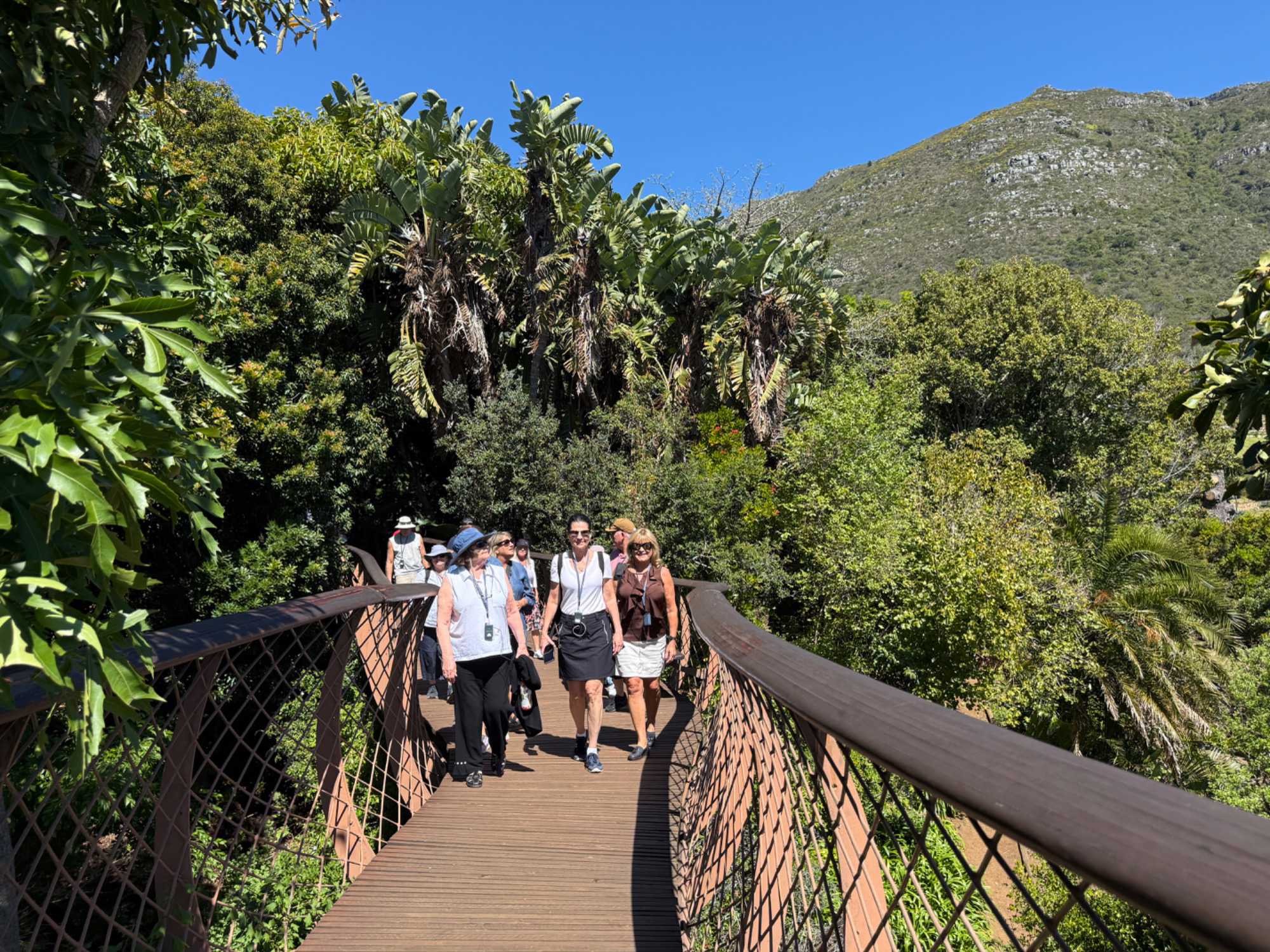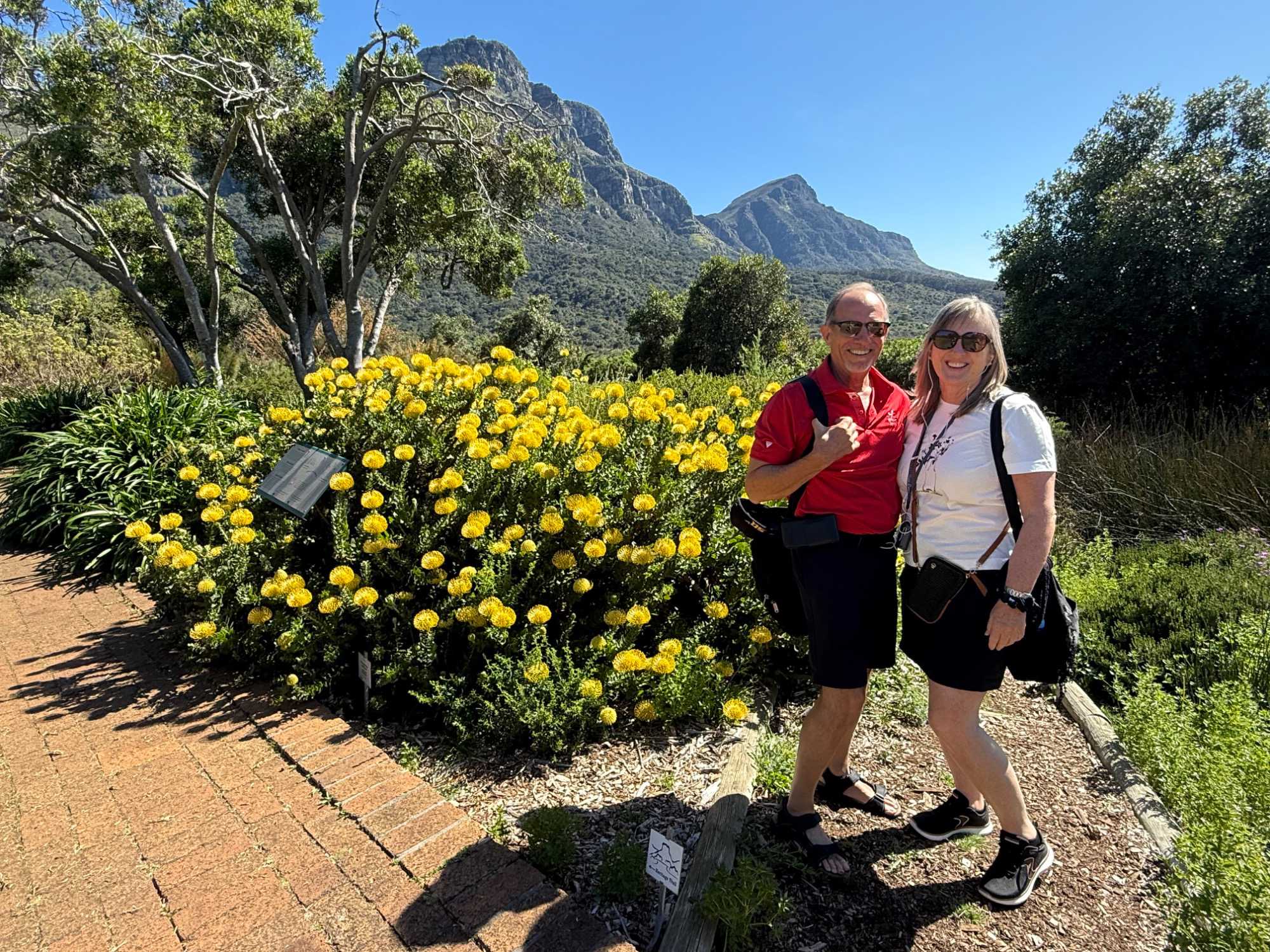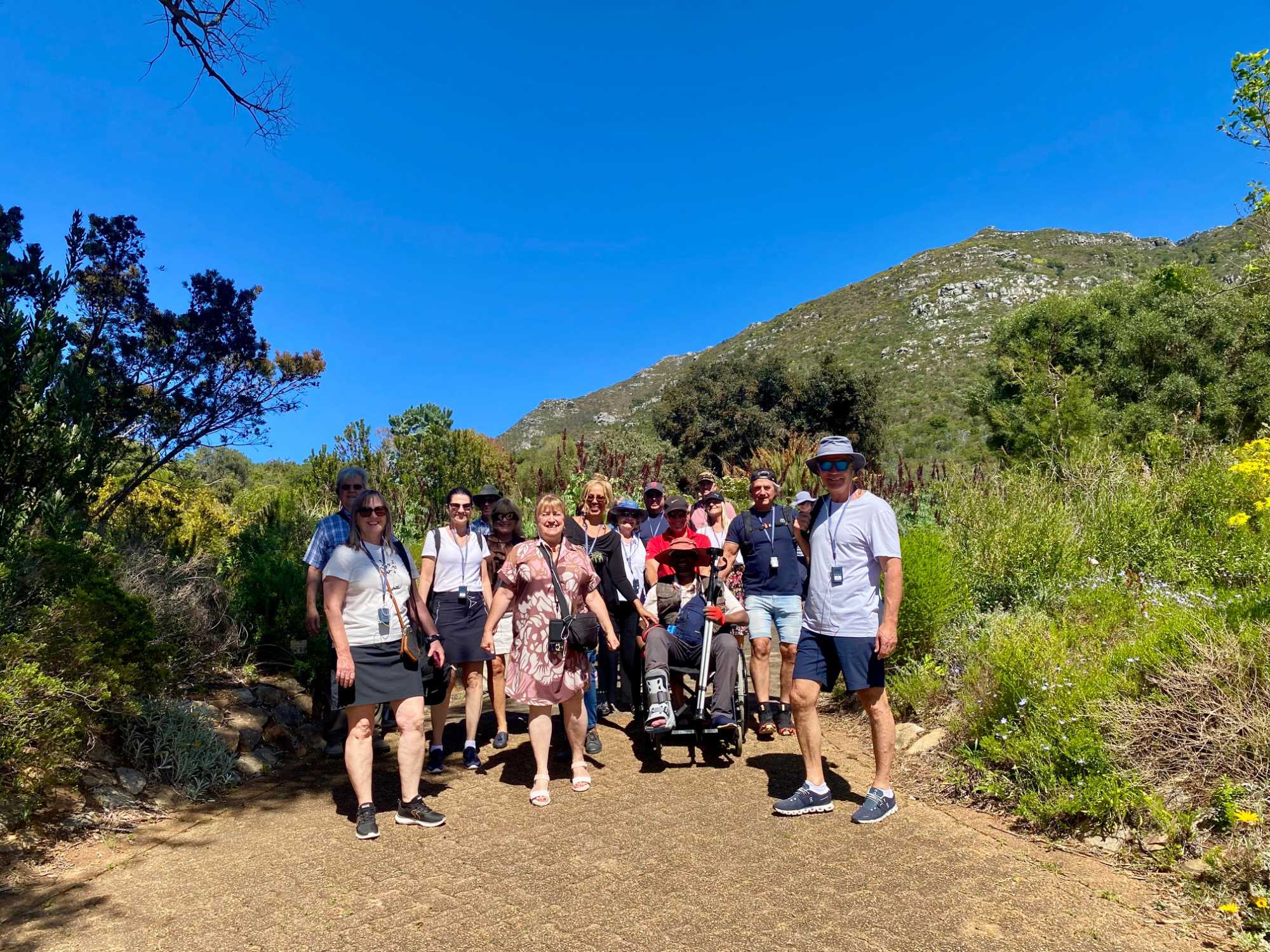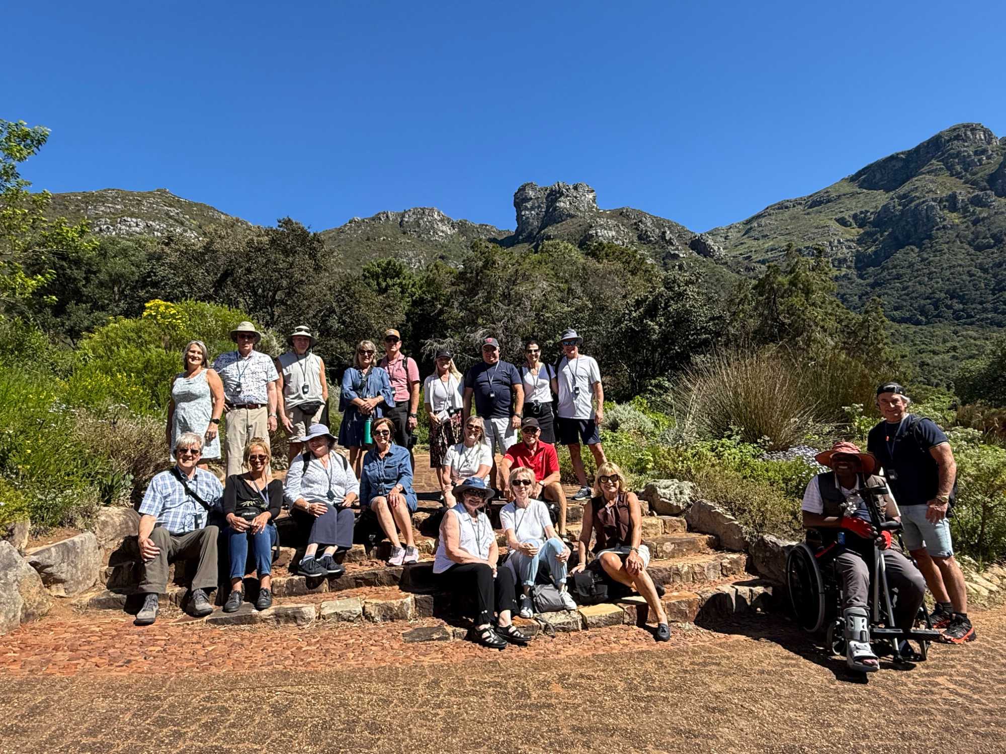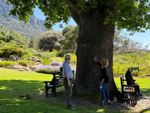 On y recense plus de 6 000 espèces de plantes, dont le fameux fynbos, cette végétation typique du sud du pays, ainsi qu’une incroyable variété de protéas, la fleur emblématique de l’Afrique du Sud. Tout au long du parcours, Léonce nous guidait avec brio, s’arrêtant pour attirer notre attention sur une plante rare, un arbre ancien ou une curiosité botanique. Il nous a parlé de la résistance de certaines espèces aux feux, du rôle des sols sablonneux du Cap et de la symbiose entre la flore et les oiseaux pollinisateurs. À chaque tournant, un nouveau tableau s’offrait à nous : massifs colorés, arbustes odorants, oiseaux multicolores et, en arrière-plan, la majestueuse montagne de la Table. Cette visite fut un véritable enchantement, empreinte de beauté, d’émotion et d’admiration pour la nature.