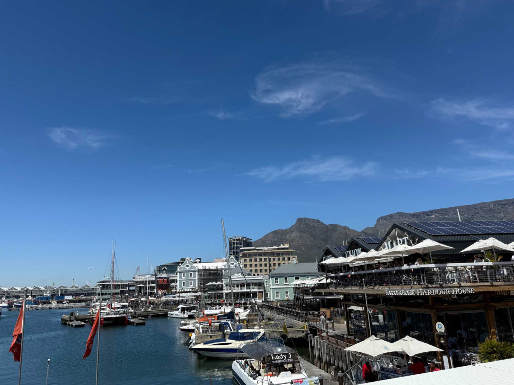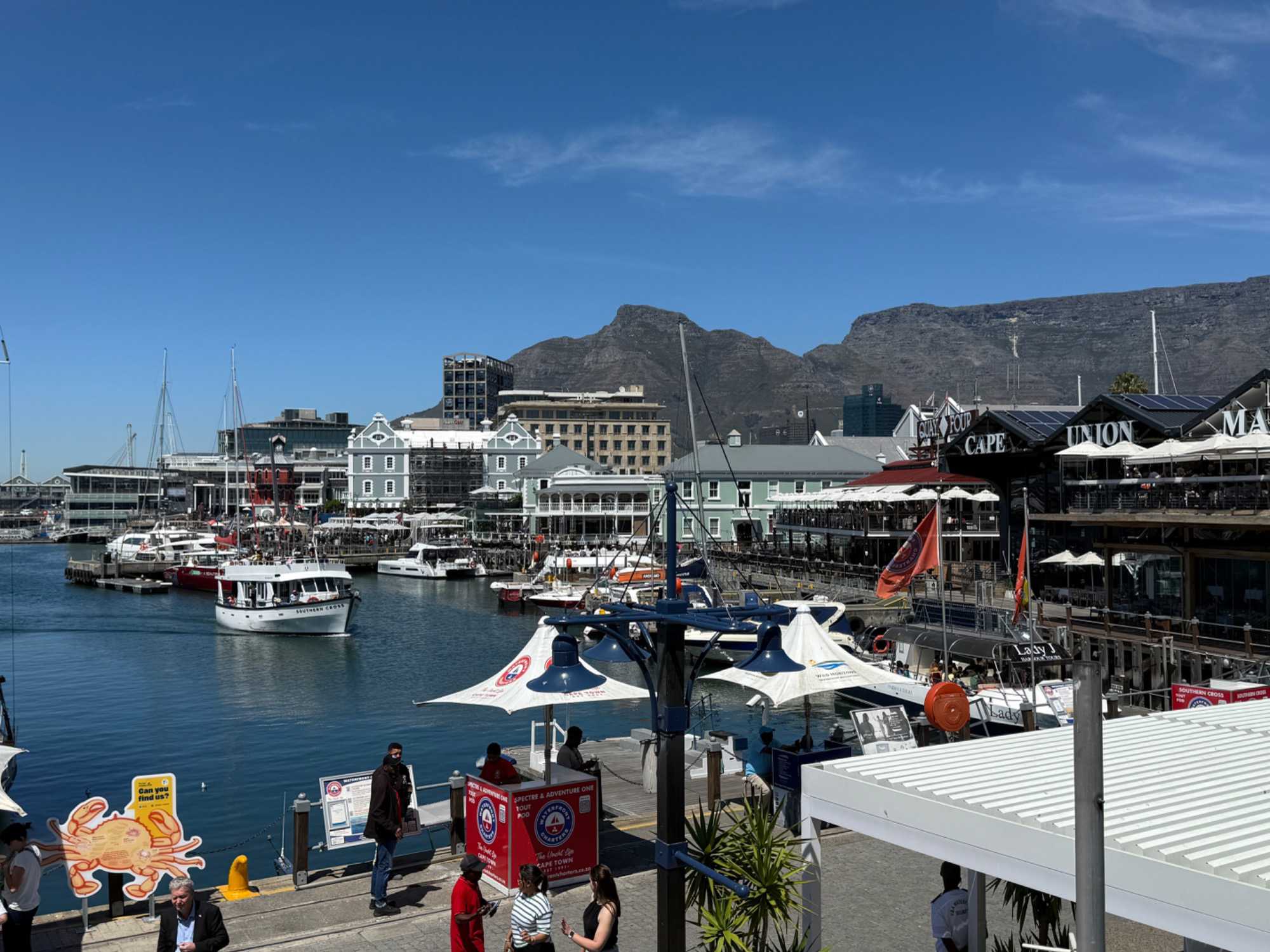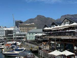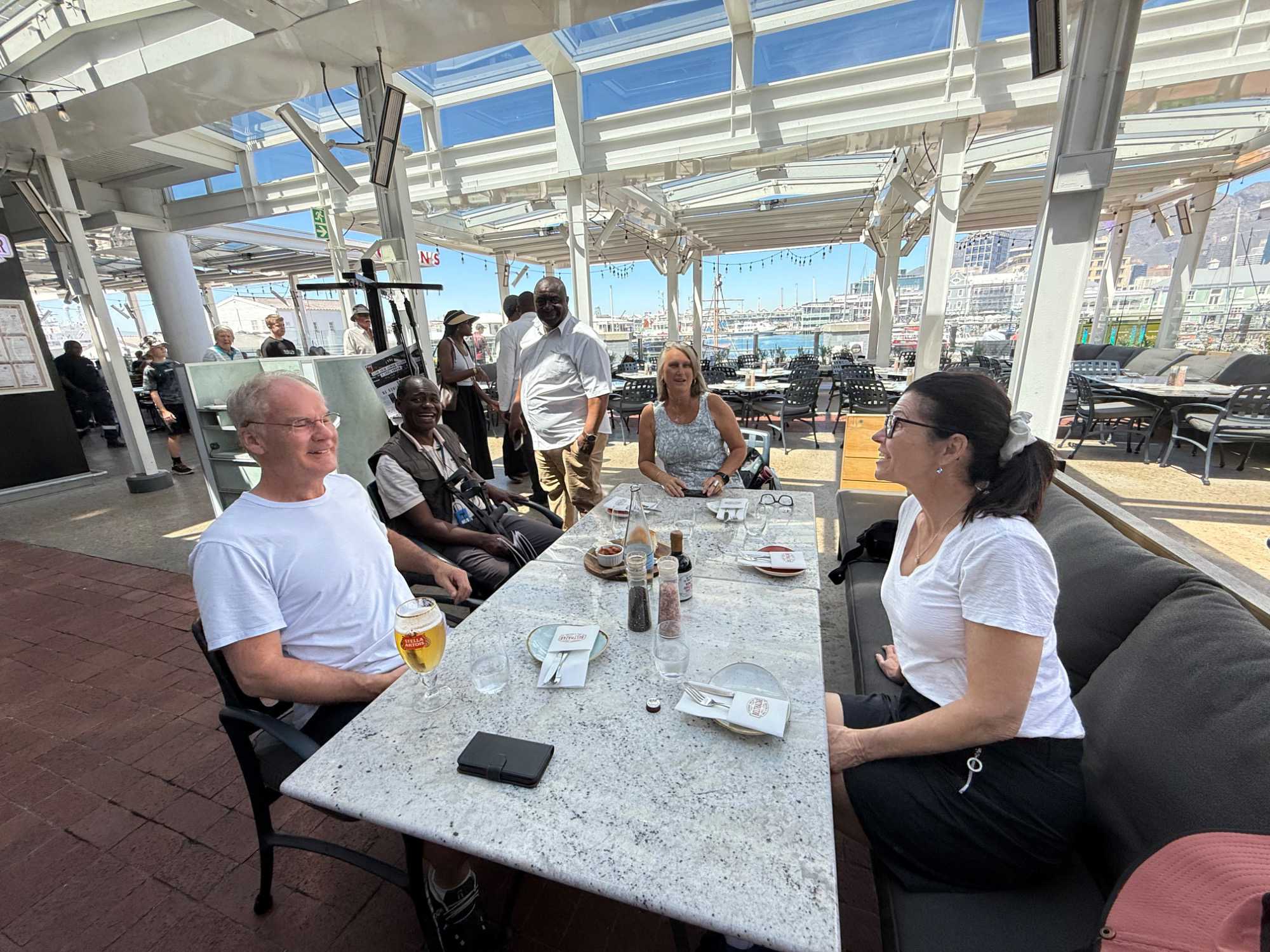 En fin de matinée, nous avons quitté le jardin pour nous diriger vers le V&A Waterfront, un lieu que je connais bien et où j’ai déjà séjourné à plusieurs reprises. J’y ai vécu de très beaux moments lors de précédents voyages, mais cette fois, j’ai pu constater à quel point l’endroit a changé.Les constructions nouvelles et le nombre croissant de visiteurs ont transformé l’atmosphère. L’endroit demeure superbe et vibrant, mais il a perdu un peu du calme et du charme tranquille que j’y appréciais tant. C’est d’ailleurs pour cette raison que j’ai préféré revenir à mon ancien hôtel, un lieu magnifique où règnent encore la quiétude et l’élégance que j’aime tant retrouver. Nous étions attendus pour un dîner privé au restaurant Belthazar, situé directement sur le port. C’est un établissement renommé pour sa cuisine raffinée, son service attentionné et sa vue spectaculaire sur la baie, les yachts et la montagne de la Table. Le repas fut un véritable festin : viandes tendres, fruits de mer savoureux, vins d’exception, le tout servi dans une ambiance conviviale et joyeuse. Nous avons savouré chaque bouchée dans la bonne humeur et les rires partagés. Après ce excellent repas, nous avons eu un peu de temps libre pour profiter du Waterfront. Certains en ont profité pour magasiner, d’autres pour flâner le long des quais et admirer les voiliers. Le temps a semblé trop court pour les amateurs de boutiques, mais la promenade fut très agréable. Nous avons ensuite repris la route vers notre hôtel, heureux de cette belle journée et prêts à nous détendre.